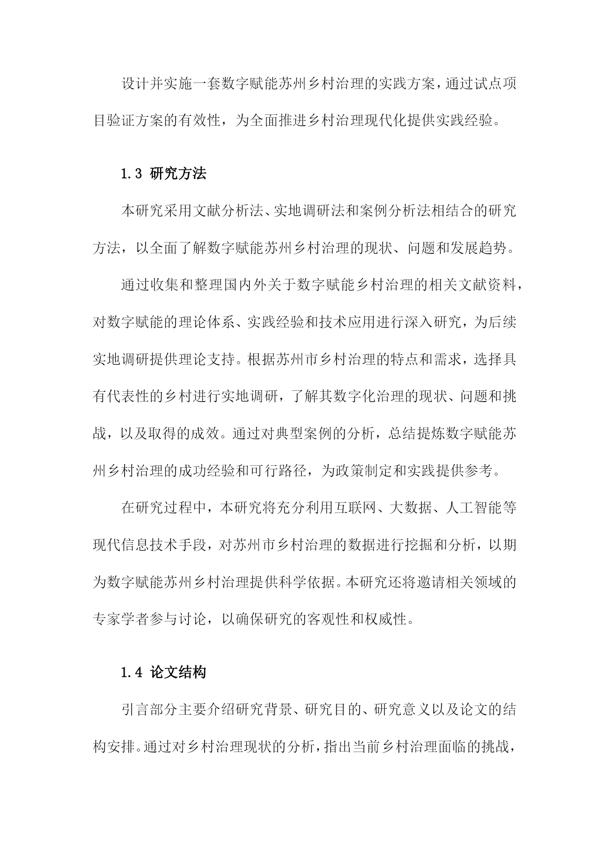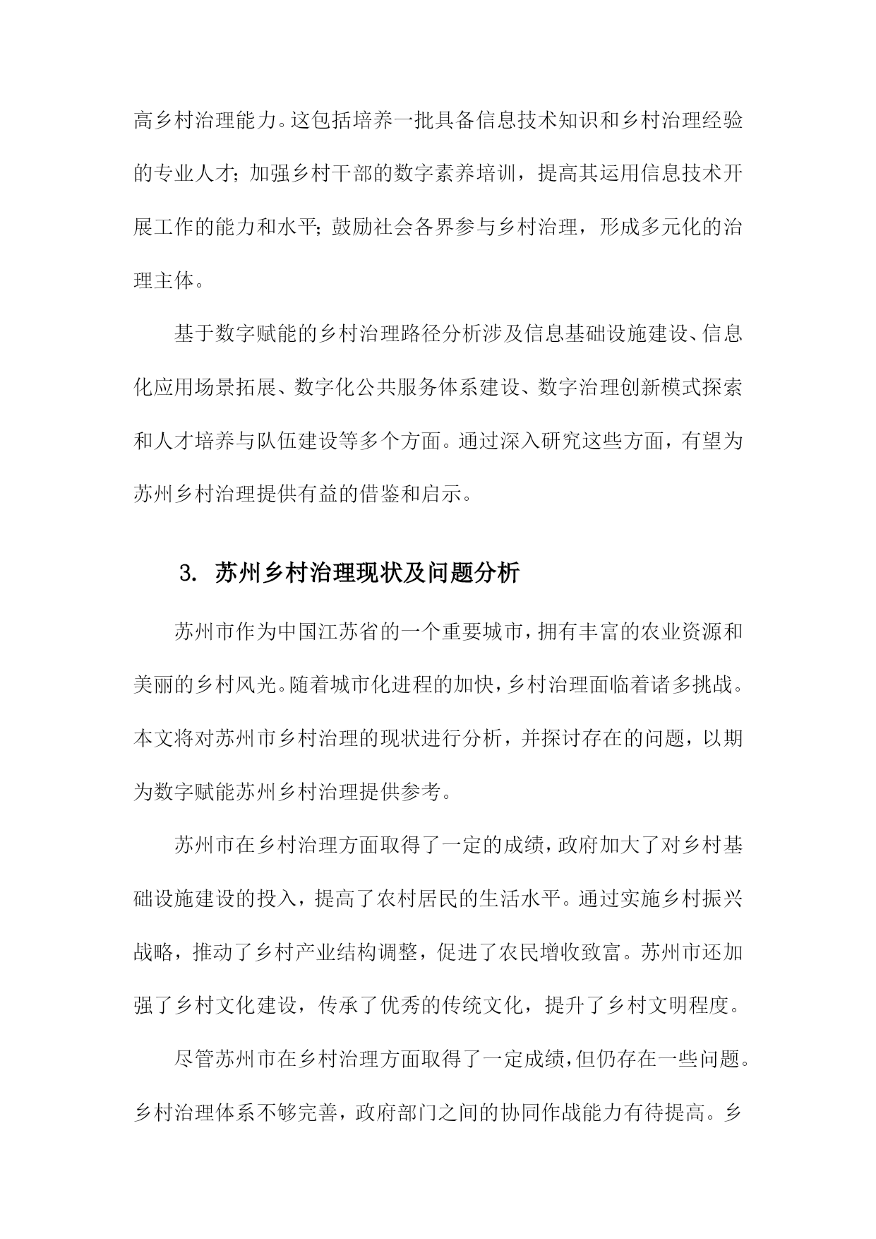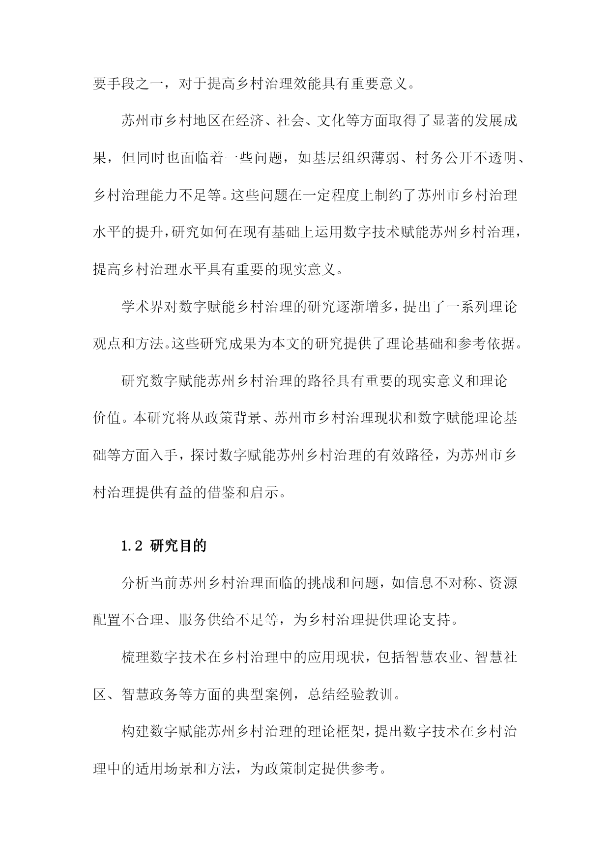 数字赋能苏州乡村治理的路径研究1.内容描述本研究旨在探讨数字赋能在苏州乡村治理中的应用路径,以期为乡村治理提供新的思路和方法。通过对苏州乡村治理现状的分析,了解其存在的问题和挑战;其次,结合国内外乡村治理的成功案例,总结数字赋能在乡村治理中的实践经验;提出针对苏州乡村治理的具体策略和建议,以期为苏州乡村治理提供有益的参考。1.1研究背景随着信息技术的快速发展和数字化转型的深入推进,数字赋能已经成为推动经济社会发展的重要引擎。特别是在乡村治理领域,数字赋能具有显著的优势和潜力。苏州市作为中国经济发展的重要引擎,乡村地区在社会经济发展、生态环境保护、民生改善等方面面临着诸多挑战。研究如何运用数字技术赋能苏州乡村治理,提高乡村治理效能,实现乡村振兴战略目标具有重要的现实意义。国家对乡村治理的重视程度不断提高,出台了一系列政策措施,如《关于加强乡村治理体系建设的意见》、《乡村振兴战略规划(20182022年)》等,明确提出要加强乡村治理现代化建设,推进乡村治理体系和治理能力现代化。数字赋能被视为乡村治理现代化的重要手段之一,对于提高乡村治理效能具有重要意义。苏州市乡村地区在经济、社会、文化等方面取得了显著的发展成果,但同时也面临着一些问题,如基层组织薄弱、村务公开不透明、乡村治理能力不足等。这些问题在一定程度上制约了苏州市乡村治理水平的提升,研究如何在现有基础上运用数字技术赋能苏州乡村治理,提高乡村治理水平具有重要的现实意义。学术界对数字赋能乡村治理的研究逐渐增多,提出了一系列理论观点和方法。这些研究成果为本文的研究提供了理论基础和参考依据。研究数字赋能苏州乡村治理的路径具有重要的现实意义和理论价值。本研究将从政策背景、苏州市乡村治理现状和数字赋能理论基础等方面入手,探讨数字赋能苏州乡村治理的有效路径,为苏州市乡村治理提供有益的借鉴和启示。1.2研究目的分析当前苏州乡村治理面临的挑战和问题,如信息不对称、资源配置不合理、服务供给不足等,为乡村治理提供理论支持。梳理数字技术在乡村治理中的应用现状,包括智慧农业、智慧社区、智慧政务等方面的典型案例,总结经验教训。构建数字赋能苏州乡村治理的理论框架,提出数字技术在乡村治理中的适用场景和方法,为政策制定提供参考。设计并实施一套数字赋能苏州乡村治理的实践方案,通过试点项目验证方案的有效性,为全面推进乡村治理现代化提供实践经验。1.3研究方法本研究采用文献分析法、实地调研法和案例分析法相结合的研究方法,以全面了解数字赋能苏州乡村治理的现状、问题和发展趋势。通过收集和整理国内外关于数字赋能乡村治理的相关文献资料,对数字赋能的理论体系、实践经验和技术应用进行深入研究,为后续实地调研提供理论支持。根据苏州市乡村治理的特点和需求,选择具有代表性的乡村进行实地调研,了解其数字化治理的现状、问题和挑战,以及取得的成效。通过对典型案例的分析,总结提炼数字赋能苏州乡村治理的成功经验和可行路径,为政策制定和实践提供参考。在研究过程中,本研究将充分利用互联网、大数据、人工智能等现代信息技术手段,对苏州市乡村治理的数据进行挖掘和分析,以期为数字赋能苏州乡村治理提供科学依据。本研究还将邀请相关领域的专家学者参与讨论,以确保研究的客观性和权威性。1.4论文结构引言部分主要介绍研究背景、研究目的、研究意义以及论文的结构安排。通过对乡村治理现状的分析,指出当前乡村治理面临的挑战,如信息化水平低、基层组织能力不足等。为了解决这些问题,本研究提出了数字赋能苏州乡村治理的路径,以期为苏州乡村治理提供理论支持和实践指导。文献综述部分对国内外关于数字赋能乡村治理的研究进行了梳理和总结,包括数字技术在乡村治理中的应用、数字赋能乡村治理的理论框架、数字赋能乡村治理的成功案例等。通过对相关文献的分析,为本研究提供了理论依据和实践参考。本研究采用文献研究法、案例分析法、问卷调查法等多种研究方法,对苏州乡村治理进行深入研究。通过文献研究法梳理国内外关于数字赋能乡村治理的研究现状;其次。为后续政策制定提供依据。本研究选取了苏州市多个具有代表性的乡村治理案例进行分析,包括数字化农业、智慧村庄建设、乡村治理平台建设等方面。通过对这些案例的分析,可以了解数字赋能在不同领域的应用情况,为其他地区乡村治理提供借鉴。结论部分对本研究的主要发现进行总结,并对未来数字赋能苏州乡村治理的发展趋势进行展望。针对本研究存在的问题和不足,提出相应的建议和改进措施。2.相关概念与理论框架数字乡村是指在乡村地区,通过数字技术的应用,实现农业生产、农村生活、农村经济和社会治理等方面的现代化。数字乡村建设是乡村振兴战略的重要组成部分,对于提高乡村治理能力、促进乡村经济发展和改善农民生活水平具有重要意义。乡村治理理论主要包括社会治