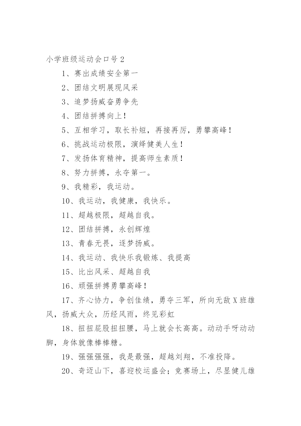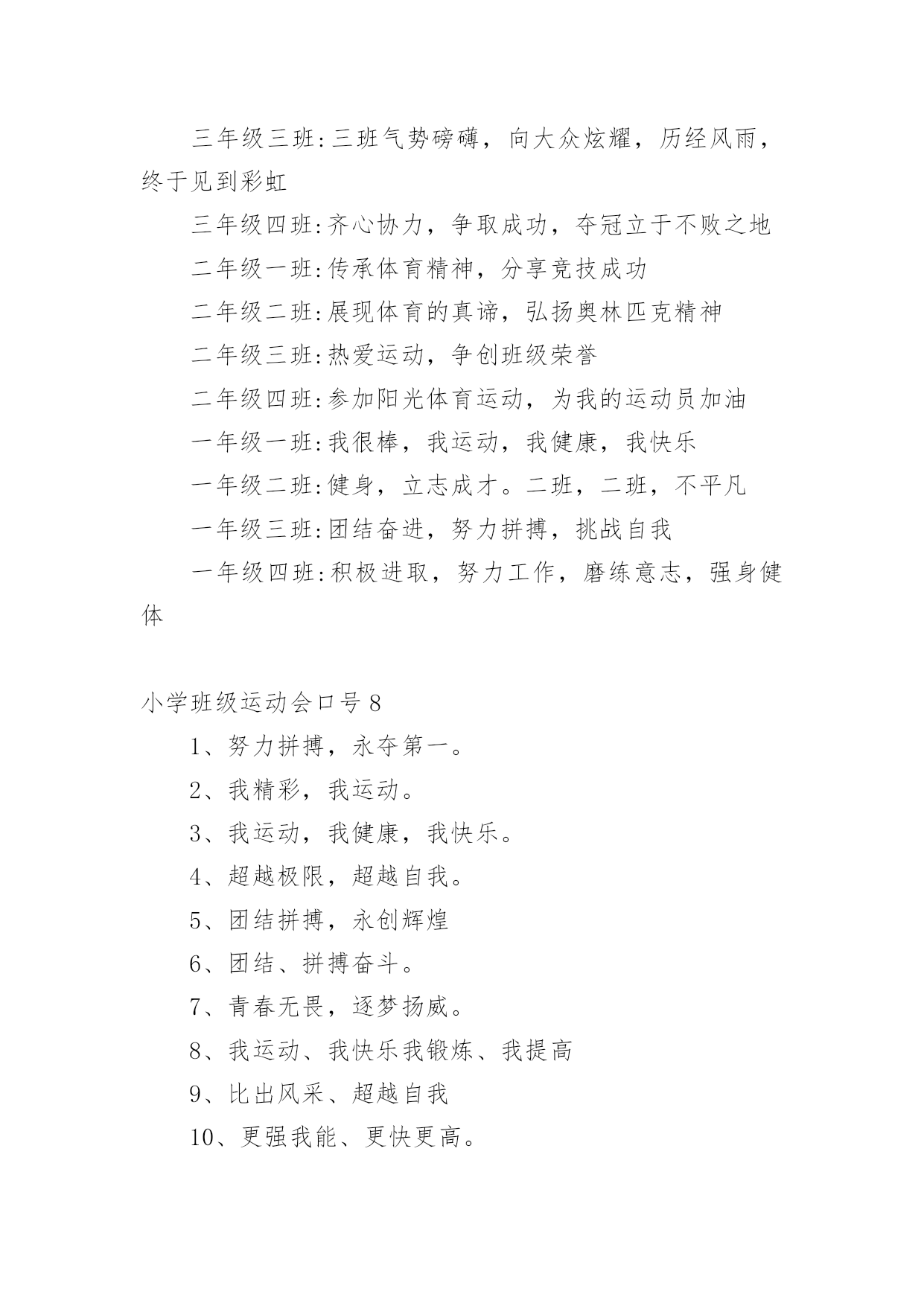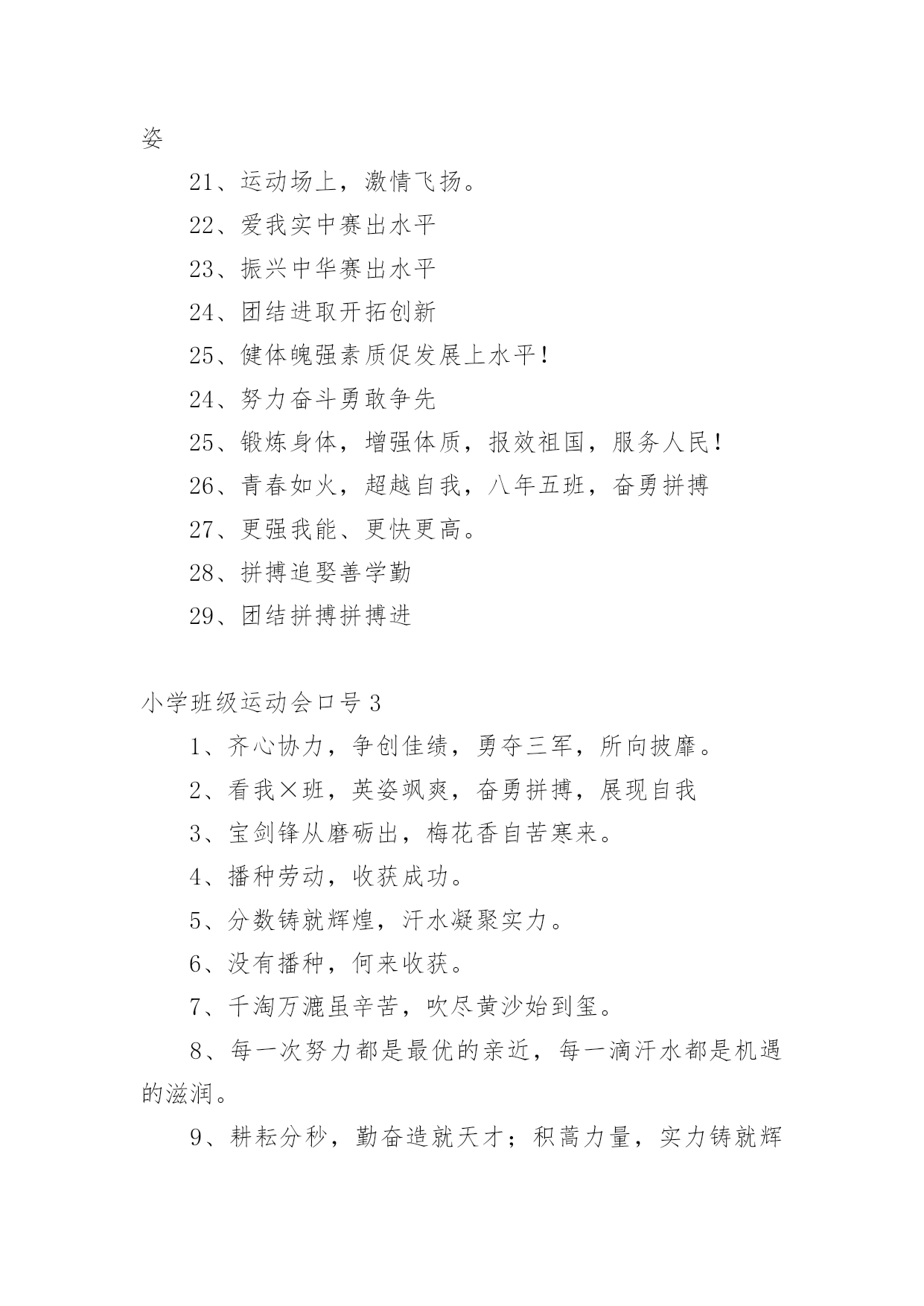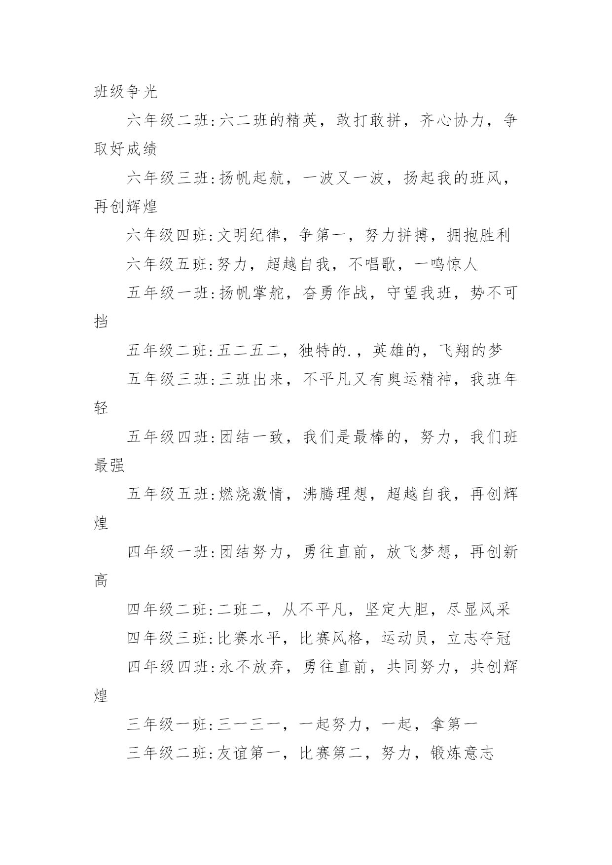 小学班级运动会口号在日常学习、工作或生活中,大家总少不了接触一些耳熟能详的口号吧,口号能指导人们有效地开展实践,促进客观事物的发展。还苦于找不到好的口号?下面是小编收集整理的小学班级运动会口号,供大家参考借鉴,希望可以帮助到有需要的朋友。小学班级运动会口号11、走向操场、走进大自然、走到阳光下。2、奋勇争先,一往无前。3、超越自我,挑战未来。4、超越自我,成就自我。5、放飞理想,勇于高攀。6、弘扬奥运精神,共创学校成功。7、人类需要体育,世界向往和和平!8、健康、聪颖、活泼、向上。9、一班,一班最狂顺我者昌逆我者亡10、爱我实中赛出水平。11、挑战自我,超越梦想,团结互助,共创佳绩。12、磨砺意志,奋发冲刺,团结拼搏,展现自我。13、扬帆把舵,奋勇拼搏,看我十二,气势磅礴14、运动奏响生命,运动点燃激情。15、友谊第一、比赛第二。小学班级运动会口号21、赛出成绩安全第一2、团结文明展现风采3、追梦扬威奋勇争先4、团结拼搏向上!5、互相学习,取长补短,再接再厉,勇攀高峰!6、挑战运动极限,演绎健美人生!7、发扬体育精神,提高师生素质!8、努力拼搏,永夺第一。9、我精彩,我运动。10、我运动,我健康,我快乐。11、超越极限,超越自我。12、团结拼搏,永创辉煌13、青春无畏,逐梦扬威。14、我运动、我快乐我锻炼、我提高15、比出风采、超越自我16、顽强拼搏勇攀高峰!17、齐心协力,争创佳绩,勇夺三军,所向无敌X班雄风,扬威大众,历经风雨,终见彩虹18、扭扭屁股扭扭腰,马上就会长高高。动动手呀动动脚,身体就像棒棒糖。19、强强强强,我是最强,超越刘翔,不准投降。20、奇迈山下,喜迎校运盛会;竞赛场上,尽显健儿雄姿21、运动场上,激情飞扬。22、爱我实中赛出水平23、振兴中华赛出水平24、团结进取开拓创新25、健体魄强素质促发展上水平!24、努力奋斗勇敢争先25、锻炼身体,增强体质,报效祖国,服务人民!26、青春如火,超越自我,八年五班,奋勇拼搏27、更强我能、更快更高。28、拼搏追娶善学勤29、团结拼搏拼搏进小学班级运动会口号31、齐心协力,争创佳绩,勇夺三军,所向披靡。2、看我×班,英姿飒爽,奋勇拼搏,展现自我3、宝剑锋从磨砺出,梅花香自苦寒来。4、播种劳动,收获成功。5、分数铸就辉煌,汗水凝聚实力。6、没有播种,何来收获。7、千淘万漉虽辛苦,吹尽黄沙始到玺。8、每一次努力都是最优的亲近,每一滴汗水都是机遇的滋润。9、耕耘分秒,勤奋造就天才;积蒿力量,实力铸就辉煌。10、gobreakgobreakneverbeafraid小学班级运动会口号41、百米冲刺如猛虎。2、四三四三,齐心协力,我们一起,勇夺第一。3、友谊第一、比赛第二。4、文明守纪,拥抱胜利。5、与时俱进,开拓创新,顽强拼搏,勇夺第一。6、抚长剑,一杨眉,清水白石何离离,脱吾帽,向君笑,饮君酒,为君饮,张良未逐赤松去,桥边黄石知我心。7、团结进取,争创佳绩,努力拼搏,挑战自我。8、励精图治,争创一流,好好学习,天天向上。9、团结拼搏拼搏进。10、挑战自我,超越梦想,团结互助,共创佳绩。11、磨砺意志,奋发冲刺。12、风流人物看今朝。13、齐心协力,再创辉煌,勇争冠军,实力无限。14、投球奔跑本领高。15、奋勇拼搏,力创佳绩。16、四人齐心勇向前。17、敢闯敢拼,齐心协力,争创佳绩。18、铅球飞落地动摇。19、拼搏追取、善学勤。20、三班雄风,扬威大众,历经风雨,终见彩虹。小学班级运动会口号51、齐心协力,争创佳绩,勇夺三军,所向披靡。2、看我×班,英姿飒爽,奋勇拼搏,展现自我3、宝剑锋从磨砺出,梅花香自苦寒来。4、播种劳动,收获成功。5、分数铸就辉煌,汗水凝聚实力。6、没有播种,何来收获。7、千淘万漉虽辛苦,吹尽黄沙始到玺。8、每一次努力都是最优的亲近,每一滴汗水都是机遇的滋润。9、耕耘分秒,勤奋造就天才;积蒿力量,实力铸就辉煌。10、团结奋斗,永不后退,希望之星,挑战未来。小学班级运动会口号61、拼搏追娶善学勤2、团结拼搏拼搏进3、努力奋斗勇敢争先4、文明守纪拥抱胜利5、努力拼搏自强不息6、运动起来勇敢第一7、天道酬勤健康起来8、赛出成绩安全第一9、团结文明展现风采10、追梦扬威奋勇争先11、人类需要体育,世界向往和和平!12、唱响教院,你最闪亮!13、歌唱青春,绽放荣光!14、唱出心声,放飞梦想!15、开展全民健身运动,全面建设小康社会!16、五班五班,年年夺冠,文化体育,看咱争先。17、努力吧!用你坚韧不拔的毅志。18、五班五班,团结相伴,桃李花香,梦想起航。19、号令群班,谁人胆敢与我争锋。20、困难和胜利都在向你招手,去呀,快去呀,不要犹豫。21、五班五班,个个冒尖,争先恐后,团结向前。22、突破自我,超越未来团结的力量无穷大。23、全场听我唱,能把布莱曼比