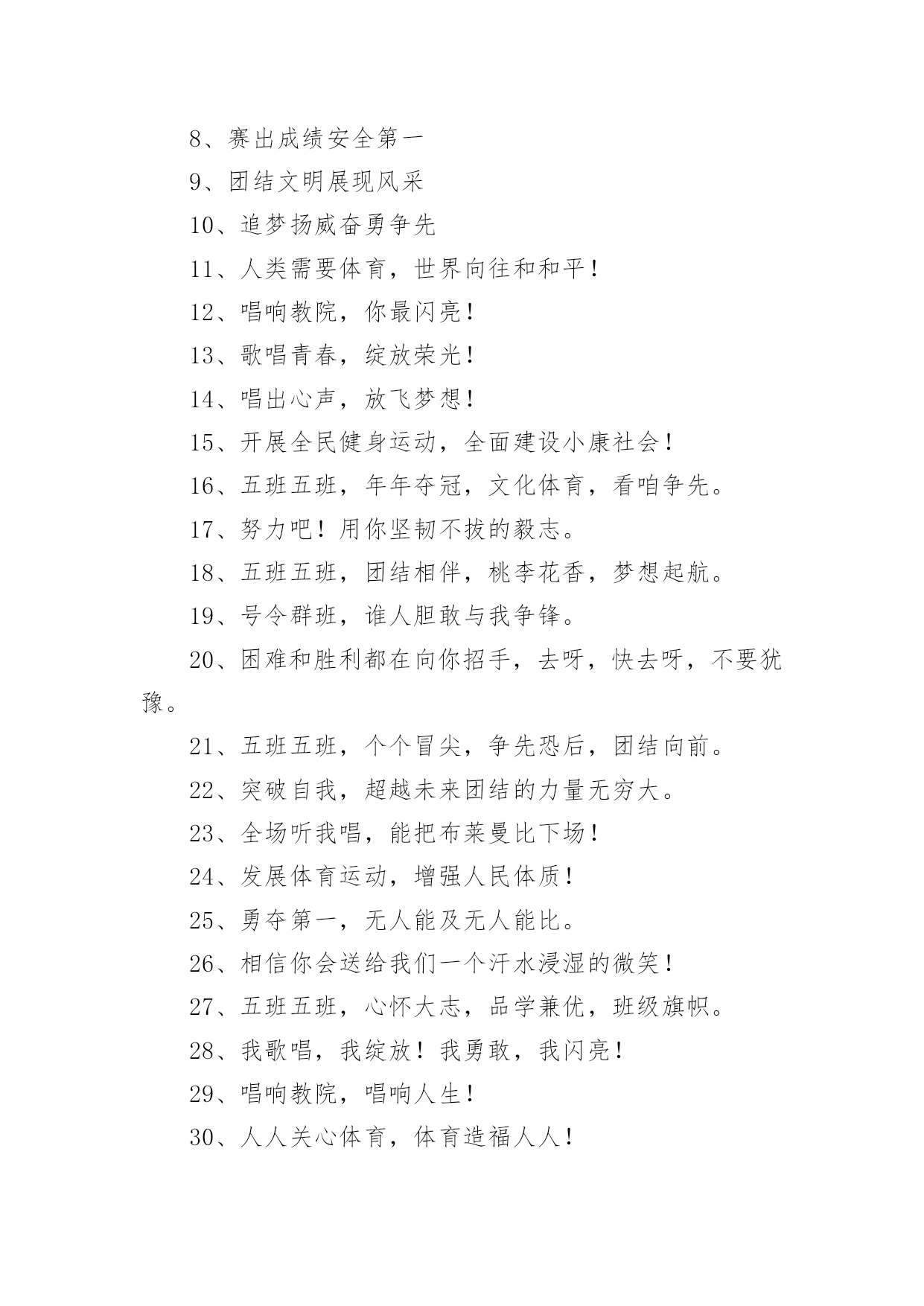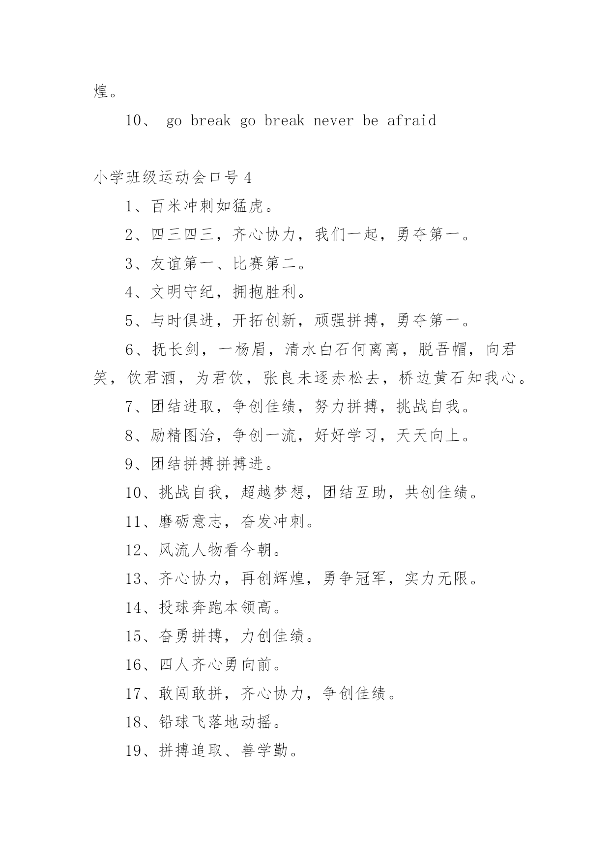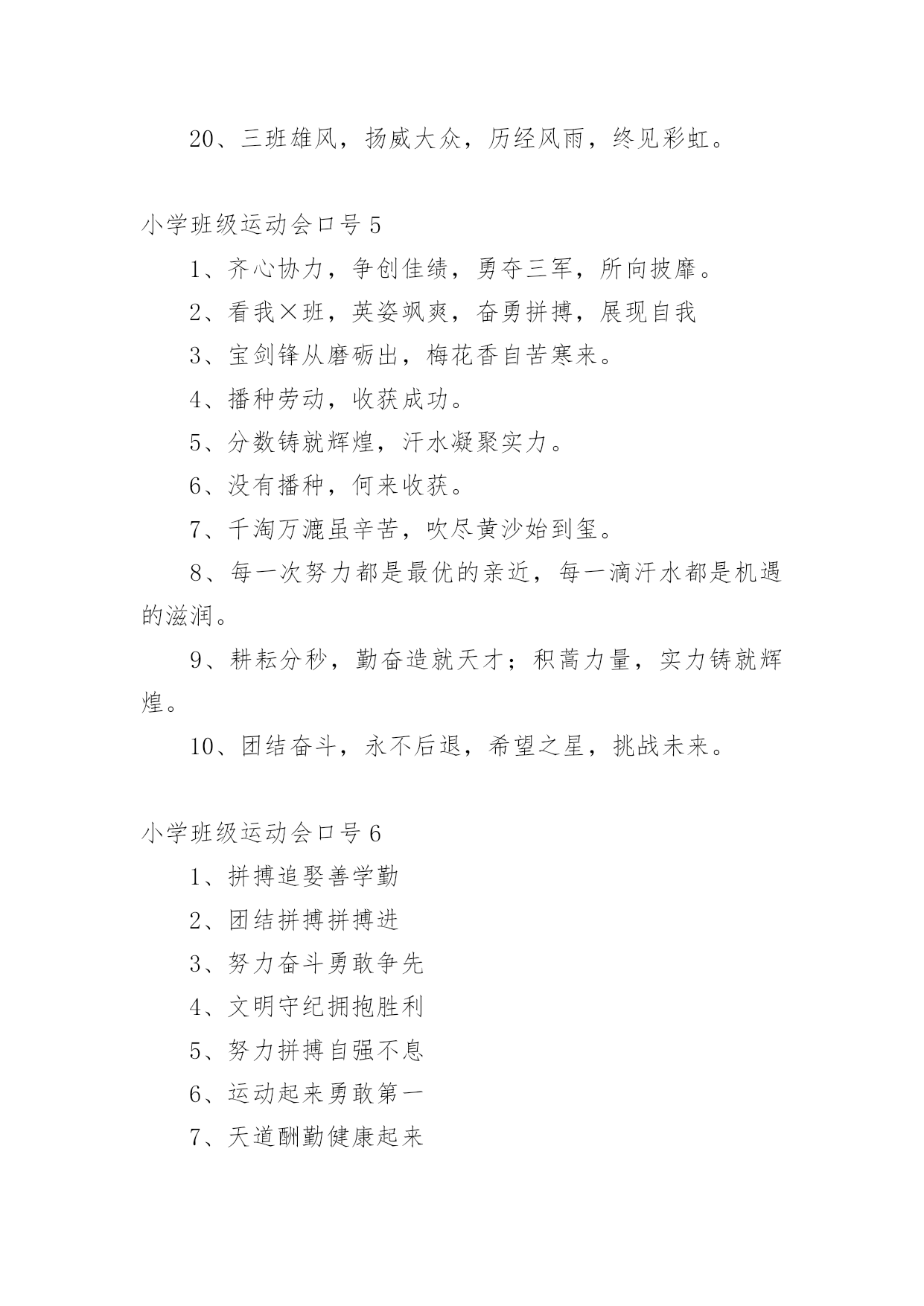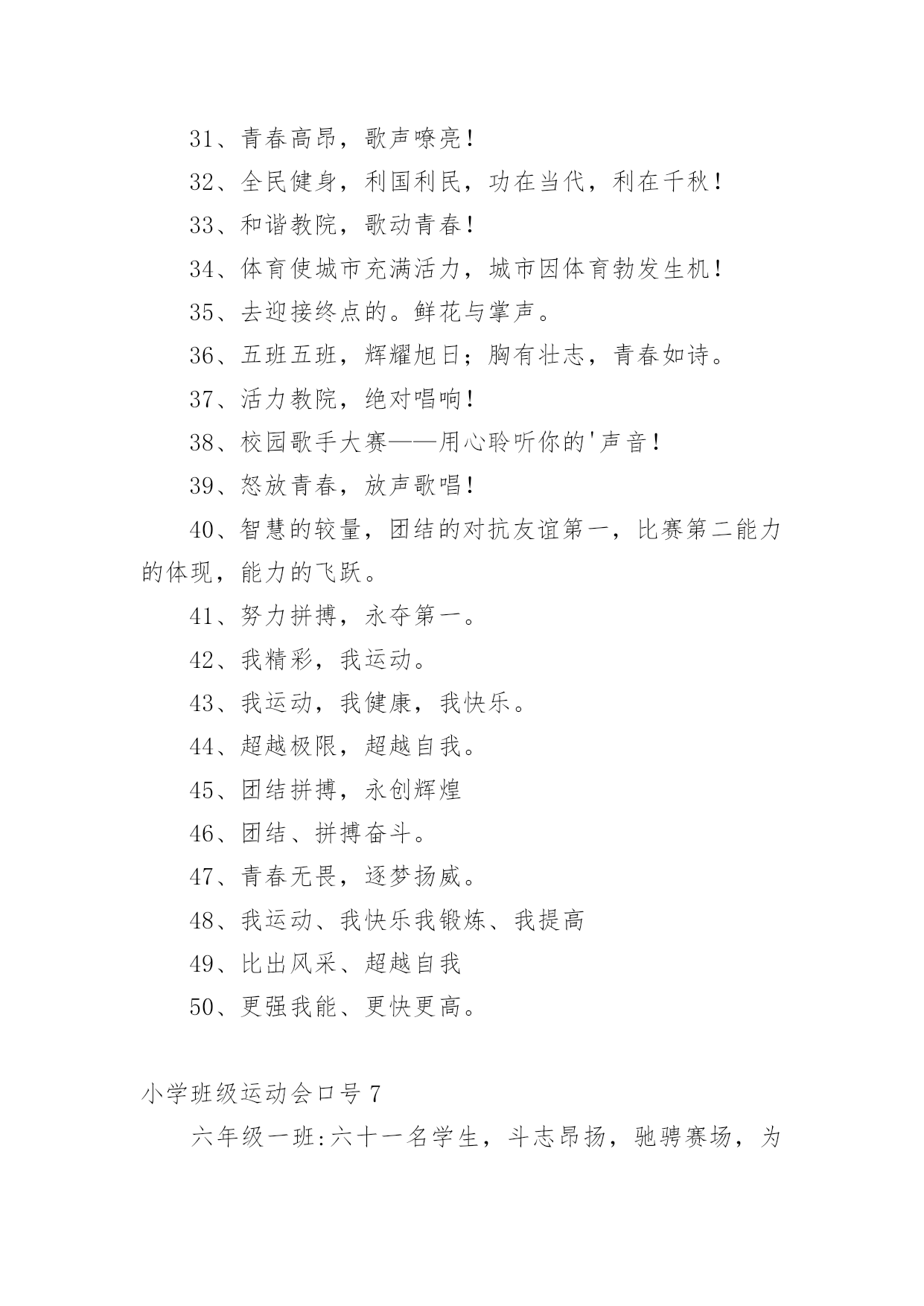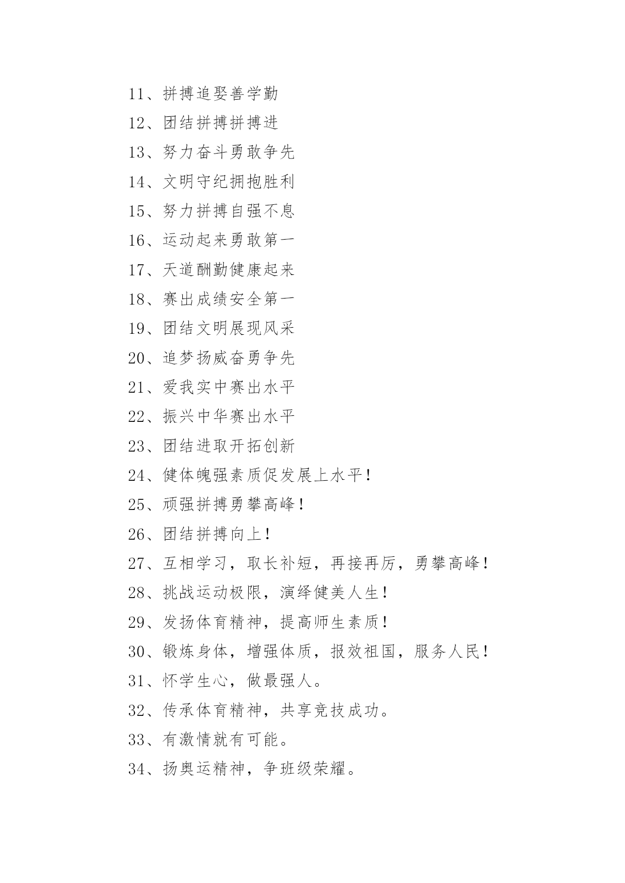 小学班级运动会口号在日常学习、工作或生活中,大家总少不了接触一些耳熟能详的口号吧,口号能指导人们有效地开展实践,促进客观事物的发展。还苦于找不到好的口号?下面是小编收集整理的小学班级运动会口号,供大家参考借鉴,希望可以帮助到有需要的朋友。小学班级运动会口号11、走向操场、走进大自然、走到阳光下。2、奋勇争先,一往无前。3、超越自我,挑战未来。4、超越自我,成就自我。5、放飞理想,勇于高攀。6、弘扬奥运精神,共创学校成功。7、人类需要体育,世界向往和和平!8、健康、聪颖、活泼、向上。9、一班,一班最狂顺我者昌逆我者亡10、爱我实中赛出水平。11、挑战自我,超越梦想,团结互助,共创佳绩。12、磨砺意志,奋发冲刺,团结拼搏,展现自我。13、扬帆把舵,奋勇拼搏,看我十二,气势磅礴14、运动奏响生命,运动点燃激情。15、友谊第一、比赛第二。小学班级运动会口号21、赛出成绩安全第一2、团结文明展现风采3、追梦扬威奋勇争先4、团结拼搏向上!5、互相学习,取长补短,再接再厉,勇攀高峰!6、挑战运动极限,演绎健美人生!7、发扬体育精神,提高师生素质!8、努力拼搏,永夺第一。9、我精彩,我运动。10、我运动,我健康,我快乐。11、超越极限,超越自我。12、团结拼搏,永创辉煌13、青春无畏,逐梦扬威。14、我运动、我快乐我锻炼、我提高15、比出风采、超越自我16、顽强拼搏勇攀高峰!17、齐心协力,争创佳绩,勇夺三军,所向无敌X班雄风,扬威大众,历经风雨,终见彩虹18、扭扭屁股扭扭腰,马上就会长高高。动动手呀动动脚,身体就像棒棒糖。19、强强强强,我是最强,超越刘翔,不准投降。20、奇迈山下,喜迎校运盛会;竞赛场上,尽显健儿雄姿21、运动场上,激情飞扬。22、爱我实中赛出水平23、振兴中华赛出水平24、团结进取开拓创新25、健体魄强素质促发展上水平!24、努力奋斗勇敢争先25、锻炼身体,增强体质,报效祖国,服务人民!26、青春如火,超越自我,八年五班,奋勇拼搏27、更强我能、更快更高。28、拼搏追娶善学勤29、团结拼搏拼搏进小学班级运动会口号31、齐心协力,争创佳绩,勇夺三军,所向披靡。2、看我×班,英姿飒爽,奋勇拼搏,展现自我3、宝剑锋从磨砺出,梅花香自苦寒来。4、播种劳动,收获成功。5、分数铸就辉煌,汗水凝聚实力。6、没有播种,何来收获。7、千淘万漉虽辛苦,吹尽黄沙始到玺。8、每一次努力都是最优的亲近,每一滴汗水都是机遇的滋润。9、耕耘分秒,勤奋造就天才;积蒿力量,实力铸就辉煌。10、gobreakgobreakneverbeafraid小学班级运动会口号41、百米冲刺如猛虎。2、四三四三,齐心协力,我们一起,勇夺第一。3、友谊第一、比赛第二。4、文明守纪,拥抱胜利。5、与时俱进,开拓创新,顽强拼搏,勇夺第一。6、抚长剑,一杨眉,清水白石何离离,脱吾帽,向君笑,饮君酒,为君饮,张良未逐赤松去,桥边黄石知我心。7、团结进取,争创佳绩,努力拼搏,挑战自我。8、励精图治,争创一流,好好学习,天天向上。9、团结拼搏拼搏进。10、挑战自我,超越梦想,团结互助,共创佳绩。11、磨砺意志,奋发冲刺。12、风流人物看今朝。13、齐心协力,再创辉煌,勇争冠军,实力无限。14、投球奔跑本领高。15、奋勇拼搏,力创佳绩。16、四人齐心勇向前。17、敢闯敢拼,齐心协力,争创佳绩。18、铅球飞落地动摇。19、拼搏追取、善学勤。20、三班雄风,扬威大众,历经风雨,终见彩虹。小学班级运动会口号51、齐心协力,争创佳绩,勇夺三军,所向披靡。2、看我×班,英姿飒爽,奋勇拼搏,展现自我3、宝剑锋从磨砺出,梅花香自苦寒来。4、播种劳动,收获成功。5、分数铸就辉煌,汗水凝聚实力。6、没有播种,何来收获。7、千淘万漉虽辛苦,吹尽黄沙始到玺。8、每一次努力都是最优的亲近,每一滴汗水都是机遇的滋润。9、耕耘分秒,勤奋造就天才;积蒿力量,实力铸就辉煌。10、团结奋斗,永不后退,希望之星,挑战未来。小学班级运动会口号61、拼搏追娶善学勤2、团结拼搏拼搏进3、努力奋斗勇敢争先4、文明守纪拥抱胜利5、努力拼搏自强不息6、运动起来勇敢第一7、天道酬勤健康起来8、赛出成绩安全第一9、团结文明展现风采10、追梦扬威奋勇争先11、人类需要体育,世界向往和和平!12、唱响教院,你最闪亮!13、歌唱青春,绽放荣光!14、唱出心声,放飞梦想!15、开展全民健身运动,全面建设小康社会!16、五班五班,年年夺冠,文化体育,看咱争先。17、努力吧!用你坚韧不拔的毅志。18、五班五班,团结相伴,桃李花香,梦想起航。19、号令群班,谁人胆敢与我争锋。20、困难和胜利都在向你招手,去呀,快去呀,不要犹豫。21、五班五班,个个冒尖,争先恐后,团结向前。22、突破自我,超越未来团结的力量无穷大。23、全场听我唱,能把布莱曼比
