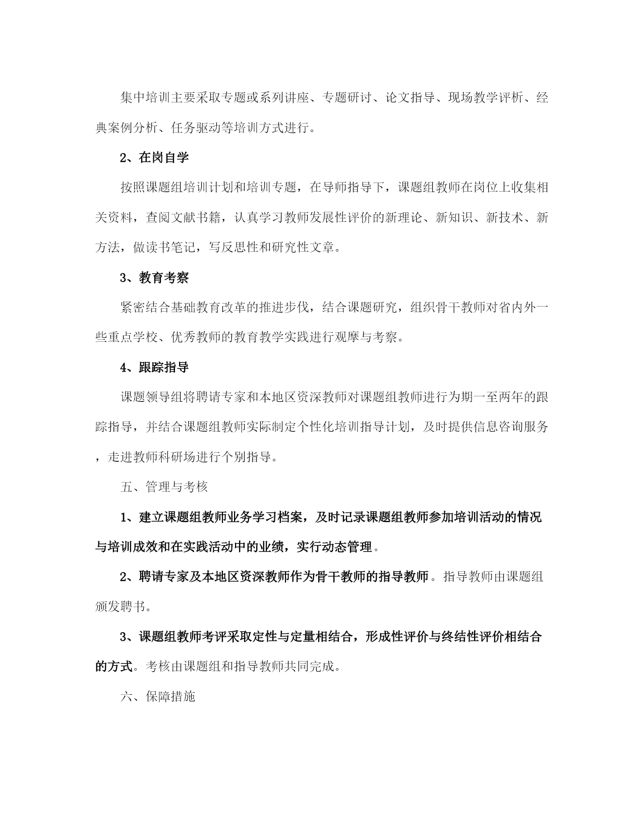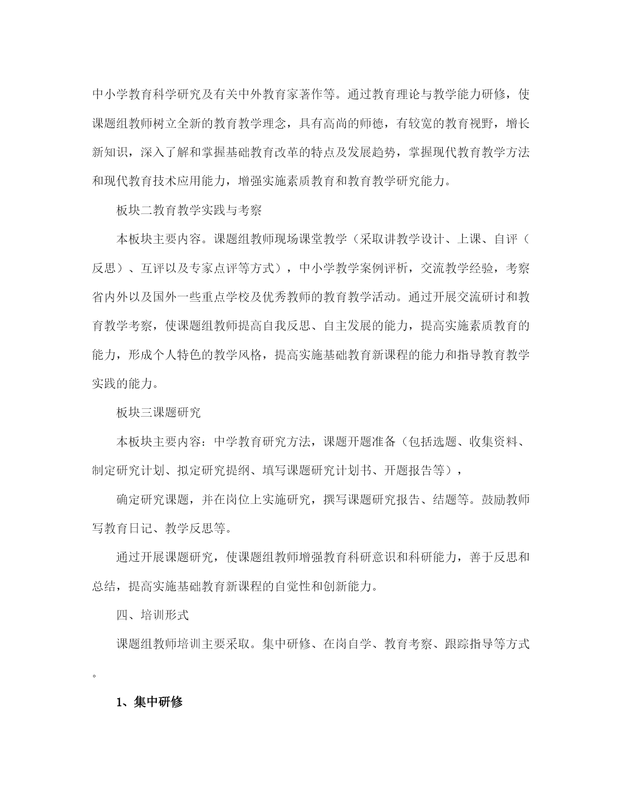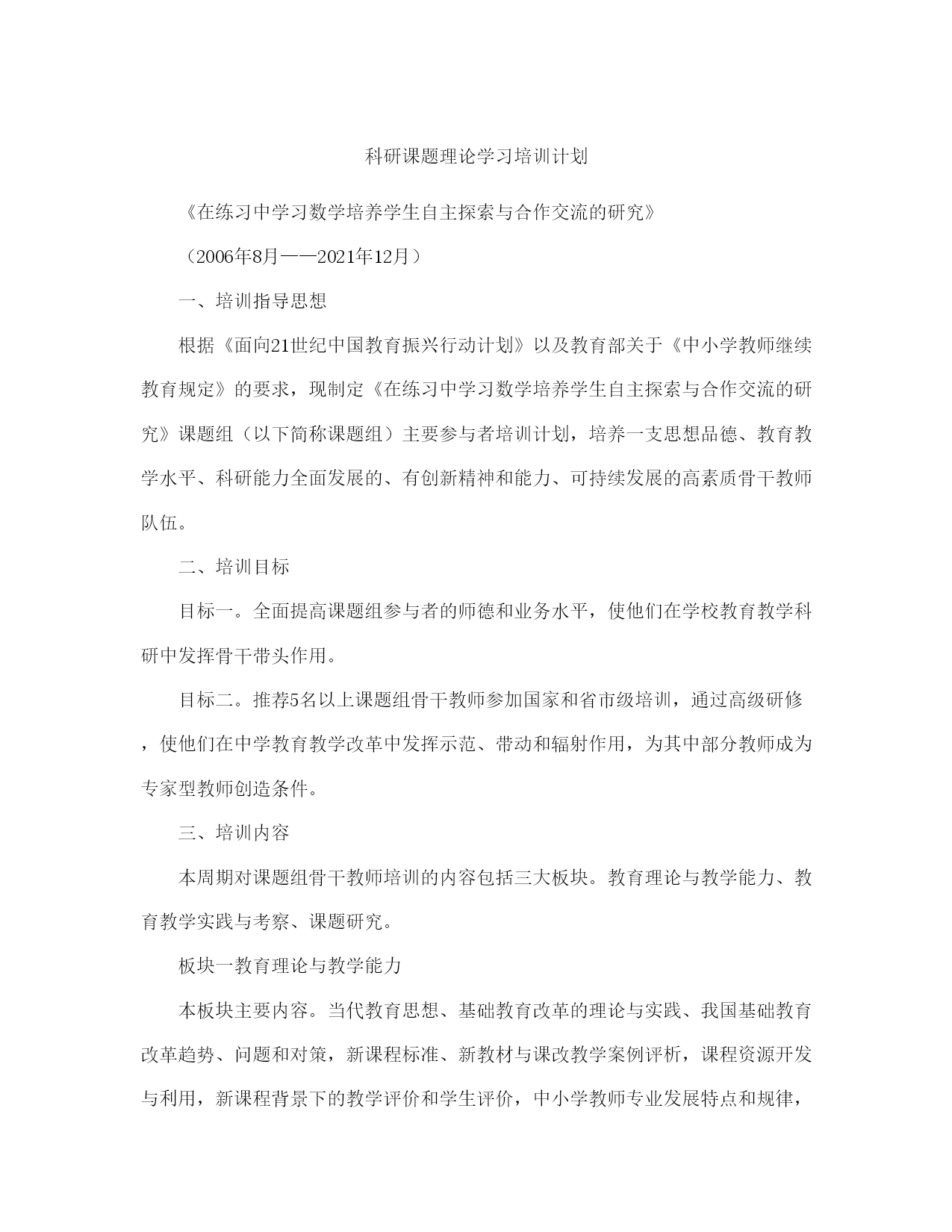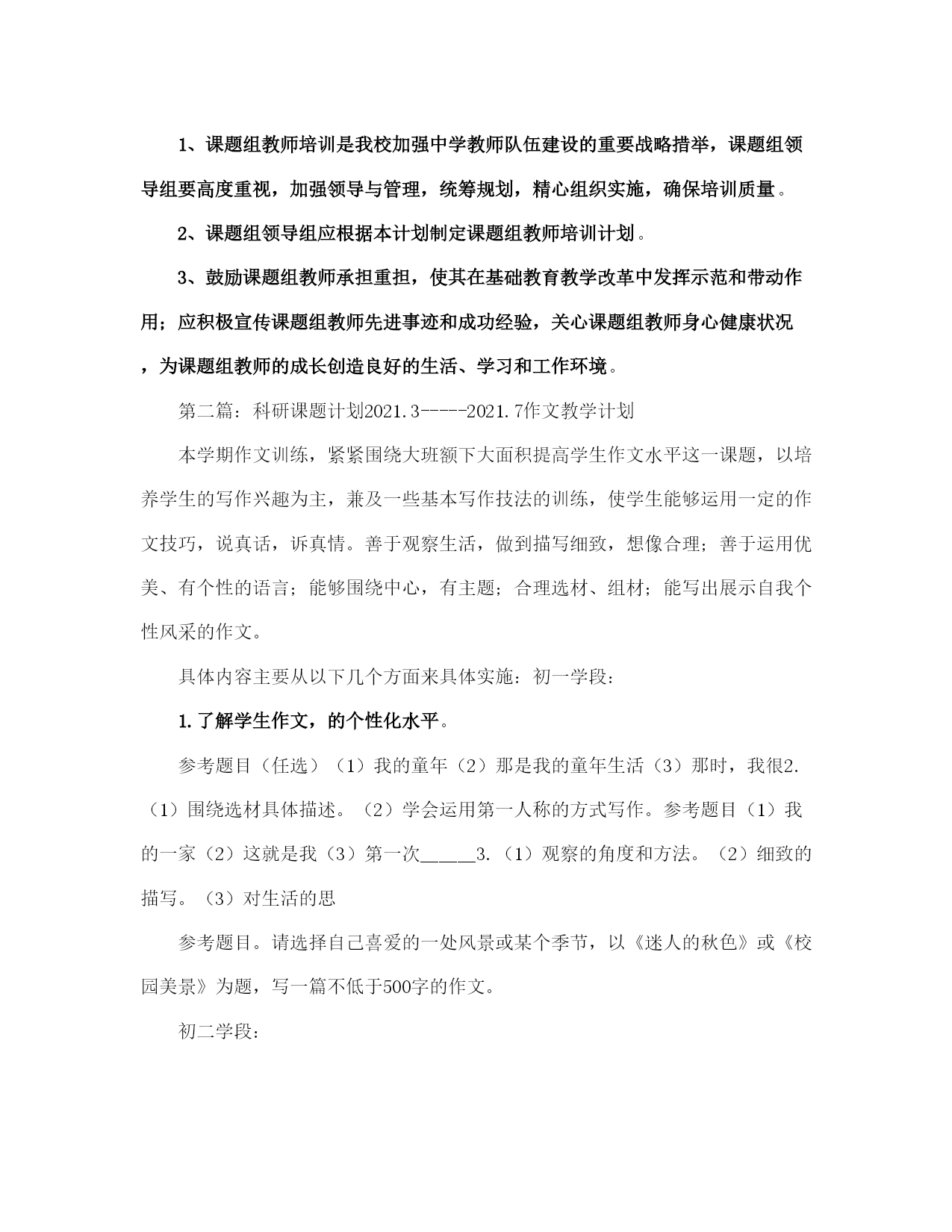 科研课题理论学习培训计划(完整版)文档资料可直接使用,可编辑,欢迎下载科研课题理论学习培训计划《在练习中学习数学培养学生自主探索与合作交流的研究》(2006年8月——2021年12月)一、培训指导思想根据《面向21世纪中国教育振兴行动计划》以及教育部关于《中小学教师继续教育规定》的要求,现制定《在练习中学习数学培养学生自主探索与合作交流的研究》课题组(以下简称课题组)主要参与者培训计划,培养一支思想品德、教育教学水平、科研能力全面发展的、有创新精神和能力、可持续发展的高素质骨干教师队伍。二、培训目标目标一。全面提高课题组参与者的师德和业务水平,使他们在学校教育教学科研中发挥骨干带头作用。目标二。推荐5名以上课题组骨干教师参加国家和省市级培训,通过高级研修,使他们在中学教育教学改革中发挥示范、带动和辐射作用,为其中部分教师成为专家型教师创造条件。三、培训内容本周期对课题组骨干教师培训的内容包括三大板块。教育理论与教学能力、教育教学实践与考察、课题研究。板块一教育理论与教学能力本板块主要内容。当代教育思想、基础教育改革的理论与实践、我国基础教育改革趋势、问题和对策,新课程标准、新教材与课改教学案例评析,课程资源开发与利用,新课程背景下的教学评价和学生评价,中小学教师专业发展特点和规律,中小学教育科学研究及有关中外教育家著作等。通过教育理论与教学能力研修,使课题组教师树立全新的教育教学理念,具有高尚的师德,有较宽的教育视野,增长新知识,深入了解和掌握基础教育改革的特点及发展趋势,掌握现代教育教学方法和现代教育技术应用能力,增强实施素质教育和教育教学研究能力。板块二教育教学实践与考察本板块主要内容。课题组教师现场课堂教学(采取讲教学设计、上课、自评(反思)、互评以及专家点评等方式),中小学教学案例评析,交流教学经验,考察省内外以及国外一些重点学校及优秀教师的教育教学活动。通过开展交流研讨和教育教学考察,使课题组教师提高自我反思、自主发展的能力,提高实施素质教育的能力,形成个人特色的教学风格,提高实施基础教育新课程的能力和指导教育教学实践的能力。板块三课题研究本板块主要内容:中学教育研究方法,课题开题准备(包括选题、收集资料、制定研究计划、拟定研究提纲、填写课题研究计划书、开题报告等),确定研究课题,并在岗位上实施研究,撰写课题研究报告、结题等。鼓励教师写教育日记、教学反思等。通过开展课题研究,使课题组教师增强教育科研意识和科研能力,善于反思和总结,提高实施基础教育新课程的自觉性和创新能力。四、培训形式课题组教师培训主要采取。集中研修、在岗自学、教育考察、跟踪指导等方式。1、集中研修集中培训主要采取专题或系列讲座、专题研讨、论文指导、现场教学评析、经典案例分析、任务驱动等培训方式进行。2、在岗自学按照课题组培训计划和培训专题,在导师指导下,课题组教师在岗位上收集相关资料,查阅文献书籍,认真学习教师发展性评价的新理论、新知识、新技术、新方法,做读书笔记,写反思性和研究性文章。3、教育考察紧密结合基础教育改革的推进步伐,结合课题研究,组织骨干教师对省内外一些重点学校、优秀教师的教育教学实践进行观摩与考察。4、跟踪指导课题领导组将聘请专家和本地区资深教师对课题组教师进行为期一至两年的跟踪指导,并结合课题组教师实际制定个性化培训指导计划,及时提供信息咨询服务,走进教师科研场进行个别指导。五、管理与考核1、建立课题组教师业务学习档案,及时记录课题组教师参加培训活动的情况与培训成效和在实践活动中的业绩,实行动态管理。2、聘请专家及本地区资深教师作为骨干教师的指导教师。指导教师由课题组颁发聘书。3、课题组教师考评采取定性与定量相结合,形成性评价与终结性评价相结合的方式。考核由课题组和指导教师共同完成。六、保障措施1、课题组教师培训是我校加强中学教师队伍建设的重要战略措举,课题组领导组要高度重视,加强领导与管理,统筹规划,精心组织实施,确保培训质量。2、课题组领导组应根据本计划制定课题组教师培训计划。3、鼓励课题组教师承担重担,使其在基础教育教学改革中发挥示范和带动作用;应积极宣传课题组教师先进事迹和成功经验,关心课题组教师身心健康状况,为课题组教师的成长创造良好的生活、学习和工作环境。第二篇:科研课题计划2021.3-----2021.7作文教学计划本学期作文训练,紧紧围绕大班额下大面积提高学生作文水平这一课题,以培养学生的写作兴趣为主,兼及一些基本写作技法的训练,使学生能够运用一定的作文技巧,说真话,诉真情。善于观察生活,做到描写细致,想像合理;善于运用优美、有个性的语言;能够围绕中心,有主题;合理选材、组材;能写出展示自我个性风采的作文。具体内容主要从以下几个方面来具