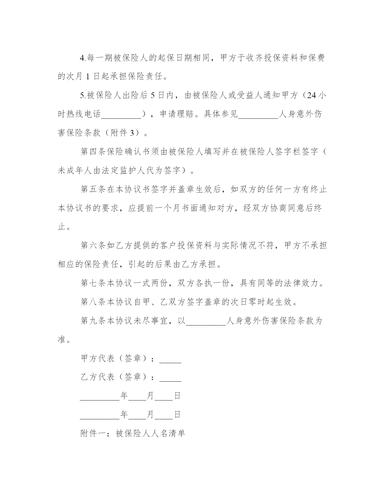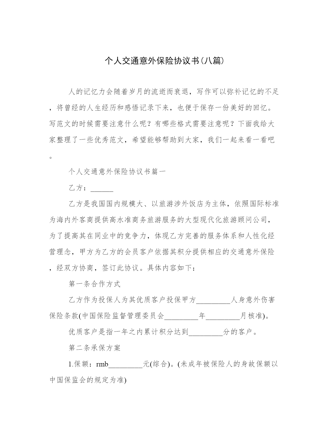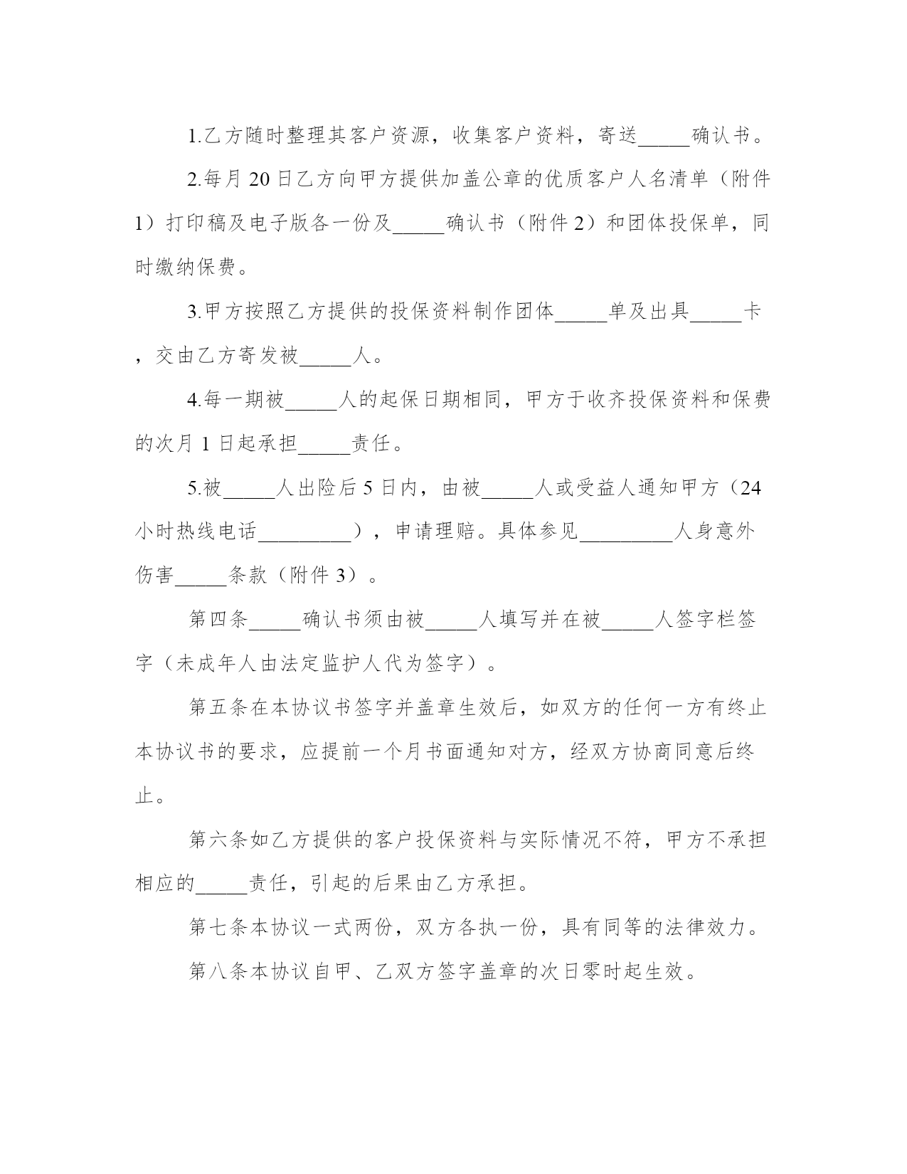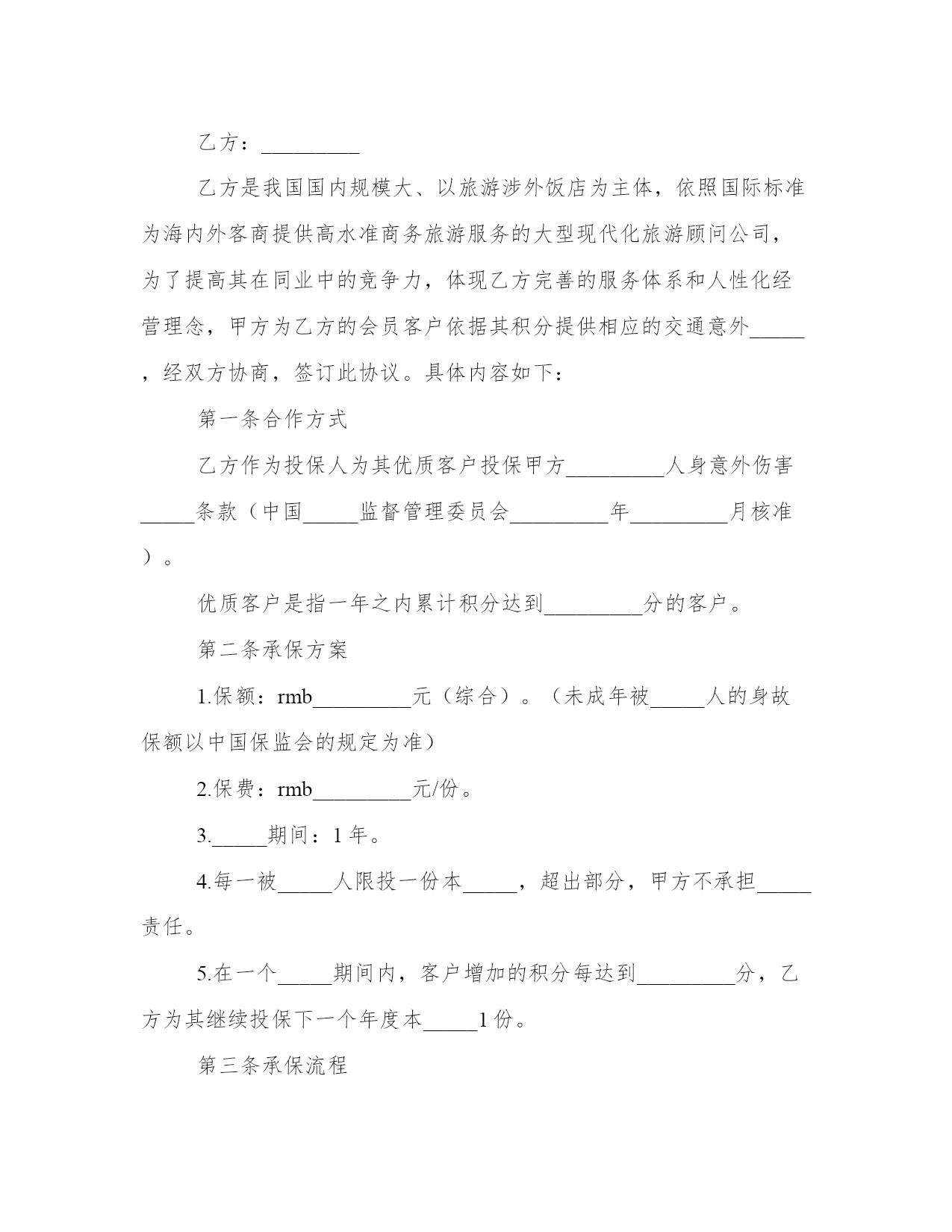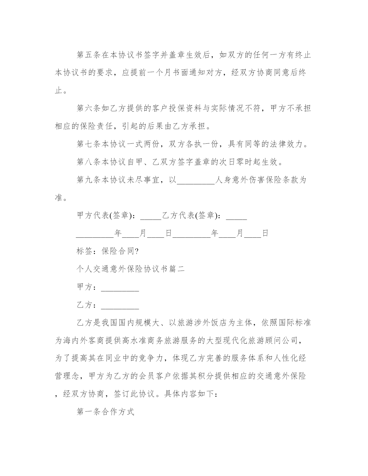 个人交通意外保险协议书(八篇)人的记忆力会随着岁月的流逝而衰退,写作可以弥补记忆的不足,将曾经的人生经历和感悟记录下来,也便于保存一份美好的回忆。写范文的时候需要注意什么呢?有哪些格式需要注意呢?下面我给大家整理了一些优秀范文,希望能够帮助到大家,我们一起来看一看吧。个人交通意外保险协议书篇一乙方:______乙方是我国国内规模大、以旅游涉外饭店为主体,依照国际标准为海内外客商提供高水准商务旅游服务的大型现代化旅游顾问公司,为了提高其在同业中的竞争力,体现乙方完善的服务体系和人性化经营理念,甲方为乙方的会员客户依据其积分提供相应的交通意外保险,经双方协商,签订此协议。具体内容如下:第一条合作方式乙方作为投保人为其优质客户投保甲方_________人身意外伤害保险条款(中国保险监督管理委员会_________年_________月核准)。优质客户是指一年之内累计积分达到_________分的客户。第二条承保方案1.保额:rmb_________元(综合)。(未成年被保险人的身故保额以中国保监会的规定为准)2.保费:rmb_________元/份。3.保险期间:1年。4.每一被保险人限投一份本保险,超出部分,甲方不承担保险责任。5.在一个保险期间内,客户增加的积分每达到_________分,乙方为其继续投保下一个年度本保险1份。第三条承保流程1.乙方随时整理其客户资源,收集客户资料,寄送保险确认书。2.每月20日乙方向甲方提供加盖公章的优质客户人名清单(附件1)打印稿及电子版各一份及保险确认书(附件2)和团体投保单,同时缴纳保费。3.甲方按照乙方提供的投保资料制作团体保险单及出具保险卡,交由乙方寄发被保险人。4.每一期被保险人的起保日期相同,甲方于收齐投保资料和保费的次月1日起承担保险责任。5.被保险人出险后5日内,由被保险人或受益人通知甲方(24小时热线电话_________),申请理赔。具体参见_________人身意外伤害保险条款(附件3)。第四条保险确认书须由被保险人填写并在被保险人签字栏签字(未成年人由法定监护人代为签字)。第五条在本协议书签字并盖章生效后,如双方的任何一方有终止本协议书的要求,应提前一个月书面通知对方,经双方协商同意后终止。第六条如乙方提供的客户投保资料与实际情况不符,甲方不承担相应的保险责任,引起的后果由乙方承担。第七条本协议一式两份,双方各执一份,具有同等的法律效力。第八条本协议自甲、乙双方签字盖章的次日零时起生效。第九条本协议未尽事宜,以_________人身意外伤害保险条款为准。甲方代表(签章):_____乙方代表(签章):______________年____月____日_________年____月____日标签:保险合同?个人交通意外保险协议书篇二甲方:_________乙方:_________乙方是我国国内规模大、以旅游涉外饭店为主体,依照国际标准为海内外客商提供高水准商务旅游服务的大型现代化旅游顾问公司,为了提高其在同业中的竞争力,体现乙方完善的服务体系和人性化经营理念,甲方为乙方的会员客户依据其积分提供相应的交通意外保险,经双方协商,签订此协议。具体内容如下:第一条合作方式乙方作为投保人为其优质客户投保甲方_________人身意外伤害保险条款(中国保险监督管理委员会_________年_________月核准)。优质客户是指一年之内累计积分达到_________分的客户。第二条承保方案1.保额:rmb_________元(综合)。(未成年被保险人的身故保额以中国保监会的规定为准)2.保费:rmb_________元/份。3.保险期间:1年。4.每一被保险人限投一份本保险,超出部分,甲方不承担保险责任。5.在一个保险期间内,客户增加的积分每达到_________分,乙方为其继续投保下一个年度本保险1份。第三条承保流程1.乙方随时整理其客户资源,收集客户资料,寄送保险确认书。2.每月20日乙方向甲方提供加盖公章的优质客户人名清单(附件1)打印稿及电子版各一份及保险确认书(附件2)和团体投保单,同时缴纳保费。3.甲方按照乙方提供的投保资料制作团体保险单及出具保险卡,交由乙方寄发被保险人。4.每一期被保险人的起保日期相同,甲方于收齐投保资料和保费的次月1日起承担保险责任。5.被保险人出险后5日内,由被保险人或受益人通知甲方(24小时热线电话_________),申请理赔。具体参见_________人身意外伤害保险条款(附件3)。第四条保险确认书须由被保险人填写并在被保险人签字栏签字(未成年人由法定监护人代为签字)。第五条在本协议书签字并盖章生效后,如双方的任何一方有终止本协议书的要求,应提前