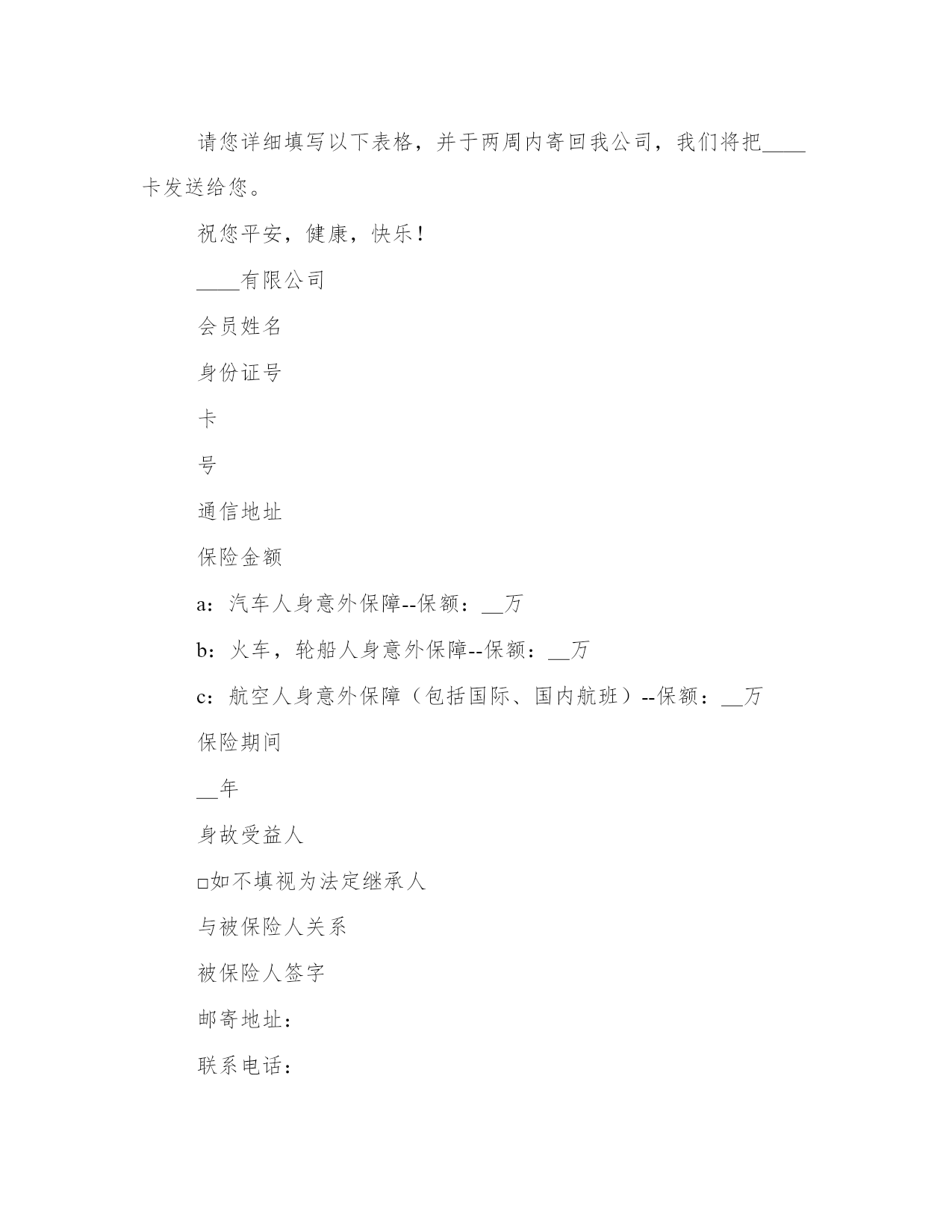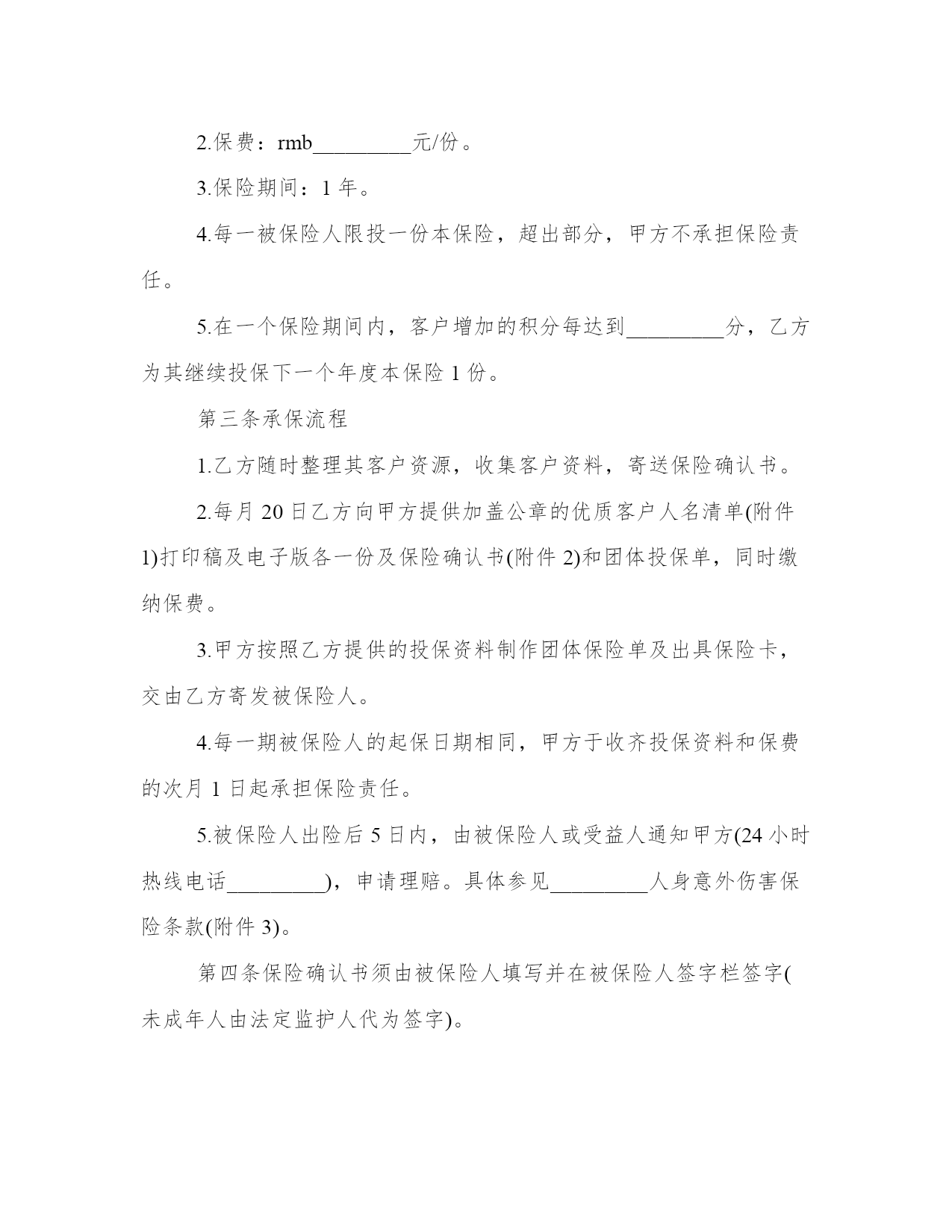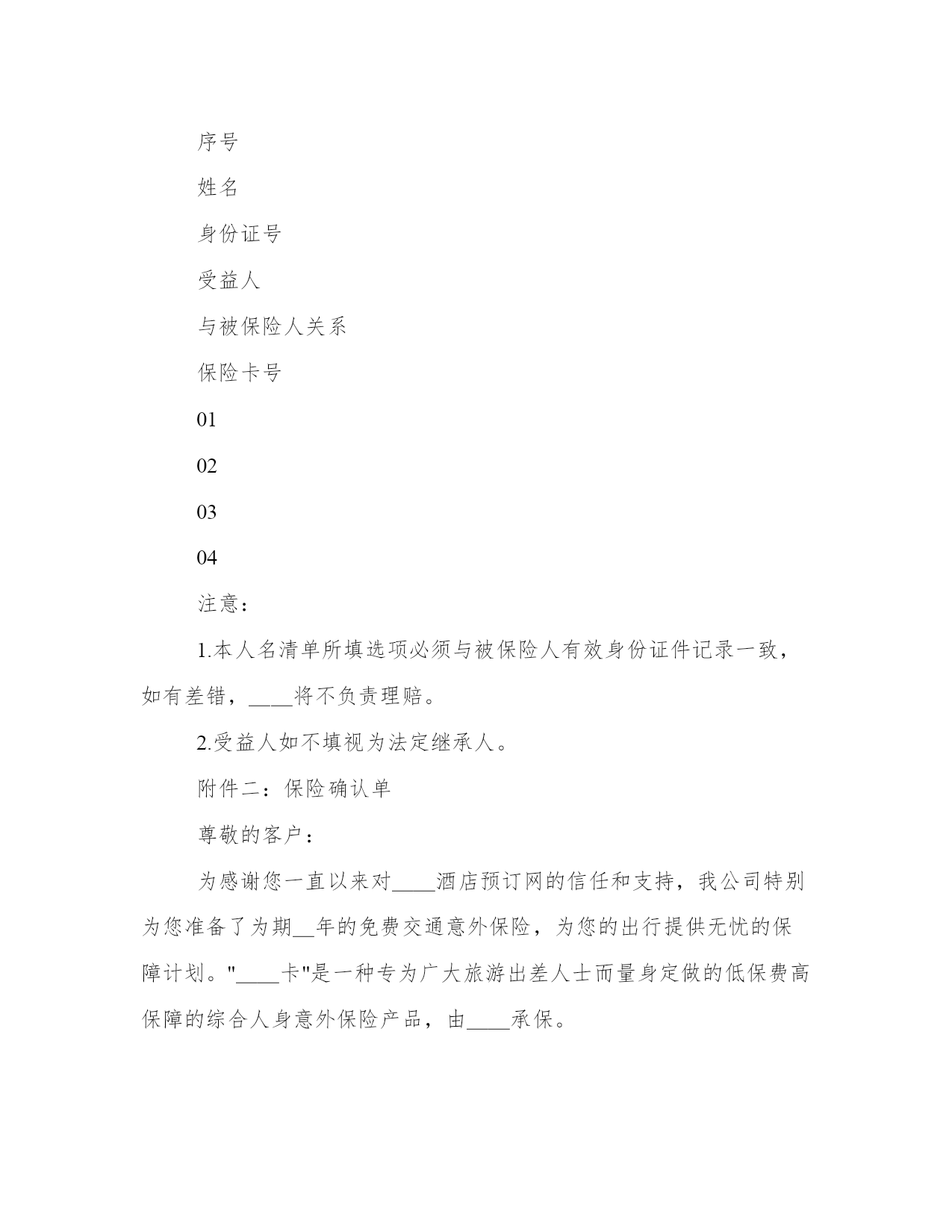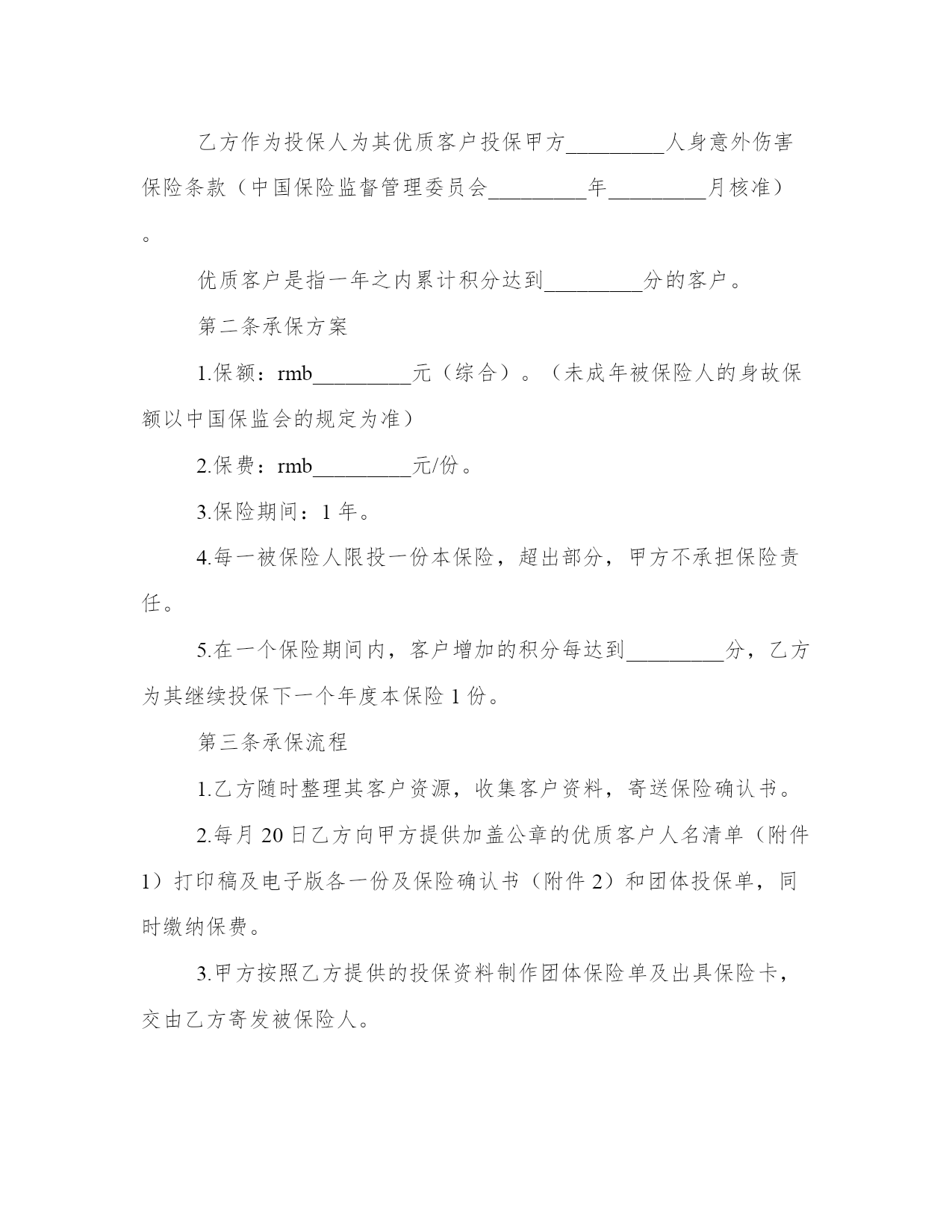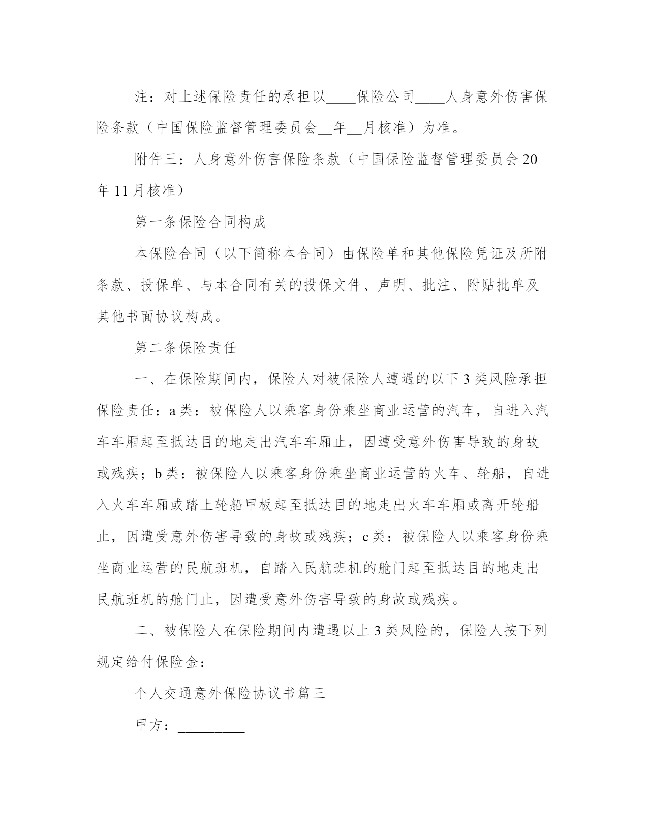 个人交通意外保险协议书(八篇)人的记忆力会随着岁月的流逝而衰退,写作可以弥补记忆的不足,将曾经的人生经历和感悟记录下来,也便于保存一份美好的回忆。写范文的时候需要注意什么呢?有哪些格式需要注意呢?下面我给大家整理了一些优秀范文,希望能够帮助到大家,我们一起来看一看吧。个人交通意外保险协议书篇一乙方:______乙方是我国国内规模大、以旅游涉外饭店为主体,依照国际标准为海内外客商提供高水准商务旅游服务的大型现代化旅游顾问公司,为了提高其在同业中的竞争力,体现乙方完善的服务体系和人性化经营理念,甲方为乙方的会员客户依据其积分提供相应的交通意外保险,经双方协商,签订此协议。具体内容如下:第一条合作方式乙方作为投保人为其优质客户投保甲方_________人身意外伤害保险条款(中国保险监督管理委员会_________年_________月核准)。优质客户是指一年之内累计积分达到_________分的客户。第二条承保方案1.保额:rmb_________元(综合)。(未成年被保险人的身故保额以中国保监会的规定为准)2.保费:rmb_________元/份。3.保险期间:1年。4.每一被保险人限投一份本保险,超出部分,甲方不承担保险责任。5.在一个保险期间内,客户增加的积分每达到_________分,乙方为其继续投保下一个年度本保险1份。第三条承保流程1.乙方随时整理其客户资源,收集客户资料,寄送保险确认书。2.每月20日乙方向甲方提供加盖公章的优质客户人名清单(附件1)打印稿及电子版各一份及保险确认书(附件2)和团体投保单,同时缴纳保费。3.甲方按照乙方提供的投保资料制作团体保险单及出具保险卡,交由乙方寄发被保险人。4.每一期被保险人的起保日期相同,甲方于收齐投保资料和保费的次月1日起承担保险责任。5.被保险人出险后5日内,由被保险人或受益人通知甲方(24小时热线电话_________),申请理赔。具体参见_________人身意外伤害保险条款(附件3)。第四条保险确认书须由被保险人填写并在被保险人签字栏签字(未成年人由法定监护人代为签字)。第五条在本协议书签字并盖章生效后,如双方的任何一方有终止本协议书的要求,应提前一个月书面通知对方,经双方协商同意后终止。第六条如乙方提供的客户投保资料与实际情况不符,甲方不承担相应的保险责任,引起的后果由乙方承担。第七条本协议一式两份,双方各执一份,具有同等的法律效力。第八条本协议自甲、乙双方签字盖章的次日零时起生效。第九条本协议未尽事宜,以_________人身意外伤害保险条款为准。甲方代表(签章):_____乙方代表(签章):______________年____月____日_________年____月____日标签:保险合同?个人交通意外保险协议书篇二甲方:_________乙方:_________乙方是我国国内规模大、以旅游涉外饭店为主体,依照国际标准为海内外客商提供高水准商务旅游服务的大型现代化旅游顾问公司,为了提高其在同业中的竞争力,体现乙方完善的服务体系和人性化经营理念,甲方为乙方的会员客户依据其积分提供相应的交通意外保险,经双方协商,签订此协议。具体内容如下:第一条合作方式乙方作为投保人为其优质客户投保甲方_________人身意外伤害保险条款(中国保险监督管理委员会_________年_________月核准)。优质客户是指一年之内累计积分达到_________分的客户。第二条承保方案1.保额:rmb_________元(综合)。(未成年被保险人的身故保额以中国保监会的规定为准)2.保费:rmb_________元/份。3.保险期间:1年。4.每一被保险人限投一份本保险,超出部分,甲方不承担保险责任。5.在一个保险期间内,客户增加的积分每达到_________分,乙方为其继续投保下一个年度本保险1份。第三条承保流程1.乙方随时整理其客户资源,收集客户资料,寄送保险确认书。2.每月20日乙方向甲方提供加盖公章的优质客户人名清单(附件1)打印稿及电子版各一份及保险确认书(附件2)和团体投保单,同时缴纳保费。3.甲方按照乙方提供的投保资料制作团体保险单及出具保险卡,交由乙方寄发被保险人。4.每一期被保险人的起保日期相同,甲方于收齐投保资料和保费的次月1日起承担保险责任。5.被保险人出险后5日内,由被保险人或受益人通知甲方(24小时热线电话_________),申请理赔。具体参见_________人身意外伤害保险条款(附件3)。第四条保险确认书须由被保险人填写并在被保险人签字栏签字(未成年人由法定监护人代为签字)。第五条在本协议书签字并盖章生效后,如双方的任何一方有终止本协议书的要求,应提前