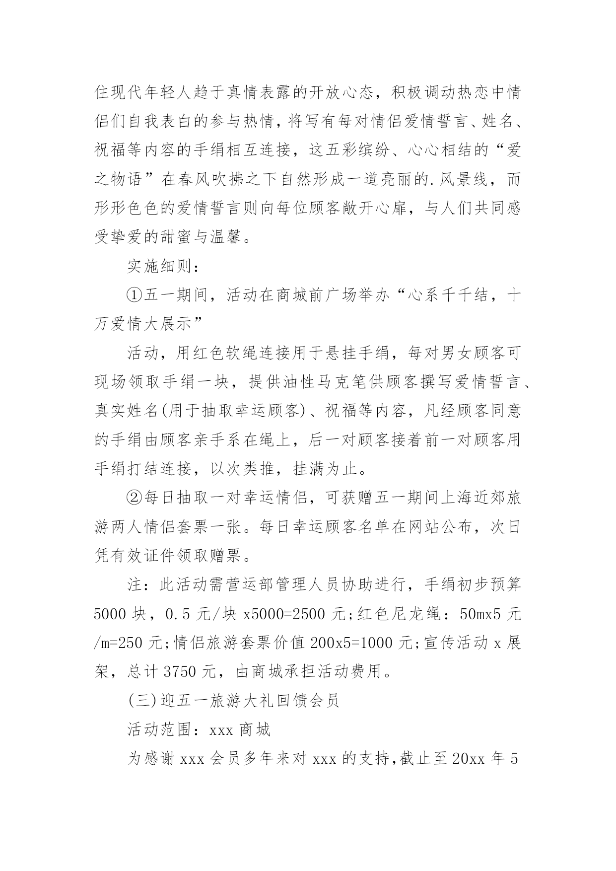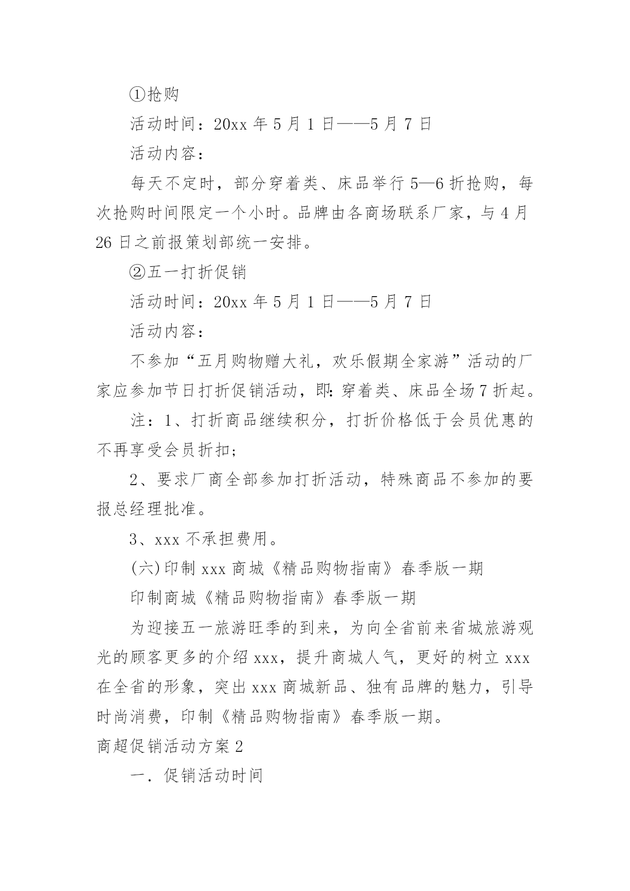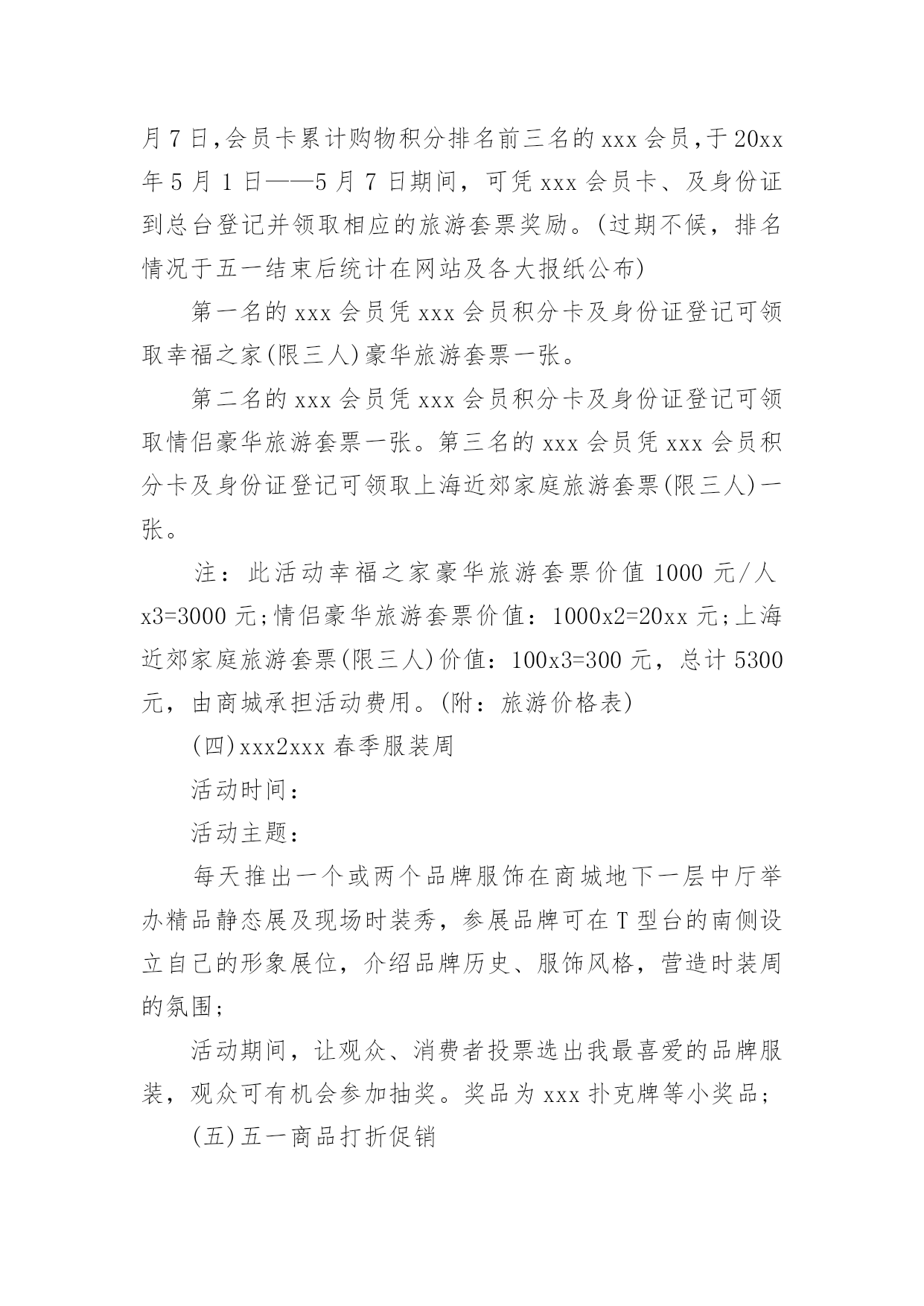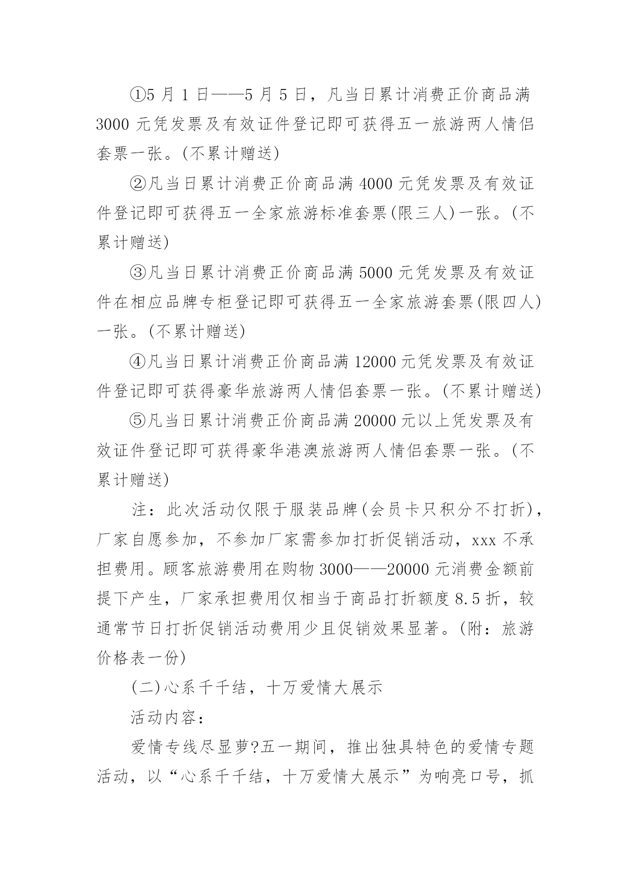 商超促销活动方案商超促销活动方案为有力保证事情或工作开展的水平质量,通常会被要求事先制定方案,方案属于计划类文书的一种。那么什么样的方案才是好的呢?下面是小编整理的商超促销活动方案,仅供参考,大家一起来看看吧。商超促销活动方案1活动背景分析:为了引导消费,激发节日冲动性消费,并且要想在五一期间取得较好的销售业绩和较有影响力的社会效应,提升xxx商城的企业形象及以文经商的特点,xxx应该举办与节日相应的各种活动,推出文化营销,使营销过程与文化享受有机结合起来,使消费者在享受多元化服务的同时,增加随机消费的欲望。从本质上区别与其他商家大同小异的一味让利打折手段来带动假日消费,真正意义上从社会角度提升xxx的形象,树立高层次的文化消费来吸引消费者,笼络高层次的消费群体,展现名店风范。拟策划以下“繁花似锦五月天,欢乐假期乐无限”五一节日主题系列活动,活动方案如下:一.系列活动主题:1.五月购物赠大礼,欢乐假期全家游2.心系千千结,十万爱情大展示3.迎五一旅游大礼回馈会员4.春季时装周5.打折促销活动6.印制xxx商城《精品购物指南》春季版一期二.活动时间:1.五月购物赠大礼,欢乐假期全家游:20xx年5月1日——5月5日2.心系千千结,十万爱情大展示:20xx年5月1日——5月5日3.迎五一旅游大礼回馈会员:20xx年5月1日——5月7日4.春季时装周:20xx年5月1日——5月5日5.打折促销活动:20xx年5月1日——5月7日三.系列活动范围:xxx商城及八一店、xxx购物广场及北园店四.系列活动内容:(一)五月购物赠大礼,欢乐假期全家游活动内容:为在五一黄金周提升xxx商城人气,创造销售佳绩,特举办“五月购物赠大礼,欢乐假期全家游”即购物赠五一情侣、全家旅游套票活动。实施细则:①5月1日——5月5日,凡当日累计消费正价商品满3000元凭发票及有效证件登记即可获得五一旅游两人情侣套票一张。(不累计赠送)②凡当日累计消费正价商品满4000元凭发票及有效证件登记即可获得五一全家旅游标准套票(限三人)一张。(不累计赠送)③凡当日累计消费正价商品满5000元凭发票及有效证件在相应品牌专柜登记即可获得五一全家旅游套票(限四人)一张。(不累计赠送)④凡当日累计消费正价商品满12000元凭发票及有效证件登记即可获得豪华旅游两人情侣套票一张。(不累计赠送)⑤凡当日累计消费正价商品满20000元以上凭发票及有效证件登记即可获得豪华港澳旅游两人情侣套票一张。(不累计赠送)注:此次活动仅限于服装品牌(会员卡只积分不打折),厂家自愿参加,不参加厂家需参加打折促销活动,xxx不承担费用。顾客旅游费用在购物3000——20000元消费金额前提下产生,厂家承担费用仅相当于商品打折额度8.5折,较通常节日打折促销活动费用少且促销效果显著。(附:旅游价格表一份)(二)心系千千结,十万爱情大展示活动内容:爱情专线尽显萝?五一期间,推出独具特色的爱情专题活动,以“心系千千结,十万爱情大展示”为响亮口号,抓住现代年轻人趋于真情表露的开放心态,积极调动热恋中情侣们自我表白的参与热情,将写有每对情侣爱情誓言、姓名、祝福等内容的手绢相互连接,这五彩缤纷、心心相结的“爱之物语”在春风吹拂之下自然形成一道亮丽的.风景线,而形形色色的爱情誓言则向每位顾客敞开心扉,与人们共同感受挚爱的甜蜜与温馨。实施细则:①五一期间,活动在商城前广场举办“心系千千结,十万爱情大展示”活动,用红色软绳连接用于悬挂手绢,每对男女顾客可现场领取手绢一块,提供油性马克笔供顾客撰写爱情誓言、真实姓名(用于抽取幸运顾客)、祝福等内容,凡经顾客同意的手绢由顾客亲手系在绳上,后一对顾客接着前一对顾客用手绢打结连接,以次类推,挂满为止。②每日抽取一对幸运情侣,可获赠五一期间上海近郊旅游两人情侣套票一张。每日幸运顾客名单在网站公布,次日凭有效证件领取赠票。注:此活动需营运部管理人员协助进行,手绢初步预算5000块,0.5元/块x5000=2500元;红色尼龙绳:50mx5元/m=250元;情侣旅游套票价值200x5=1000元;宣传活动x展架,总计3750元,由商城承担活动费用。(三)迎五一旅游大礼回馈会员活动范围:xxx商城为感谢xxx会员多年来对xxx的支持,截止至20xx年5月7日,会员卡累计购物积分排名前三名的xxx会员,于20xx年5月1日——5月7日期间,可凭xxx会员卡、及身份证到总台登记并领取相应的旅游套票奖励。(过期不候,排名情况于五一结束后统计在网站及各大报纸公布)第一名的xxx会员凭xxx会员积分卡及身份证登记可领取幸福之家(限三人)豪华旅游套票一张。第二名的xxx会员凭xxx会员积分卡及身份证登记可领取情侣豪华旅游套票一张。第三名的xxx会员凭xxx会员积分卡及身份证登记可领取上海近郊家庭旅