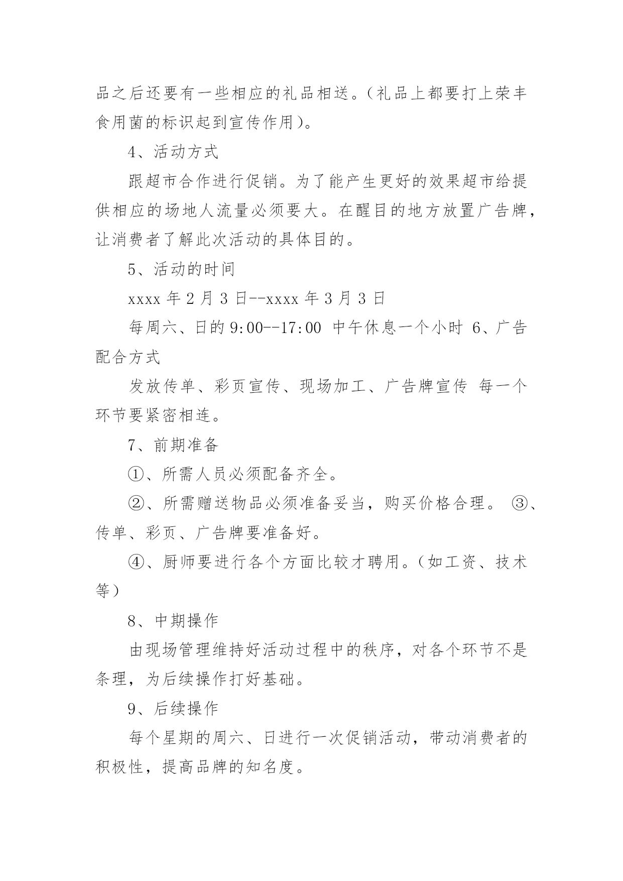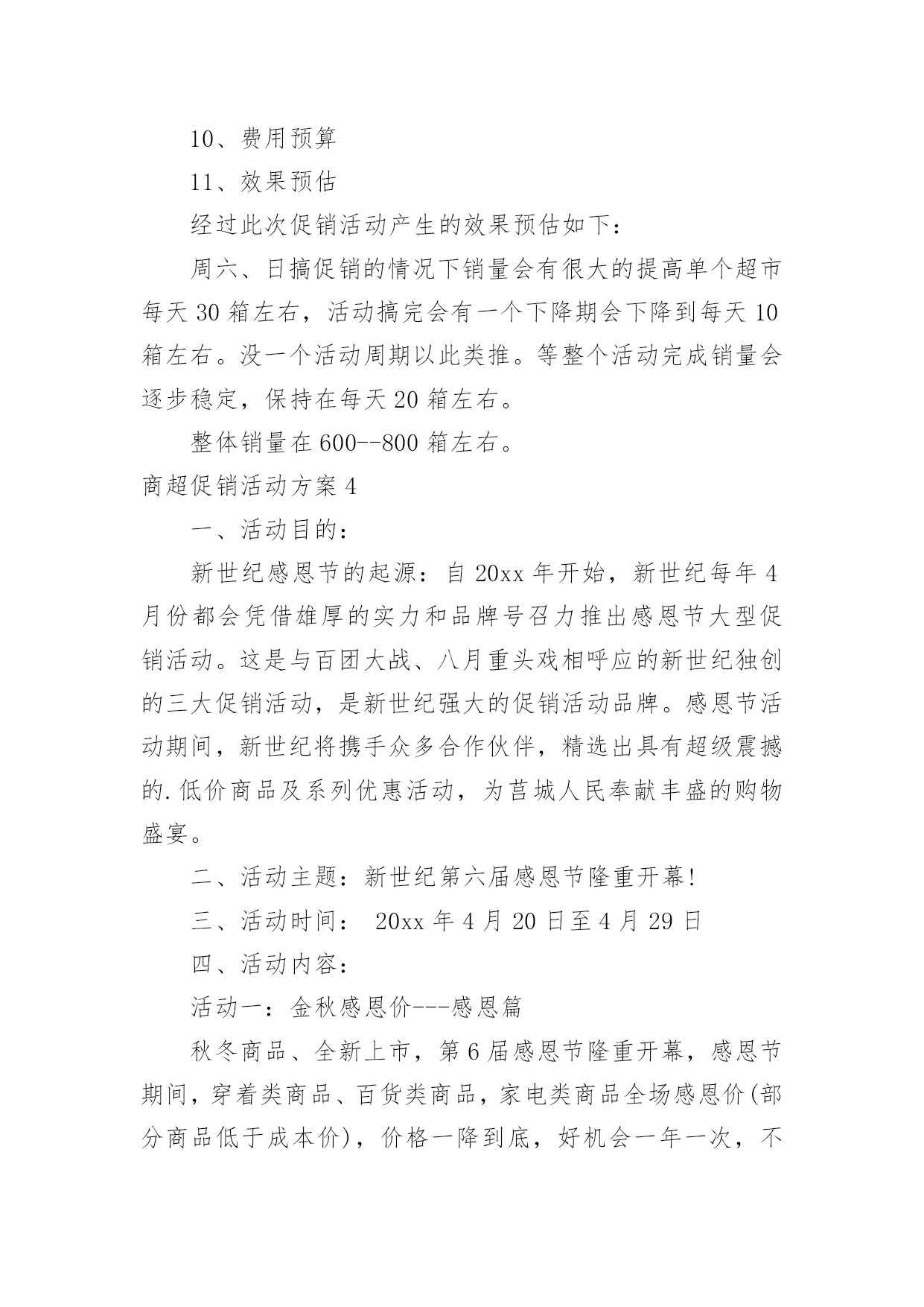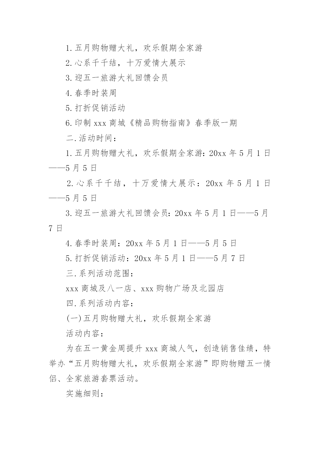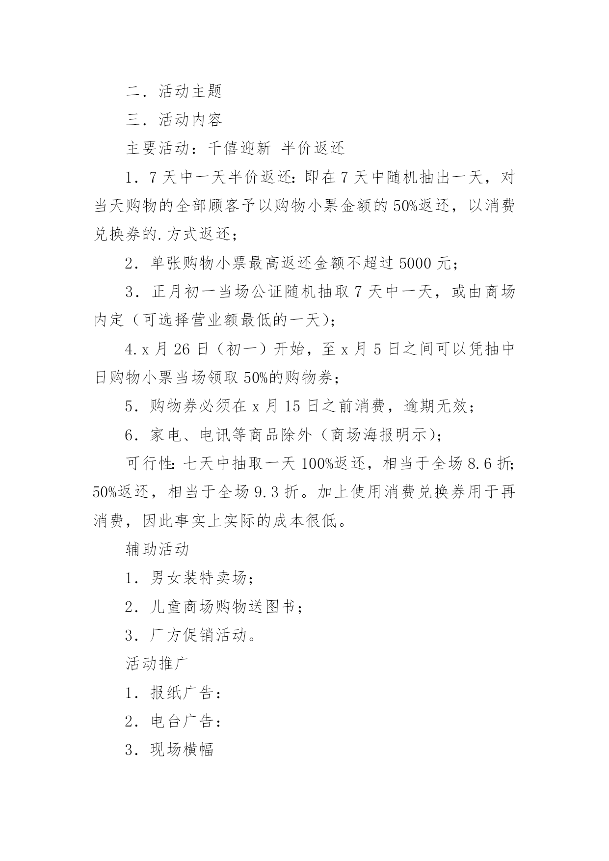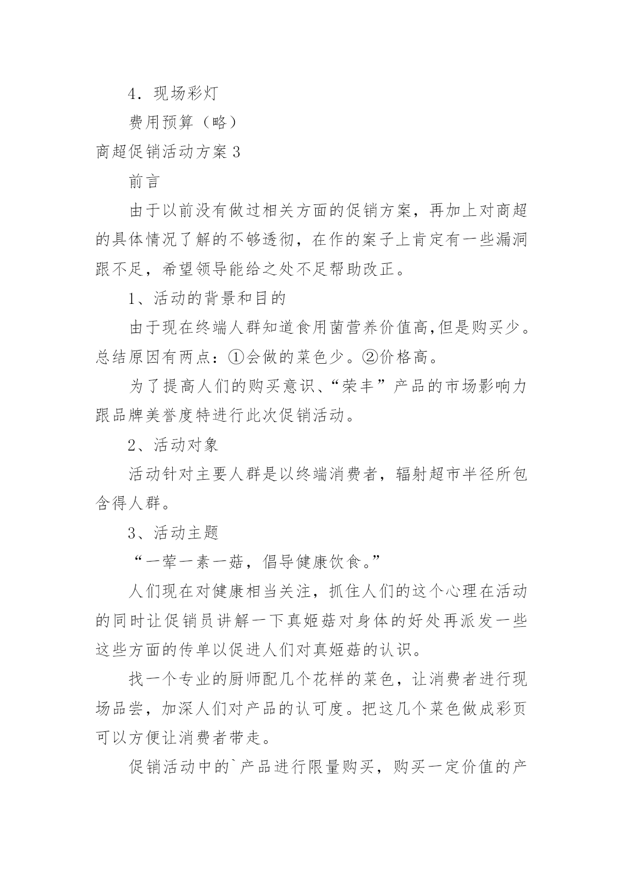 商超促销活动方案商超促销活动方案为有力保证事情或工作开展的水平质量,通常会被要求事先制定方案,方案属于计划类文书的一种。那么什么样的方案才是好的呢?下面是小编整理的商超促销活动方案,仅供参考,大家一起来看看吧。商超促销活动方案1活动背景分析:为了引导消费,激发节日冲动性消费,并且要想在五一期间取得较好的销售业绩和较有影响力的社会效应,提升xxx商城的企业形象及以文经商的特点,xxx应该举办与节日相应的各种活动,推出文化营销,使营销过程与文化享受有机结合起来,使消费者在享受多元化服务的同时,增加随机消费的欲望。从本质上区别与其他商家大同小异的一味让利打折手段来带动假日消费,真正意义上从社会角度提升xxx的形象,树立高层次的文化消费来吸引消费者,笼络高层次的消费群体,展现名店风范。拟策划以下“繁花似锦五月天,欢乐假期乐无限”五一节日主题系列活动,活动方案如下:一.系列活动主题:1.五月购物赠大礼,欢乐假期全家游2.心系千千结,十万爱情大展示3.迎五一旅游大礼回馈会员4.春季时装周5.打折促销活动6.印制xxx商城《精品购物指南》春季版一期二.活动时间:1.五月购物赠大礼,欢乐假期全家游:20xx年5月1日——5月5日2.心系千千结,十万爱情大展示:20xx年5月1日——5月5日3.迎五一旅游大礼回馈会员:20xx年5月1日——5月7日4.春季时装周:20xx年5月1日——5月5日5.打折促销活动:20xx年5月1日——5月7日三.系列活动范围:xxx商城及八一店、xxx购物广场及北园店四.系列活动内容:(一)五月购物赠大礼,欢乐假期全家游活动内容:为在五一黄金周提升xxx商城人气,创造销售佳绩,特举办“五月购物赠大礼,欢乐假期全家游”即购物赠五一情侣、全家旅游套票活动。实施细则:①5月1日——5月5日,凡当日累计消费正价商品满3000元凭发票及有效证件登记即可获得五一旅游两人情侣套票一张。(不累计赠送)②凡当日累计消费正价商品满4000元凭发票及有效证件登记即可获得五一全家旅游标准套票(限三人)一张。(不累计赠送)③凡当日累计消费正价商品满5000元凭发票及有效证件在相应品牌专柜登记即可获得五一全家旅游套票(限四人)一张。(不累计赠送)④凡当日累计消费正价商品满12000元凭发票及有效证件登记即可获得豪华旅游两人情侣套票一张。(不累计赠送)⑤凡当日累计消费正价商品满20000元以上凭发票及有效证件登记即可获得豪华港澳旅游两人情侣套票一张。(不累计赠送)注:此次活动仅限于服装品牌(会员卡只积分不打折),厂家自愿参加,不参加厂家需参加打折促销活动,xxx不承担费用。顾客旅游费用在购物3000——20000元消费金额前提下产生,厂家承担费用仅相当于商品打折额度8.5折,较通常节日打折促销活动费用少且促销效果显著。(附:旅游价格表一份)(二)心系千千结,十万爱情大展示活动内容:爱情专线尽显萝?五一期间,推出独具特色的爱情专题活动,以“心系千千结,十万爱情大展示”为响亮口号,抓住现代年轻人趋于真情表露的开放心态,积极调动热恋中情侣们自我表白的参与热情,将写有每对情侣爱情誓言、姓名、祝福等内容的手绢相互连接,这五彩缤纷、心心相结的“爱之物语”在春风吹拂之下自然形成一道亮丽的.风景线,而形形色色的爱情誓言则向每位顾客敞开心扉,与人们共同感受挚爱的甜蜜与温馨。实施细则:①五一期间,活动在商城前广场举办“心系千千结,十万爱情大展示”活动,用红色软绳连接用于悬挂手绢,每对男女顾客可现场领取手绢一块,提供油性马克笔供顾客撰写爱情誓言、真实姓名(用于抽取幸运顾客)、祝福等内容,凡经顾客同意的手绢由顾客亲手系在绳上,后一对顾客接着前一对顾客用手绢打结连接,以次类推,挂满为止。②每日抽取一对幸运情侣,可获赠五一期间上海近郊旅游两人情侣套票一张。每日幸运顾客名单在网站公布,次日凭有效证件领取赠票。注:此活动需营运部管理人员协助进行,手绢初步预算5000块,0.5元/块x5000=2500元;红色尼龙绳:50mx5元/m=250元;情侣旅游套票价值200x5=1000元;宣传活动x展架,总计3750元,由商城承担活动费用。(三)迎五一旅游大礼回馈会员活动范围:xxx商城为感谢xxx会员多年来对xxx的支持,截止至20xx年5月7日,会员卡累计购物积分排名前三名的xxx会员,于20xx年5月1日——5月7日期间,可凭xxx会员卡、及身份证到总台登记并领取相应的旅游套票奖励。(过期不候,排名情况于五一结束后统计在网站及各大报纸公布)第一名的xxx会员凭xxx会员积分卡及身份证登记可领取幸福之家(限三人)豪华旅游套票一张。第二名的xxx会员凭xxx会员积分卡及身份证登记可领取情侣豪华旅游套票一张。第三名的xxx会员凭xxx会员积分卡及身份证登记可领取上海近郊家庭旅