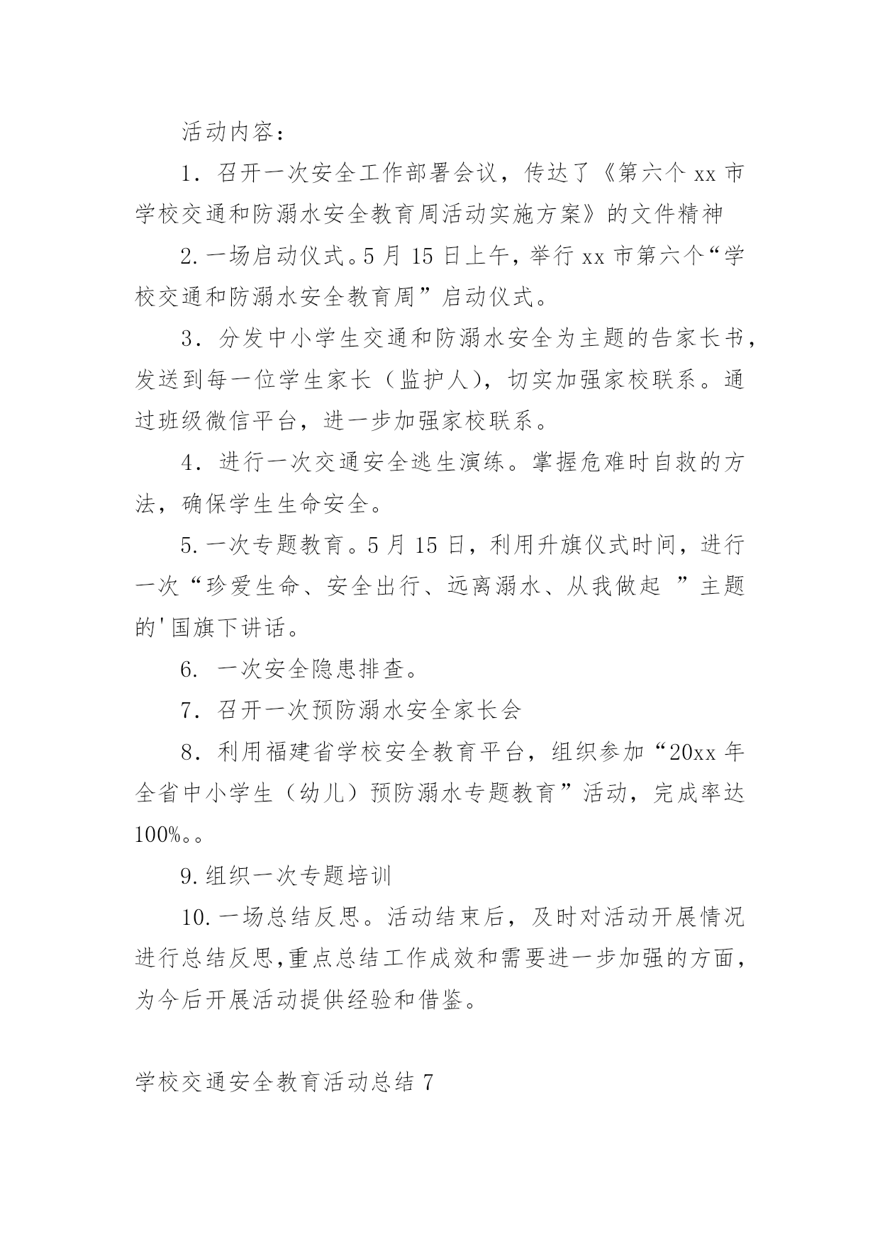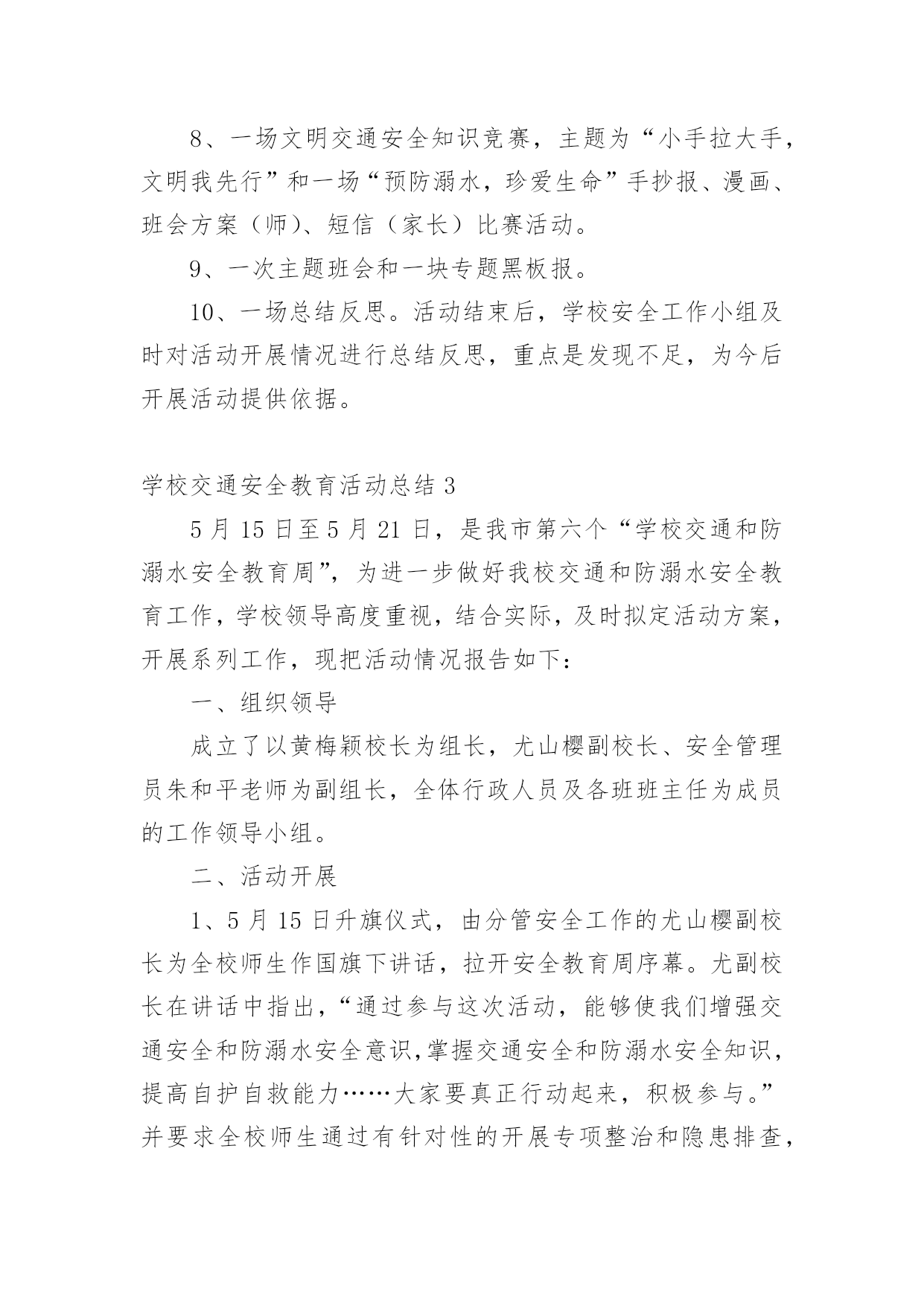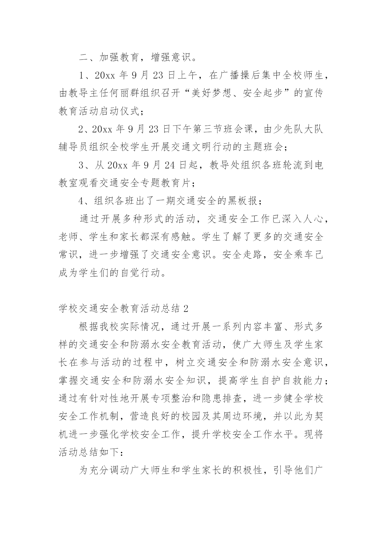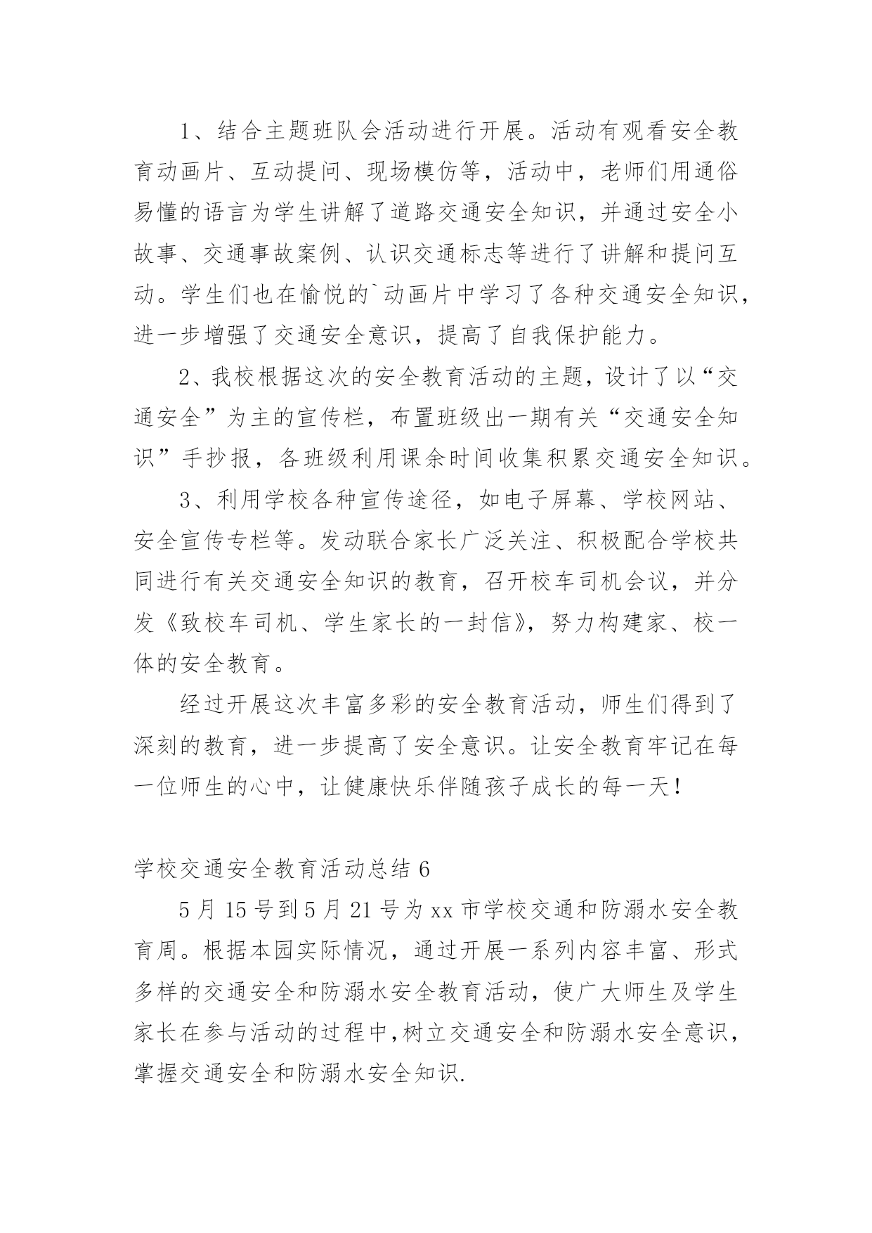 学校交通安全教育活动总结总结是在某一特定时间段对学习和工作生活或其完成情况,包括取得的成绩、存在的问题及得到的经验和教训加以回顾和分析的书面材料,它可以促使我们思考,不妨让我们认真地完成总结吧。你想知道总结怎么写吗?下面是小编收集整理的学校交通安全教育活动总结,仅供参考,欢迎大家阅读。学校交通安全教育活动总结1根据上级《关于开展桂林市“美好梦想、安全起步”中小学生交通安全宣传月活动的通知》,我校通过开展形式多样的学习教育活动,加大安全的宣传力度,增强了全体学生的安全观念,牢固树立了“安全第一,预防为主”的思想。我们根据上级要求,依据地理位置和实际情况,把“美好梦想、安全起步”活动作为我校德育特色活动,切实加强对学生交通法规教育,增强学生交通安全意识,确保学生交通安全。通过开展丰富多彩的宣传教育活动,为提高师生的交通安全知识、增强道路交通安全意识提供了保障,取得了较好的效果。一、加强领导,落实责任。为保证活动长期有序地开展,我校成立了以莫育强校长为组长的领导小组,负责组织和安排学校的`交通安全教育工作,把学生的交通安全教育列入重要的议事日程。二、加强教育,增强意识。1、20xx年9月23日上午,在广播操后集中全校师生,由教导主任何丽群组织召开“美好梦想、安全起步”的宣传教育活动启动仪式;2、20xx年9月23日下午第三节班会课,由少先队大队辅导员组织全校学生开展交通文明行动的主题班会;3、从20xx年9月24日起,教导处组织各班轮流到电教室观看交通安全专题教育片;4、组织各班出了一期交通安全的黑板报;通过开展多种形式的活动,交通安全工作已深入人心,老师、学生和家长都深有感触。学生了解了更多的交通安全常识,进一步增强了交通安全意识。安全走路,安全乘车己成为学生们的自觉行动。学校交通安全教育活动总结2根据我校实际情况,通过开展一系列内容丰富、形式多样的交通安全和防溺水安全教育活动,使广大师生及学生家长在参与活动的过程中,树立交通安全和防溺水安全意识,掌握交通安全和防溺水安全知识,提高学生自护自救能力;通过有针对性地开展专项整治和隐患排查,进一步健全学校安全工作机制,营造良好的校园及其周边环境,并以此为契机进一步强化学校安全工作,提升学校安全工作水平。现将活动总结如下:为充分调动广大师生和学生家长的积极性,引导他们广泛参与。活动周期间开展“十个一”活动:1、一场启动仪式。举行英塘小学第三个“学校交通和防溺水安全教育周”教育周启动仪式。2、一个公益广告。各年段各班都必须抽出时间,组织学生在班级或多媒体教室观看防溺水的.动漫电影。并可以组织学生写好观后感。3、一次专题教育。设置警示牌、宣传栏和LED屏。利用在校门口显眼位置设置警示牌和LED屏滚动交通和防溺水宣传教育标语。4、一次学生交通安全专项整治。对学生上下学交通方式进行全面调查。5、一次家校联系。发放并签收市教育局将联合相关部门印发中小学生交通和防溺水安全为主题的《告家长书》;并通过各班召开家长会,向家长了解和反映孩子在交通、游泳方面存在的安全隐患;充分发动学生家长参与20xx年全国中小学生安全知识网络竞赛活动;通过校讯短信平台每周向家长发送提醒短信,宣传交通安全和防溺水安全知识,提醒注意事项。通过各种形式,切实加强家校联系,最大限度地防止学生发生交通、溺水事故的发生。6、一次安全隐患排查。要组织由教师、学生家长和社区巡查人员参与的“学校及周边危险路段、危险水域安全隐患我发现”的调查活动。7、一次专题培训。活动期间,组织全校师生参与交通安全和防溺水安全自救等知识的培训。8、一场文明交通安全知识竞赛,主题为“小手拉大手,文明我先行”和一场“预防溺水,珍爱生命”手抄报、漫画、班会方案(师)、短信(家长)比赛活动。9、一次主题班会和一块专题黑板报。10、一场总结反思。活动结束后,学校安全工作小组及时对活动开展情况进行总结反思,重点是发现不足,为今后开展活动提供依据。学校交通安全教育活动总结35月15日至5月21日,是我市第六个“学校交通和防溺水安全教育周”,为进一步做好我校交通和防溺水安全教育工作,学校领导高度重视,结合实际,及时拟定活动方案,开展系列工作,现把活动情况报告如下:一、组织领导成立了以黄梅颖校长为组长,尤山樱副校长、安全管理员朱和平老师为副组长,全体行政人员及各班班主任为成员的工作领导小组。二、活动开展1、5月15日升旗仪式,由分管安全工作的尤山樱副校长为全校师生作国旗下讲话,拉开安全教育周序幕。尤副校长在讲话中指出,“通过参与这次活动,能够使我们增强交通安全和防溺水安全意识,掌握交通安全和防溺水安全知识,提高自护自救能力……大家要真正行动起来,积极参与。”并要求全校师生通过有针对性的开展专项整治和隐患排查,进一步健全学校安全工作机制,营造良好的校园及周边环境,为我校的教
