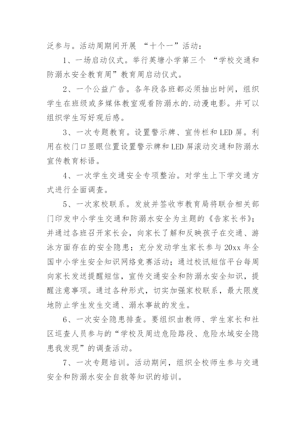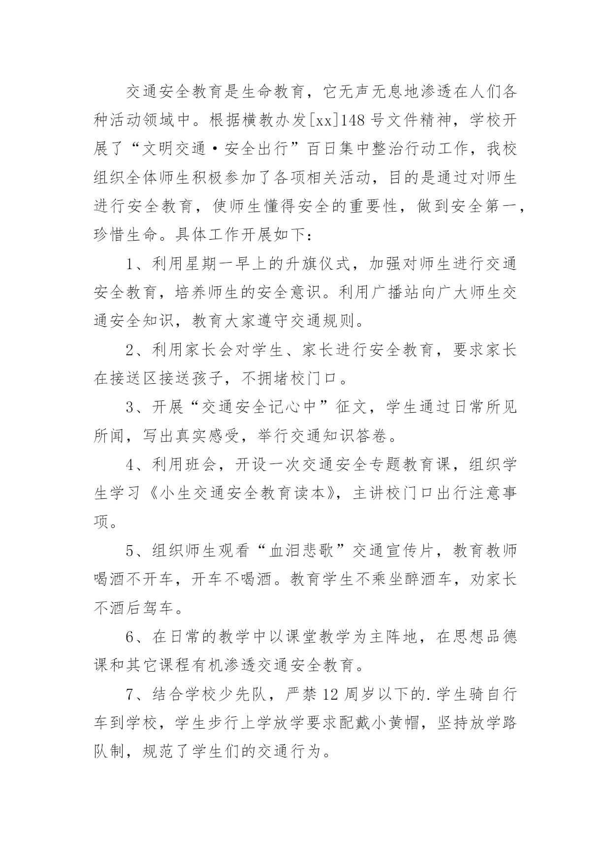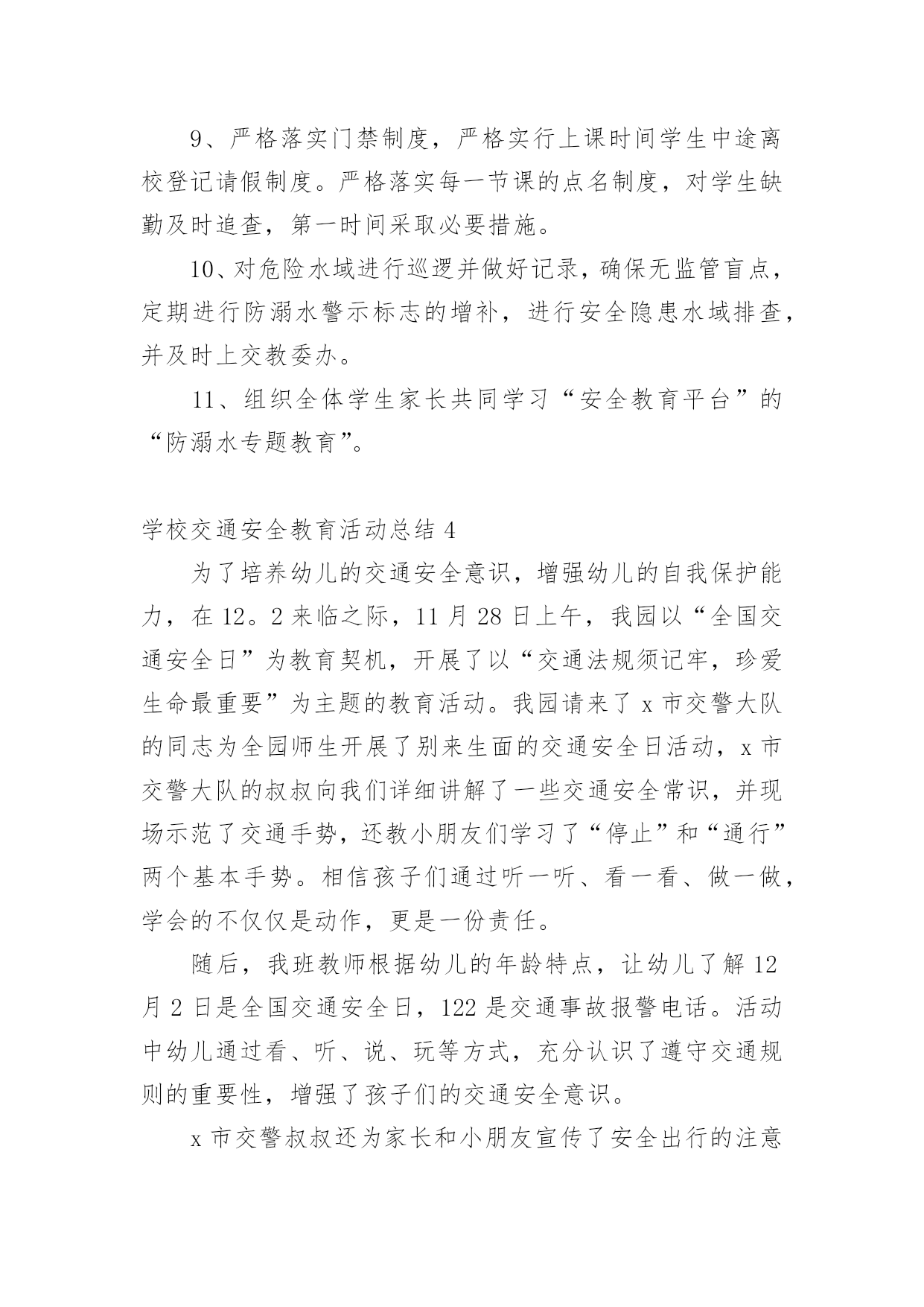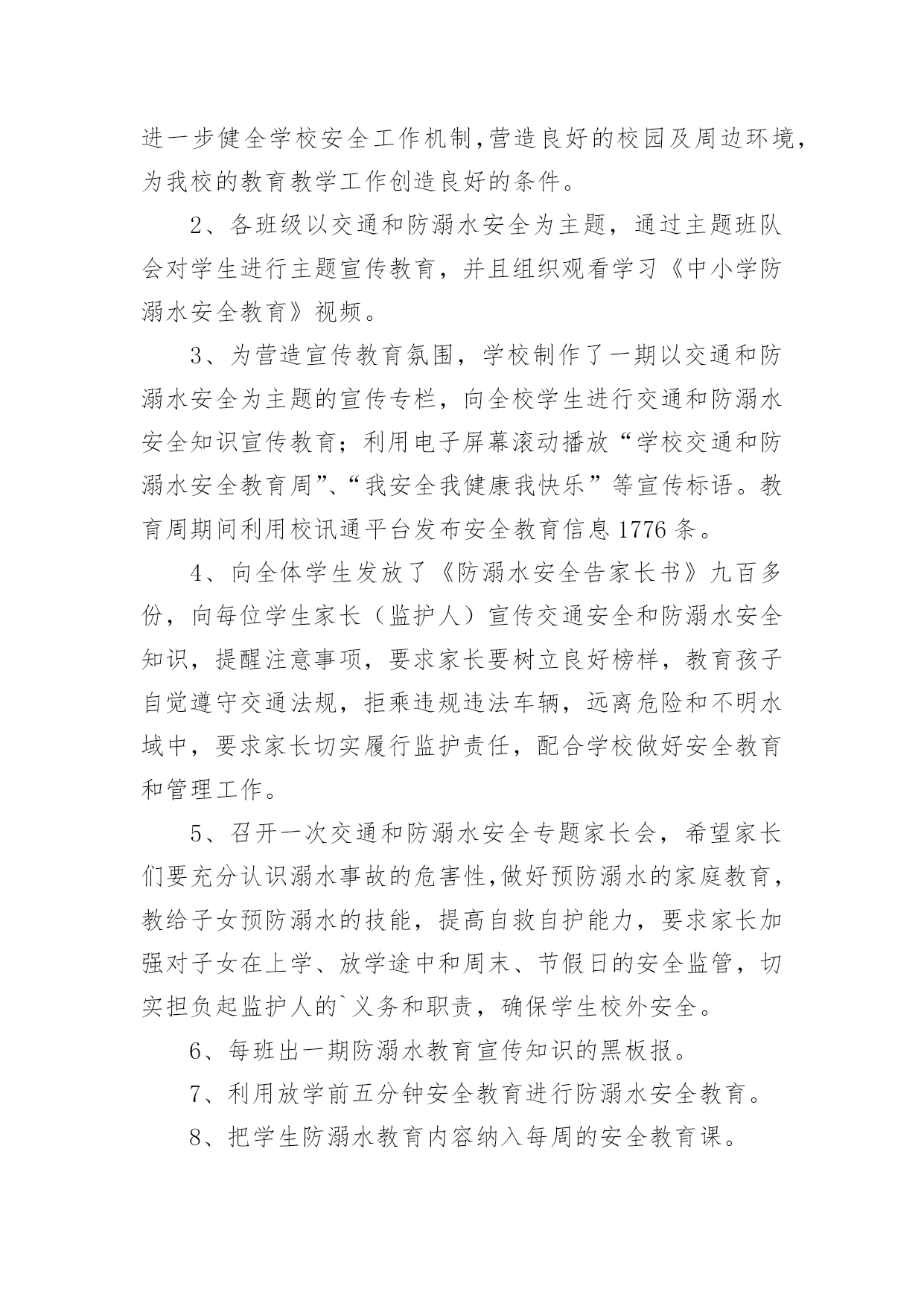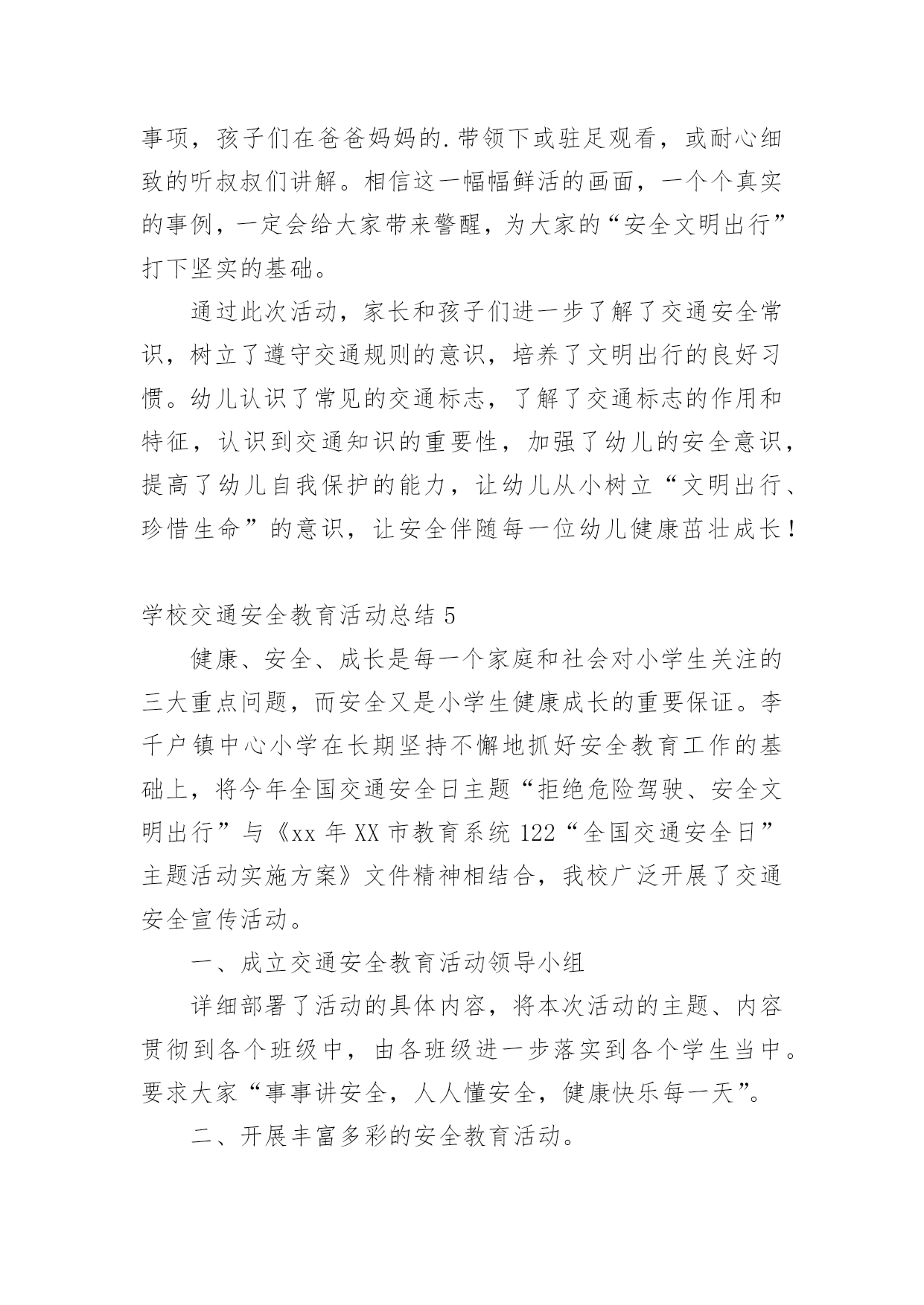 学校交通安全教育活动总结总结是在某一特定时间段对学习和工作生活或其完成情况,包括取得的成绩、存在的问题及得到的经验和教训加以回顾和分析的书面材料,它可以促使我们思考,不妨让我们认真地完成总结吧。你想知道总结怎么写吗?下面是小编收集整理的学校交通安全教育活动总结,仅供参考,欢迎大家阅读。学校交通安全教育活动总结1根据上级《关于开展桂林市“美好梦想、安全起步”中小学生交通安全宣传月活动的通知》,我校通过开展形式多样的学习教育活动,加大安全的宣传力度,增强了全体学生的安全观念,牢固树立了“安全第一,预防为主”的思想。我们根据上级要求,依据地理位置和实际情况,把“美好梦想、安全起步”活动作为我校德育特色活动,切实加强对学生交通法规教育,增强学生交通安全意识,确保学生交通安全。通过开展丰富多彩的宣传教育活动,为提高师生的交通安全知识、增强道路交通安全意识提供了保障,取得了较好的效果。一、加强领导,落实责任。为保证活动长期有序地开展,我校成立了以莫育强校长为组长的领导小组,负责组织和安排学校的`交通安全教育工作,把学生的交通安全教育列入重要的议事日程。二、加强教育,增强意识。1、20xx年9月23日上午,在广播操后集中全校师生,由教导主任何丽群组织召开“美好梦想、安全起步”的宣传教育活动启动仪式;2、20xx年9月23日下午第三节班会课,由少先队大队辅导员组织全校学生开展交通文明行动的主题班会;3、从20xx年9月24日起,教导处组织各班轮流到电教室观看交通安全专题教育片;4、组织各班出了一期交通安全的黑板报;通过开展多种形式的活动,交通安全工作已深入人心,老师、学生和家长都深有感触。学生了解了更多的交通安全常识,进一步增强了交通安全意识。安全走路,安全乘车己成为学生们的自觉行动。学校交通安全教育活动总结2根据我校实际情况,通过开展一系列内容丰富、形式多样的交通安全和防溺水安全教育活动,使广大师生及学生家长在参与活动的过程中,树立交通安全和防溺水安全意识,掌握交通安全和防溺水安全知识,提高学生自护自救能力;通过有针对性地开展专项整治和隐患排查,进一步健全学校安全工作机制,营造良好的校园及其周边环境,并以此为契机进一步强化学校安全工作,提升学校安全工作水平。现将活动总结如下:为充分调动广大师生和学生家长的积极性,引导他们广泛参与。活动周期间开展“十个一”活动:1、一场启动仪式。举行英塘小学第三个“学校交通和防溺水安全教育周”教育周启动仪式。2、一个公益广告。各年段各班都必须抽出时间,组织学生在班级或多媒体教室观看防溺水的.动漫电影。并可以组织学生写好观后感。3、一次专题教育。设置警示牌、宣传栏和LED屏。利用在校门口显眼位置设置警示牌和LED屏滚动交通和防溺水宣传教育标语。4、一次学生交通安全专项整治。对学生上下学交通方式进行全面调查。5、一次家校联系。发放并签收市教育局将联合相关部门印发中小学生交通和防溺水安全为主题的《告家长书》;并通过各班召开家长会,向家长了解和反映孩子在交通、游泳方面存在的安全隐患;充分发动学生家长参与20xx年全国中小学生安全知识网络竞赛活动;通过校讯短信平台每周向家长发送提醒短信,宣传交通安全和防溺水安全知识,提醒注意事项。通过各种形式,切实加强家校联系,最大限度地防止学生发生交通、溺水事故的发生。6、一次安全隐患排查。要组织由教师、学生家长和社区巡查人员参与的“学校及周边危险路段、危险水域安全隐患我发现”的调查活动。7、一次专题培训。活动期间,组织全校师生参与交通安全和防溺水安全自救等知识的培训。8、一场文明交通安全知识竞赛,主题为“小手拉大手,文明我先行”和一场“预防溺水,珍爱生命”手抄报、漫画、班会方案(师)、短信(家长)比赛活动。9、一次主题班会和一块专题黑板报。10、一场总结反思。活动结束后,学校安全工作小组及时对活动开展情况进行总结反思,重点是发现不足,为今后开展活动提供依据。学校交通安全教育活动总结35月15日至5月21日,是我市第六个“学校交通和防溺水安全教育周”,为进一步做好我校交通和防溺水安全教育工作,学校领导高度重视,结合实际,及时拟定活动方案,开展系列工作,现把活动情况报告如下:一、组织领导成立了以黄梅颖校长为组长,尤山樱副校长、安全管理员朱和平老师为副组长,全体行政人员及各班班主任为成员的工作领导小组。二、活动开展1、5月15日升旗仪式,由分管安全工作的尤山樱副校长为全校师生作国旗下讲话,拉开安全教育周序幕。尤副校长在讲话中指出,“通过参与这次活动,能够使我们增强交通安全和防溺水安全意识,掌握交通安全和防溺水安全知识,提高自护自救能力……大家要真正行动起来,积极参与。”并要求全校师生通过有针对性的开展专项整治和隐患排查,进一步健全学校安全工作机制,营造良好的校园及周边环境,为我校的教
