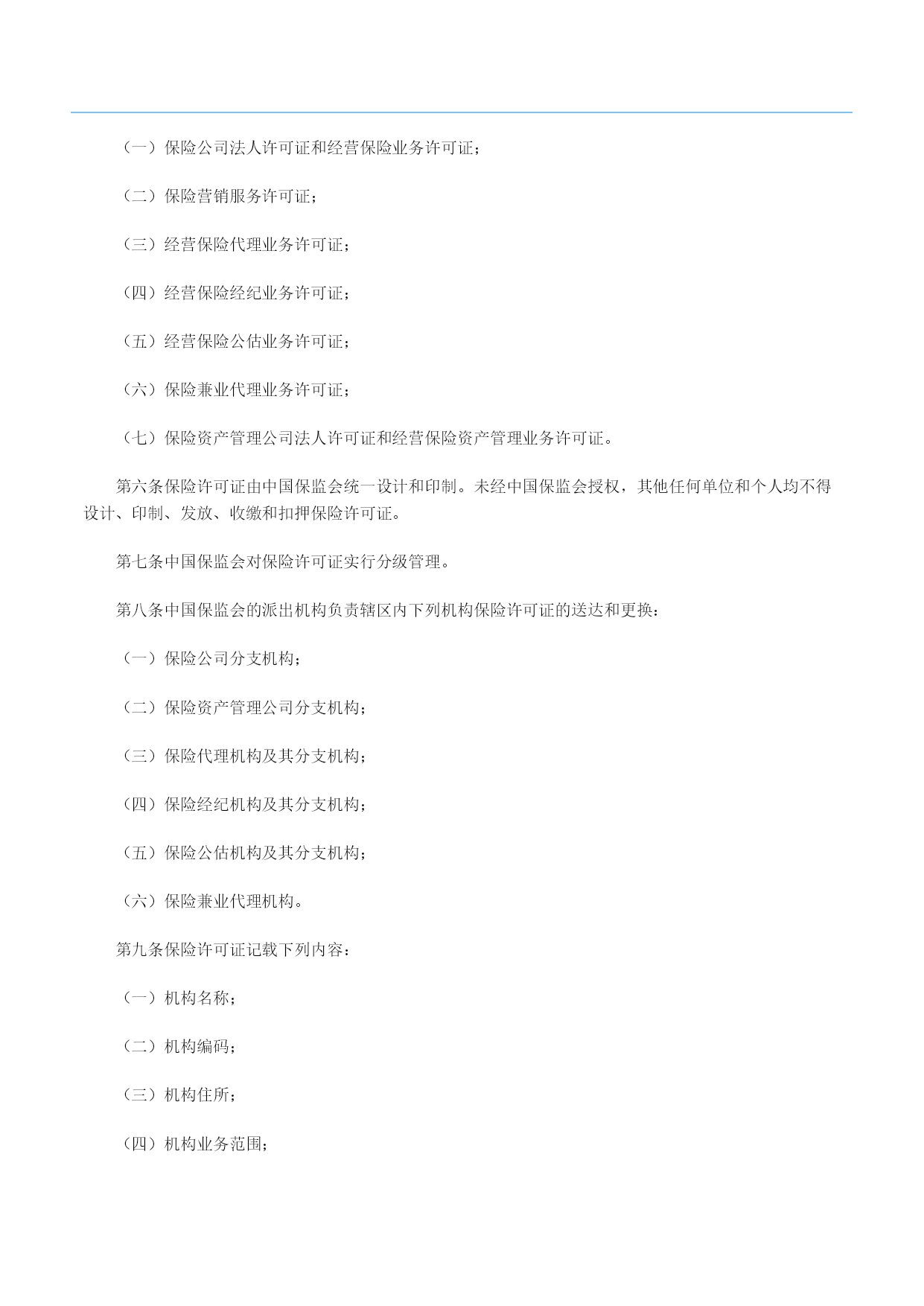 保险许可证管理办法2007-07-02【字体:HYPERLINK"javascript:doZoom(16)"大HYPERLINK"javascript:doZoom(14)"中HYPERLINK"javascript:doZoom(12)"小】【HYPERLINK"javascript:print()"打印本页】【HYPERLINK"javascript:close()"关闭窗口】2007年第1号《保险许可证管理办法》已经2007年5月11日中国保险监督管理委员会主席办公会审议通过,现予公布,自2007年9月1日起施行。主席吴定富二○○七年六月二十二日保险许可证管理办法第一条为了加强保险许可证的管理,规范保险业许可活动,维护保险市场秩序,根据《中华人民共和国保险法》、《中华人民共和国行政许可法》等法律、行政法规,制定本办法。第二条中国保险监督管理委员会(以下简称“中国保监会”)负责保险许可证的颁发和管理。中国保监会的派出机构,在中国保监会授权范围内行使保险许可证的颁发和管理职权。第三条中国保监会遵循依法、公开、公正、便民、高效的原则,建立保险许可证监督管理制度。第四条中华人民共和国境内的下列保险类机构,应当依法取得保险许可证:(一)经营保险业务的保险控股公司和保险集团公司;(二)保险公司及其分支机构;(三)保险资产管理公司及其分支机构;(四)保险代理机构、保险经纪机构、保险公估机构及其分支机构;(五)保险兼业代理机构;(六)中国保监会规定的其他保险类机构。第五条本办法所称保险许可证包括下列几种类型:(一)保险公司法人许可证和经营保险业务许可证;(二)保险营销服务许可证;(三)经营保险代理业务许可证;(四)经营保险经纪业务许可证;(五)经营保险公估业务许可证;(六)保险兼业代理业务许可证;(七)保险资产管理公司法人许可证和经营保险资产管理业务许可证。第六条保险许可证由中国保监会统一设计和印制。未经中国保监会授权,其他任何单位和个人均不得设计、印制、发放、收缴和扣押保险许可证。第七条中国保监会对保险许可证实行分级管理。第八条中国保监会的派出机构负责辖区内下列机构保险许可证的送达和更换:(一)保险公司分支机构;(二)保险资产管理公司分支机构;(三)保险代理机构及其分支机构;(四)保险经纪机构及其分支机构;(五)保险公估机构及其分支机构;(六)保险兼业代理机构。第九条保险许可证记载下列内容:(一)机构名称;(二)机构编码;(三)机构住所;(四)机构业务范围;(五)机构地域范围;(六)行政许可决定日期;(七)颁发许可证日期;(八)发证机关。保险许可证加盖中国保监会印章方可生效。第十条保险类机构实行全国统一编码。中国保监会按照保险类机构的编码打印保险许可证。保险许可证的机构编码实行永久制。保险许可证记载事项变更、有效期届满、遗失或者破损,保险类机构申请领取新许可证的,新许可证继续沿用原机构编码。保险类机构性质变更、跨地区迁址或者依法终止的,该机构编码自动作废。第十一条保险许可证记载事项的内容应当与行政许可决定文件的内容保持一致。第十二条中国保监会作出准予行政许可决定,需要颁发保险许可证的,应当向行政许可申请人颁发保险许可证。中国保监会应当在行政许可决定作出之日起10日内,将行政许可决定与保险许可证同时送达行政许可申请人。第十三条中国保监会送达行政许可决定、保险许可证,应当直接送达,直接送达有困难的,可以邮寄送达。中国保监会直接送达的,必须有送达回证,由行政许可申请人在送达回证上注明收到日期、签名或者盖章。邮寄送达的,必须保留邮寄凭证。邮寄凭证上注明的邮寄日期为送达日期。第十四条中国保监会直接送达或者邮寄送达行政许可决定有困难的,可以公告送达。中国保监会公告送达行政许可决定的,自发出公告之日起,经过2个月,即视为送达。行政许可申请人应当自准予行政许可决定公告送达之日起2个月内,向中国保监会领取保险许可证。逾期不领取的,行政许可决定和保险许可证自动失效。第十五条保险类机构应当妥善保管保险许可证。任何单位和个人不得伪造、变造、出租、转借、转让保险许可证。第十六条保险类机构应当将保险许可证原件放置于营业场所显著位置,以备查验。第十七条中国保监会应当加强保险许可证的信息管理,建立完整的机构管理档案系统,依法披露保险许可证的有关信息。第十八条保险许可证记载事项发生变更的,保险类机构应当向中国保监会缴回原证,并领取新保险许可证。前款所称事项变更须经中国保监会批准的,保险类机构应当自批准决定作出之日起2个月内向中国保监会领取新保险许可证;前款所称变更事项不需要中国保监会批准的,保险类机构应当自变更事项发生之日