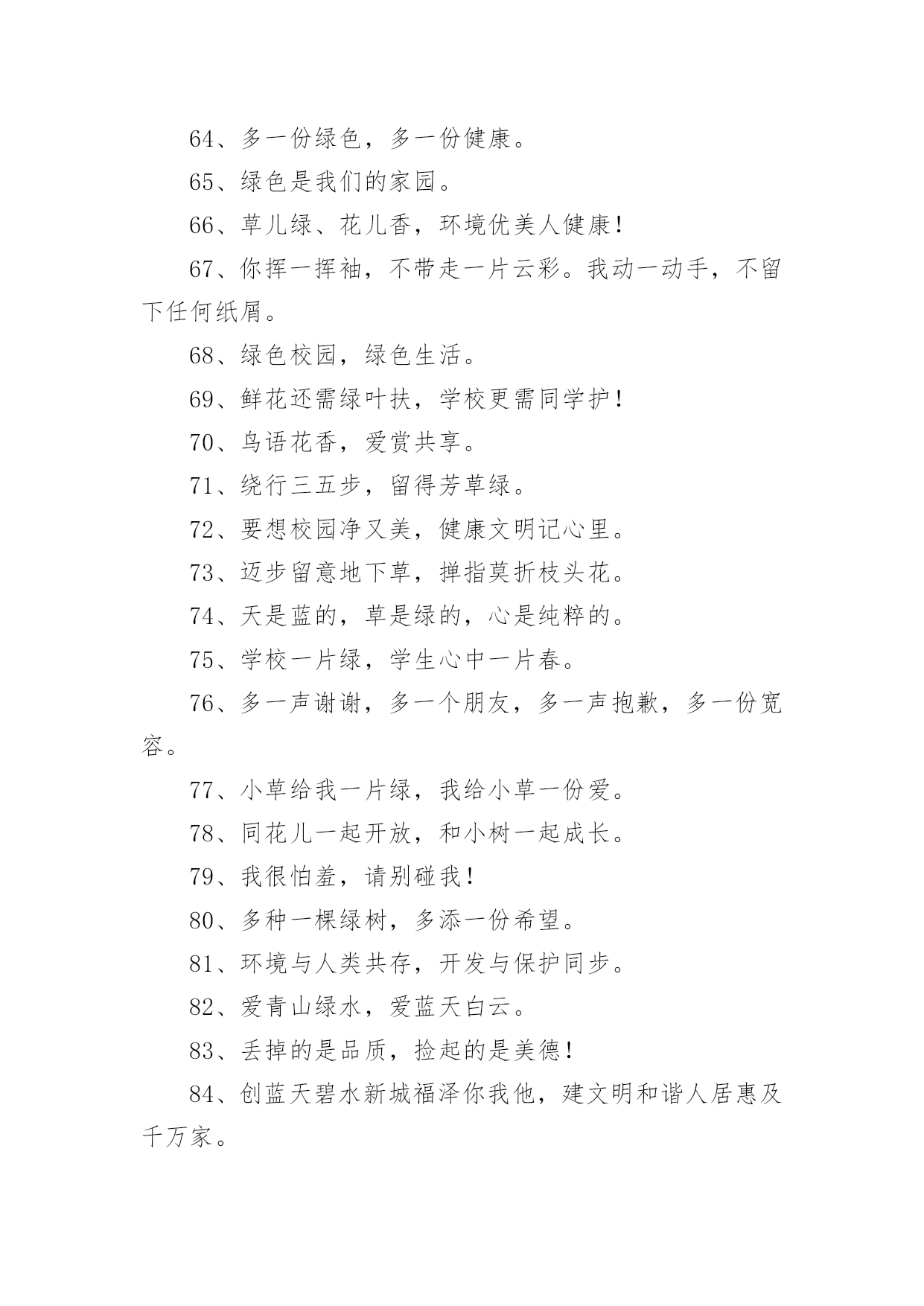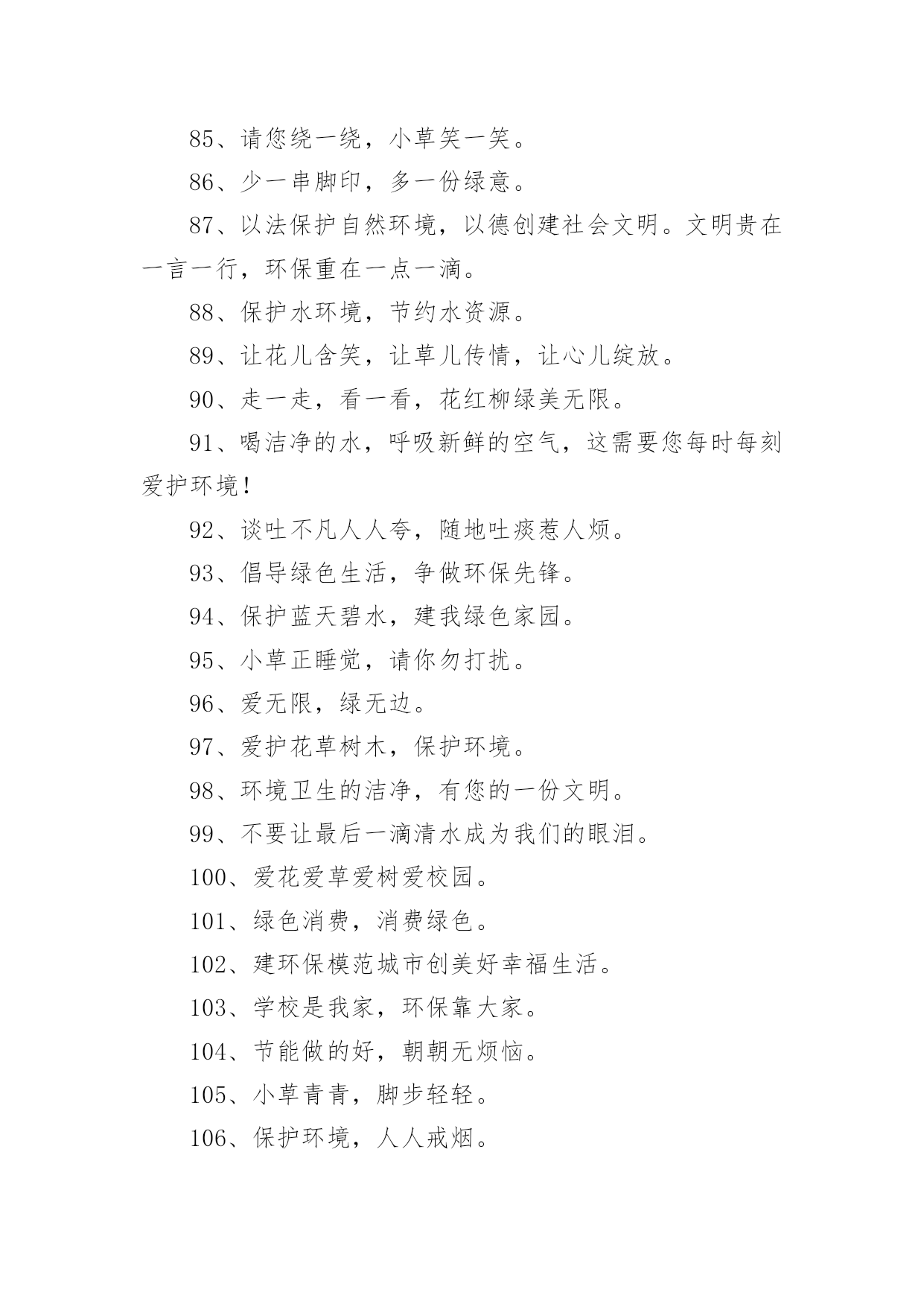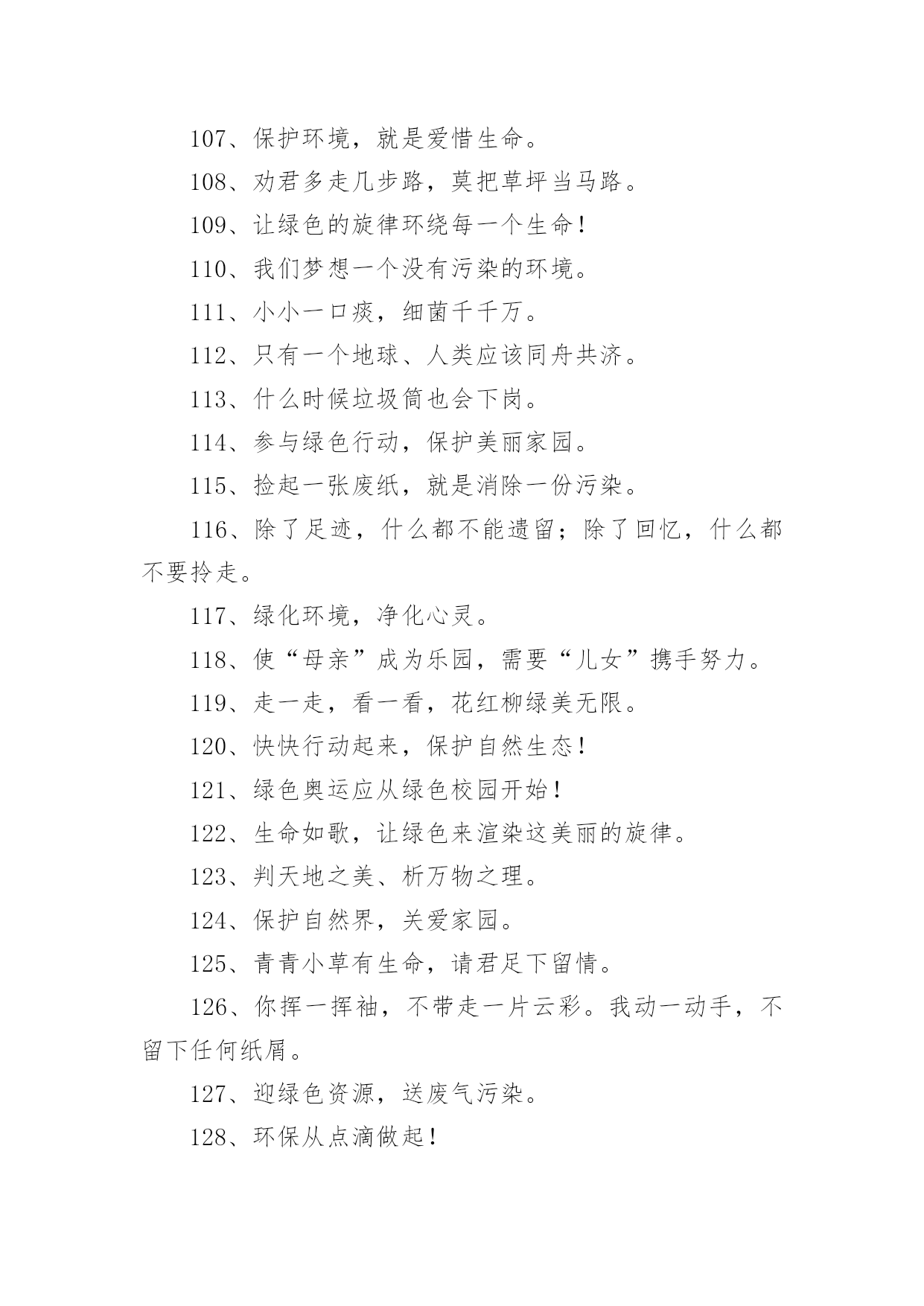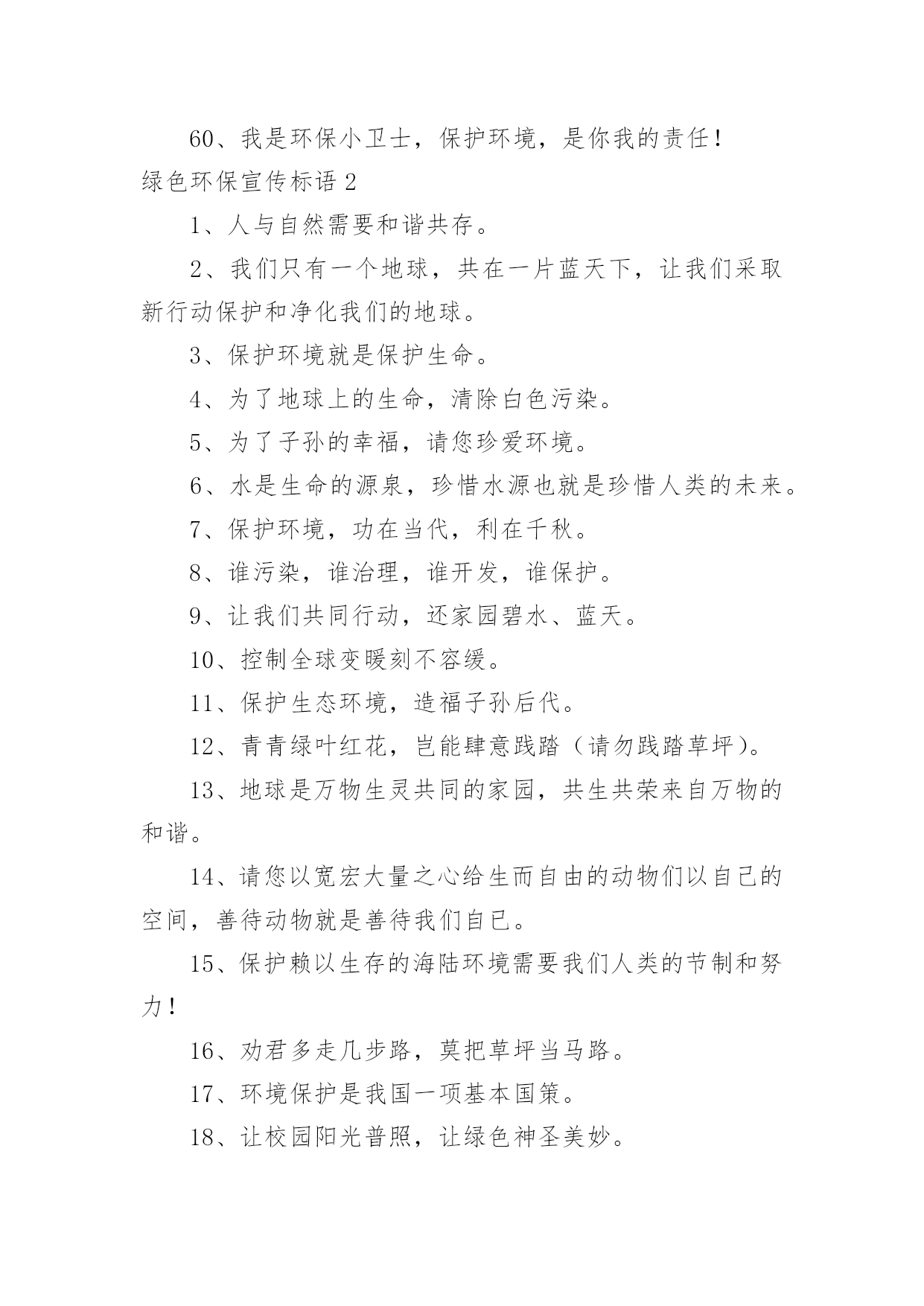 绿色环保宣传标语绿色环保宣传标语锦集[15篇]在学习、工作乃至生活中,大家或多或少都接触过一些经典的标语吧,标语是指文字简练、意义鲜明的宣传、鼓动口号。究竟什么样的标语才是好的标语呢?以下是小编帮大家整理的绿色环保宣传标语,仅供参考,大家一起来看看吧。绿色环保宣传标语11、我选择,我喜欢,我环保,我健康。2、动物:别再猎杀我们了,好吗?难道人类认为朋友太多了吗?3、绿色的祖国,绿色的家,绿色的环境人人夸。4、让优雅的环境与美好的心灵同在。5、美我校园重在每一举动。6、有限的资源,无限的循环7、爱护环境,造福人类。8、保护环境爱家园,健康生活每一天。9、合理利用资源保护生态平衡10、让我们伸出双手保护地球妈妈吧!11、学校是我家,美化靠大家。12、生命如此短暂,请不要将我伤害。13、今天节约一滴水,留给后人一滴血14、如果花儿是地球的笑容,我会栽满鲜艳的.花儿,15、绿色伴书香,你我共成长。16、绿色与生命时时相伴,环境与健康息息相关。17、绿色的校园,绿色的家,美丽的环境靠你我他。18、美化校园环境,就是美化我们的纯真心灵。19、美化校园环境,就是美化我们的生活。20、草儿绿,花儿香,环境优美人更欢!21、把蓝天留给你我,让绿水环绕人间。22、保护环境,少说多做。23、爱护环境就是爱情自己。24、珍爱生灵,节约资源,抵制污染,植树护绿25、栏杆拦人,人自拦心。26、同心描绿色,众手绘蓝天。27、地球是我家,环保靠大家。28、从小树立环保意识,做绿色人生使者。29、人类只有一个可生息的村庄——地球,保护环境是每个地球村民的责任30、小草多可爱,请你别伤害。31、让我们的身边充满绿色,让我们的心情飞扬!32、你爱绿化多一点,绿化爱你久一点!33、人人参与,共建绿色校园。34、环境保护,人人有责。35、为绿色捐款,让地球更纯净。36、拯救地球,一起动手37、爱护一草一木,建设美丽校园。38、提高环保意识,共建美好家园。39、环境卫生的洁净,有您的一份文明。40、善待地球就是善待自己。41、植树造林,我与小树一起成长。42、保护环境就是保护人类自己。43、爱花、爱草、爱树、爱校园。44、人类若不能与其他物种共存,便不能与这个星球共存45、自然在身边,保护在心中。46、百年校园,静净尽显。47、水是有限资源,点点滴滴都是情!48、营造绿色校园,争做环保使者。49、你我的家园,不是垃圾场!50、蓝天美丽因为有白云,大地锦绣因为有草木。51、草儿绿,花儿红,美丽校园靠大家。52、垃圾混置是垃圾,垃圾分类是资源53、绿化环境,净化心灵。54、你在我心中最美,请不要将我摧毁。55、要想小草好,请不要在小草上手舞足蹈。56、人人动手,擦亮世界每一处。57、绿色生活宣言环保教育游戏58、幸福就是天蓝、山青、水绿。59、哭泣的草原地球在哭泣60、我是环保小卫士,保护环境,是你我的责任!绿色环保宣传标语21、人与自然需要和谐共存。2、我们只有一个地球,共在一片蓝天下,让我们采取新行动保护和净化我们的地球。3、保护环境就是保护生命。4、为了地球上的生命,清除白色污染。5、为了子孙的幸福,请您珍爱环境。6、水是生命的源泉,珍惜水源也就是珍惜人类的未来。7、保护环境,功在当代,利在千秋。8、谁污染,谁治理,谁开发,谁保护。9、让我们共同行动,还家园碧水、蓝天。10、控制全球变暖刻不容缓。11、保护生态环境,造福子孙后代。12、青青绿叶红花,岂能肆意践踏(请勿践踏草坪)。13、地球是万物生灵共同的家园,共生共荣来自万物的和谐。14、请您以宽宏大量之心给生而自由的动物们以自己的空间,善待动物就是善待我们自已。15、保护赖以生存的海陆环境需要我们人类的节制和努力!16、劝君多走几步路,莫把草坪当马路。17、环境保护是我国一项基本国策。18、让校园阳光普照,让绿色神圣美妙。19、少一个脚印,多一个生命。20、同花儿一起开放,和小树一起成长。21、青山清我目,流水静我耳。22、保护生态,改善环境是一项长期而艰巨的任务。23、沙化、风尘、赤潮是环境对人类的惩罚。24、家园只有一个地球不能克隆。25、拯救地球,从生活中的细节做起。26、早一天保护环境,多一份生命保证。27、洁净的空气、幽雅的环境是我们共享的,每个人都应对环境保护尽一份义务。28、赏花爱花花更美,观景惜景景更幽。29、森林是地球的肺,我们要保护森林。30、同建绿色校园,共享鸟语花香。31、烟尘污染要减轻,集中供热是途径。32、鸟语花香,爱赏共享。33、改善环境,创建美好未来是我们共同的愿望。34、美好的环境来自我们每个人的珍惜和维护。35、让绿色看得见,让绿色听得见。36、保护自然平衡,拯救绿色环境。37、锁住黑龙保蓝天,治理污水护家园。38、发展经济不能以牺牲环境为代价。39、破坏环境就是自掘坟墓。4