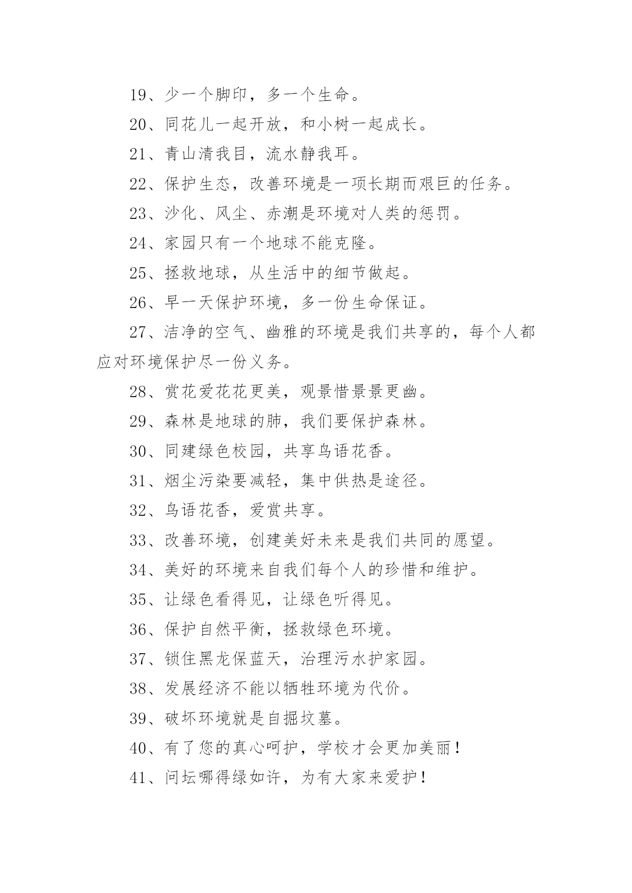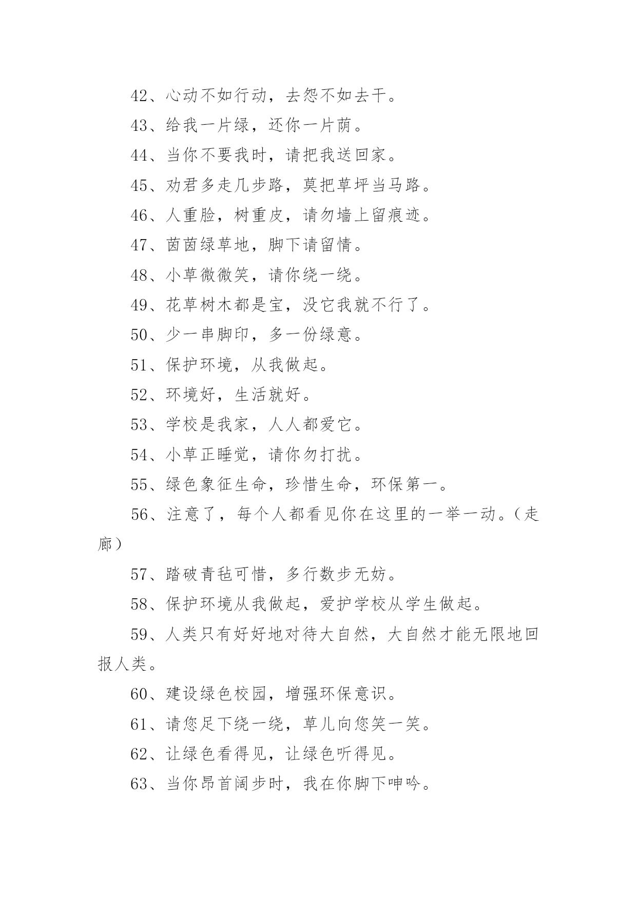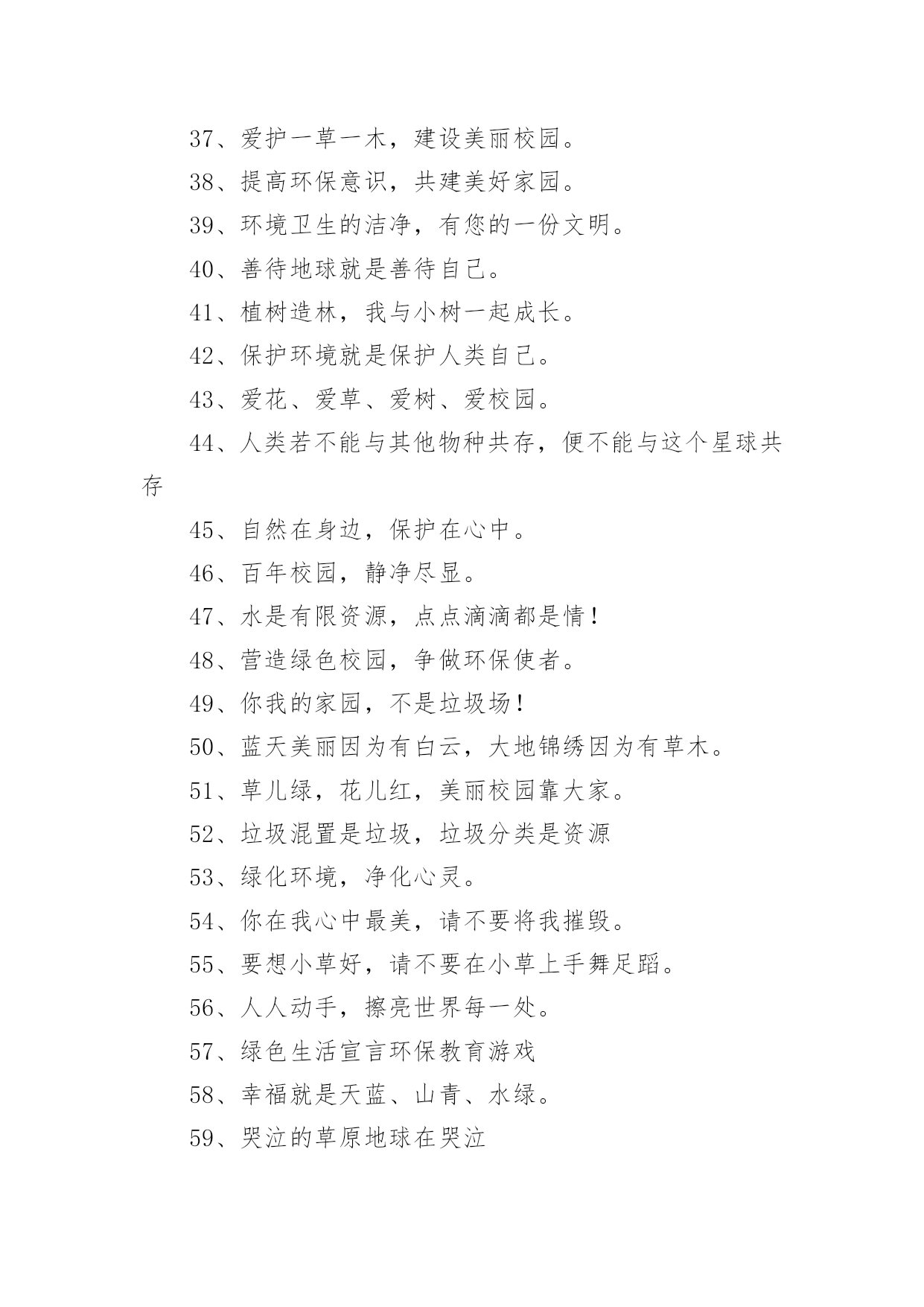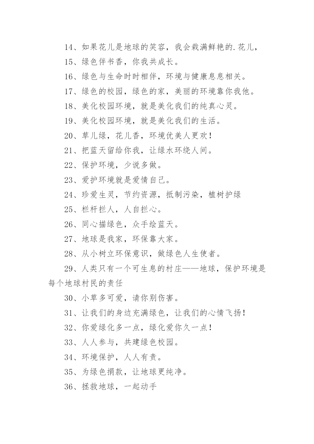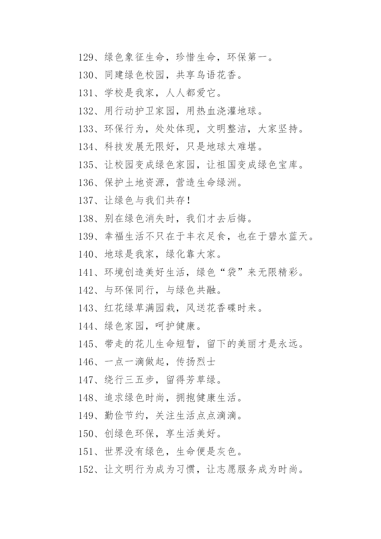 绿色环保宣传标语绿色环保宣传标语锦集[15篇]在学习、工作乃至生活中,大家或多或少都接触过一些经典的标语吧,标语是指文字简练、意义鲜明的宣传、鼓动口号。究竟什么样的标语才是好的标语呢?以下是小编帮大家整理的绿色环保宣传标语,仅供参考,大家一起来看看吧。绿色环保宣传标语11、我选择,我喜欢,我环保,我健康。2、动物:别再猎杀我们了,好吗?难道人类认为朋友太多了吗?3、绿色的祖国,绿色的家,绿色的环境人人夸。4、让优雅的环境与美好的心灵同在。5、美我校园重在每一举动。6、有限的资源,无限的循环7、爱护环境,造福人类。8、保护环境爱家园,健康生活每一天。9、合理利用资源保护生态平衡10、让我们伸出双手保护地球妈妈吧!11、学校是我家,美化靠大家。12、生命如此短暂,请不要将我伤害。13、今天节约一滴水,留给后人一滴血14、如果花儿是地球的笑容,我会栽满鲜艳的.花儿,15、绿色伴书香,你我共成长。16、绿色与生命时时相伴,环境与健康息息相关。17、绿色的校园,绿色的家,美丽的环境靠你我他。18、美化校园环境,就是美化我们的纯真心灵。19、美化校园环境,就是美化我们的生活。20、草儿绿,花儿香,环境优美人更欢!21、把蓝天留给你我,让绿水环绕人间。22、保护环境,少说多做。23、爱护环境就是爱情自己。24、珍爱生灵,节约资源,抵制污染,植树护绿25、栏杆拦人,人自拦心。26、同心描绿色,众手绘蓝天。27、地球是我家,环保靠大家。28、从小树立环保意识,做绿色人生使者。29、人类只有一个可生息的村庄——地球,保护环境是每个地球村民的责任30、小草多可爱,请你别伤害。31、让我们的身边充满绿色,让我们的心情飞扬!32、你爱绿化多一点,绿化爱你久一点!33、人人参与,共建绿色校园。34、环境保护,人人有责。35、为绿色捐款,让地球更纯净。36、拯救地球,一起动手37、爱护一草一木,建设美丽校园。38、提高环保意识,共建美好家园。39、环境卫生的洁净,有您的一份文明。40、善待地球就是善待自己。41、植树造林,我与小树一起成长。42、保护环境就是保护人类自己。43、爱花、爱草、爱树、爱校园。44、人类若不能与其他物种共存,便不能与这个星球共存45、自然在身边,保护在心中。46、百年校园,静净尽显。47、水是有限资源,点点滴滴都是情!48、营造绿色校园,争做环保使者。49、你我的家园,不是垃圾场!50、蓝天美丽因为有白云,大地锦绣因为有草木。51、草儿绿,花儿红,美丽校园靠大家。52、垃圾混置是垃圾,垃圾分类是资源53、绿化环境,净化心灵。54、你在我心中最美,请不要将我摧毁。55、要想小草好,请不要在小草上手舞足蹈。56、人人动手,擦亮世界每一处。57、绿色生活宣言环保教育游戏58、幸福就是天蓝、山青、水绿。59、哭泣的草原地球在哭泣60、我是环保小卫士,保护环境,是你我的责任!绿色环保宣传标语21、人与自然需要和谐共存。2、我们只有一个地球,共在一片蓝天下,让我们采取新行动保护和净化我们的地球。3、保护环境就是保护生命。4、为了地球上的生命,清除白色污染。5、为了子孙的幸福,请您珍爱环境。6、水是生命的源泉,珍惜水源也就是珍惜人类的未来。7、保护环境,功在当代,利在千秋。8、谁污染,谁治理,谁开发,谁保护。9、让我们共同行动,还家园碧水、蓝天。10、控制全球变暖刻不容缓。11、保护生态环境,造福子孙后代。12、青青绿叶红花,岂能肆意践踏(请勿践踏草坪)。13、地球是万物生灵共同的家园,共生共荣来自万物的和谐。14、请您以宽宏大量之心给生而自由的动物们以自己的空间,善待动物就是善待我们自已。15、保护赖以生存的海陆环境需要我们人类的节制和努力!16、劝君多走几步路,莫把草坪当马路。17、环境保护是我国一项基本国策。18、让校园阳光普照,让绿色神圣美妙。19、少一个脚印,多一个生命。20、同花儿一起开放,和小树一起成长。21、青山清我目,流水静我耳。22、保护生态,改善环境是一项长期而艰巨的任务。23、沙化、风尘、赤潮是环境对人类的惩罚。24、家园只有一个地球不能克隆。25、拯救地球,从生活中的细节做起。26、早一天保护环境,多一份生命保证。27、洁净的空气、幽雅的环境是我们共享的,每个人都应对环境保护尽一份义务。28、赏花爱花花更美,观景惜景景更幽。29、森林是地球的肺,我们要保护森林。30、同建绿色校园,共享鸟语花香。31、烟尘污染要减轻,集中供热是途径。32、鸟语花香,爱赏共享。33、改善环境,创建美好未来是我们共同的愿望。34、美好的环境来自我们每个人的珍惜和维护。35、让绿色看得见,让绿色听得见。36、保护自然平衡,拯救绿色环境。37、锁住黑龙保蓝天,治理污水护家园。38、发展经济不能以牺牲环境为代价。39、破坏环境就是自掘坟墓。4