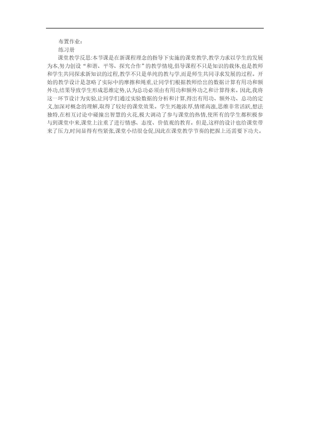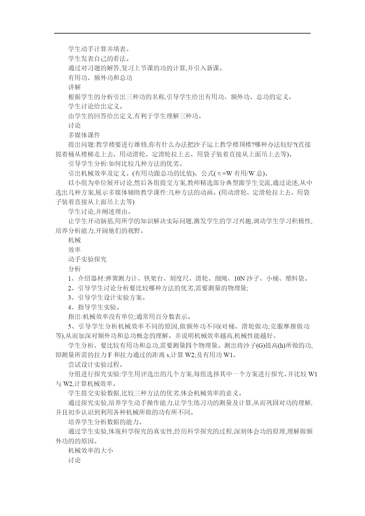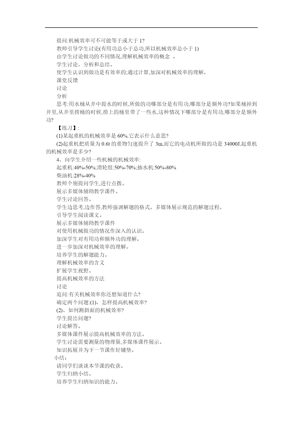 《机械效率》教学设计学习任务分析:《机械效率》选自义务教育课程标准实验教科书九年级《物理》第十四章,是初中物理力学部分的重要内容,同时又是九年级物理知识的重点。通过本节课的学习可以加深对功的原理的理解,是物理知识与生活实际联系的范例,是一节集物理现象、物理概念、物理规律于一体的、充分为学生提供实践空间和方法的课,其中有用功、额外功、总功是本节课的难点,机械效率是本节课的重点。学习者分析:通过上一节《功》的学习,学生已经知道了功的原理:使用任何机械都不省功,但是并不能深刻理解这句话,本节课就是要进一步的加深对功的原理的理解,理解不省功的原因,通过学习能识别在使用机械时的有用功、额外功、总功。由于有用功、额外功和总功较抽象,学生不易理解,是本节课的难点,通过实验由同学们自己体验使用机械和不用机械所做的功,加深对功的原理的理解,同时也使有用功、总功、额外功的概念由抽象变得具体,有利于难点的突破,使机械效率的教学变得水到渠成。教学目标:知识与技能:1、知道有用功、额外功和总功;2、理解机械效率;过程与方法:1、通过实验,体验了使用机械做功的过程,加深对有用功、额外功、总功的理解,学会分析问题,解决问题地能力。3.学习根据实验数据分析、归纳简单的科学规律情感、态度与价值观:1、在学习过程中培养发现问题、提出问题、解决问题的能力。2、培养探索自然现象和日常生活中的物理知识的兴趣。3、密切联系实际,提高科学技术应用于日常生活的科学态度。重点:理解机械效率难点:认识有用功、额外功、总功及计算。教学方法:讨论,实验探究教学资源:学生用实验器材:小桶、沙(10N)、滑轮、细绳、弹簧测力计、铁架台、刻度尺、塑料袋。教师用实验器材:小桶、沙(10N)、滑轮、细绳、弹簧测力计、铁架台、刻度尺、塑料袋。多媒体动画课件。教学设计:教学内容教学手段方法教师活动学生活动设计说明引入新课:多媒体图片提问:通过一动滑轮用60牛的拉力提起重为100牛的重物,使重物提高2米。请填写下表:提问:对比表中数据,你有何发现?由学生的回答引入新课。板书课题:机械效率学生动手计算并填表。学生发表自己的看法。通过对习题的解答,复习上节课的功的计算,并引入新课。有用功、额外功和总功讲解根据学生的分析引出三种功的名称,引导学生给出有用功、额外功、总功的定义。学生讨论给出定义。由学生的回答给出定义,有利于学生理解三种功。讨论多媒体课件提出问题:教学楼要进行维修,你有什么办法把沙子运上教学楼顶楼?哪种办法较好?(直接提着桶从楼梯走上去、用动滑轮、定滑轮拉上去、用袋子装着直接从上面吊上去等)。引导学生分析:如何比较几种方法的优劣。引出机械效率及定义。(有用功跟总功的比值)、公式(η=W有用/W总)。以小组为单位展开讨论,然后各组提交方案,教师精选部分典型跟学生交流,通过论述,从中选出几种方案,展示多媒体辅助教学课件:几种方法的动画。(用动滑轮、定滑轮拉上去、用袋子装着直接从上面吊上去等)学生讨论,并阐述理由。让学生开动脑筋,用所学的知识解决实际问题,激发学生的学习兴趣,调动学生学习积极性,培养分析能力,开阔他们的视野。机械效率动手实验探究分析1、介绍器材:弹簧测力计、铁架台、刻度尺、滑轮、细绳、10N沙子、小桶、塑料袋。2、引导学生讨论分析要比较哪种方法的优劣,需要测量的物理量;3、引导学生设计实验方案。4、指导学生实验。指出:机械效率没有单位;通常用百分数表示。5、引导学生分析机械效率不同的原因,做额外功不同(对桶、滑轮做功;克服摩擦做功等),从而加深对额外功和总功概念的理解。并说明机械效率越高,机械性能越好。学生分析、要比较有用功和总功,需要测量四个物理量。测出将沙子(G)提高(h)所做的功,即测量所需的拉力F和拉力通过的距离s,计算W2;及有用功W1。尝试设计实验过程。分组进行探究实验:学生用评选出的几个方案,每组选择其中一个方案进行探究。并比较W1与W2,计算机械效率。学生提交实验数据,比较三种方法的优劣,体会机械效率的意义。通过探究实验,培养学生动手操作能力,让学生练习功的测量及计算,从而巩固对功的理解,并且初步认识到利用各种机械所做的功有所不同。培养学生分析数据的能力。通过学生实验,体现科学探究的真实性,经历科学探究的过程,深刻体会功的原理,理解做额外功的的原因。机械效率的大小讨论提问:机械效率可不可能等于或大于1?教师引导学生讨论(有用功总小于总功,所以机械效率总小于1)由学生讨论做功的不同情况,理解机械效率的概念。学生讨论、分析和总结。使学生认识到做功是有效率的;通过计算,加深对机械效率的理解。课堂反馈讨论分析