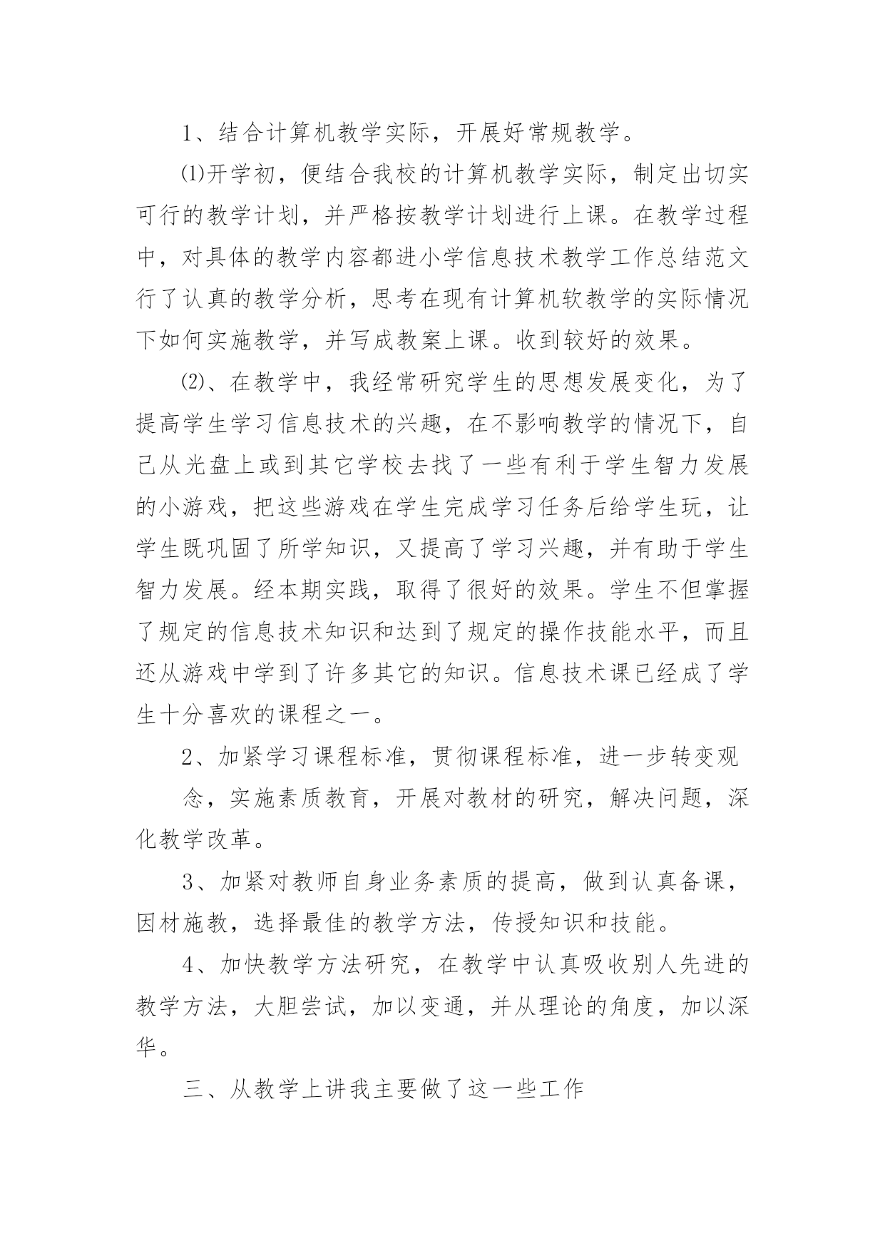 五年级信息技术教学工作总结五年级信息技术教学工作总结(实用)总结就是对一个时期的学习、工作或其完成情况进行一次全面系统的回顾和分析的书面材料,它是增长才干的一种好办法,我想我们需要写一份总结了吧。那么你真的懂得怎么写总结吗?以下是小编帮大家整理的五年级信息技术教学工作总结,希望能够帮助到大家。五年级信息技术教学工作总结1一学期即将结束,回顾这一学期,本人能够努力工作,认真学习,从多方面进行计算机教学和管理工作。有辛勤的耕耘,有收获的喜悦。我所享有的收获我会用于下个学期的工作中,我所碰到的问题我要认真思考想办法解决。一、教学方面1、备课开学初,根据学校要求,认真写好教学计划,提前备好课,写好教案。平时做到周前备课。备课时认真钻研教材,学习好《小学信息技术课程指导纲要》。力求吃透教材,找准重点、难点。为了上好每一节课,我上网查资料,集中别人的优点确定自己的教学思路。为了学生能更直观地感受所学的知识内容,我积极制作课件,准备各种直观教学软件,搜集制作各知识点优秀案例展示给学生。2、上课上好课的前提是做好课前准备,不打无准备之仗,尤其本学科主要课程都要上机完成,每节都要认真做好上机备课,检查机器状态,有无“不可用机器”。本学期五年级的主要学习任务是使学生通过本期信息技术课的学习,学会使用PowerPoint软件进行简单动画设计;激发学生对信息技术的学习兴趣,将信息技术广泛用于学习生活中,培养学生对科学的探索精神。上课时要求学生认真讲课,力求抓住重点,突破难点,精讲精练。运用多种教学方法,从学生的实际出发,注意调动学生学习的积极性和创造性思维,使学生有举一反三的能力。在学生完成上机任务时,在各台计算机前巡视,注意对学困生进行手把手的辅导,课后及时做课后记,找出不足。二、努力方向:1、加强自身基本功的训练,课堂上做到精讲精练,注重对学生能力的培养,知识上做到课课清、段段清。2、对差生多些关心,多点爱心,再多一些耐心,使他们在对计算机的认识上有更大进步。3、加强机房纪律和机器使用道德方面的教育,使学生不仅在班级集中注意力学习,在机房上机时也要按规定严格约束自己。4、利用各种方法,训练学生提高、集中注意力。5、在设计和多媒体课件制作上下功夫,努力使学校的和学校的多媒体课件的水平在原有的基础上有更大的进步。一份春华,一份秋实,在教书育人的道路上我付出的是汗水和泪水,然而我收获的却是那一份份充实,那沉甸甸的情感。我用我的心去教诲我的学生,我用我的情去培育我的学生,我无愧于我心,我无悔于我的事业。让我把一生矢志教育的心愿化为热爱学生的一团火,将自己最珍贵的爱奉献给孩子们,相信今日含苞欲放的花蕾,明日一定能盛开绚丽的花朵。五年级信息技术教学工作总结篇眨眼间一个学期即将结束,回顾这个学期所从事的信息技术教学工作,基本上是比较顺利地完成任务。由于我不是专业的计算机老师,肯定在教学上会遇到很多问题,但这样也促使我更加认识计算机的技术,使我享受到收获喜悦。我所享有的收获将会用于教学当中;所碰到的问题我要认真思考想办法解决。一、思想方面本人能热爱教育事业,热爱本职工作,加强自我修养,做到学高为师,身正为范,热爱学生,真诚对待学生,受到学生的好评。特别是在此期间,我努力地学习计算机有关教学知识,教学学生的同时增长自己对计算机的认识,将学到的知识切实运用到工作实践中。二、信息技术教学工作方面1、备课开学初,根据学校要求,认真写好教学计划,提前备好课,写好教案,平时做到周前备课。备课时认真钻研教材教法,由于我对LOGO的教学不是很认识,故在备课的时候不能做到吃透教材,找准重点、难点,但还可以克服教学中的随意性。在备课时尽量做到:①备教材:钻研教材、搜集有关资料及新科技等前沿信息,对教材系统、重点和难点内容,做到心中有数。②备学生:经常了解学生的`态度,知识基础,学习方法,增强教学的针对性。③备教法:选择适当的教学方法、手段和现代教学媒体,提倡使用现代教学手段。2、上课按照学校工作管理规定,认真备好课,写好教案,努力上好每一节课。信息技术学校安排的课时比较少(一周每班两节)这对于学生来讲的很重要的两节课;对老师来讲是比较难上的两节课。所以怎样才能上好每节课对老师对学生都是很关键的。除了备好课、写好教案外,我还要查阅各种资料,能上因特网时还上网寻找好的教学材料,教学课件,把它们和我所从事的工作结合起来,为我所用。每节课都要认真做好上机准备,检查机器状态,有无“不可用机器”,由于学校的计算机不够(有些坏掉),上机只能两个学生一起操作。在上课时,我能认真讲课,教学目的明确,符合学生实际,体现教材的科学性和思想性,努力做到信息知识、信息能力、信息情意三者统一。有时候运用多种教学方法,注重讲思路、讲规律、讲方法、学法,力求生动活泼,充分调动学生学习兴趣。正确引导学生看待和使