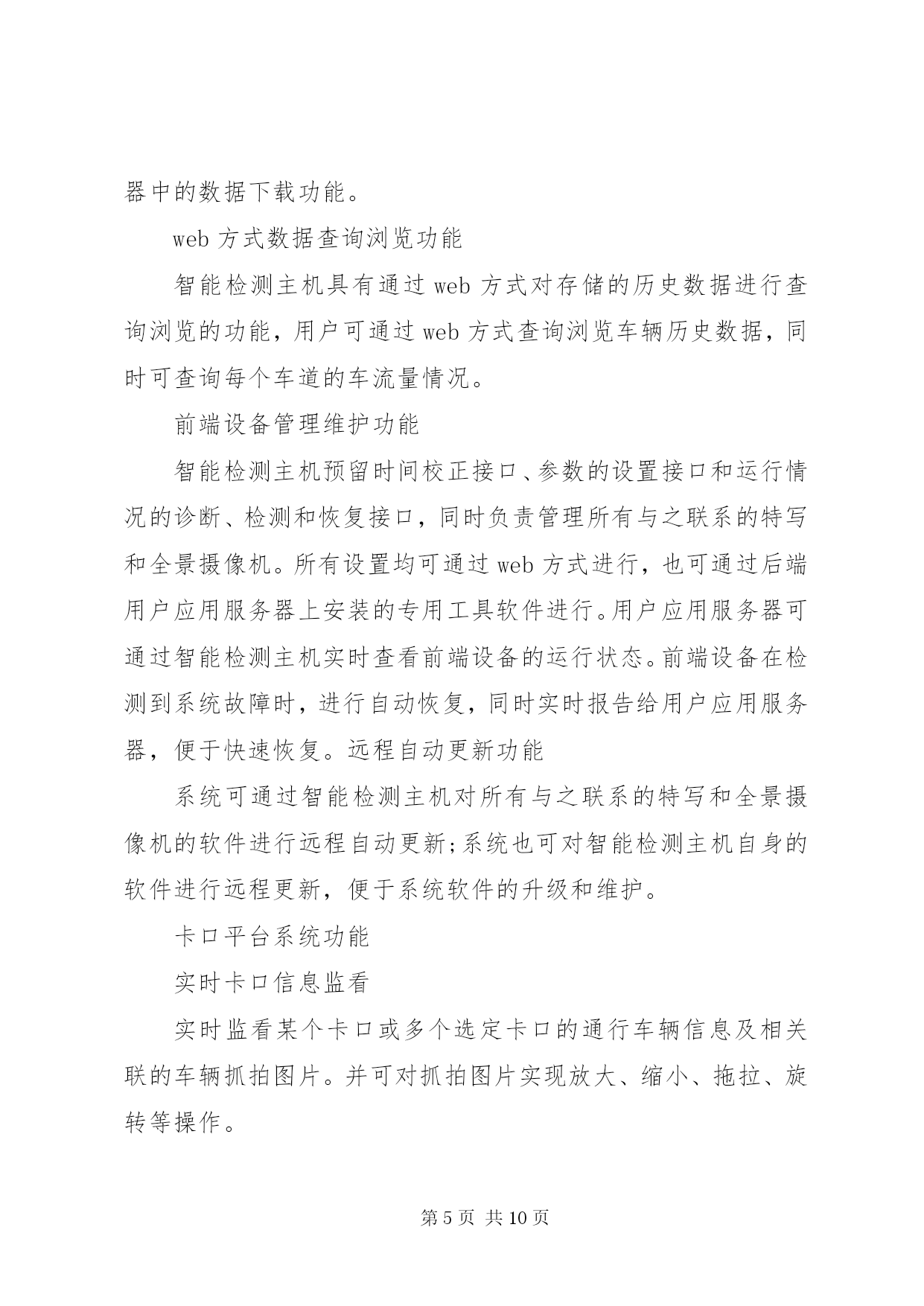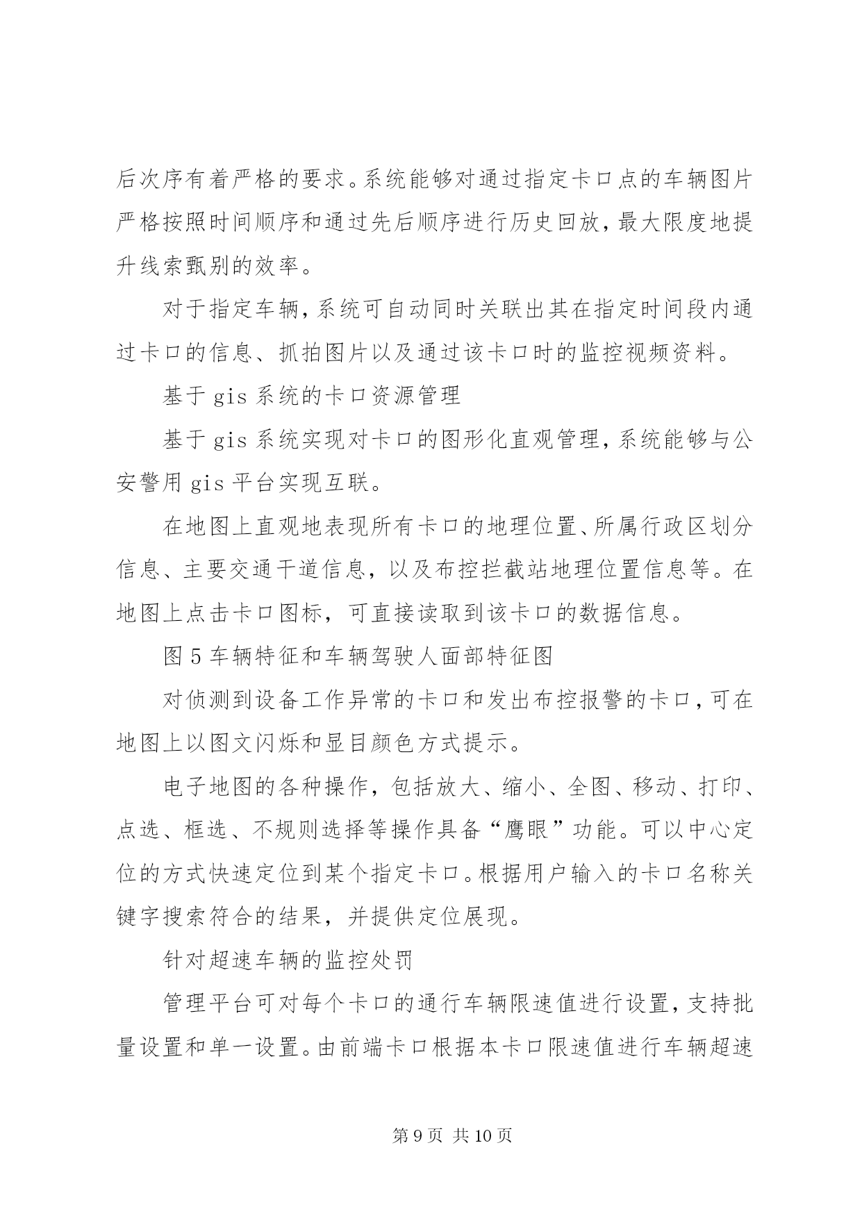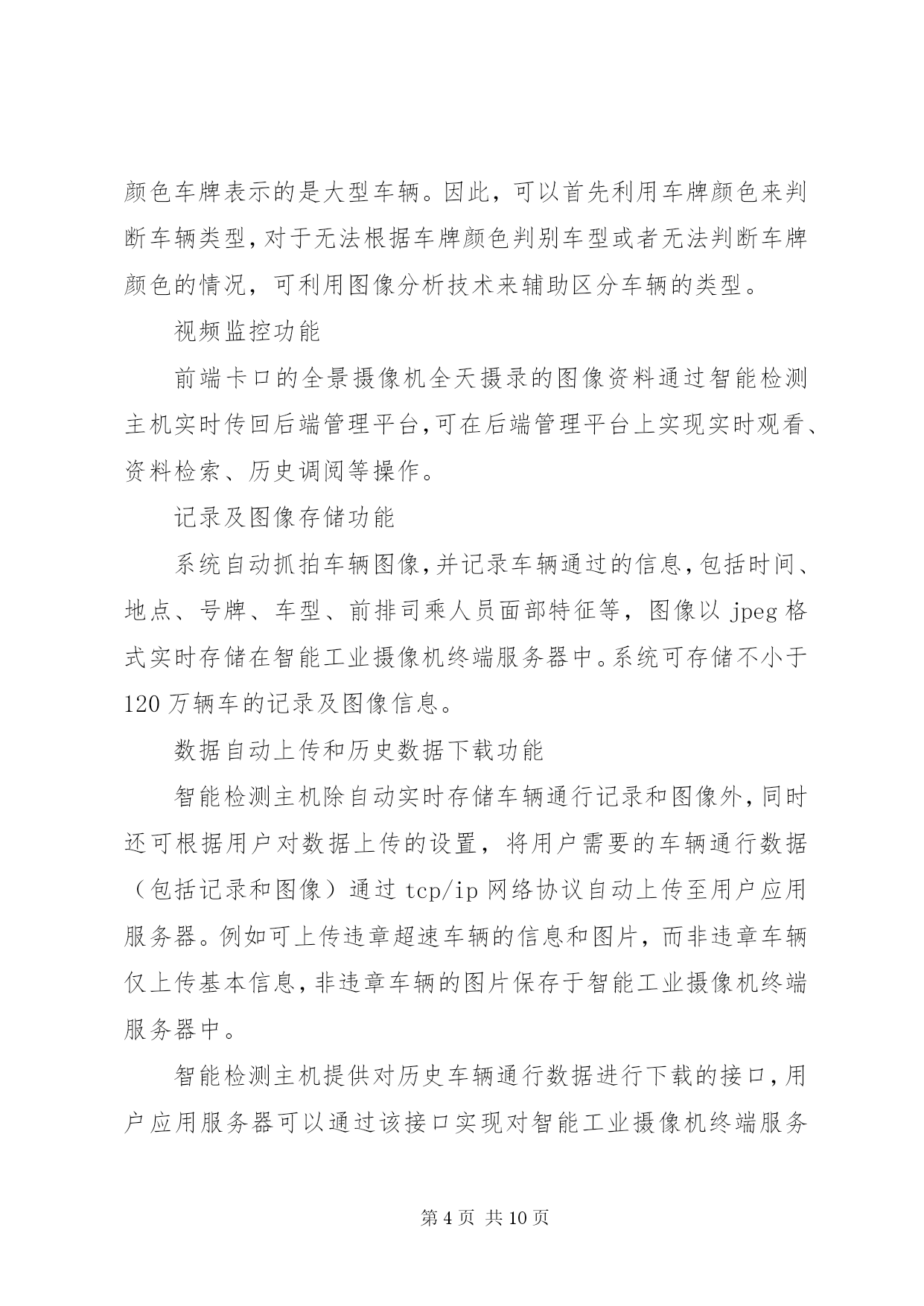 第PAGE\*Arabic\*MERGEFORMAT10页共NUMPAGES\*MERGEFORMAT10页交通道路卡口方案系统设计随着网络化、高清化、智能化发展的逐渐成熟,智能卡口监控系统也开始呈现出明显的网络化、高清化、智能化这些特征。一套典型的智能卡口监控系统主要由前端智能检测系统、存储系统及中心管理系统等部分组成,如图1所示。图1智能卡口监控系统结构图前端系统主要由高清摄像机、地线感应器、智能检测主机等组成。高清摄像机主要负责全景的拍摄进行实时监控;地线感应器将通过车辆所产生的数据精确地传送到智能检测主机,并触发高清摄像头的抓拍动作,对感应区域的车辆甚至人脸进行抓拍,所有数据都传送到智能检测主机进行整理、筛选、处理,最后所有的信息进行本地的存储,并将一些交通道路的实时信息传送到中心平台,包括具体车辆的号牌、型号、是否超速/超载等,供客户端实时的浏览或回放,抓住每一个重要的瞬间。中心管理系统主要由应用服务器、web服务器、数据服务器及磁盘阵列所组成。应用服务器主要负责对采集的数据进行处理,并将信息保存到数据服务器;web服务器主要是响应远程客户的请求,提供数据查询、统计及远程管理维护等功能;数据服务器主要是提供数据库管理软件的安装平台,并对数据库的访问权限等进行设置和控制。存储系统主要包括本地存储和平台存储。目前主要采用磁盘阵列的方式,能够对数据进行海量存储,并对海量数据实现优化管理,达到数据扩容的功能和提供最优的数据服务性能。前端系统功能图2卡口前端系统现场模拟图车辆捕获功能系统能对所有经过车辆进行捕获,除了能够捕获在车道上正常行驶的车辆外,还具备捕获跨线行驶车辆的功能,并且具有自动选择有效图片(有汽车牌照)、删除垃圾图片等功能(如图3所示)。图3系统捕获的有效车辆图片车辆测速功能系统在进行抓拍的同时,通过地感测定车辆的行驶速度,并且具备分车型分别设置标志限速和执法限速值的功能辆特征和车辆驾驶人面部特征高清晰拍照功能在车辆通过时,智能工业摄像机能准确拍摄到包含车辆牌照和车辆全貌、驾驶室内司乘人员面部特征的图像,图像能分辨车辆类型、车身颜色和所载货物,然后将图像和车辆通行信息传输给智能服务器,并可选择在图像中叠加车辆通行信息(如时间、地点、车速、方向等)。图4车辆测速显示每辆车生成一张图片,系统可实时将数据上传至用户应用服务器,按每部车辆至少存贮特征图像和全景图像各一张计算,其磁盘应具备不少于120万辆车的图像存贮能力。当超出该车辆数时,自动对最前面的数据依次进行循环覆盖,图像格式为1600×1200像素的jpeg/24bit格式,可根据业主要求对存储空间进行设置,能达到图片的存储周期为一年,视频图像存储周期为3个月。车辆牌照自动识别功能系统可自动对车辆牌照进行识别,包括车牌号码、车牌颜色的识别。在实时记录通行车辆图像的同时,还具备对民用车牌、警用车牌、军用车牌、武警车牌的车牌计算机自动识别能力,包括2002式号牌。车牌颜色分为黑、白、蓝、黄四种车牌颜色。车身颜色自动识别功能系统可自动对车身深浅和颜色进行识别,可供用户根据车身颜色来查询通行车辆,为公安稽查和刑侦案件的侦破提供了科技新手段。车辆型号判别功能系统采用车牌颜色和视频检测技术相结合的方法对车辆进行分型。对于民用车来说,蓝颜色车牌表示的是小型车辆,而黄颜色车牌表示的是大型车辆。因此,可以首先利用车牌颜色来判断车辆类型,对于无法根据车牌颜色判别车型或者无法判断车牌颜色的情况,可利用图像分析技术来辅助区分车辆的类型。视频监控功能前端卡口的全景摄像机全天摄录的图像资料通过智能检测主机实时传回后端管理平台,可在后端管理平台上实现实时观看、资料检索、历史调阅等操作。记录及图像存储功能系统自动抓拍车辆图像,并记录车辆通过的信息,包括时间、地点、号牌、车型、前排司乘人员面部特征等,图像以jpeg格式实时存储在智能工业摄像机终端服务器中。系统可存储不小于120万辆车的记录及图像信息。数据自动上传和历史数据下载功能智能检测主机除自动实时存储车辆通行记录和图像外,同时还可根据用户对数据上传的设置,将用户需要的车辆通行数据(包括记录和图像)通过tcp/ip网络协议自动上传至用户应用服务器。例如可上传违章超速车辆的信息和图片,而非违章车辆仅上传基本信息,非违章车辆的图片保存于智能工业摄像机终端服务器中。智能检测主机提供对历史车辆通行数据进行下载的接口,用户应用服务器可以通过该接口实现对智能工业摄像机终端服务器中的数据下载功能。web方式数据查询浏览功能智能检测主机具有通过web方式对存储的历史数据进行查询浏览的功能,用户可通过web方式查询浏览车辆历史数据,同时可查询每个车道的车流量情况。前端设备管理维护功能智能检测主机预留时间校正接口、参数的设置接口和运行情况