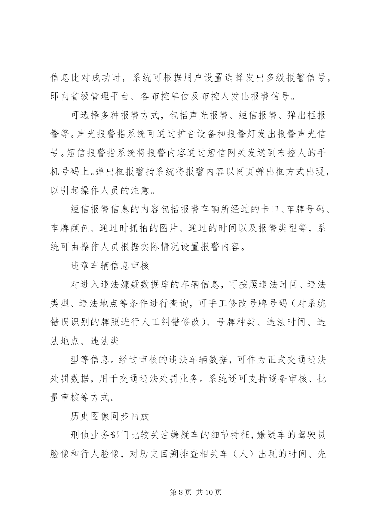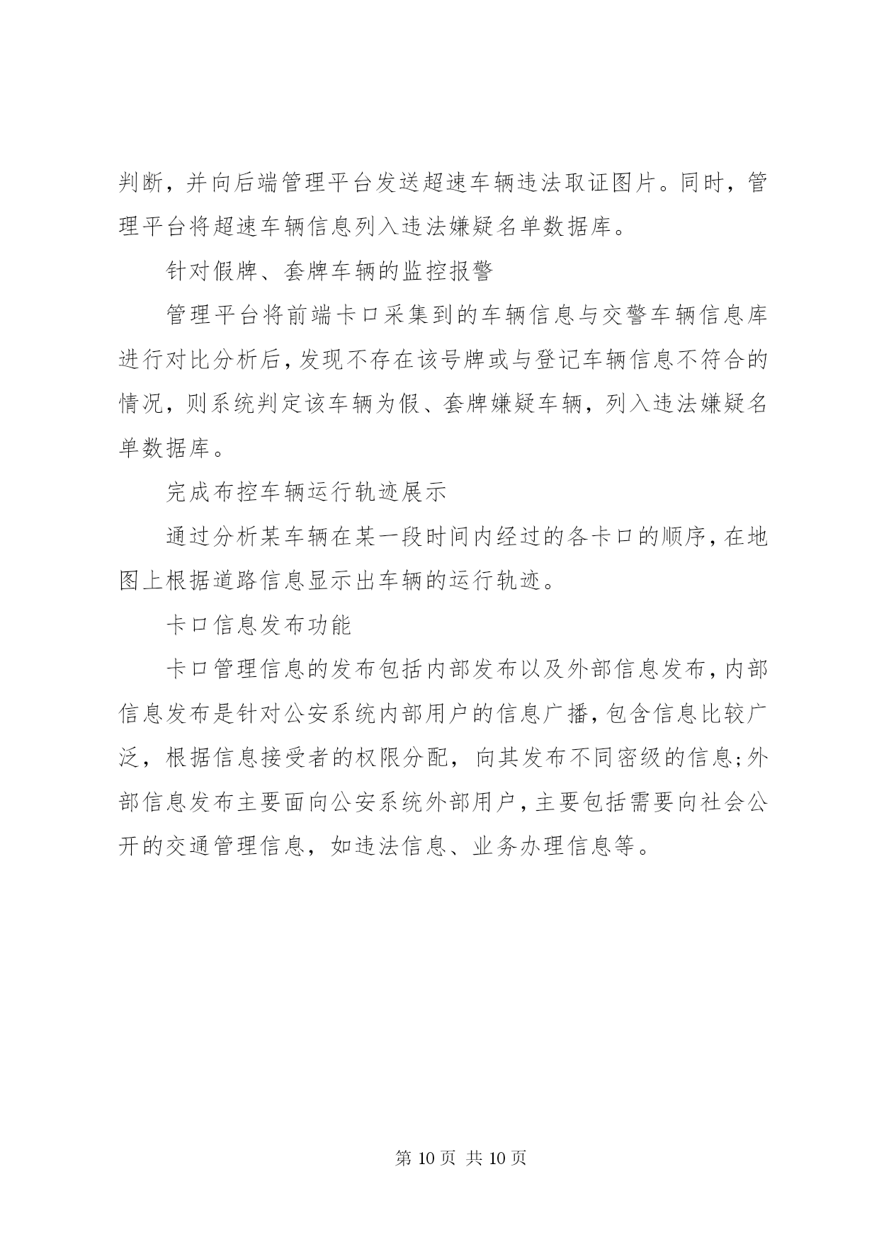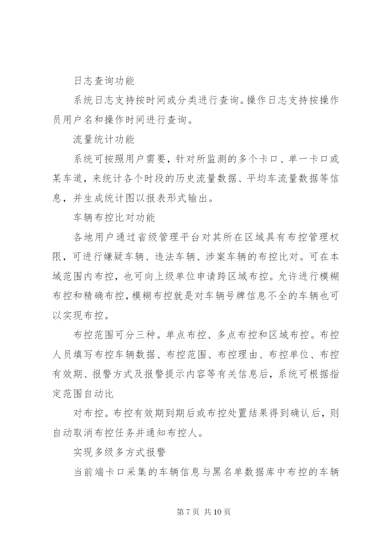 第PAGE\*Arabic\*MERGEFORMAT10页共NUMPAGES\*MERGEFORMAT10页交通道路卡口方案系统设计随着网络化、高清化、智能化发展的逐渐成熟,智能卡口监控系统也开始呈现出明显的网络化、高清化、智能化这些特征。一套典型的智能卡口监控系统主要由前端智能检测系统、存储系统及中心管理系统等部分组成,如图1所示。图1智能卡口监控系统结构图前端系统主要由高清摄像机、地线感应器、智能检测主机等组成。高清摄像机主要负责全景的拍摄进行实时监控;地线感应器将通过车辆所产生的数据精确地传送到智能检测主机,并触发高清摄像头的抓拍动作,对感应区域的车辆甚至人脸进行抓拍,所有数据都传送到智能检测主机进行整理、筛选、处理,最后所有的信息进行本地的存储,并将一些交通道路的实时信息传送到中心平台,包括具体车辆的号牌、型号、是否超速/超载等,供客户端实时的浏览或回放,抓住每一个重要的瞬间。中心管理系统主要由应用服务器、web服务器、数据服务器及磁盘阵列所组成。应用服务器主要负责对采集的数据进行处理,并将信息保存到数据服务器;web服务器主要是响应远程客户的请求,提供数据查询、统计及远程管理维护等功能;数据服务器主要是提供数据库管理软件的安装平台,并对数据库的访问权限等进行设置和控制。存储系统主要包括本地存储和平台存储。目前主要采用磁盘阵列的方式,能够对数据进行海量存储,并对海量数据实现优化管理,达到数据扩容的功能和提供最优的数据服务性能。前端系统功能图2卡口前端系统现场模拟图车辆捕获功能系统能对所有经过车辆进行捕获,除了能够捕获在车道上正常行驶的车辆外,还具备捕获跨线行驶车辆的功能,并且具有自动选择有效图片(有汽车牌照)、删除垃圾图片等功能(如图3所示)。图3系统捕获的有效车辆图片车辆测速功能系统在进行抓拍的同时,通过地感测定车辆的行驶速度,并且具备分车型分别设置标志限速和执法限速值的功能辆特征和车辆驾驶人面部特征高清晰拍照功能在车辆通过时,智能工业摄像机能准确拍摄到包含车辆牌照和车辆全貌、驾驶室内司乘人员面部特征的图像,图像能分辨车辆类型、车身颜色和所载货物,然后将图像和车辆通行信息传输给智能服务器,并可选择在图像中叠加车辆通行信息(如时间、地点、车速、方向等)。图4车辆测速显示每辆车生成一张图片,系统可实时将数据上传至用户应用服务器,按每部车辆至少存贮特征图像和全景图像各一张计算,其磁盘应具备不少于120万辆车的图像存贮能力。当超出该车辆数时,自动对最前面的数据依次进行循环覆盖,图像格式为1600×1200像素的jpeg/24bit格式,可根据业主要求对存储空间进行设置,能达到图片的存储周期为一年,视频图像存储周期为3个月。车辆牌照自动识别功能系统可自动对车辆牌照进行识别,包括车牌号码、车牌颜色的识别。在实时记录通行车辆图像的同时,还具备对民用车牌、警用车牌、军用车牌、武警车牌的车牌计算机自动识别能力,包括2002式号牌。车牌颜色分为黑、白、蓝、黄四种车牌颜色。车身颜色自动识别功能系统可自动对车身深浅和颜色进行识别,可供用户根据车身颜色来查询通行车辆,为公安稽查和刑侦案件的侦破提供了科技新手段。车辆型号判别功能系统采用车牌颜色和视频检测技术相结合的方法对车辆进行分型。对于民用车来说,蓝颜色车牌表示的是小型车辆,而黄颜色车牌表示的是大型车辆。因此,可以首先利用车牌颜色来判断车辆类型,对于无法根据车牌颜色判别车型或者无法判断车牌颜色的情况,可利用图像分析技术来辅助区分车辆的类型。视频监控功能前端卡口的全景摄像机全天摄录的图像资料通过智能检测主机实时传回后端管理平台,可在后端管理平台上实现实时观看、资料检索、历史调阅等操作。记录及图像存储功能系统自动抓拍车辆图像,并记录车辆通过的信息,包括时间、地点、号牌、车型、前排司乘人员面部特征等,图像以jpeg格式实时存储在智能工业摄像机终端服务器中。系统可存储不小于120万辆车的记录及图像信息。数据自动上传和历史数据下载功能智能检测主机除自动实时存储车辆通行记录和图像外,同时还可根据用户对数据上传的设置,将用户需要的车辆通行数据(包括记录和图像)通过tcp/ip网络协议自动上传至用户应用服务器。例如可上传违章超速车辆的信息和图片,而非违章车辆仅上传基本信息,非违章车辆的图片保存于智能工业摄像机终端服务器中。智能检测主机提供对历史车辆通行数据进行下载的接口,用户应用服务器可以通过该接口实现对智能工业摄像机终端服务器中的数据下载功能。web方式数据查询浏览功能智能检测主机具有通过web方式对存储的历史数据进行查询浏览的功能,用户可通过web方式查询浏览车辆历史数据,同时可查询每个车道的车流量情况。前端设备管理维护功能智能检测主机预留时间校正接口、参数的设置接口和运行情况