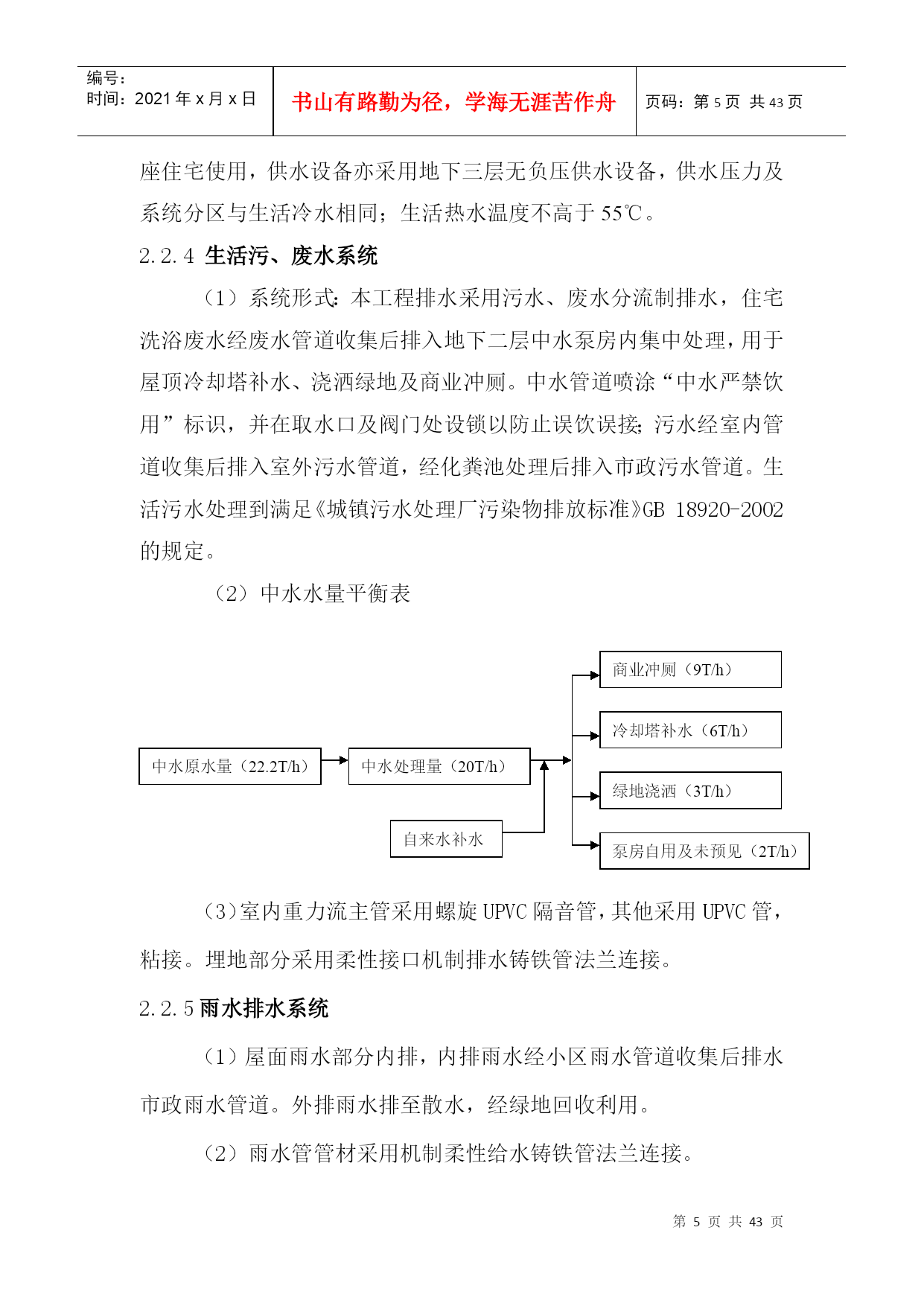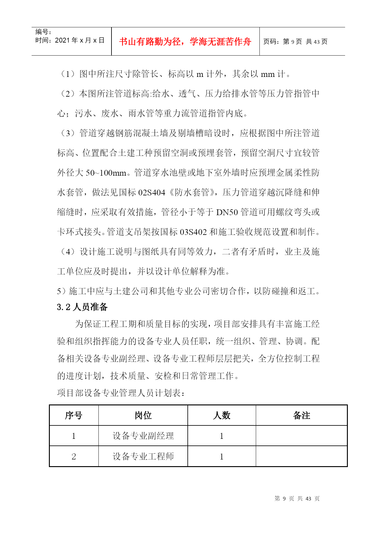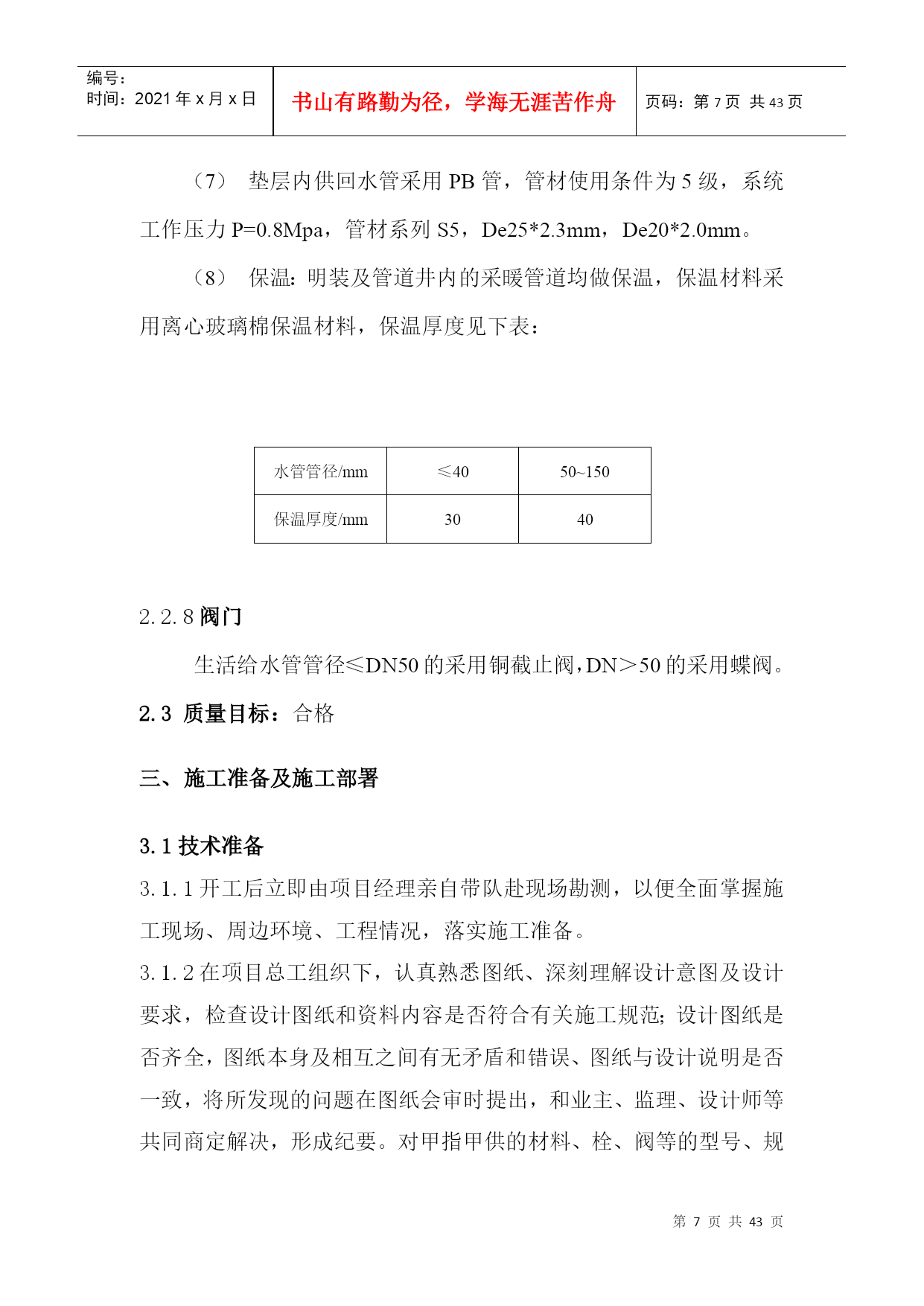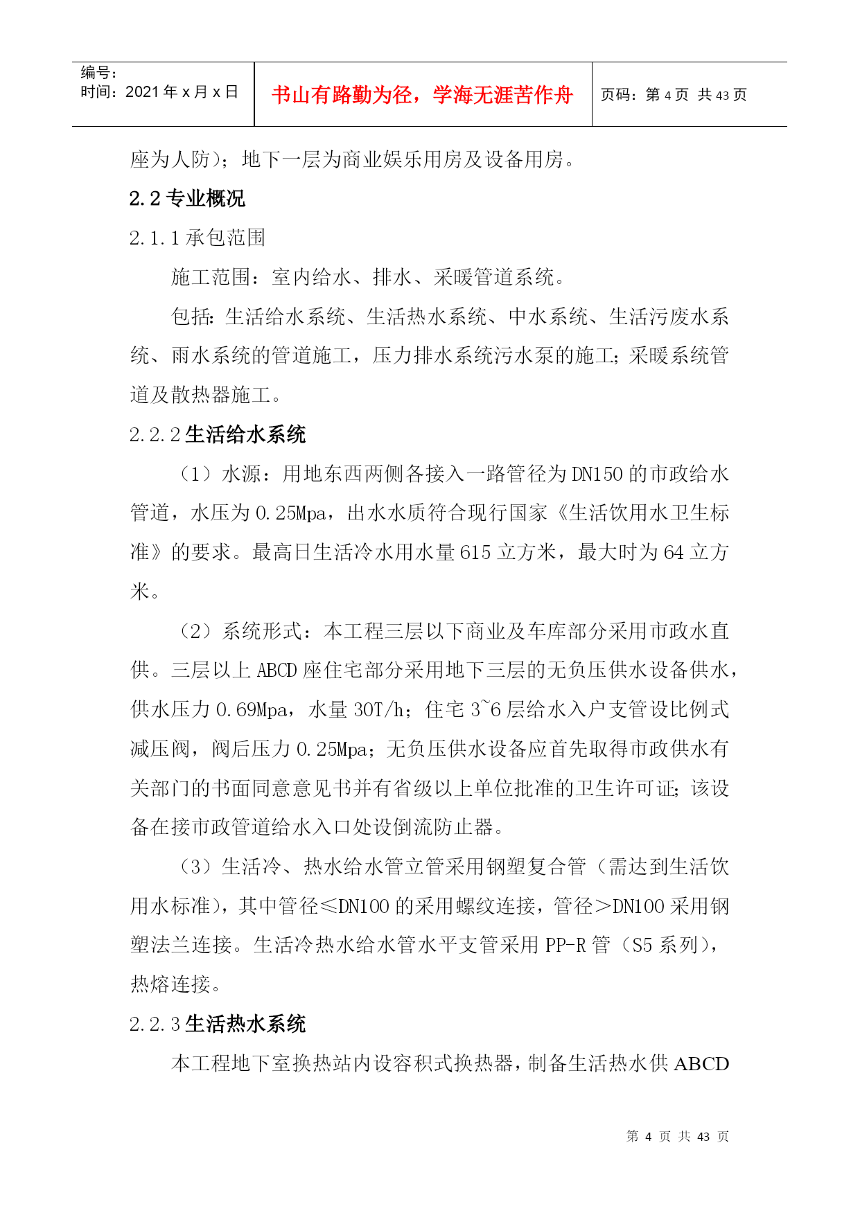 编号:时间:2021年x月x日书山有路勤为径,学海无涯苦作舟页码:第PAGE42页共NUMPAGES43页第PAGE\*MERGEFORMAT42页共NUMPAGES\*MERGEFORMAT43页给排水及采暖专业施工方案2010年1月20日目录TOC\o"1-3"\h\z\uHYPERLINK\l"_Toc255892350"一、编制依据PAGEREF_Toc255892350\h2HYPERLINK\l"_Toc255892351"二、工程概况PAGEREF_Toc255892351\h3HYPERLINK\l"_Toc255892352"三、施工准备及施工部署PAGEREF_Toc255892352\h7HYPERLINK\l"_Toc255892353"四、主要施工方法及施工工艺PAGEREF_Toc255892353\h17HYPERLINK\l"_Toc255892354"五、技术安全与管理措施PAGEREF_Toc255892354\h31HYPERLINK\l"_Toc255892355"六、给排水及采暖工程技术资料工程档案PAGEREF_Toc255892355\h39编制依据1.1主要规程、规范类别名称编号国家《建筑工程施工质量验收统一标准》GB50300-2001国家《建筑给水排水及采暖工程施工质量验收规范》GB50242-2002国家《建筑给水排水设计规范》GB50015-2003国家《采暖通风与空气调节设计规范》GB50019-2003国家《公共建筑节能设计规范》DBJ01-621-2005国家《建筑设计防火规范》GBJ16-87(2001版)国家《机械设备安装工程施工及验收通用规范》GB50231-98行业《建筑给水钢塑复合管管道工程技术规程》CECS125:2001行业《建筑排水柔性接口铸铁管管道技术规程》CECS168:2004行业《建筑排水用硬聚氯乙烯内螺旋管管道技术规程》CECS94:2002行业《建筑机械使用安全技术规程》JGJ33-2001行业《施工现场临时用电安全技术规程》JGJ46-88行业《建筑施工安全检查标准》JGJ59-99地方《建筑安装分项工程施工工艺规程》(第六分册)DBJ/T-26-2003地方《建筑工程资料管理规程》DBJ01-51-20031.2主要图集类别名称编号国家华北地区建筑设备施工安装通用图集91SB国家国家建筑给水排水标准图集01S合订本国家管道及设备保温98R418国家散热器及管道安装96T922国家管道及设备保温03S401国家管道支架及吊架03S4021.3其它有关国家及地方的现行规程、规范及标准。1.4各专业提供的有关设计图纸和资料。1.5建筑单位提供的设计任务书及设计要求。工程概况2.1工程总概况工程名称:住宅、商业及车库(原森豪庭院公寓楼),本项目为改造工程(主体已施工完毕,主要为机电、装修工程施工),位于北京市东城区朝内大街。本项目规划用地总面积10540平方米,总建筑面积69364平方米。地上建筑面积48932平方米,其中住宅面积35993平方米,商业12939平方米。本项目地上15层,地下3层。建筑高度51.1米,其中ABC座地上11层,D座地上15层,地上一层及二层为商业用房,三层及三层以上为住宅。地下三层及地下二层为车库及设备用房(D座为人防);地下一层为商业娱乐用房及设备用房。2.2专业概况2.1.1承包范围施工范围:室内给水、排水、采暖管道系统。包括:生活给水系统、生活热水系统、中水系统、生活污废水系统、雨水系统的管道施工,压力排水系统污水泵的施工;采暖系统管道及散热器施工。2.2.2生活给水系统(1)水源:用地东西两侧各接入一路管径为DN150的市政给水管道,水压为0.25Mpa,出水水质符合现行国家《生活饮用水卫生标准》的要求。最高日生活冷水用水量615立方米,最大时为64立方米。(2)系统形式:本工程三层以下商业及车库部分采用市政水直供。三层以上ABCD座住宅部分采用地下三层的无负压供水设备供水,供水压力0.69Mpa,水量30T/h;住宅3~6层给水入户支管设比例式减压阀,阀后压力0.25Mpa;无负压供水设备应首先取得市政供水有关部门的书面同意意见书并有省级以上单位批准的卫生许可证;该设备在接市政管道给水入口处设倒流防止器。(3)生活冷、热水给水管立管采用钢塑复合管(需达到生活饮用水标准),其中管径≤DN100的采用螺纹连接,管径>DN100采用钢塑法兰连接。生活冷热水给