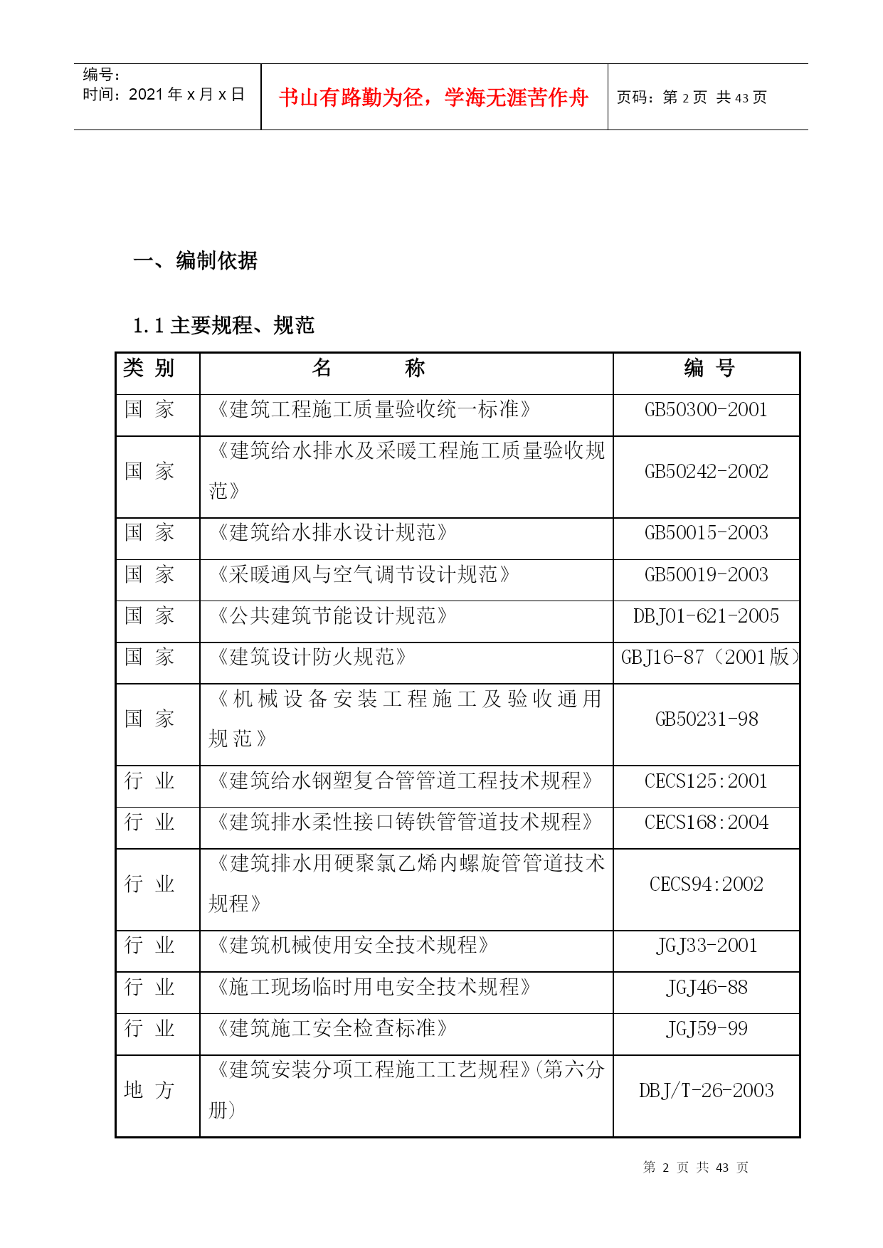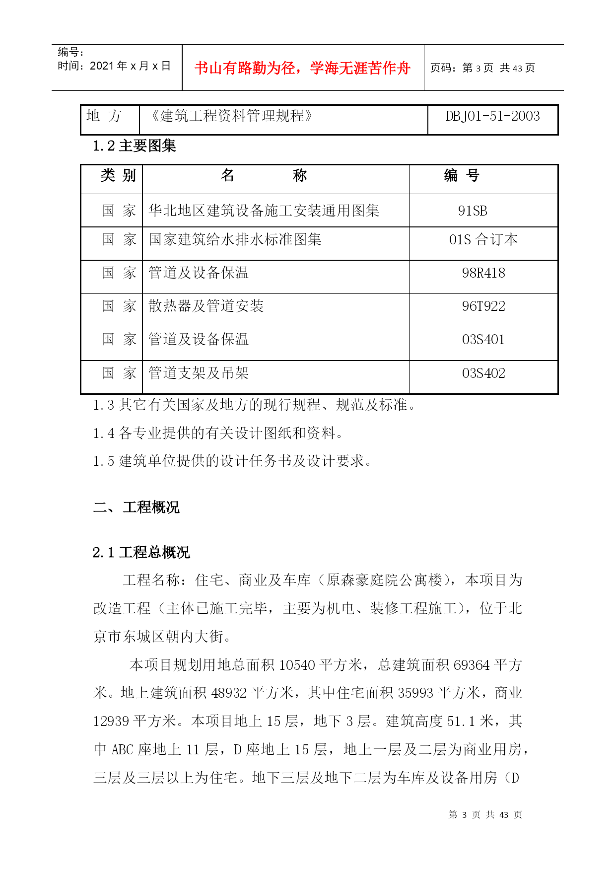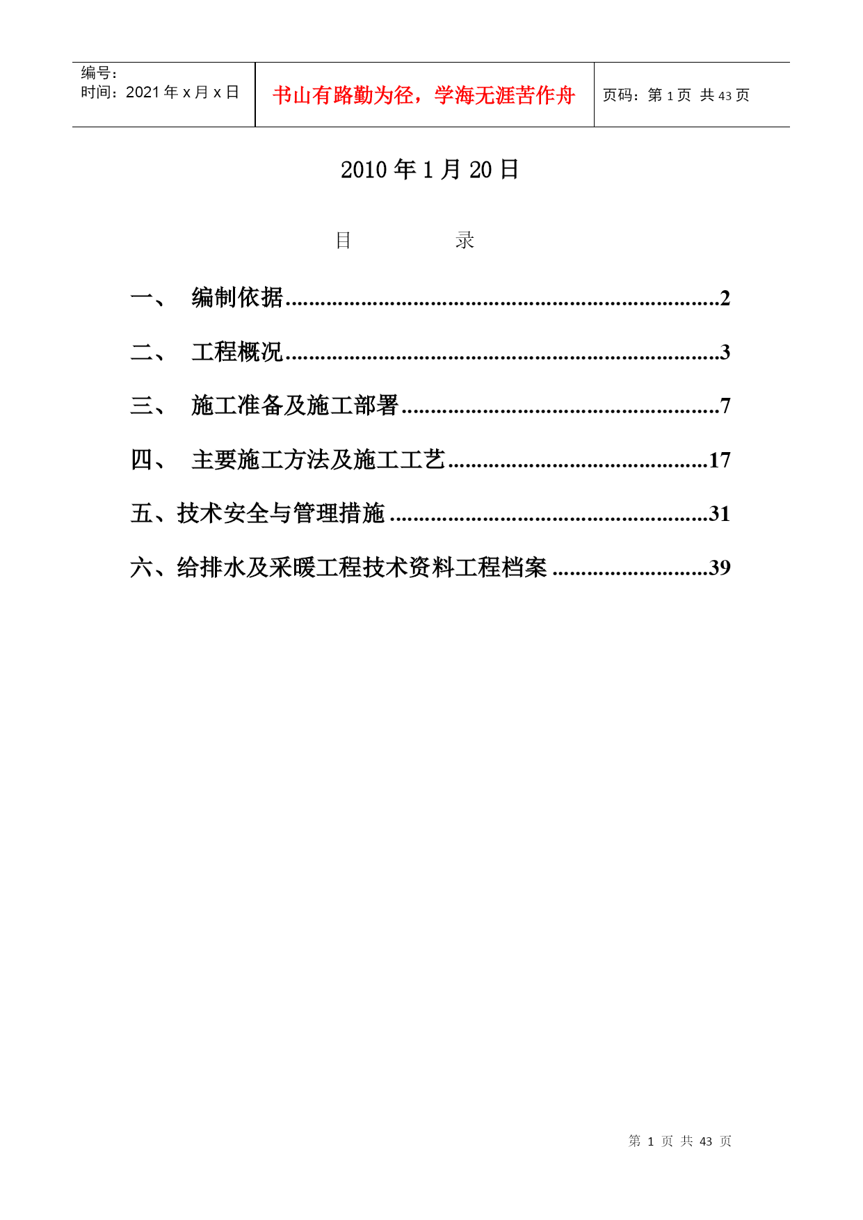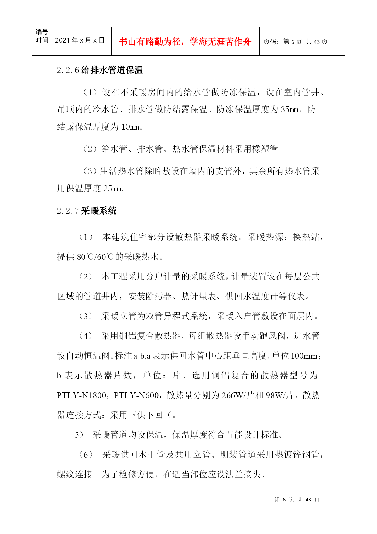 编号:时间:2021年x月x日书山有路勤为径,学海无涯苦作舟页码:第PAGE42页共NUMPAGES43页第PAGE\*MERGEFORMAT42页共NUMPAGES\*MERGEFORMAT43页给排水及采暖专业施工方案2010年1月20日目录TOC\o"1-3"\h\z\uHYPERLINK\l"_Toc255892350"一、编制依据PAGEREF_Toc255892350\h2HYPERLINK\l"_Toc255892351"二、工程概况PAGEREF_Toc255892351\h3HYPERLINK\l"_Toc255892352"三、施工准备及施工部署PAGEREF_Toc255892352\h7HYPERLINK\l"_Toc255892353"四、主要施工方法及施工工艺PAGEREF_Toc255892353\h17HYPERLINK\l"_Toc255892354"五、技术安全与管理措施PAGEREF_Toc255892354\h31HYPERLINK\l"_Toc255892355"六、给排水及采暖工程技术资料工程档案PAGEREF_Toc255892355\h39编制依据1.1主要规程、规范类别名称编号国家《建筑工程施工质量验收统一标准》GB50300-2001国家《建筑给水排水及采暖工程施工质量验收规范》GB50242-2002国家《建筑给水排水设计规范》GB50015-2003国家《采暖通风与空气调节设计规范》GB50019-2003国家《公共建筑节能设计规范》DBJ01-621-2005国家《建筑设计防火规范》GBJ16-87(2001版)国家《机械设备安装工程施工及验收通用规范》GB50231-98行业《建筑给水钢塑复合管管道工程技术规程》CECS125:2001行业《建筑排水柔性接口铸铁管管道技术规程》CECS168:2004行业《建筑排水用硬聚氯乙烯内螺旋管管道技术规程》CECS94:2002行业《建筑机械使用安全技术规程》JGJ33-2001行业《施工现场临时用电安全技术规程》JGJ46-88行业《建筑施工安全检查标准》JGJ59-99地方《建筑安装分项工程施工工艺规程》(第六分册)DBJ/T-26-2003地方《建筑工程资料管理规程》DBJ01-51-20031.2主要图集类别名称编号国家华北地区建筑设备施工安装通用图集91SB国家国家建筑给水排水标准图集01S合订本国家管道及设备保温98R418国家散热器及管道安装96T922国家管道及设备保温03S401国家管道支架及吊架03S4021.3其它有关国家及地方的现行规程、规范及标准。1.4各专业提供的有关设计图纸和资料。1.5建筑单位提供的设计任务书及设计要求。工程概况2.1工程总概况工程名称:住宅、商业及车库(原森豪庭院公寓楼),本项目为改造工程(主体已施工完毕,主要为机电、装修工程施工),位于北京市东城区朝内大街。本项目规划用地总面积10540平方米,总建筑面积69364平方米。地上建筑面积48932平方米,其中住宅面积35993平方米,商业12939平方米。本项目地上15层,地下3层。建筑高度51.1米,其中ABC座地上11层,D座地上15层,地上一层及二层为商业用房,三层及三层以上为住宅。地下三层及地下二层为车库及设备用房(D座为人防);地下一层为商业娱乐用房及设备用房。2.2专业概况2.1.1承包范围施工范围:室内给水、排水、采暖管道系统。包括:生活给水系统、生活热水系统、中水系统、生活污废水系统、雨水系统的管道施工,压力排水系统污水泵的施工;采暖系统管道及散热器施工。2.2.2生活给水系统(1)水源:用地东西两侧各接入一路管径为DN150的市政给水管道,水压为0.25Mpa,出水水质符合现行国家《生活饮用水卫生标准》的要求。最高日生活冷水用水量615立方米,最大时为64立方米。(2)系统形式:本工程三层以下商业及车库部分采用市政水直供。三层以上ABCD座住宅部分采用地下三层的无负压供水设备供水,供水压力0.69Mpa,水量30T/h;住宅3~6层给水入户支管设比例式减压阀,阀后压力0.25Mpa;无负压供水设备应首先取得市政供水有关部门的书面同意意见书并有省级以上单位批准的卫生许可证;该设备在接市政管道给水入口处设倒流防止器。(3)生活冷、热水给水管立管采用钢塑复合管(需达到生活饮用水标准),其中管径≤DN100的采用螺纹连接,管径>DN100采用钢塑法兰连接。生活冷热水给