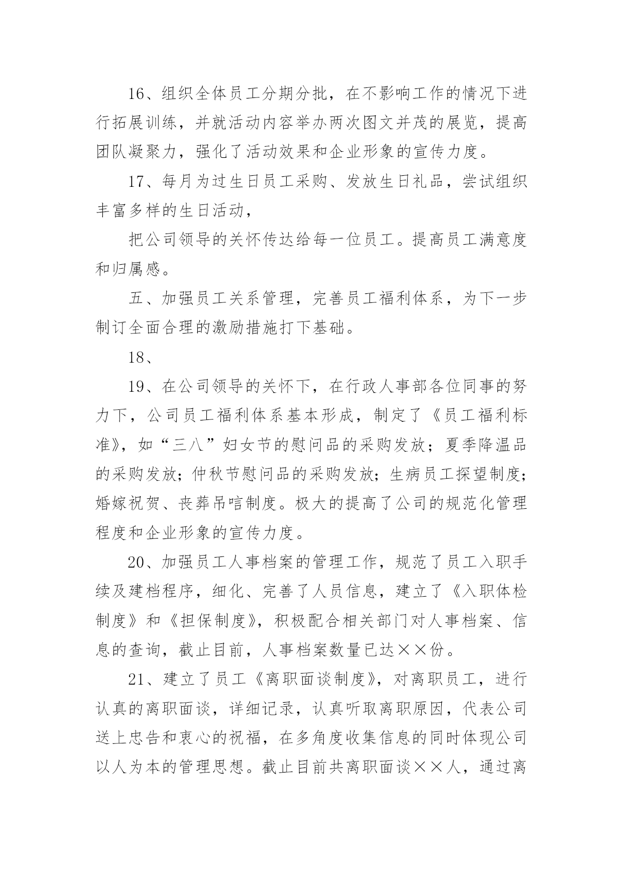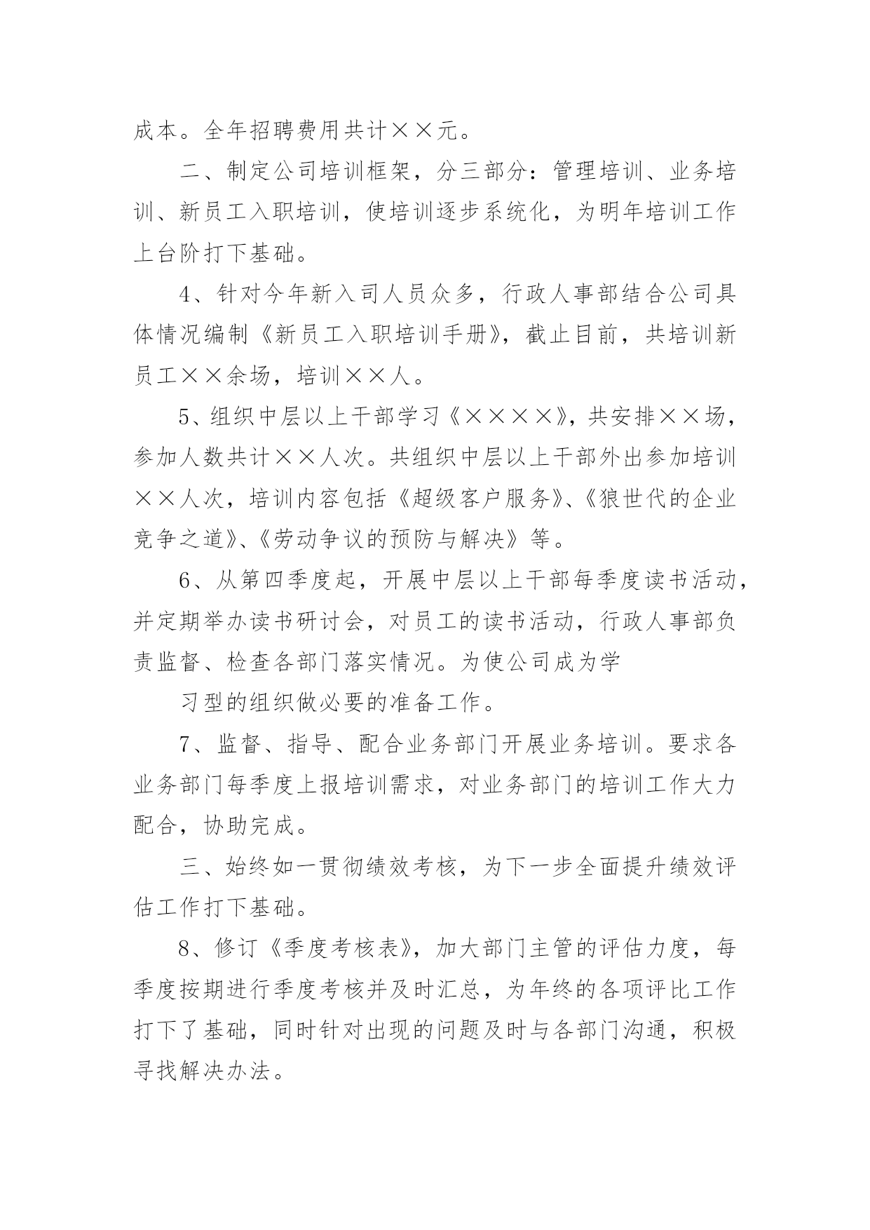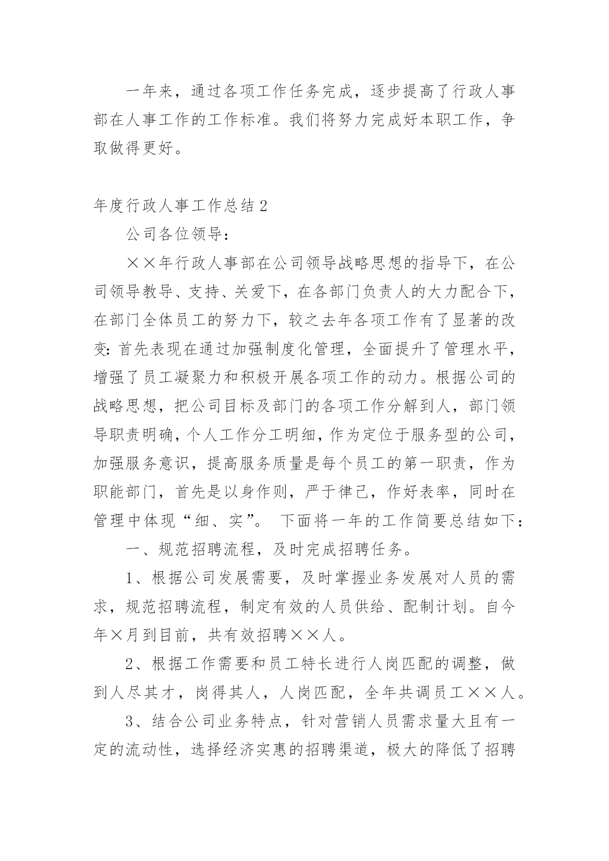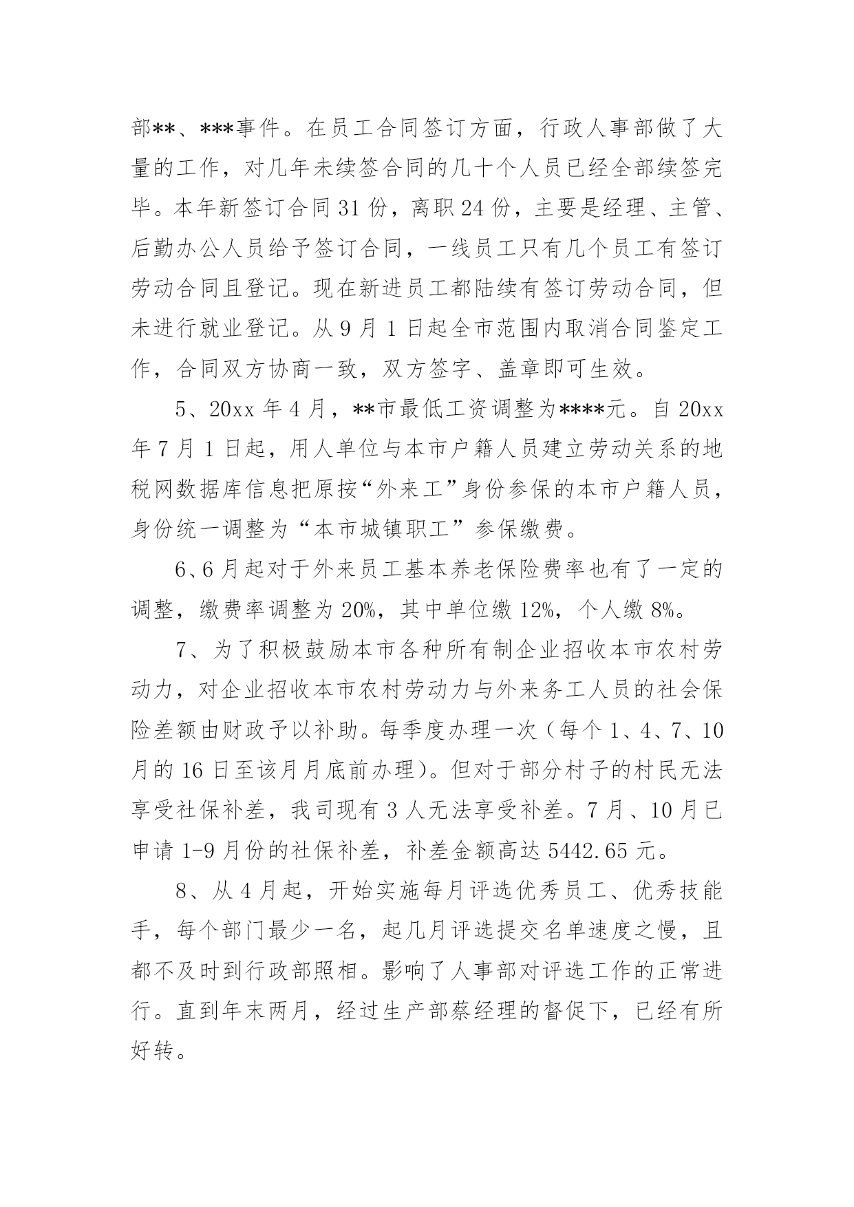 年度行政人事工作总结总结就是把一个时间段取得的成绩、存在的问题及得到的经验和教训进行一次全面系统的总结的书面材料,它在我们的学习、工作中起到呈上启下的作用,因此我们需要回头归纳,写一份总结了。总结怎么写才能发挥它的作用呢?下面是小编帮大家整理的年度行政人事工作总结,希望对大家有所帮助。年度行政人事工作总结120xx年终岁末,一年的工作转瞬又将成为历史。回首过去的一年,内心不禁感慨万千;虽然没有轰轰烈烈的战果,但也算经历了一段不凡的考验和磨砺。在公司领导的正确领导下,我们的工作首重于公司的经营方针、宗旨和效益目标上,紧紧围绕重点展开工作,紧跟公司各项工作部署。在管理上努力争取做得越来越好。行政人事部20xx年经历了人员的大变动,行政部经理、人事专员、行政文员、总务兼网管、司机等关键岗位人员均作过变动;部门人员缺乏,同时受资源的限制以及由此产生的管理重心的变化,导致部门部分管理工作由此产生的管理重心的变化,导致部门部分管理工作开展的延续性、深入程度、工作质量及工作满意度受到一定程度的影响,行政人事部现就将20xx年度工作做如下总结:一、20xx年人事主要工作1、人事管理求完善、个人素质求提高根据公司人员配备需求,结合公司的实际情况和组织架构的调整,做为人事部我们加大人员招聘力度。一般通过网络招聘、大小型人才招聘会、附近工业区粘贴招聘广告单、介绍所介绍、员工带员工等招聘渠道进行大力的招聘。在招聘工作中,初审符合招聘岗位要求的简历,后勤办公达200份以上,普工不计,虽然符合招聘岗位要求的简历众多,但是能留下来的却是少之又少,甚至一些岗位缺岗3个月以上。主要留不住员工的原因关键在于上半年进行了一次**市最低工资的调整,而导致就现在同行同岗位薪资中我司偏低,上班时间过长,行业过于陈旧,现在电子行业及其他高端技术方面的倍受年轻就业者的欢迎。且招聘大多数为本地外地的中老年人,文化水平极低的未成年人员较多。目前在岗人数约人,同比去年减少%。现缺人数:办公室7人,一线员工70人。2、在员工培训方面一直以来都是视频培训,对于言语不通的员工来说就是0培训。培训内容简少,但考虑本公司招聘员工层次有诸多不便:A交流问题;B文化层次问题,造成无法实施更多更好的培训方法。在公司规章制度、岗位培训、消防管理知识、礼仪礼节方面严重缺乏。3、今年上半年人事已对现有人员建立起电子档案,95%的人员基本信息齐全。对于资料不齐全的将逐渐补齐。4、在员工关系处理方面,结合出现劳动纠纷,行政人事部积极沟通,及时请示,减少公司利益损失。例如:营销部**、***事件。在员工合同签订方面,行政人事部做了大量的工作,对几年未续签合同的几十个人员已经全部续签完毕。本年新签订合同31份,离职24份,主要是经理、主管、后勤办公人员给予签订合同,一线员工只有几个员工有签订劳动合同且登记。现在新进员工都陆续有签订劳动合同,但未进行就业登记。从9月1日起全市范围内取消合同鉴定工作,合同双方协商一致,双方签字、盖章即可生效。5、20xx年4月,**市最低工资调整为****元。自20xx年7月1日起,用人单位与本市户籍人员建立劳动关系的地税网数据库信息把原按“外来工”身份参保的本市户籍人员,身份统一调整为“本市城镇职工”参保缴费。6、6月起对于外来员工基本养老保险费率也有了一定的调整,缴费率调整为20%,其中单位缴12%,个人缴8%。7、为了积极鼓励本市各种所有制企业招收本市农村劳动力,对企业招收本市农村劳动力与外来务工人员的社会保险差额由财政予以补助。每季度办理一次(每个1、4、7、10月的16日至该月月底前办理)。但对于部分村子的村民无法享受社保补差,我司现有3人无法享受补差。7月、10月已申请1-9月份的社保补差,补差金额高达5442.65元。8、从4月起,开始实施每月评选优秀员工、优秀技能手,每个部门最少一名,起几月评选提交名单速度之慢,且都不及时到行政部照相。影响了人事部对评选工作的正常进行。直到年末两月,经过生产部蔡经理的督促下,已经有所好转。一年来,通过各项工作任务完成,逐步提高了行政人事部在人事工作的工作标准。我们将努力完成好本职工作,争取做得更好。年度行政人事工作总结2公司各位领导:××年行政人事部在公司领导战略思想的指导下,在公司领导教导、支持、关爱下,在各部门负责人的大力配合下,在部门全体员工的努力下,较之去年各项工作有了显著的改变:首先表现在通过加强制度化管理,全面提升了管理水平,增强了员工凝聚力和积极开展各项工作的动力。根据公司的战略思想,把公司目标及部门的各项工作分解到人,部门领导职责明确,个人工作分工明细,作为定位于服务型的公司,加强服务意识,提高服务质量是每个员工的第一职责,作为职能部门,首先是以身作则,严于律己,作好表率,同时在管理中体现“细、实”。下面将一年