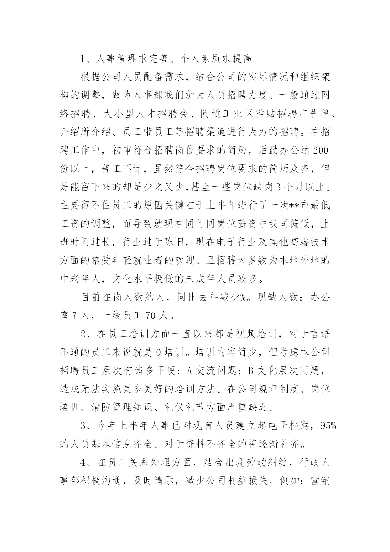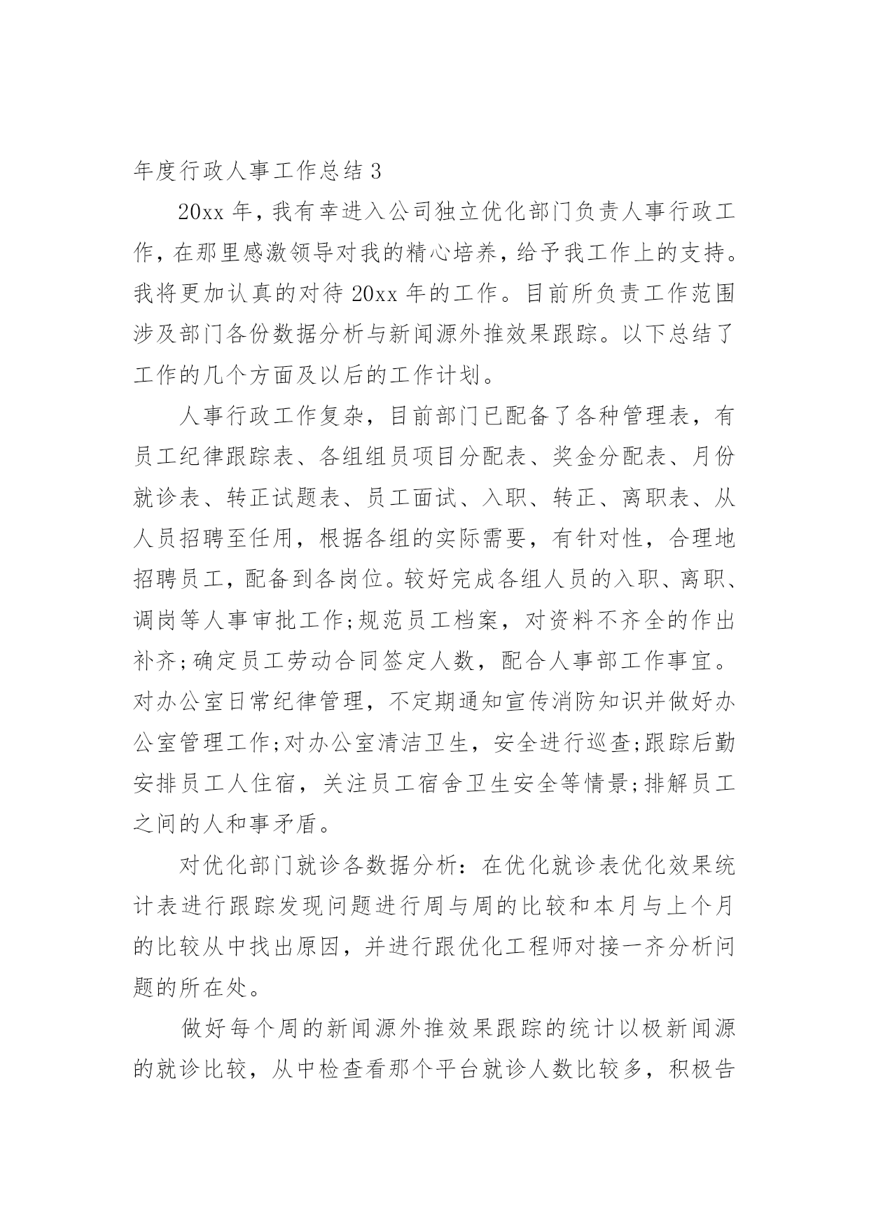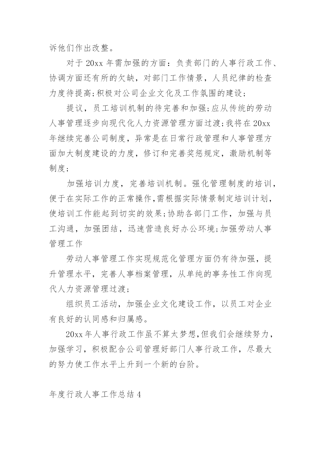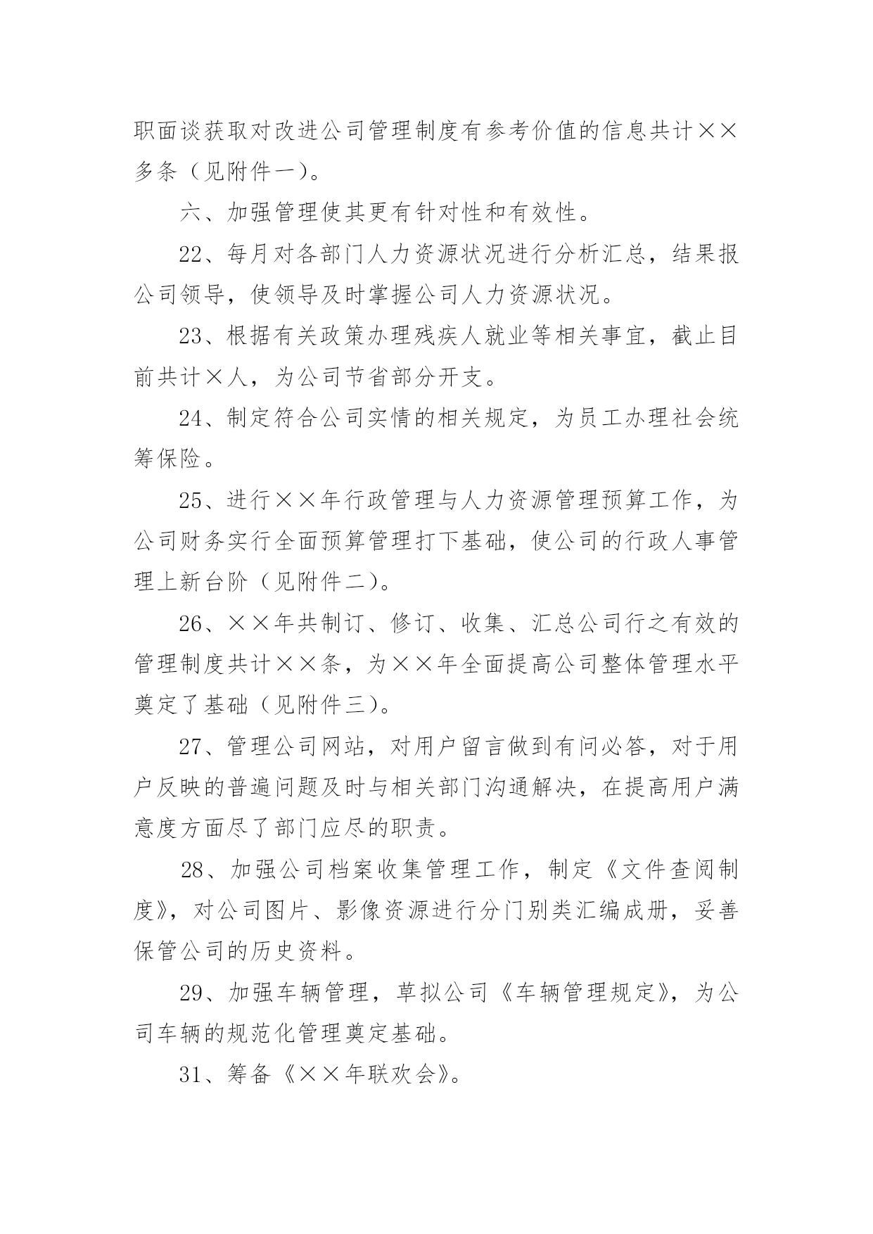 年度行政人事工作总结总结就是把一个时间段取得的成绩、存在的问题及得到的经验和教训进行一次全面系统的总结的书面材料,它在我们的学习、工作中起到呈上启下的作用,因此我们需要回头归纳,写一份总结了。总结怎么写才能发挥它的作用呢?下面是小编帮大家整理的年度行政人事工作总结,希望对大家有所帮助。年度行政人事工作总结120xx年终岁末,一年的工作转瞬又将成为历史。回首过去的一年,内心不禁感慨万千;虽然没有轰轰烈烈的战果,但也算经历了一段不凡的考验和磨砺。在公司领导的正确领导下,我们的工作首重于公司的经营方针、宗旨和效益目标上,紧紧围绕重点展开工作,紧跟公司各项工作部署。在管理上努力争取做得越来越好。行政人事部20xx年经历了人员的大变动,行政部经理、人事专员、行政文员、总务兼网管、司机等关键岗位人员均作过变动;部门人员缺乏,同时受资源的限制以及由此产生的管理重心的变化,导致部门部分管理工作由此产生的管理重心的变化,导致部门部分管理工作开展的延续性、深入程度、工作质量及工作满意度受到一定程度的影响,行政人事部现就将20xx年度工作做如下总结:一、20xx年人事主要工作1、人事管理求完善、个人素质求提高根据公司人员配备需求,结合公司的实际情况和组织架构的调整,做为人事部我们加大人员招聘力度。一般通过网络招聘、大小型人才招聘会、附近工业区粘贴招聘广告单、介绍所介绍、员工带员工等招聘渠道进行大力的招聘。在招聘工作中,初审符合招聘岗位要求的简历,后勤办公达200份以上,普工不计,虽然符合招聘岗位要求的简历众多,但是能留下来的却是少之又少,甚至一些岗位缺岗3个月以上。主要留不住员工的原因关键在于上半年进行了一次**市最低工资的调整,而导致就现在同行同岗位薪资中我司偏低,上班时间过长,行业过于陈旧,现在电子行业及其他高端技术方面的倍受年轻就业者的欢迎。且招聘大多数为本地外地的中老年人,文化水平极低的未成年人员较多。目前在岗人数约人,同比去年减少%。现缺人数:办公室7人,一线员工70人。2、在员工培训方面一直以来都是视频培训,对于言语不通的员工来说就是0培训。培训内容简少,但考虑本公司招聘员工层次有诸多不便:A交流问题;B文化层次问题,造成无法实施更多更好的培训方法。在公司规章制度、岗位培训、消防管理知识、礼仪礼节方面严重缺乏。3、今年上半年人事已对现有人员建立起电子档案,95%的人员基本信息齐全。对于资料不齐全的将逐渐补齐。4、在员工关系处理方面,结合出现劳动纠纷,行政人事部积极沟通,及时请示,减少公司利益损失。例如:营销部**、***事件。在员工合同签订方面,行政人事部做了大量的工作,对几年未续签合同的几十个人员已经全部续签完毕。本年新签订合同31份,离职24份,主要是经理、主管、后勤办公人员给予签订合同,一线员工只有几个员工有签订劳动合同且登记。现在新进员工都陆续有签订劳动合同,但未进行就业登记。从9月1日起全市范围内取消合同鉴定工作,合同双方协商一致,双方签字、盖章即可生效。5、20xx年4月,**市最低工资调整为****元。自20xx年7月1日起,用人单位与本市户籍人员建立劳动关系的地税网数据库信息把原按“外来工”身份参保的本市户籍人员,身份统一调整为“本市城镇职工”参保缴费。6、6月起对于外来员工基本养老保险费率也有了一定的调整,缴费率调整为20%,其中单位缴12%,个人缴8%。7、为了积极鼓励本市各种所有制企业招收本市农村劳动力,对企业招收本市农村劳动力与外来务工人员的社会保险差额由财政予以补助。每季度办理一次(每个1、4、7、10月的16日至该月月底前办理)。但对于部分村子的村民无法享受社保补差,我司现有3人无法享受补差。7月、10月已申请1-9月份的社保补差,补差金额高达5442.65元。8、从4月起,开始实施每月评选优秀员工、优秀技能手,每个部门最少一名,起几月评选提交名单速度之慢,且都不及时到行政部照相。影响了人事部对评选工作的正常进行。直到年末两月,经过生产部蔡经理的督促下,已经有所好转。一年来,通过各项工作任务完成,逐步提高了行政人事部在人事工作的工作标准。我们将努力完成好本职工作,争取做得更好。年度行政人事工作总结2公司各位领导:××年行政人事部在公司领导战略思想的指导下,在公司领导教导、支持、关爱下,在各部门负责人的大力配合下,在部门全体员工的努力下,较之去年各项工作有了显著的改变:首先表现在通过加强制度化管理,全面提升了管理水平,增强了员工凝聚力和积极开展各项工作的动力。根据公司的战略思想,把公司目标及部门的各项工作分解到人,部门领导职责明确,个人工作分工明细,作为定位于服务型的公司,加强服务意识,提高服务质量是每个员工的第一职责,作为职能部门,首先是以身作则,严于律己,作好表率,同时在管理中体现“细、实”。下面将一年