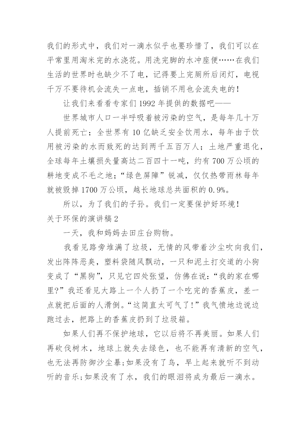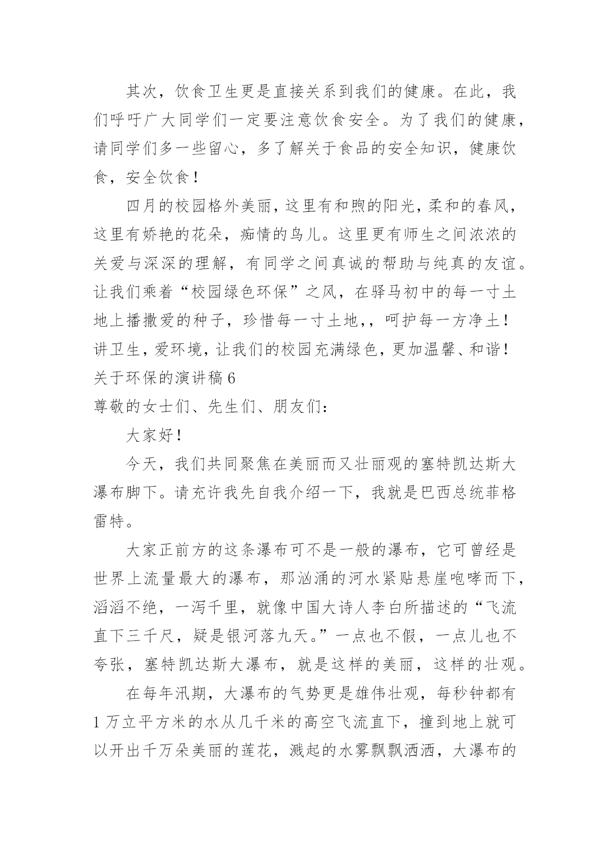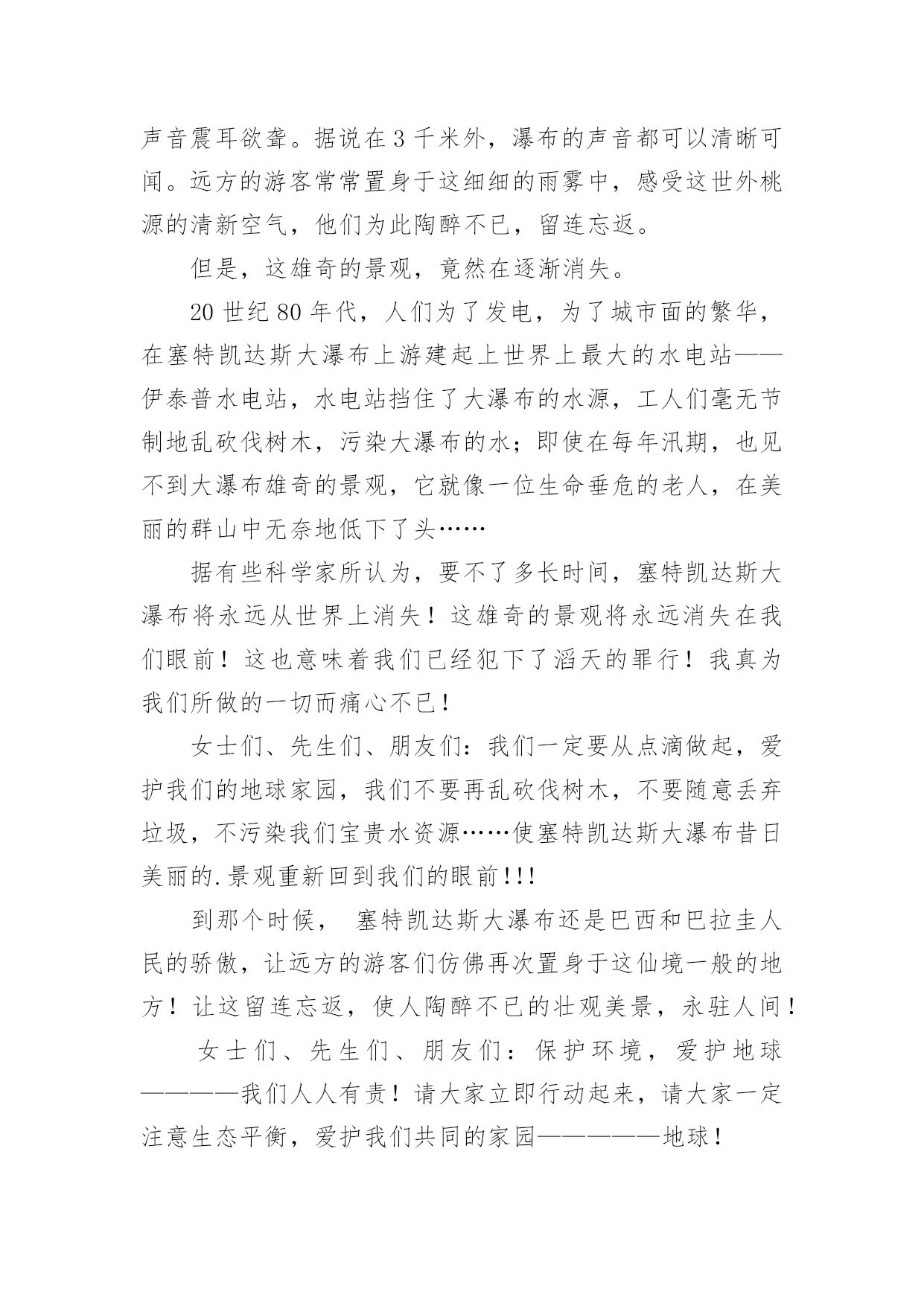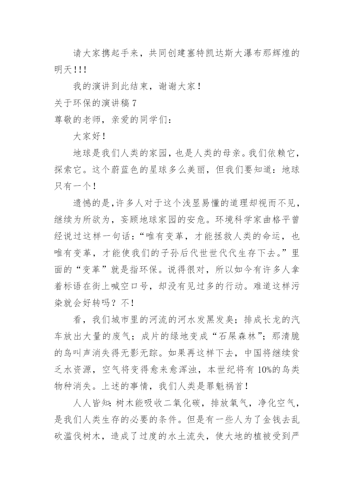 环保的演讲稿关于环保的演讲稿[优选15篇]演讲稿可以起到整理演讲者的思路、提示演讲的内容、限定演讲的速度的作用。现如今,演讲稿对我们的作用越来越大,在写之前,可以先参考范文,下面是小编为大家整理的关于环保的演讲稿,希望对大家有所帮助。关于环保的演讲稿1在我们生活的环境中,地球正面临着环境不断恶化的威胁。面对着这样的形式,我们该怎么办!难道你忘了么?你忘了种种地震的灾难吗?你忘了种种泥石流的灾难了吗?你忘了种种洪水的灾难吗……哦,太多了!我们该怎么办?答案只有四个字:保护环境!在我们生活的世界上因工业污水源源不断的流入江。河。湖。海,使我们地球的大部分的水源断流。堆积如山的垃圾散发着难闻的臭味,使居民们躲开得远远的。森林面积锐减,人们看到了都摸不着头脑……这种情形我们为何不制止!外国人已经十分的`把环境保护的很棒,我们真的不如他们吗?我们国家真的不可以超过他们吗?我相信,我们中国人一定能行!其实,我们保护环境只是举手之劳。下面让我们观察一下生活中的的一些事情吧——我们生活的世界是水的世界,我们不能浪费一滴水!以我们的形式中,我们对一滴水似乎也要珍惜了,我们可以在平常里用淘米完的水浇花。用洗完脚的水冲座便……在我们生活的世界时也缺少不了电,记得要上完厕所后闭灯,电视千万不要待机会流失一点电,插销不用也会流失电的!让我们来看看专家们1992年提供的数据吧——世界城市人口一半呼吸着被污染的空气,是每年几十万人提前死亡;全世界有10亿缺乏安全饮用水,每年由于饮用被污染的水而致死的达到两千五百万人;土地严重退化,全球每年土壤损失量高达二百四十一吨,约有700万公顷的耕地变成不毛之地;“绿色屏障”锐减,仅仅热带雨林每年就被毁掉1700万公顷,越长地球总共面积的0.9%。所以,为了我们的子孙。我们一定要保护好环境!关于环保的演讲稿2一天,我和妈妈去田庄台购物。我看见路旁堆满了垃圾,无情的风带着沙尘吹向我们,发出阵阵恶臭,塑料袋随风飘动,一只和泥土打交道的小狗变成了“黑狗”,只见它四处张望,仿佛在说:“我的家在哪里?”我还看见大路上一个人扔了一个吃完的香蕉皮,差一点就把后面的人滑倒。“这简直太可气了!”我气愤地边说边跑过去,把路上的香蕉皮扔到了垃圾箱。如果人们再不保护地球,它以后将不再美丽。如果人们再砍伐树木,地球上就失去绿色,也不能再有清新的空气,也无法再防御沙尘暴;如果没有了鸟,早上起来就听不到动听的音乐;如果没有了水,我们的眼泪将成为最后一滴水。这个单元,我们学习了“一个小村庄的故事”这篇课文,主要讲人们乱砍树木结果小村庄消失的故事。所以,为了我们的`地球,请大家要节约用水、用电,不有破坏公物,不随地吐痰,不踩草坪。我们要保护我们的家园,我一定要做一个真正的环保小卫士!关于环保的演讲稿3各位老师、同学:大家上午好!本周是全球节能宣传周,然而此时此刻,我们所处的环境正在不断恶化着:河水越来越黑臭,空气越来越浑浊,森林越老越少,垃圾越来越多……我们美丽的自然世界正一步一步地远离我们,人类正处于前所未有的危机之中,而这危机的制造者是人类,承受者也必然是人类。我们欣喜的看到,有一部分人先行动了起来,他们提出了低碳生活的概念:就是把作息时间内所用能量进可能的减少,从而减低二氧化碳的排放量。低碳生活对我们来说应是一种生活态度。做好生活中的每一件小事,比如说少吃一次快餐,就减少0。48kg的碳排放量,少丢1kg垃圾,就减少2。66kg的碳排放量。虽然每个人可以做的事很小很小,可是如果全世界的人都加入低碳生活的行列,地球上每天便可减少1。1x10^8吨的碳排放量。加入低碳生活仅仅是保护环境的.一个部分,我们可以为地球做的还有很多很多,减少对于一次性商品的使用便是很重要的一项。人们都说“十年树木,百年树人。”可树木在辛辛苦苦成长几十年后便被无情地砍伐掉,成了植被使用一次就被丢弃掉的废品。正因为人类对大自然无尽的索取,生态才会越来越不平衡。同学们,你们知道吗?德国的生态学家马悠已经在云南进行热带雨林的修复工作13年了。不知不觉间,300多万课树苗已经被种下,人类对森林的破坏正在一点一点的被修补。马悠并非中国人,却为了我国的环境而付出,正因为他明白环保是不分国界的,每个人所做的都是为了全球的环境。所以,为了保护这美丽的而脆弱的世界,威力弥补人类对地球犯下的错误,让我们加入低碳生活的行列吧,让我们是地球的明天更加美好。谢谢!关于环保的演讲稿4大家上午好,我今天国旗下讲话的题目是:环保——一件让自己和大家都快乐的事。踩到香蕉皮上差点跌到,立刻把它拾起来放到垃圾桶,整个过程一直没有别人的眼光,对于希望完善自己的人来说,把结果给大家,把过程给自己是快乐的。收好废旧的电池,把它放在该放的地方,使它成为可以再利用的资源,而不是成为污染土壤、水源和身体的恶魔。想象着在干