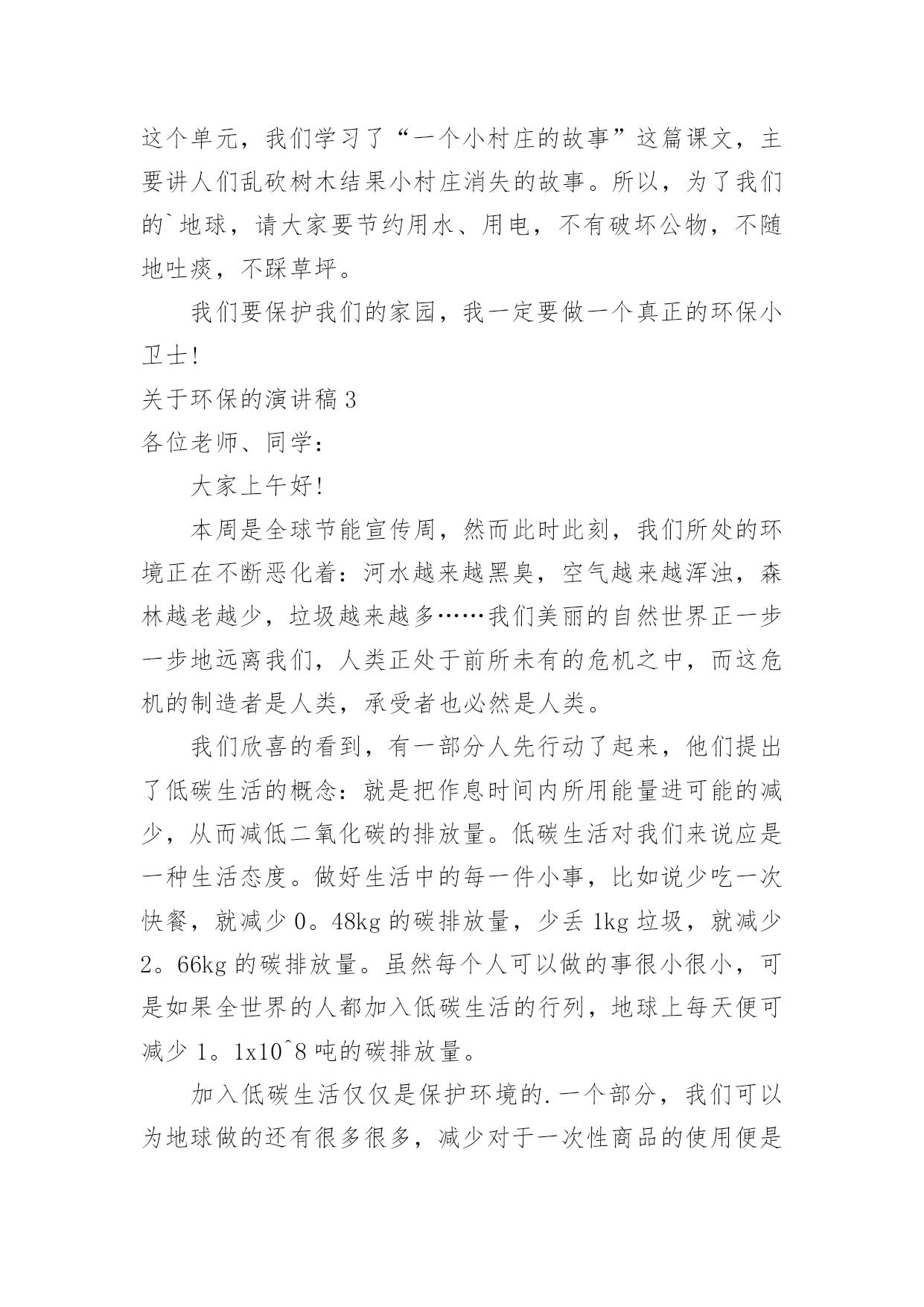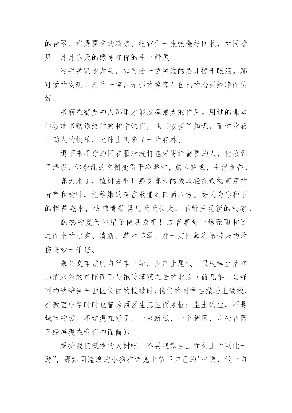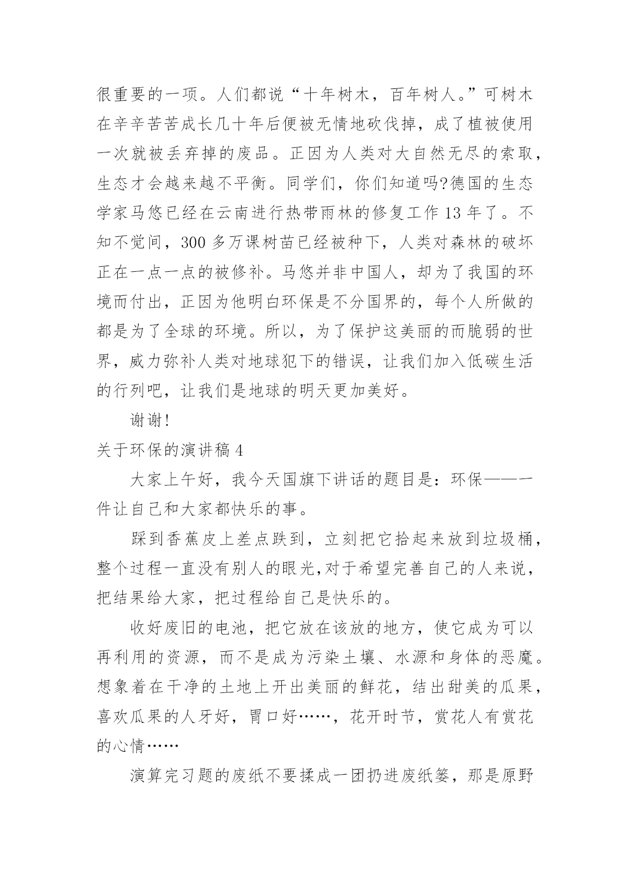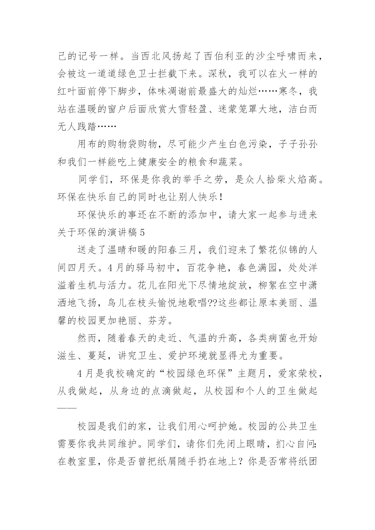 环保的演讲稿关于环保的演讲稿[优选15篇]演讲稿可以起到整理演讲者的思路、提示演讲的内容、限定演讲的速度的作用。现如今,演讲稿对我们的作用越来越大,在写之前,可以先参考范文,下面是小编为大家整理的关于环保的演讲稿,希望对大家有所帮助。关于环保的演讲稿1在我们生活的环境中,地球正面临着环境不断恶化的威胁。面对着这样的形式,我们该怎么办!难道你忘了么?你忘了种种地震的灾难吗?你忘了种种泥石流的灾难了吗?你忘了种种洪水的灾难吗……哦,太多了!我们该怎么办?答案只有四个字:保护环境!在我们生活的世界上因工业污水源源不断的流入江。河。湖。海,使我们地球的大部分的水源断流。堆积如山的垃圾散发着难闻的臭味,使居民们躲开得远远的。森林面积锐减,人们看到了都摸不着头脑……这种情形我们为何不制止!外国人已经十分的`把环境保护的很棒,我们真的不如他们吗?我们国家真的不可以超过他们吗?我相信,我们中国人一定能行!其实,我们保护环境只是举手之劳。下面让我们观察一下生活中的的一些事情吧——我们生活的世界是水的世界,我们不能浪费一滴水!以我们的形式中,我们对一滴水似乎也要珍惜了,我们可以在平常里用淘米完的水浇花。用洗完脚的水冲座便……在我们生活的世界时也缺少不了电,记得要上完厕所后闭灯,电视千万不要待机会流失一点电,插销不用也会流失电的!让我们来看看专家们1992年提供的数据吧——世界城市人口一半呼吸着被污染的空气,是每年几十万人提前死亡;全世界有10亿缺乏安全饮用水,每年由于饮用被污染的水而致死的达到两千五百万人;土地严重退化,全球每年土壤损失量高达二百四十一吨,约有700万公顷的耕地变成不毛之地;“绿色屏障”锐减,仅仅热带雨林每年就被毁掉1700万公顷,越长地球总共面积的0.9%。所以,为了我们的子孙。我们一定要保护好环境!关于环保的演讲稿2一天,我和妈妈去田庄台购物。我看见路旁堆满了垃圾,无情的风带着沙尘吹向我们,发出阵阵恶臭,塑料袋随风飘动,一只和泥土打交道的小狗变成了“黑狗”,只见它四处张望,仿佛在说:“我的家在哪里?”我还看见大路上一个人扔了一个吃完的香蕉皮,差一点就把后面的人滑倒。“这简直太可气了!”我气愤地边说边跑过去,把路上的香蕉皮扔到了垃圾箱。如果人们再不保护地球,它以后将不再美丽。如果人们再砍伐树木,地球上就失去绿色,也不能再有清新的空气,也无法再防御沙尘暴;如果没有了鸟,早上起来就听不到动听的音乐;如果没有了水,我们的眼泪将成为最后一滴水。这个单元,我们学习了“一个小村庄的故事”这篇课文,主要讲人们乱砍树木结果小村庄消失的故事。所以,为了我们的`地球,请大家要节约用水、用电,不有破坏公物,不随地吐痰,不踩草坪。我们要保护我们的家园,我一定要做一个真正的环保小卫士!关于环保的演讲稿3各位老师、同学:大家上午好!本周是全球节能宣传周,然而此时此刻,我们所处的环境正在不断恶化着:河水越来越黑臭,空气越来越浑浊,森林越老越少,垃圾越来越多……我们美丽的自然世界正一步一步地远离我们,人类正处于前所未有的危机之中,而这危机的制造者是人类,承受者也必然是人类。我们欣喜的看到,有一部分人先行动了起来,他们提出了低碳生活的概念:就是把作息时间内所用能量进可能的减少,从而减低二氧化碳的排放量。低碳生活对我们来说应是一种生活态度。做好生活中的每一件小事,比如说少吃一次快餐,就减少0。48kg的碳排放量,少丢1kg垃圾,就减少2。66kg的碳排放量。虽然每个人可以做的事很小很小,可是如果全世界的人都加入低碳生活的行列,地球上每天便可减少1。1x10^8吨的碳排放量。加入低碳生活仅仅是保护环境的.一个部分,我们可以为地球做的还有很多很多,减少对于一次性商品的使用便是很重要的一项。人们都说“十年树木,百年树人。”可树木在辛辛苦苦成长几十年后便被无情地砍伐掉,成了植被使用一次就被丢弃掉的废品。正因为人类对大自然无尽的索取,生态才会越来越不平衡。同学们,你们知道吗?德国的生态学家马悠已经在云南进行热带雨林的修复工作13年了。不知不觉间,300多万课树苗已经被种下,人类对森林的破坏正在一点一点的被修补。马悠并非中国人,却为了我国的环境而付出,正因为他明白环保是不分国界的,每个人所做的都是为了全球的环境。所以,为了保护这美丽的而脆弱的世界,威力弥补人类对地球犯下的错误,让我们加入低碳生活的行列吧,让我们是地球的明天更加美好。谢谢!关于环保的演讲稿4大家上午好,我今天国旗下讲话的题目是:环保——一件让自己和大家都快乐的事。踩到香蕉皮上差点跌到,立刻把它拾起来放到垃圾桶,整个过程一直没有别人的眼光,对于希望完善自己的人来说,把结果给大家,把过程给自己是快乐的。收好废旧的电池,把它放在该放的地方,使它成为可以再利用的资源,而不是成为污染土壤、水源和身体的恶魔。想象着在干