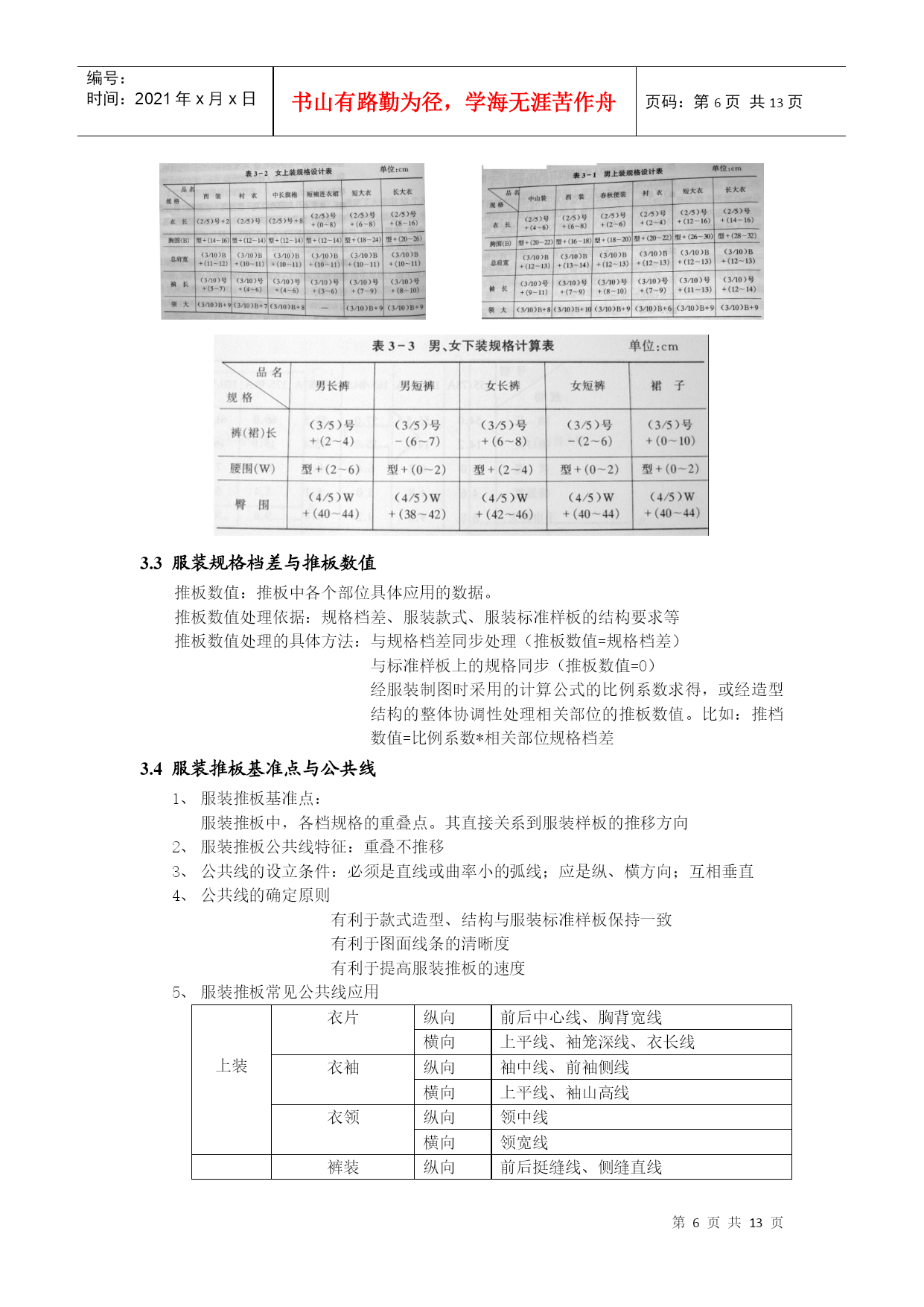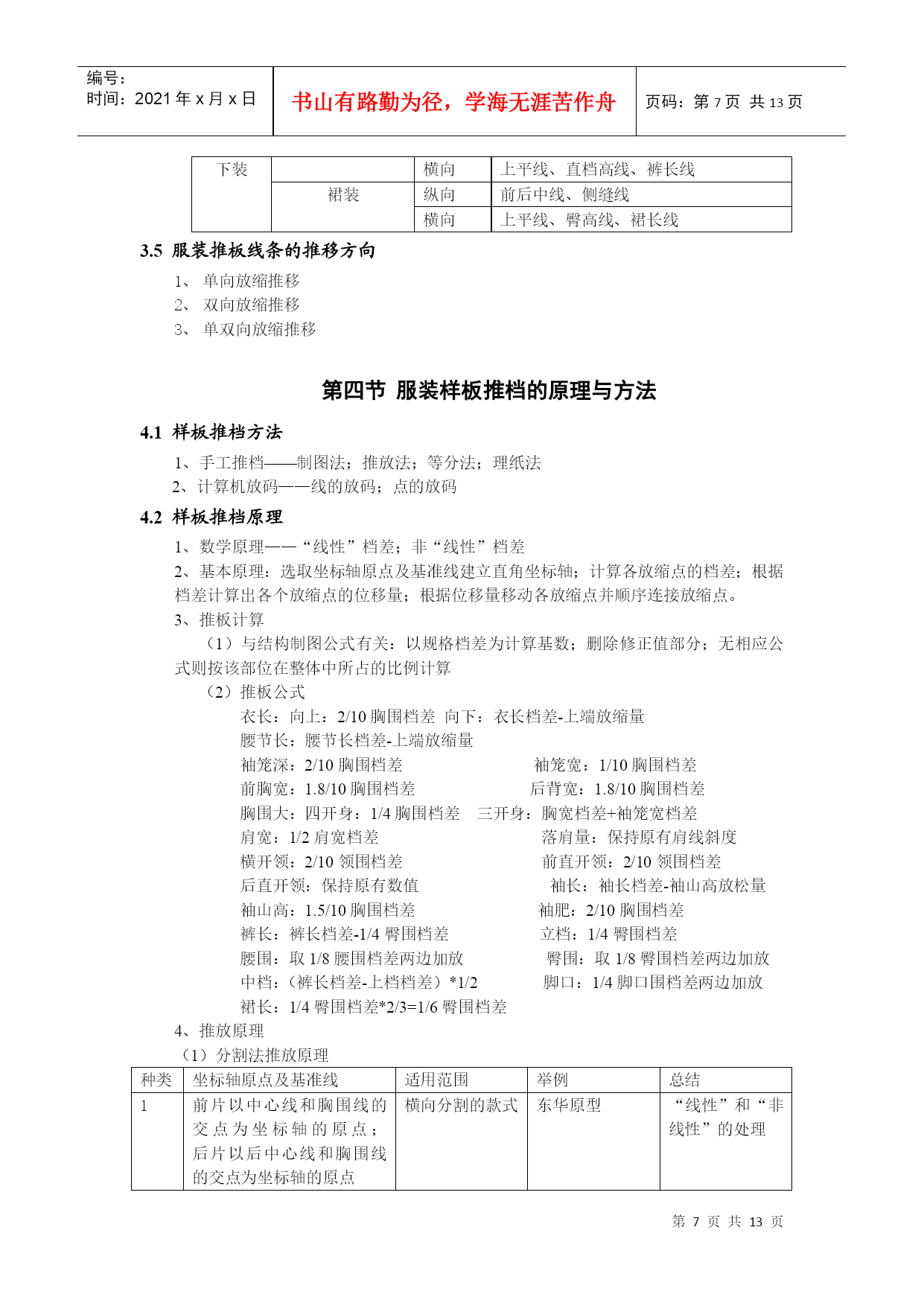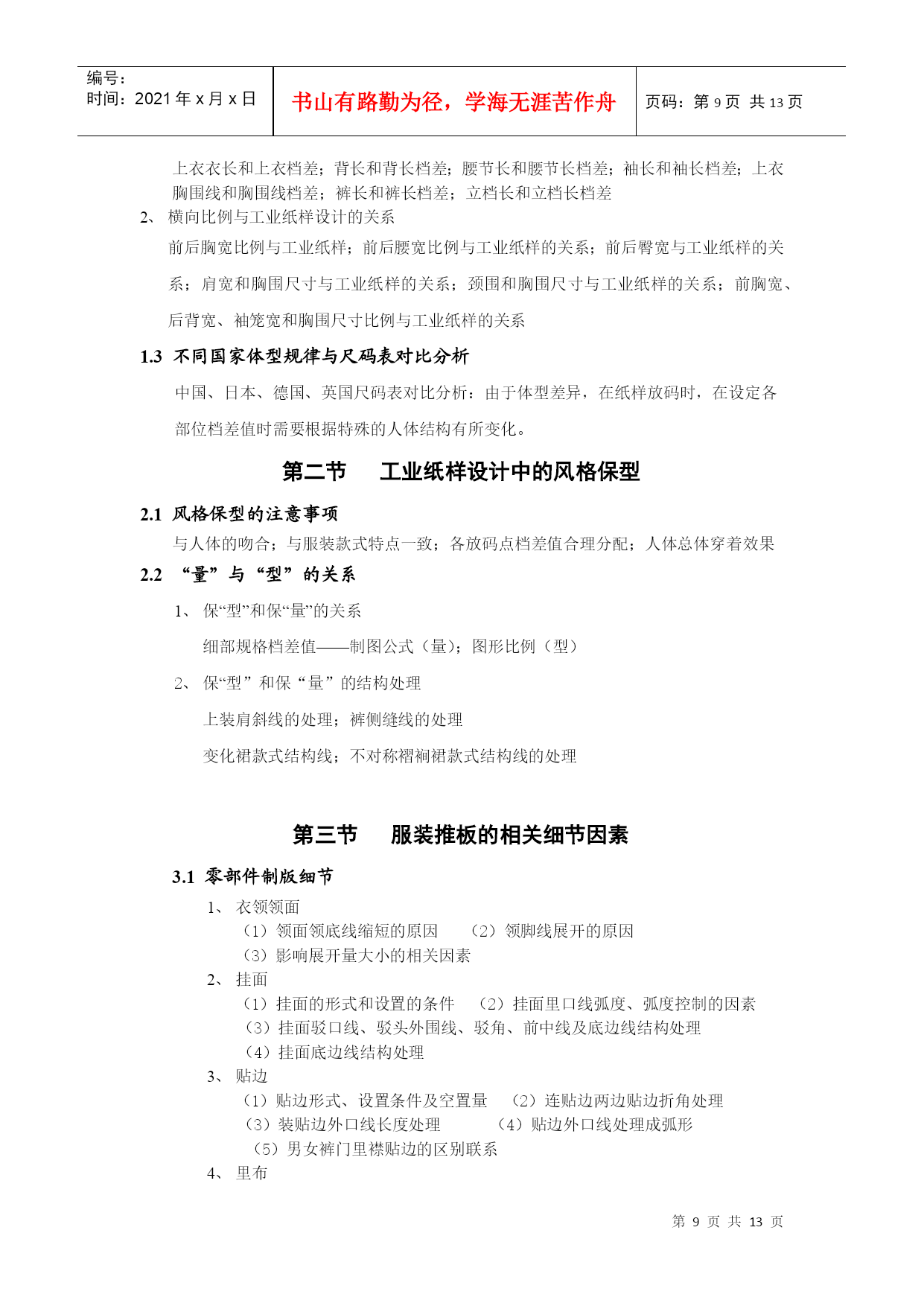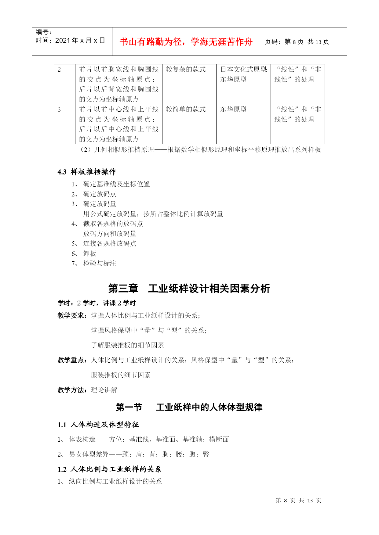 编号:时间:2021年x月x日书山有路勤为径,学海无涯苦作舟页码:第PAGE13页共NUMPAGES13页第PAGE\*MERGEFORMAT13页共NUMPAGES\*MERGEFORMAT13页工业样板设计的概述学时:1学时,讲课1学时教学要求:了解服装工业样板设计相关基本概念与常用术语;掌握服装工业样板的含义、特点、种类、作用;掌握服装基准纸样的确定;教学重点:服装工业样板的种类;服装基准纸样的确定教学方法:理论讲解基本概念和常用术语1.1概念1、服装工业纸样:为服装工业化大生产提供符合款式要求、面料要求、规格尺寸和工艺要求的可用于裁剪、缝制与整理的全套工业纸样(样板)。2、服装工业制版:在服装设计这一个系统工程中,由分解立体形态产生平面制图到加放缝份产生样板的过程。是建立在批量测量人体并加以归纳总结得到的系列数据基础上的裁剪方法,它最大限度地保持群体体态的公共性与差异性的对立统一。结构设计净样板推板毛样板(加缝份和折边)3、服装工业推板:为满足不同消费者的年龄、体型特征、穿衣习惯的不同,同一规格的服装需要制作系列规格或不同号型。工业推板就是以中间规格标准样板为基础,兼顾各个规格或号型系列之间的关系,通过科学计算,正确合理的分配尺寸,绘制出各规格或号型系列的裁剪用样板的方法4、服装工业纸样设计的主要内容:根据款式设计的要求进行基准纸样的确定;根据基准纸样的要求进行成品规格档差的确定;根据成品规格档差的要求进行全套工业纸样的制作;根据不同规格尺寸的数量进行排料和算料1.2常用术语服装样板:是服装工业纸样的简称,也是服装结构样板的简称。是服装工业化大生产用于裁剪、缝制与整理服装的重要技术资料。分为两大类:裁剪样板和工艺样板。缝份:缝制工艺名词,缝份不同其缝份量也不同。常见的缝份形式有分开缝、倒缝、包缝、来去缝、装饰缝、滚边、绷缝等。样板推档服装规格:是制作样板、裁剪、缝纫、销售的重要环节,是决定成衣质量和商品性能的重要依据。规格档差:主要包括成品规格档差(如衣长、胸围、领围、肩宽、袖长等)、各具体部位档差和细部档差(袖笼深、口袋位置等)服装号型国家标准:是净体尺寸。服装号型系列:是确定服装规格和规格档差的科学依据和统一标准。现用GB1335-1991《服装号型》标准。坐标轴放码点:又称位移点。是服装样板推档中的关键点、结构线条的拐点或交叉点。10、位移方向:每一个放码点根据规格档差在横向X轴和纵向Y轴上存在一定值的位移量,位移有八个方向。11、坐标原点:横向X轴和纵向Y轴的交叉点。12、缩水率或热缩率:面料遇水后,在面料的纵向或横向长度上发生的变化率称为缩水率;面料经加温加湿后,在面料的纵向或横向长度上发生的变化率称为热缩率。缩水率和热缩率的大小,是制定裁剪样板加放的依据。服装工业纸样的种类及特点2.1种类工业样板裁剪样板工艺样板面料样板衬里样板里子样板衬布样板内衬样板辅助样板修正样板定位样板定型样板辅助样板裁剪样板通常是在成衣生产的批量裁剪时运用的。面料样板:服装结构图中的主件部分;含有缝份、贴边;标注规定的文字标注衬里样板:与面料样板一样大,在车缝或敷衬前,把它直接放在大身下面,用于遮住有网眼的面料,以防透过薄面料看见里面的结构。通常面料和衬里一起缝合,常使用薄的里子面料,为毛样板。里子样板:缝份比面子适当增加,但贴边处相对减少;尽量不分割;标注内容衬布样板:有有纺、无纺,可缝、可粘之分。根据款式所需和具体部位确定毛样和净样。内衬样板:介于大身和里子之间,主要起保暖作用。毛织物、絮料、起绒布、法兰绒等常做内衬。辅助样板:起辅助裁剪作用,多数使用毛板。比如:夹克中常用的橡皮筋。工艺样板用于成衣生产的缝制和熨烫过程中。修正样板:即劈样。用于易变形、多分割、特殊缝制要求、对条对格等;标注定位样板:一般用于纽扣、口袋、装饰定位等,大部分为净样定型样板:勾画缝缉线;小部件整烫;门襟翻边等。大部分为净样辅助样板:仅在缝制和整烫过程中起辅助作用。比如:垫在轻薄面料的暗裥下面的窄条,以防正面出现熨烫褶皱。2.2特点1、工业样板与布料的关系缩率——缩水率、自然回缩率、缝制缩率、熨烫缩率、其它缩率。影响——成衣规格与样板规格解决办法——面料预缩;缩放样板2、工业样板与制图、工艺的关系制图——避免色差排料;省料;符合流水作业要求;保证部件装配的准确及成衣品质工艺形式——放缝;小样板3、工业样板标准化、系列化服装基准纸样的确定3.1工业样板制作程序定义:确认样板;基准样板;生产样板程序:确认样板的准备与制作——基准样板的确定——生产样板制作基本步骤:分析客户
