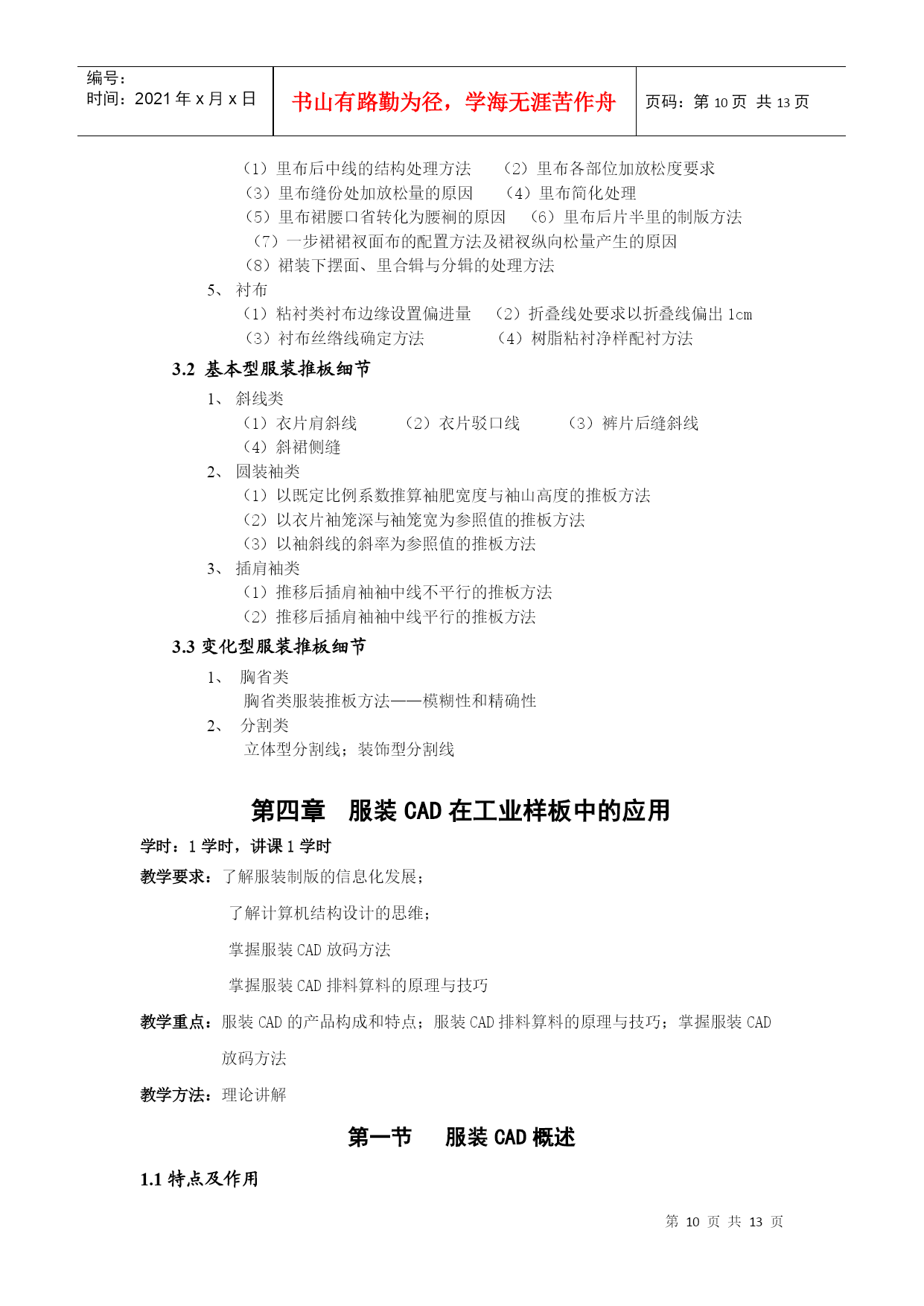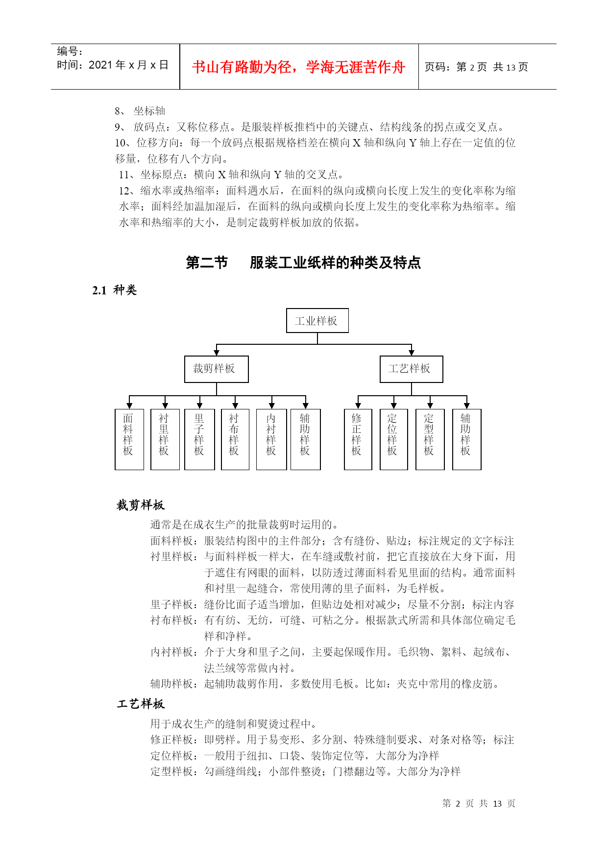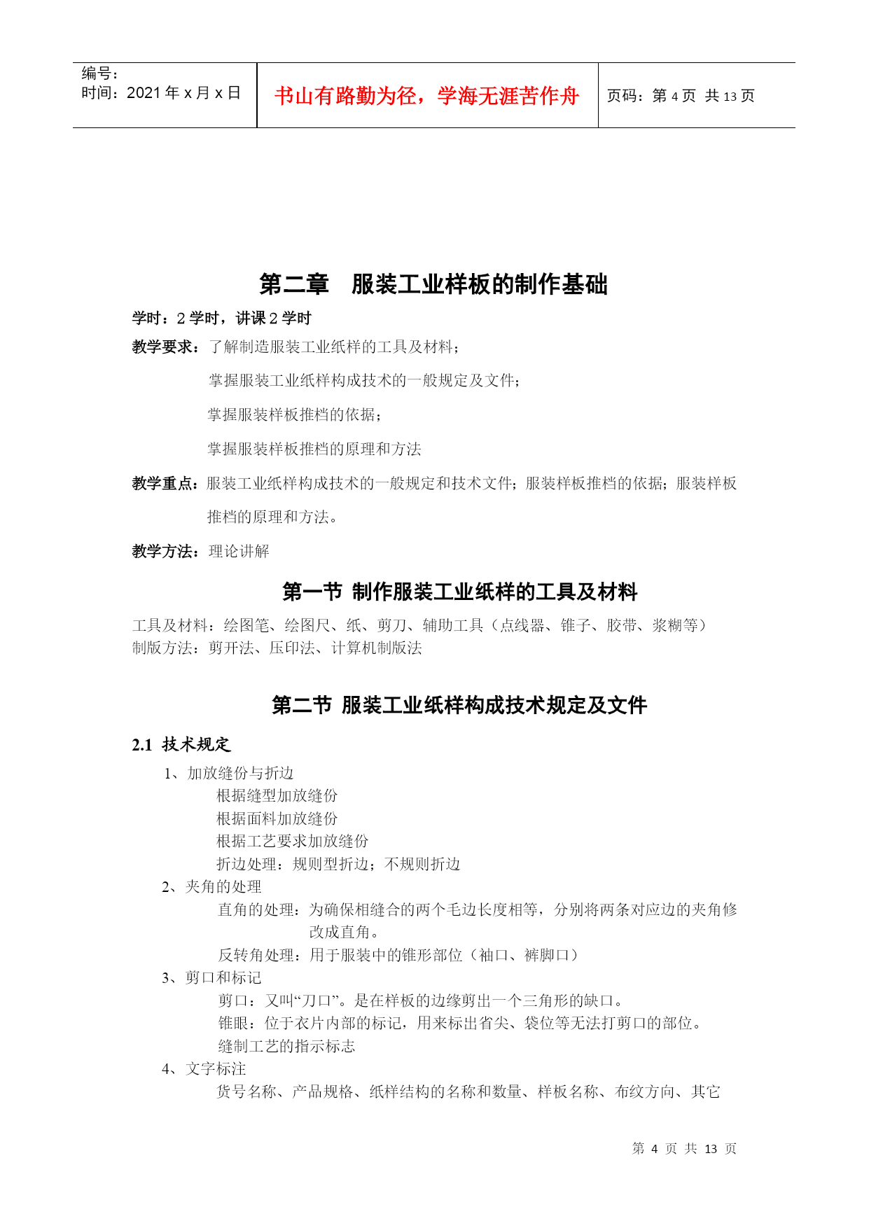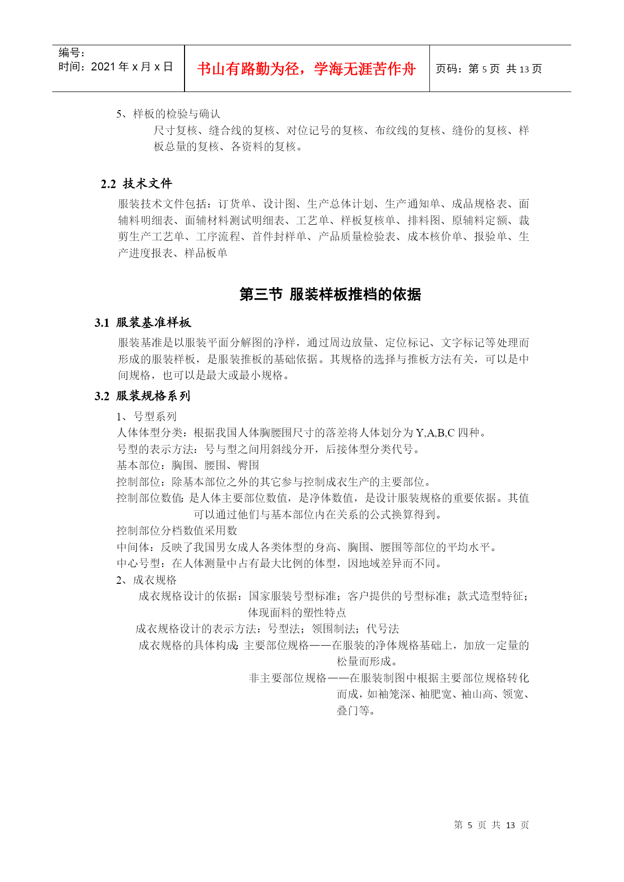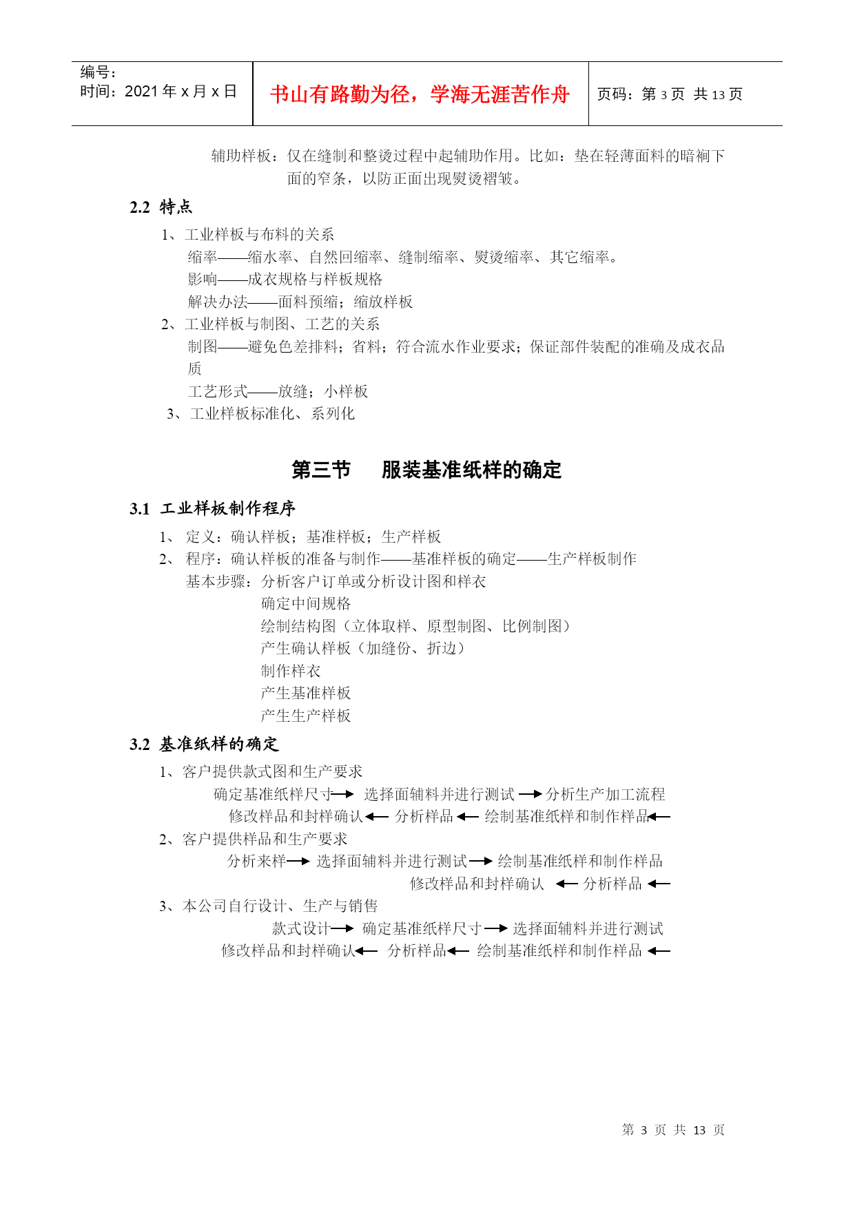 编号:时间:2021年x月x日书山有路勤为径,学海无涯苦作舟页码:第PAGE13页共NUMPAGES13页第PAGE\*MERGEFORMAT13页共NUMPAGES\*MERGEFORMAT13页工业样板设计的概述学时:1学时,讲课1学时教学要求:了解服装工业样板设计相关基本概念与常用术语;掌握服装工业样板的含义、特点、种类、作用;掌握服装基准纸样的确定;教学重点:服装工业样板的种类;服装基准纸样的确定教学方法:理论讲解基本概念和常用术语1.1概念1、服装工业纸样:为服装工业化大生产提供符合款式要求、面料要求、规格尺寸和工艺要求的可用于裁剪、缝制与整理的全套工业纸样(样板)。2、服装工业制版:在服装设计这一个系统工程中,由分解立体形态产生平面制图到加放缝份产生样板的过程。是建立在批量测量人体并加以归纳总结得到的系列数据基础上的裁剪方法,它最大限度地保持群体体态的公共性与差异性的对立统一。结构设计净样板推板毛样板(加缝份和折边)3、服装工业推板:为满足不同消费者的年龄、体型特征、穿衣习惯的不同,同一规格的服装需要制作系列规格或不同号型。工业推板就是以中间规格标准样板为基础,兼顾各个规格或号型系列之间的关系,通过科学计算,正确合理的分配尺寸,绘制出各规格或号型系列的裁剪用样板的方法4、服装工业纸样设计的主要内容:根据款式设计的要求进行基准纸样的确定;根据基准纸样的要求进行成品规格档差的确定;根据成品规格档差的要求进行全套工业纸样的制作;根据不同规格尺寸的数量进行排料和算料1.2常用术语服装样板:是服装工业纸样的简称,也是服装结构样板的简称。是服装工业化大生产用于裁剪、缝制与整理服装的重要技术资料。分为两大类:裁剪样板和工艺样板。缝份:缝制工艺名词,缝份不同其缝份量也不同。常见的缝份形式有分开缝、倒缝、包缝、来去缝、装饰缝、滚边、绷缝等。样板推档服装规格:是制作样板、裁剪、缝纫、销售的重要环节,是决定成衣质量和商品性能的重要依据。规格档差:主要包括成品规格档差(如衣长、胸围、领围、肩宽、袖长等)、各具体部位档差和细部档差(袖笼深、口袋位置等)服装号型国家标准:是净体尺寸。服装号型系列:是确定服装规格和规格档差的科学依据和统一标准。现用GB1335-1991《服装号型》标准。坐标轴放码点:又称位移点。是服装样板推档中的关键点、结构线条的拐点或交叉点。10、位移方向:每一个放码点根据规格档差在横向X轴和纵向Y轴上存在一定值的位移量,位移有八个方向。11、坐标原点:横向X轴和纵向Y轴的交叉点。12、缩水率或热缩率:面料遇水后,在面料的纵向或横向长度上发生的变化率称为缩水率;面料经加温加湿后,在面料的纵向或横向长度上发生的变化率称为热缩率。缩水率和热缩率的大小,是制定裁剪样板加放的依据。服装工业纸样的种类及特点2.1种类工业样板裁剪样板工艺样板面料样板衬里样板里子样板衬布样板内衬样板辅助样板修正样板定位样板定型样板辅助样板裁剪样板通常是在成衣生产的批量裁剪时运用的。面料样板:服装结构图中的主件部分;含有缝份、贴边;标注规定的文字标注衬里样板:与面料样板一样大,在车缝或敷衬前,把它直接放在大身下面,用于遮住有网眼的面料,以防透过薄面料看见里面的结构。通常面料和衬里一起缝合,常使用薄的里子面料,为毛样板。里子样板:缝份比面子适当增加,但贴边处相对减少;尽量不分割;标注内容衬布样板:有有纺、无纺,可缝、可粘之分。根据款式所需和具体部位确定毛样和净样。内衬样板:介于大身和里子之间,主要起保暖作用。毛织物、絮料、起绒布、法兰绒等常做内衬。辅助样板:起辅助裁剪作用,多数使用毛板。比如:夹克中常用的橡皮筋。工艺样板用于成衣生产的缝制和熨烫过程中。修正样板:即劈样。用于易变形、多分割、特殊缝制要求、对条对格等;标注定位样板:一般用于纽扣、口袋、装饰定位等,大部分为净样定型样板:勾画缝缉线;小部件整烫;门襟翻边等。大部分为净样辅助样板:仅在缝制和整烫过程中起辅助作用。比如:垫在轻薄面料的暗裥下面的窄条,以防正面出现熨烫褶皱。2.2特点1、工业样板与布料的关系缩率——缩水率、自然回缩率、缝制缩率、熨烫缩率、其它缩率。影响——成衣规格与样板规格解决办法——面料预缩;缩放样板2、工业样板与制图、工艺的关系制图——避免色差排料;省料;符合流水作业要求;保证部件装配的准确及成衣品质工艺形式——放缝;小样板3、工业样板标准化、系列化服装基准纸样的确定3.1工业样板制作程序定义:确认样板;基准样板;生产样板程序:确认样板的准备与制作——基准样板的确定——生产样板制作基本步骤:分析客户