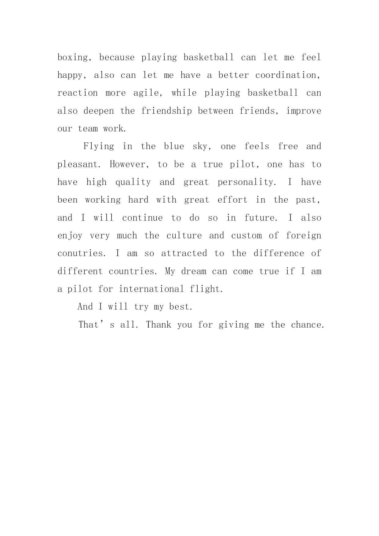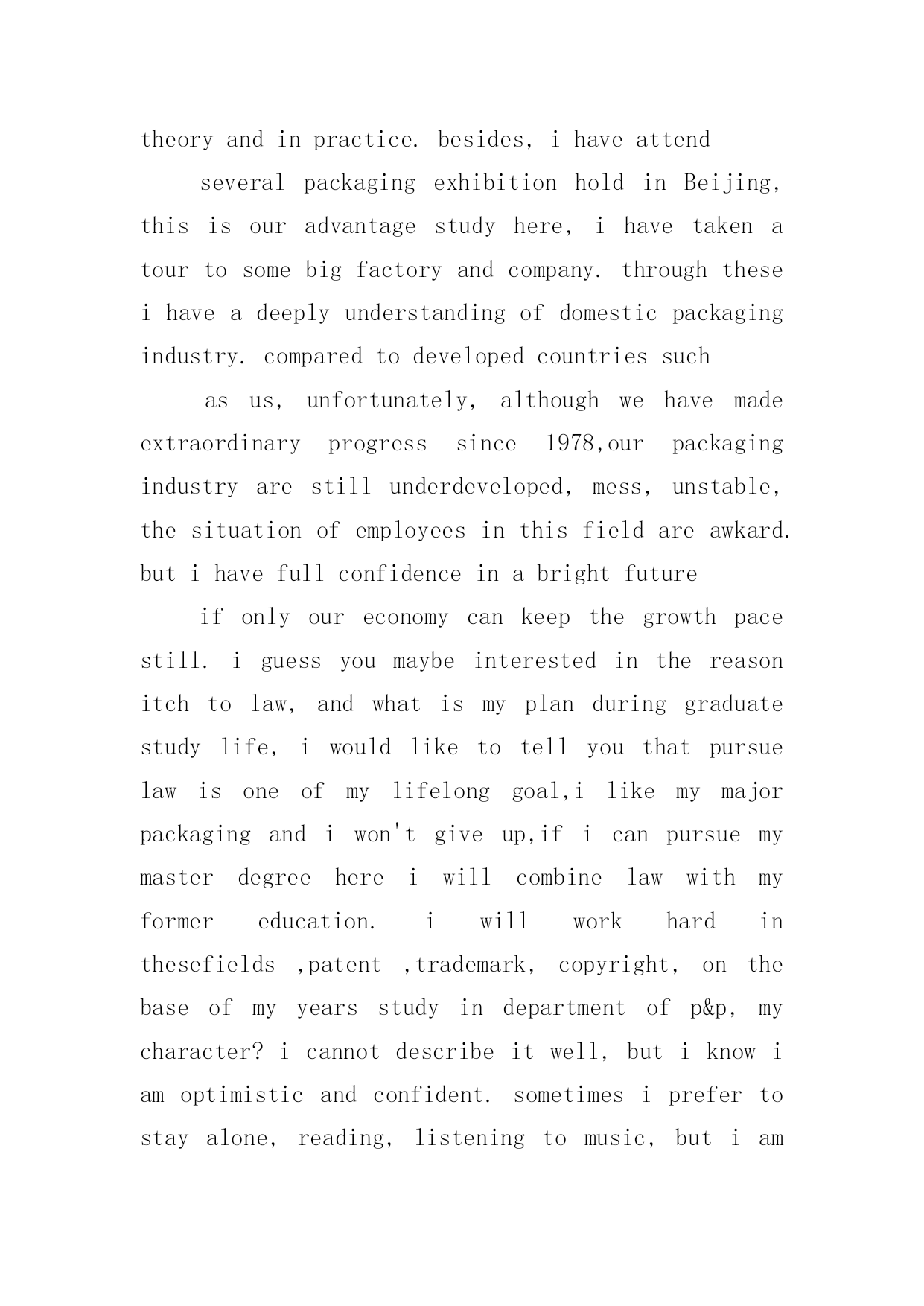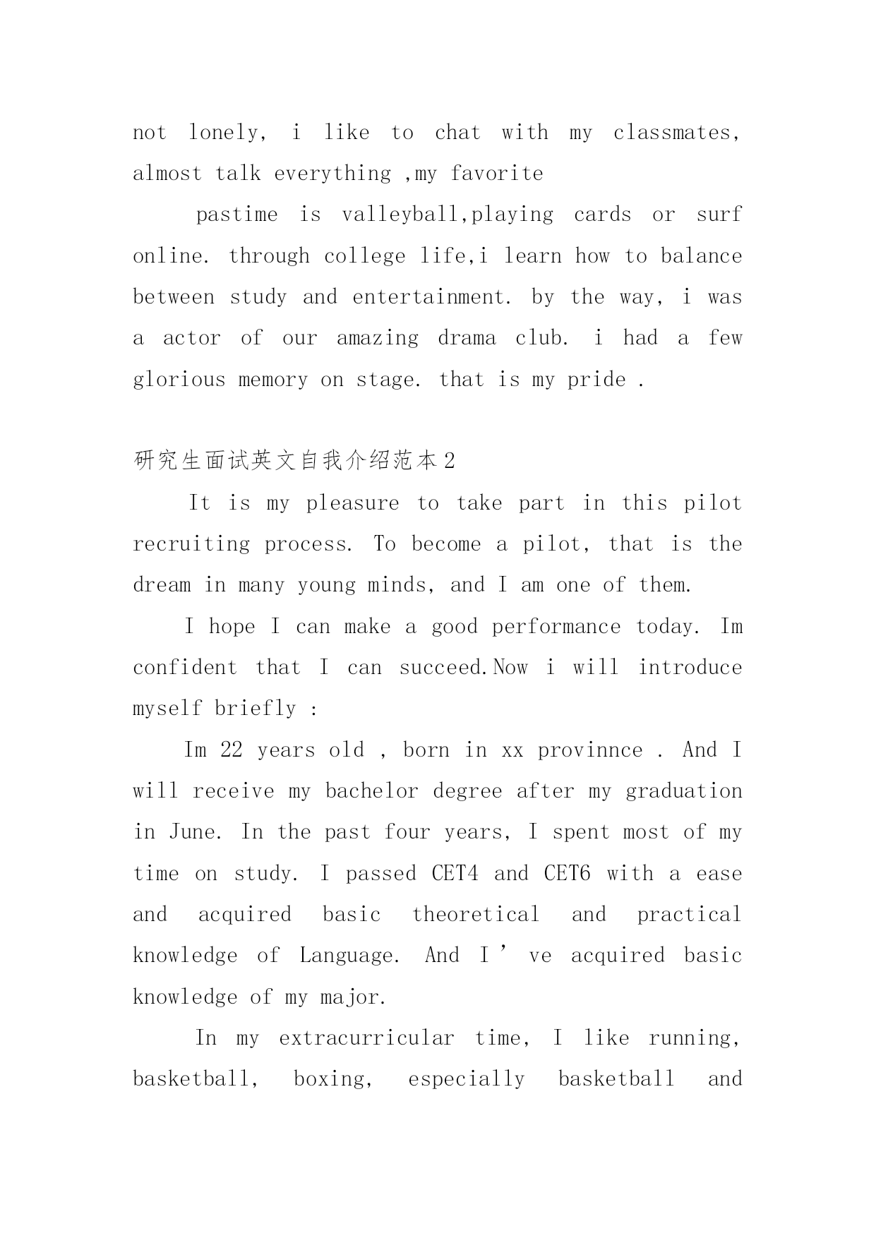 研究生面试英文自我介绍研究生面试英文自我介绍范本当我们在一个新环境中,我们就有可能用到自我介绍,自我介绍是认识自我的手段。那么自我介绍要注意有什么内容呢?下面是小编帮大家整理的研究生面试英文自我介绍范本,希望对大家有所帮助。研究生面试英文自我介绍范本1Goodmorning,mynameisjack,itisreallyagreathonortohavethisopportunityforainterview,iwouldliketoanswerwhateveryoumayraise,andihopeicanmakeagoodperformancetoday,eventuallyenrollinthisprestigiousuniversityinseptember.nowiwillintroducemyselfbriefly,iam21yearsold,borninheilongjiangprovince,northeastofchina,andiamcurruentlyaseniorstudentatbeijingXXuni.mymajorispackagingengineering.andiwillreceivemybachelordegreeaftermygraduationinjune.inthepast4years,ispendmostofmytimeonstudy,ihavepassedCET4/6withaease.andihaveacquiredbasicknowledgeofpackagingandpublishingbothintheoryandinpractice.besides,ihaveattendseveralpackagingexhibitionholdinBeijing,thisisouradvantagestudyhere,ihavetakenatourtosomebigfactoryandcompany.throughtheseihaveadeeplyunderstandingofdomesticpackagingindustry.comparedtodevelopedcountriessuchasus,unfortunately,althoughwehavemadeextraordinaryprogresssince1978,ourpackagingindustryarestillunderdeveloped,mess,unstable,thesituationofemployeesinthisfieldareawkard.butihavefullconfidenceinabrightfutureifonlyoureconomycankeepthegrowthpacestill.iguessyoumaybeinterestedinthereasonitchtolaw,andwhatismyplanduringgraduatestudylife,iwouldliketotellyouthatpursuelawisoneofmylifelonggoal,ilikemymajorpackagingandiwon'tgiveup,ificanpursuemymasterdegreehereiwillcombinelawwithmyformereducation.iwillworkhardinthesefields,patent,trademark,copyright,onthebaseofmyyearsstudyindepartmentofp&p,mycharacter?icannotdescribeitwell,butiknowiamoptimisticandconfident.sometimesiprefertostayalone,reading,listeningtomusic,butiamnotlonely,iliketochatwithmyclassmates,almosttalkeverything,myfavoritepastimeisvalleyball,playingcardsorsurfonline.throughcollegelife,ilearnhowtobalancebetweenstudyandentertainment.bytheway,iwasaactorofouramazingdramaclub.ihadafewgloriousmemoryonstage.thatismypride.研究生面试英文自我介绍范本2Itismypleasuretotakepartinthispilotrecruitingprocess.Tobecomeapilot,thatist