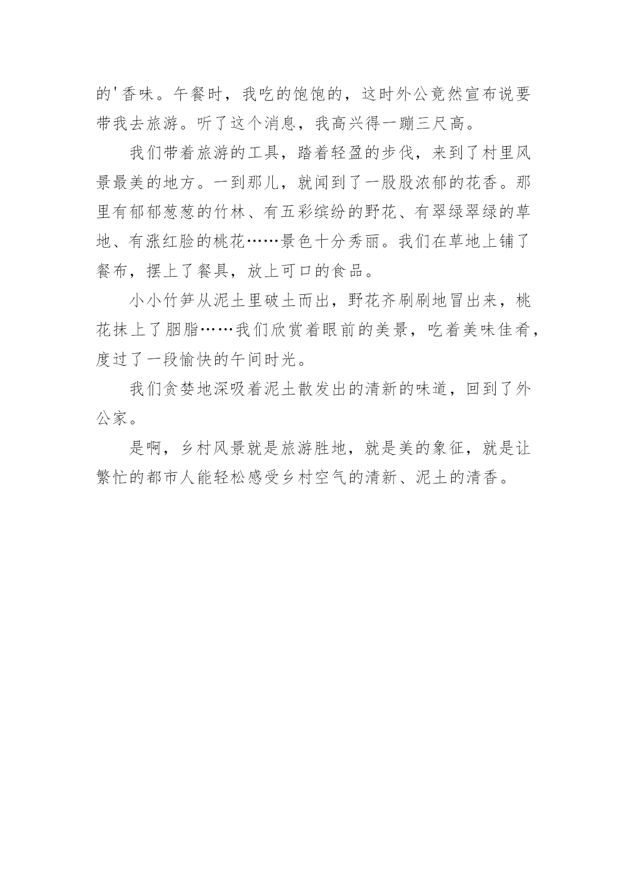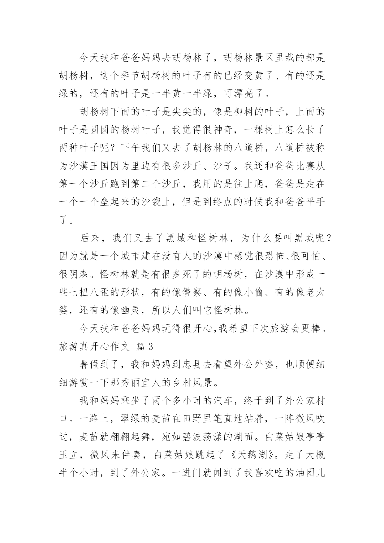 旅游真开心作文旅游真开心作文三篇在平日的学习、工作和生活里,大家都有写作文的经历,对作文很是熟悉吧,作文一定要做到主题集中,围绕同一主题作深入阐述,切忌东拉西扯,主题涣散甚至无主题。一篇什么样的作文才能称之为优秀作文呢?下面是小编为大家收集的旅游真开心作文3篇,仅供参考,大家一起来看看吧。旅游真开心作文篇1今年暑假,我跟妈妈学了一些成语,有动物的、天气的、颜色的、人物的……一天,我们去旅游。在山脚下,有两个人在悄俏说话,我对妈妈说:“妈妈,那两个人在串通一气,想谋杀人。”妈妈笑了笑。过了没一回儿,爸爸打开收音机,那时的节目是《我爱唱》,有一个人在唱歌,唱得可难听了,我捂住耳朵,说:“快点关掉收音机,在关不掉,我就要火冒三丈,狗急跳墙了啊!”全家人大笑。后来,爸爸妈妈见我总是乱用成语,就举行了一次成语比赛,我PK爸爸。爸爸说:“这个人长的肥头大耳。”我说:“还有个人长的虎头蛇尾。”全家笑翻了天。学习成语真开心,不仅能学到不少知识,还能让我们有很多乐趣,我爱学成语!旅游真开心作文篇2今天我和爸爸妈妈去胡杨林了,胡杨林景区里栽的都是胡杨树,这个季节胡杨树的叶子有的已经变黄了、有的还是绿的,还有的叶子是一半黄一半绿,可漂亮了。胡杨树下面的叶子是尖尖的,像是柳树的叶子,上面的叶子是圆圆的杨树叶子,我觉得很神奇,一棵树上怎么长了两种叶子呢?下午我们又去了胡杨林的八道桥,八道桥被称为沙漠王国因为里边有很多沙丘、沙子。我还和爸爸比赛从第一个沙丘跑到第二个沙丘,我用的是往上爬,爸爸是走在一个一个垒起来的沙袋上,但是到终点的时候我和爸爸平手了。后来,我们又去了黑城和怪树林,为什么要叫黑城呢?因为就是一个城市建在没有人的沙漠中感觉很恐怖、很可怕、很阴森。怪树林就是有很多死了的胡杨树,在沙漠中形成一些七扭八歪的形状,有的像警察、有的像小偷、有的像老太婆,还有的像幽灵,所以人们叫它怪树林。今天我和爸爸妈妈玩得很开心,我希望下次旅游会更棒。旅游真开心作文篇3暑假到了,我和妈妈到忠县去看望外公外婆,也顺便细细游赏一下那秀丽宜人的乡村风景。我和妈妈乘坐了两个多小时的汽车,终于到了外公家村口。一路上,翠绿的麦苗在田野里笔直地站着,一阵微风吹过,麦苗就翩翩起舞,宛如碧波荡漾的湖面。白菜姑娘亭亭玉立,微风来伴奏,白菜姑娘跳起了《天鹅湖》。走了大概半个小时,到了外公家。一进门就闻到了我喜欢吃的油团儿的'香味。午餐时,我吃的饱饱的,这时外公竟然宣布说要带我去旅游。听了这个消息,我高兴得一蹦三尺高。我们带着旅游的工具,踏着轻盈的步伐,来到了村里风景最美的地方。一到那儿,就闻到了一股股浓郁的花香。那里有郁郁葱葱的竹林、有五彩缤纷的野花、有翠绿翠绿的草地、有涨红脸的桃花……景色十分秀丽。我们在草地上铺了餐布,摆上了餐具,放上可口的食品。小小竹笋从泥土里破土而出,野花齐刷刷地冒出来,桃花抹上了胭脂……我们欣赏着眼前的美景,吃着美味佳肴,度过了一段愉快的午间时光。我们贪婪地深吸着泥土散发出的清新的味道,回到了外公家。是啊,乡村风景就是旅游胜地,就是美的象征,就是让繁忙的都市人能轻松感受乡村空气的清新、泥土的清香。