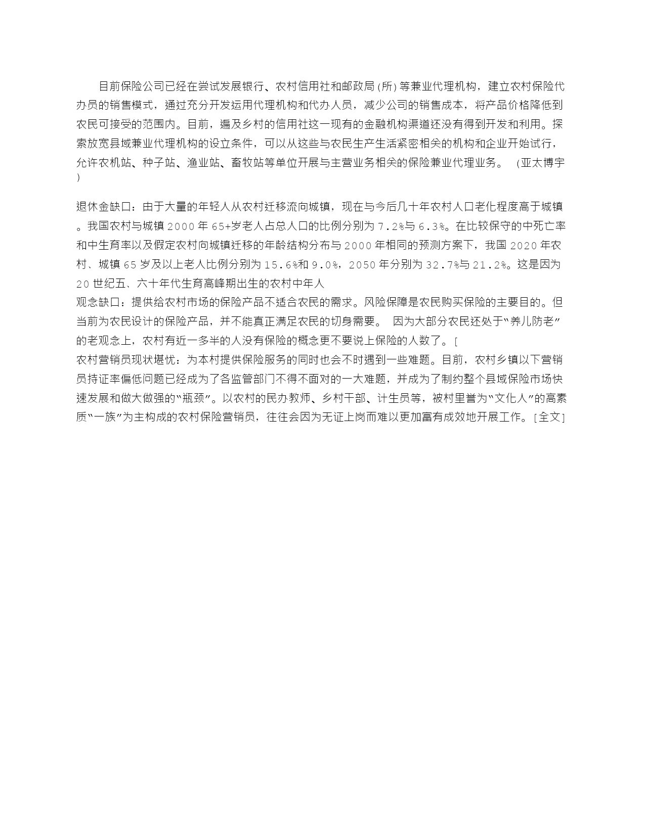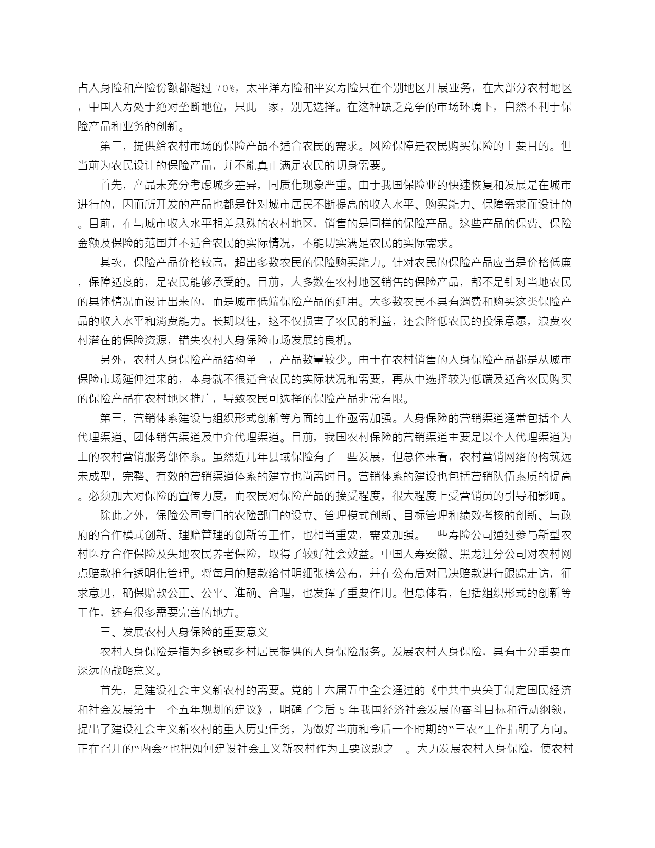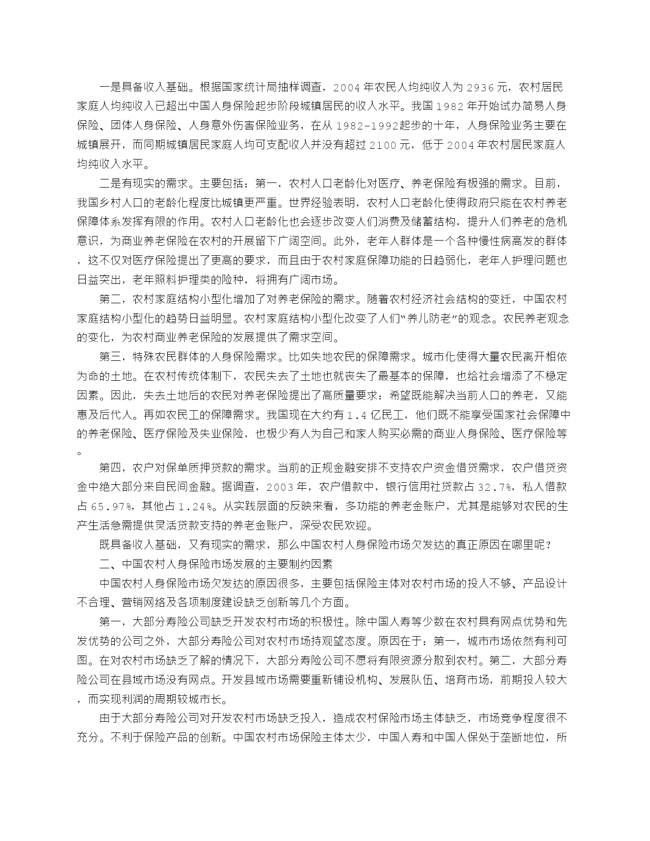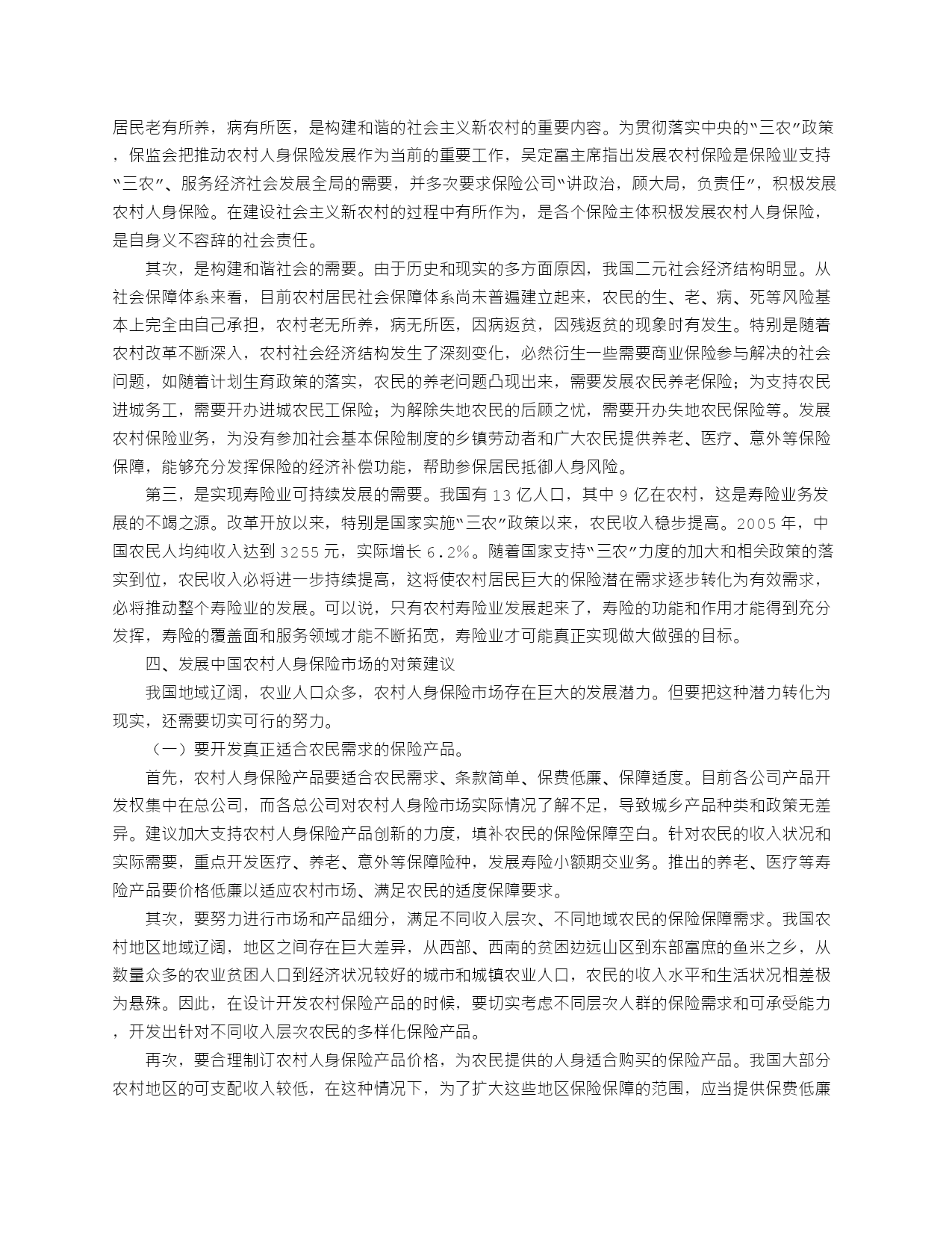 是一个农业大国,农村人口占全国总人口的71%。老有所养一直是广大农村群众梦寐以求的愿望,也是政府十分关心的重要问题。为适应农村经济发展,抵御人口老龄化所带来的家庭养老负担,我国从80年代中期就开始调查研究农村养老的新情况、新问题,积极探索市场经济条件下农村社会养老保障的新途径。从现有农业保险试点情况看,农村、农民和农业确实很需要保险。在建设社会主义新农村发展战略中,保险业应有所作为,甚至是大有作为。但由于种种原因,中国农村保险市场发育程度很低。如何采取切实措施,促进农村保险市场发展,发挥保险在社会主义新农村建设中的积极作用,成为摆在中国保险业面前的一个重大战略问题。中国至今缺乏对农村保险市场较完整的统计口径和统计数据,仅能借助县域保险发展情况,来反映农村保险市场的状况。据初步统计,2004年,全国县域保费收入1321.5亿元,占全国总保费收入的30.6%;其中,县域人身险保费收入958.74亿元,占全国人身险保费收入的29.7%。以上数据表明,中国的农村人身保险市场还极不发达。市场缺口:大部分寿险公司缺乏开发农村市场的积极性。除中国人寿等少数在农村具有网点优势和先发优势的公司之外,大部分寿险公司对农村市场持观望态度。由于大部分寿险公司对开发农村市场缺乏投入,造成农村保险市场主体缺乏,市场竞争程度很不充分。[全文]农村人身保险在新农村建设中大有可为2006-03-2017:57文章来源:文章类型:原创内容分类:新闻在十届全国人大四次会议上,保监会主席吴定富强调,保险业在服务“三农”方面做了有益探索,但保险在农村普及不够。从现有农业保险试点情况看,农村、农民和农业确实很需要保险。在建设社会主义新农村发展战略中,保险业应有所作为,甚至是大有作为。但由于种种原因,中国农村保险市场发育程度很低。如何采取切实措施,促进农村保险市场发展,发挥保险在社会主义新农村建设中的积极作用,成为摆在中国保险业面前的一个重大战略问题。当前,为构建和谐社会,建设社会主义新农村,中央高度重视“三农”问题,把解决好“三农”问题作为全党工作的重中之重。积极发展农村人身保险,为农村居民提供人身保障,是服务“三农”,促进社会和谐稳定非常重要的方面。中国保险市场只有吸引8亿农民参与,惠及8亿农民,才能够充分发挥保险在国民经济中的作用。一、中国农村人身保险市场的现状由于中国至今缺乏对农村保险市场较完整的统计口径和统计数据,仅能借助县域保险发展情况,来反映农村保险市场的状况。据初步统计,2004年,全国县域保费收入1321.5亿元,占全国总保费收入的30.6%;其中,县域人身险保费收入958.74亿元,占全国人身险保费收入的29.7%。以上数据表明,中国的农村人身保险市场还极不发达。但中国农村人身保险市场的发展实际上有其现实的基础。一是具备收入基础。根据国家统计局抽样调查,2004年农民人均纯收入为2936元,农村居民家庭人均纯收入已超出中国人身保险起步阶段城镇居民的收入水平。我国1982年开始试办简易人身保险、团体人身保险、人身意外伤害保险业务,在从1982-1992起步的十年,人身保险业务主要在城镇展开,而同期城镇居民家庭人均可支配收入并没有超过2100元,低于2004年农村居民家庭人均纯收入水平。二是有现实的需求。主要包括:第一,农村人口老龄化对医疗、养老保险有极强的需求。目前,我国乡村人口的老龄化程度比城镇更严重。世界经验表明,农村人口老龄化使得政府只能在农村养老保障体系发挥有限的作用。农村人口老龄化也会逐步改变人们消费及储蓄结构,提升人们养老的危机意识,为商业养老保险在农村的开展留下广阔空间。此外,老年人群体是一个各种慢性病高发的群体,这不仅对医疗保险提出了更高的要求,而且由于农村家庭保障功能的日趋弱化,老年人护理问题也日益突出,老年照料护理类的险种,将拥有广阔市场。第二,农村家庭结构小型化增加了对养老保险的需求。随着农村经济社会结构的变迁,中国农村家庭结构小型化的趋势日益明显。农村家庭结构小型化改变了人们“养儿防老”的观念。农民养老观念的变化,为农村商业养老保险的发展提供了需求空间。第三,特殊农民群体的人身保险需求。比如失地农民的保障需求。城市化使得大量农民离开相依为命的土地。在农村传统体制下,农民失去了土地也就丧失了最基本的保障,也给社会增添了不稳定因素。因此,失去土地后的农民对养老保险提出了高质量要求:希望既能解决当前人口的养老,又能惠及后代人。再如农民工的保障需求。我国现在大约有1.4亿民工,他们既不能享受国家社会保障中的养老保险、医疗保险及失业保险,也极少有人为自己和家人购买必需的商业人身保险、医疗保险等。第四,农户对保单质押贷款的需求。当前的正规金融安排不支持农户资金借贷需求,农户借贷资金中绝大部分来自民间金融