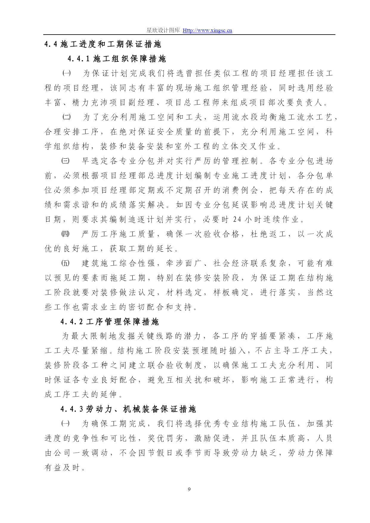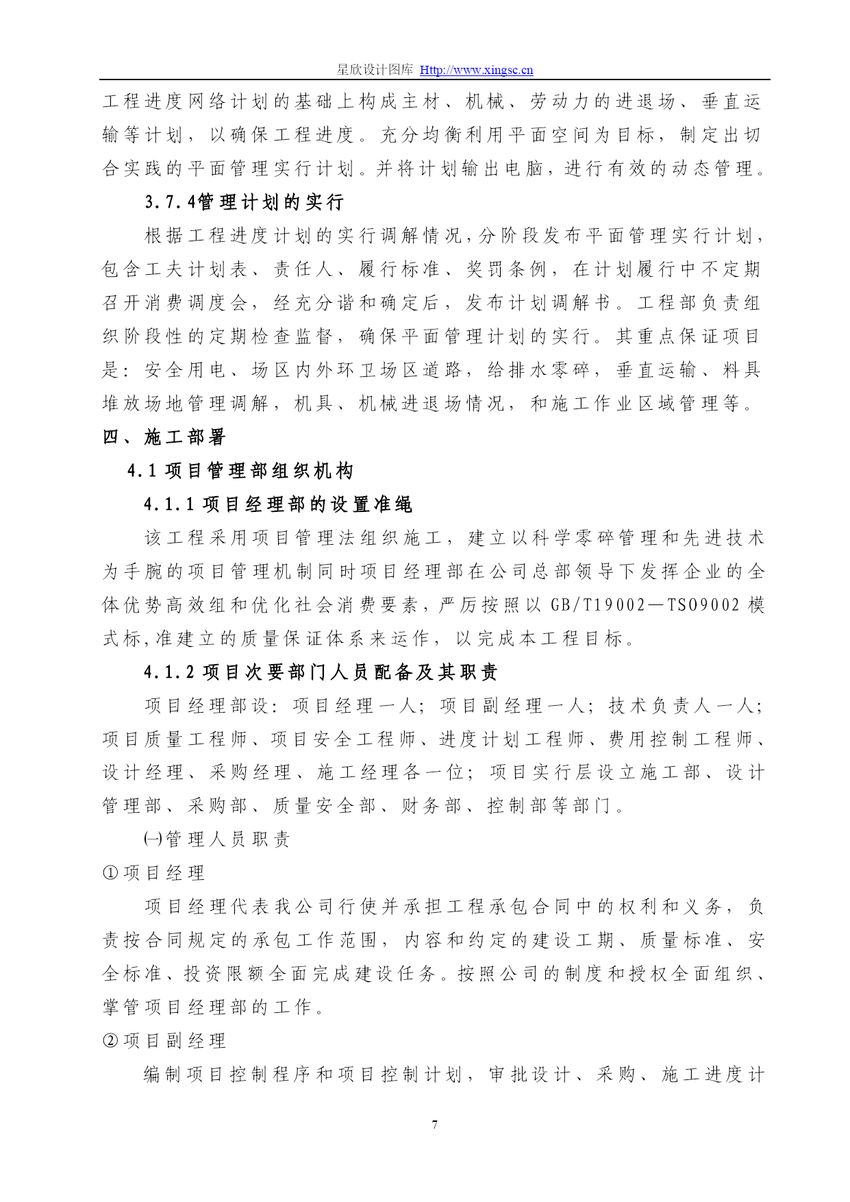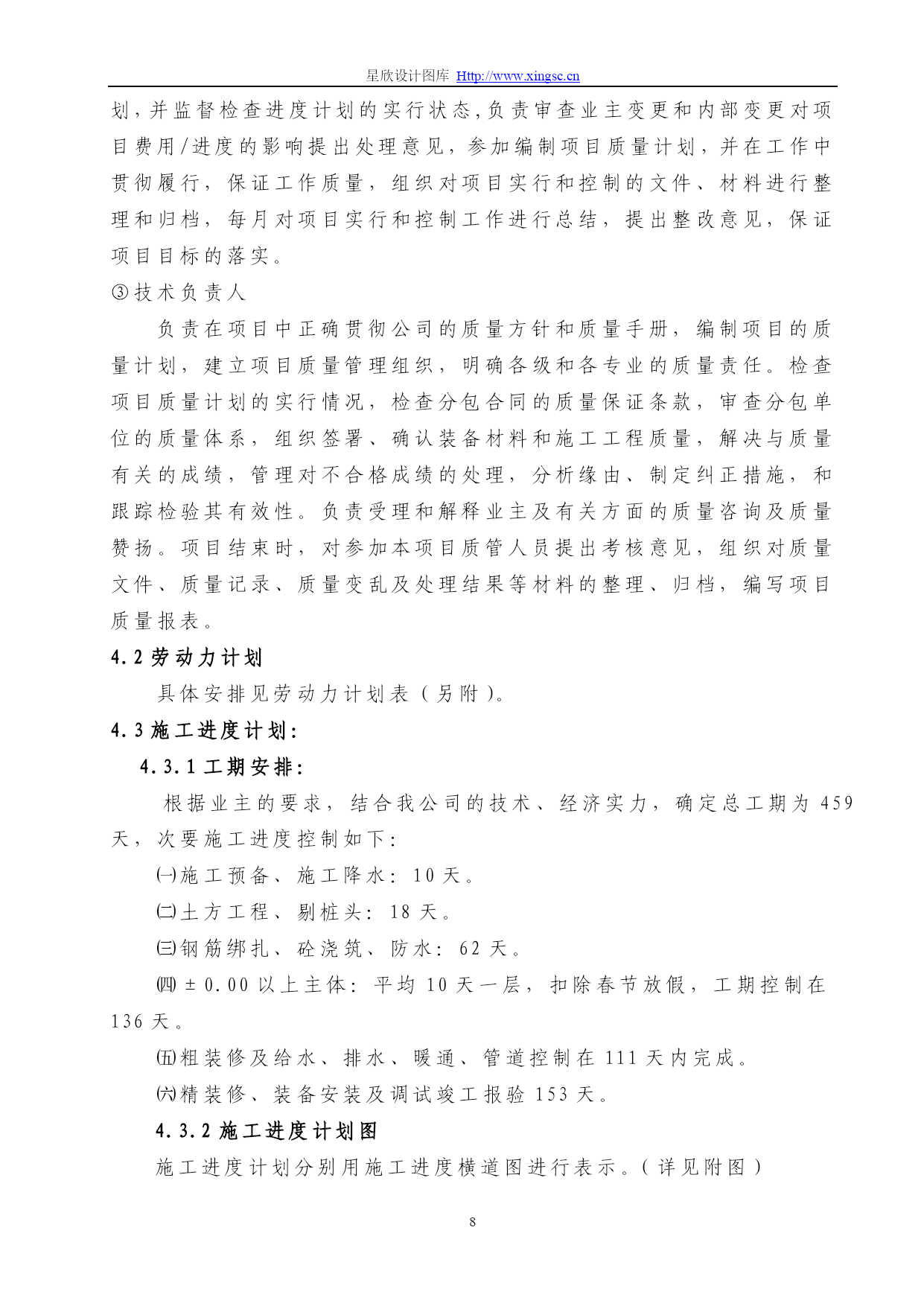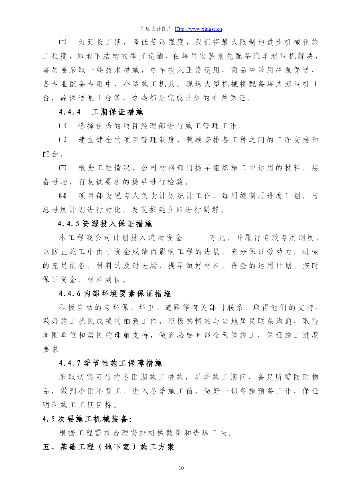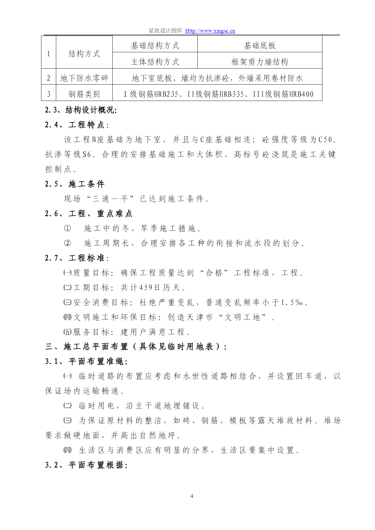 星欣设计图库HYPERLINK"Http://www.xingsc.cn"Http://www.xingsc.cnPAGEPAGE83一、编制根据:1.1设计图纸及工程招招标文件1、*******二标段图纸1.2国家及地方有关标准规范规程2、高层建筑向行与筏行基础技术规范JCJ6-993、建筑地基处理技术规范JGJ79-914、建筑桩基技术规范JGJ94-945、建筑基坑支护技术规程JGJ120-996、钢筋混凝土承台设计规程CECS88:977、岩土工程技术规范DB29―20―20008、普通混凝土拌合物功能实验方法GBJ80―859、普通混凝土长工夫功能和耐久功能实验方法GBJ82―8510、混凝土强度检验评定标准GBJ107―8711、地下工程防水工程质量验收规范GB50208―200212、混凝土外加剂运用技术规范GBJ119―8813、人防工程施工及验收规范GBJ134―9014、粉煤灰混凝土运用技术规范GBJ46―9015、混凝土结构实验方法标准GB50152―9216、混凝土质量控制标准GB50164―9217、砌体工程施工及验收规范GB50203―200218、混凝土结构工程施工及验收规范GB50204―200219、屋面工程质量验收规范GB50207―200220、建筑地面工程施工及验收规范GB50209―200221、建筑防腐蚀工程施工及验收规范GB50212―9122、机械装备安装工程施工及验收通用规范GB50231―9823、透风与空调工程施工质量验收规范GB50243―200224、砌体工程现场检测技术标准GB/T50315―200025、混凝土泵送施工技术规范JGJ/T10―9526、钢筋焊接及验收规程JGJ18―200327、冷拔钢丝预应力混构件设计与施工规程JGJ19―9228、回弹法检测混凝土抗压强度技术规程JGJ/T23―9229、钢筋焊接接头实验方法JGJ27―8630、建筑装璜工程施工及验收规范JGJ73―9131、建筑砂浆配合比设计规程JGJ98―200032、铝合金门窗安装及验收规程JGJ103―9633、建筑工程冬期施工规程JGJ104―9734、机械喷抹灰施工规程JGJ/T105―9635、钢筋机械连接通用技术规程JGJ107―9636、钢筋锥螺纹接头技术规程JGJ109―9637、外墙饰面工程施工及验收JGJ126―200038、超声回弹综合法检测混凝土强度技术规程CECS02:8839、钻芯法检测混凝土强度技术规程CECS03:8840、超声法检测混凝土缺陷技术规程CECS21:200041、柔毡屋面防水工程技术规程CECS29:9142、混凝土及预制混凝土构件质量控制规程CECS40:9243、加强氯化聚乙烯橡胶卷材防水工程技术规程CECS63:9444、住宅装璜装修工程施工规范GB50327―200145、建筑给水排水采暖工程施工质量验收规范GB50242―200246、透风与空调工程施工及验收规范GB50243―200247、建筑电气工程施工质量验收规范GB50303―200248、民用建筑工程室内环境净化控制规范GB50325―200149、施工现场临时用电技术规范JGJ46―8850、建筑施工高处作业安全技术规范JGJ80―9151、建筑机械运用安全技术规程JGJ33―200152、建筑施工扣伴式钢管脚手架安全技术规范JGJ130―200153、建筑施工安全检查标准JGJ59―99二、综合阐明:2.1、工程全体概述:序号项目内容1工程名称2工程地点3建设单位4设计单位2.2、建筑设计概况:建筑面积27619.71平方米建筑用途办公用房AB座地下层数一层用途装备层A座地高层数五层用途办公用房B座地高层数十二层用途办公用房建筑物高度A座23.7m,B座49.65m±0.00标高相当于大沽标高4.2米室内外高差0.6米抗震裂度:7度防火等级:地下一级地上二级外檐装修施工干挂石材内檐装修施工立墙:水泥砂浆墙面、抹灰墙面、釉面砖墙面楼地面:花岗岩楼地面、地砖楼地面、水泥砂浆楼地面顶棚:抹灰顶棚踢脚:水泥砂浆踢脚、花岗岩踢脚内内部门窗铝合金窗、铝合金门、实木门屋面高分子卷材合成高分子涂膜,刚性防水合成高分子卷材序号项目内容1结构方式基础结构方式基础底板主体结构方式框架剪力墙结构2地下防水零碎地下室底板、墙均为抗渗砼,外墙采用卷材防水3钢筋类别Ⅰ级钢筋HRB235、II级钢筋HRB335、III级钢筋HRB4002.3、结构设计概况:2.4、工程特点:该工程B座基础为地下室,并且与C座基础相连;砼强度等级为C50。抗渗等