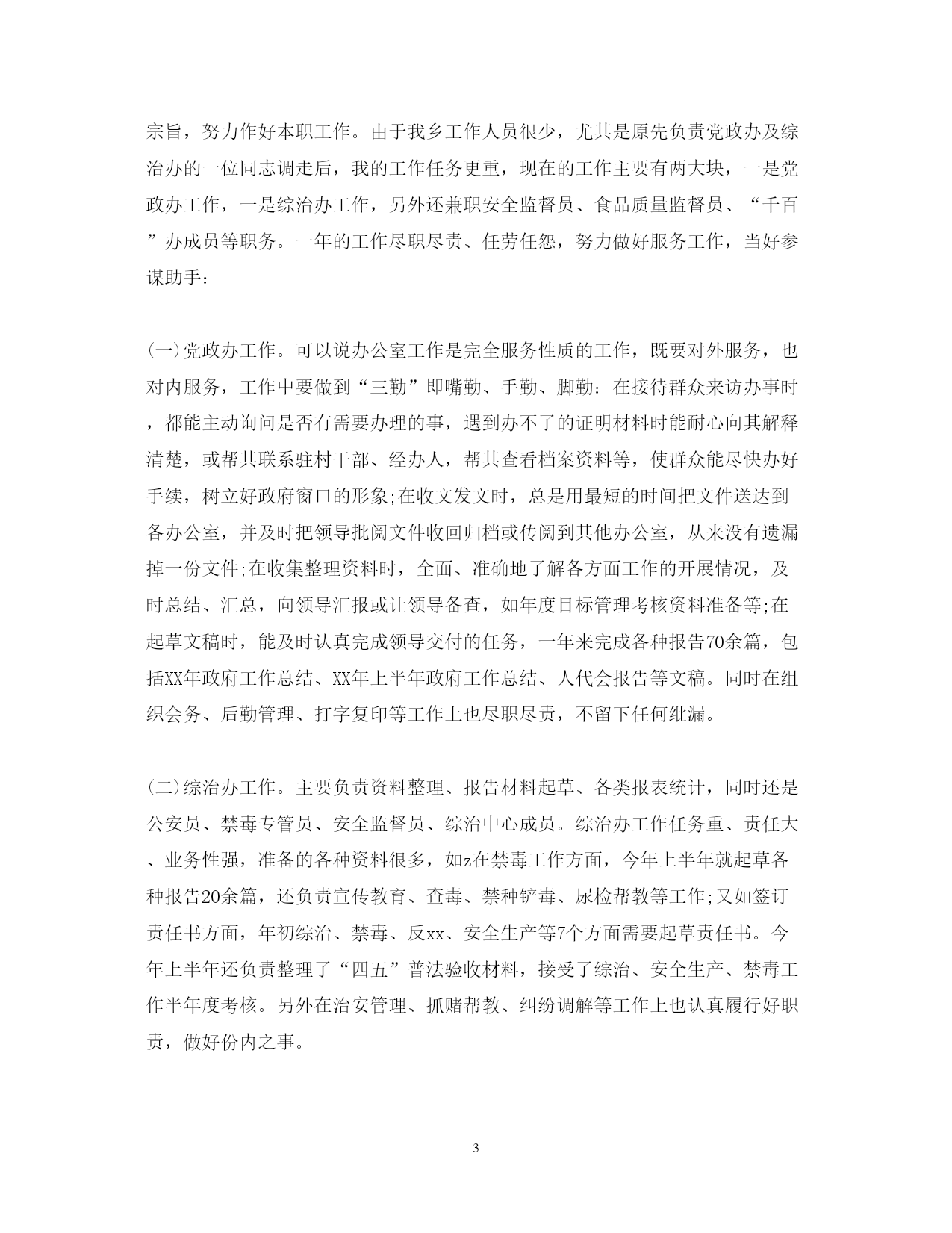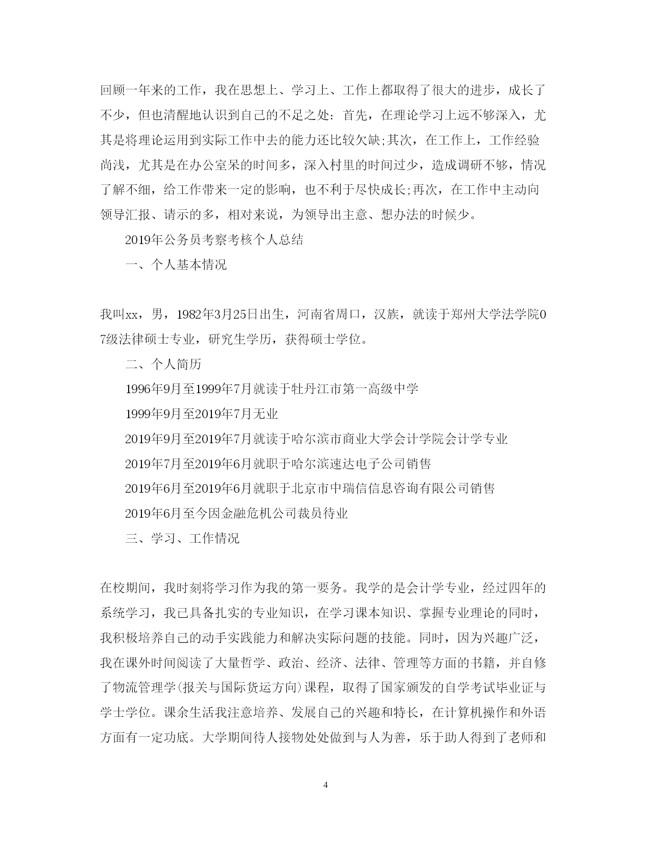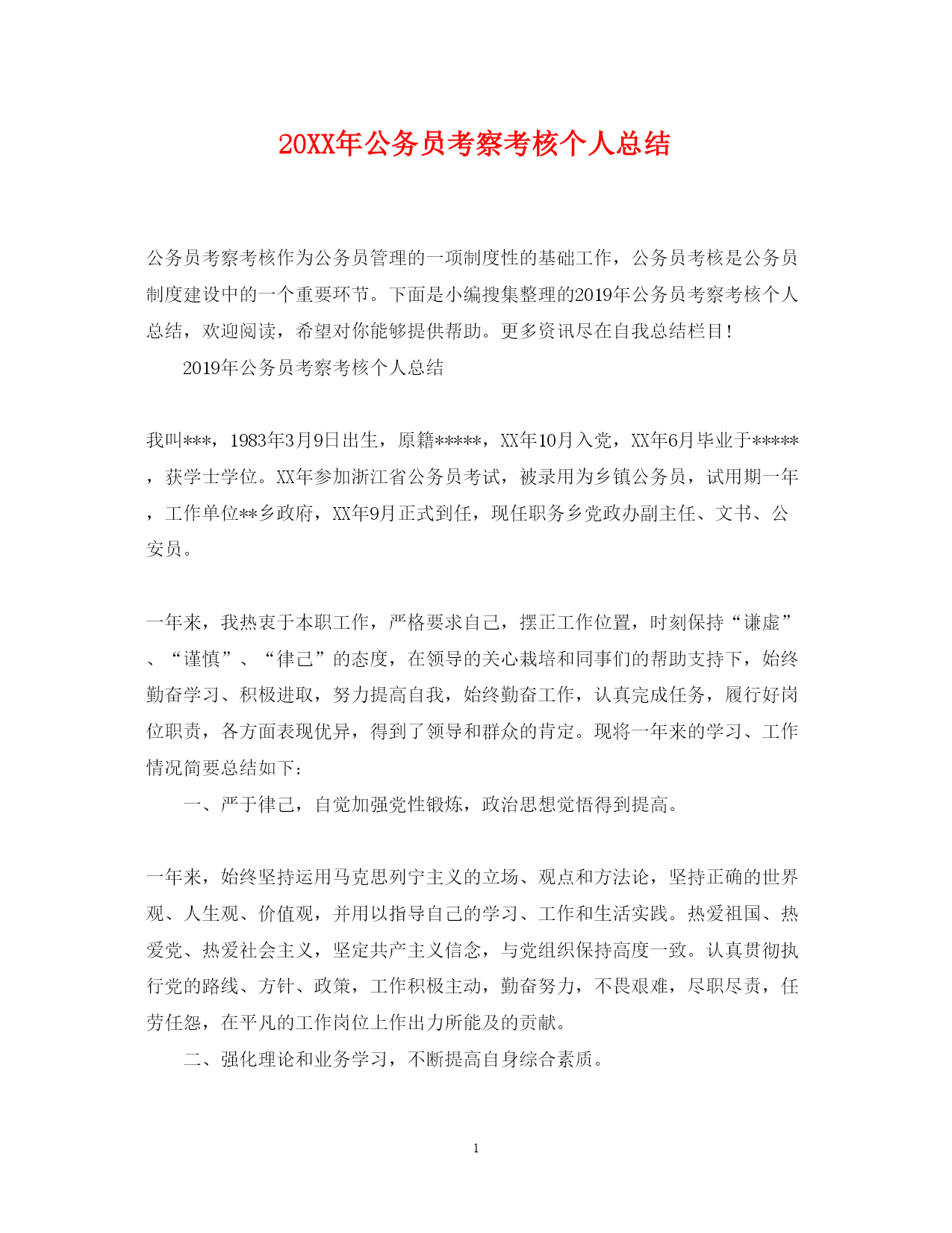 此资料由网络收集而来,如有侵权请告知上传者立即删除。资料共分享,我们负责传递知识。PAGEPAGE620XX年公务员考察考核个人总结公务员考察考核作为公务员管理的一项制度性的基础工作,公务员考核是公务员制度建设中的一个重要环节。下面是小编搜集整理的2019年公务员考察考核个人总结,欢迎阅读,希望对你能够提供帮助。更多资讯尽在自我总结栏目!2019年公务员考察考核个人总结我叫***,1983年3月9日出生,原籍*****,XX年10月入党,XX年6月毕业于*****,获学士学位。XX年参加浙江省公务员考试,被录用为乡镇公务员,试用期一年,工作单位**乡政府,XX年9月正式到任,现任职务乡党政办副主任、文书、公安员。一年来,我热衷于本职工作,严格要求自己,摆正工作位置,时刻保持“谦虚”、“谨慎”、“律己”的态度,在领导的关心栽培和同事们的帮助支持下,始终勤奋学习、积极进取,努力提高自我,始终勤奋工作,认真完成任务,履行好岗位职责,各方面表现优异,得到了领导和群众的肯定。现将一年来的学习、工作情况简要总结如下:一、严于律己,自觉加强党性锻炼,政治思想觉悟得到提高。一年来,始终坚持运用马克思列宁主义的立场、观点和方法论,坚持正确的世界观、人生观、价值观,并用以指导自己的学习、工作和生活实践。热爱祖国、热爱党、热爱社会主义,坚定共产主义信念,与党组织保持高度一致。认真贯彻执行党的路线、方针、政策,工作积极主动,勤奋努力,不畏艰难,尽职尽责,任劳任怨,在平凡的工作岗位上作出力所能及的贡献。二、强化理论和业务学习,不断提高自身综合素质。作为一名刚踏入社会的大学毕业生,我清醒地看到人生舞台已发生转变,自己又缺乏工作经验,所以只有不断加强学习,积累充实自我,才能锻炼好为人民服务的本领。这一年来,始终坚持一边工作一边学习,不断提高了自身综合素质水平。一是认真学习“三个代表”重要思想,深刻领会其科学内涵,认真学习党的xx大报告及xx届三中、四中全会精神。尤其是在今年七月开始的第二批保持共产党员先进性教育活动中,认真系统地学习了党的基本知识和各种理论著作,进一步夯实了理论基础,提高了党性认识和思想道德素质。二是认真学习业务知识,始终保持虚心好学的态度对待业务知识的学习。一年来,在指导老师潘乡长的带领下,走村入户,参加村民代表会议、座谈会等各种会议,到生产、建筑实地考察,学习了许多农村工作方法,更是直接与群众直接接触,真正做到深入到群众中去。平时,多看、多问、多想,主动向领导、向群众请教问题,机关学习会、各种工作会议都是我学习的好机会。此外,认真参加各类培训,一年来参加了公务员初任培训、禁毒尿检培训、电子政务培训,均以优异的成绩通过考核,熟练掌握了业务技能。业务知识的学习使我在工作上迅速成长起来。三是认真学习法律知识。作为文书负责办理各种各样的证明,另外作为公安员,更是直接涉及到许多法律法规的运用问题。结合自己的工作实际特点,利用业余时间,自觉加强了对法律法规知识的学习,比如计划生育、婚姻家庭、出入境管理、户籍管理、治安管理、禁毒工作细则等法律法规的学习。进一步增强了法律意识和法律观念。三、努力工作,认真完成工作任务。一年来,我始终坚持严格要求自己,勤奋努力,时刻牢记全心全意为人民服务的宗旨,努力作好本职工作。由于我乡工作人员很少,尤其是原先负责党政办及综治办的一位同志调走后,我的工作任务更重,现在的工作主要有两大块,一是党政办工作,一是综治办工作,另外还兼职安全监督员、食品质量监督员、“千百”办成员等职务。一年的工作尽职尽责、任劳任怨,努力做好服务工作,当好参谋助手:(一)党政办工作。可以说办公室工作是完全服务性质的工作,既要对外服务,也对内服务,工作中要做到“三勤”即嘴勤、手勤、脚勤:在接待群众来访办事时,都能主动询问是否有需要办理的事,遇到办不了的证明材料时能耐心向其解释清楚,或帮其联系驻村干部、经办人,帮其查看档案资料等,使群众能尽快办好手续,树立好政府窗口的形象;在收文发文时,总是用最短的时间把文件送达到各办公室,并及时把领导批阅文件收回归档或传阅到其他办公室,从来没有遗漏掉一份文件;在收集整理资料时,全面、准确地了解各方面工作的开展情况,及时总结、汇总,向领导汇报或让领导备查,如年度目标管理考核资料准备等;在起草文稿时,能及时认真完成领导交付的任务,一年来完成各种报告70余篇,包括XX年政府工作总结、XX年上半年政府工作总结、人代会报告等文稿。同时在组织会务、后勤管理、打字复印等工作上也尽职尽责,不留下任何纰漏。(二)综治办工作。主要负责资料整理、报告材料起草、各类报表统计,同时还是公安员、禁毒专管员、安全监督员、综治中心成员。综治办工作任务重、责任大、业务性强,准备的各种资料很多,如z