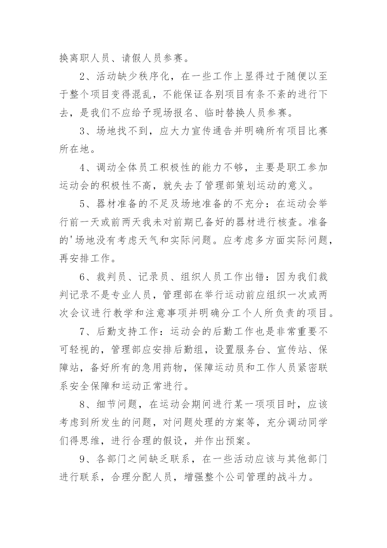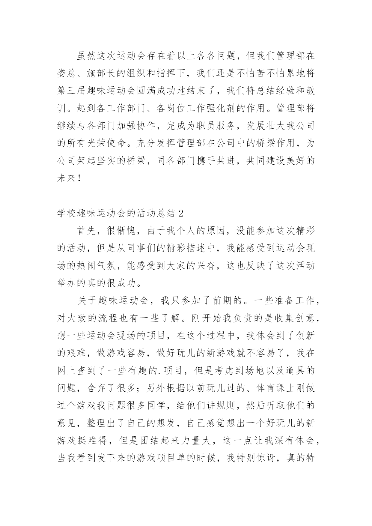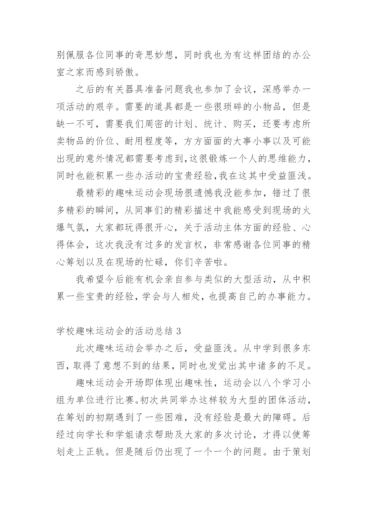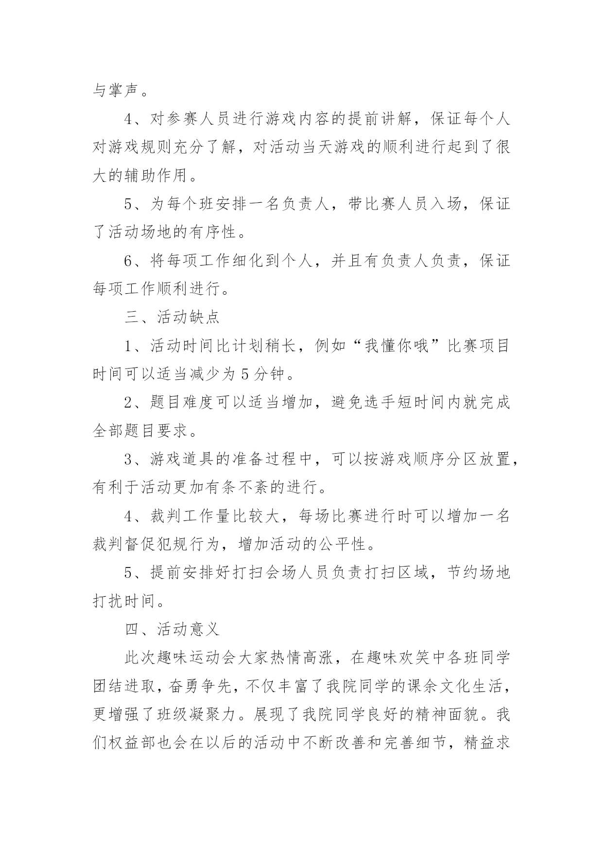学校趣味运动会的活动总结总结是在某一时期、某一项目或某些工作告一段落或者全部完成后进行回顾检查、分析评价,从而得出教训和一些规律性认识的一种书面材料,它能使我们及时找出错误并改正,为此我们要做好回顾,写好总结。总结你想好怎么写了吗?以下是小编收集整理的学校趣味运动会的活动总结,供大家参考借鉴,希望可以帮助到有需要的朋友。学校趣味运动会的活动总结1趣味运动会是公司举办的比较大型的活动,管理部主要负责前期的运动员报名及整理工作、赛程安排工作、裁判员记录员现场组织人员的安排工作、运动器材和奖品的准备工作,在参赛过程中负责联系、组织、监督参赛时运动员的准时有序的参加比赛和裁判员记录员的到场、工作情况。一、工作总结(1)活动前期1、由于运动会的举行时间推后,有部分参赛人员离职、请假或不清楚自己所报项目,导致不能准时参赛。2、运动员未进行训练、选拔,也没有进行集中性地通告运动员每个项目比赛场地,导致部分运动员不能及时找到个别项目的场地。3、运动员平常少锻炼,部分运动员身体出现体力不支,导致运动员到后项目参赛的积极性。4、个别项目需要的器材准备的不足及场地准备的不充分,只能向外院学校借用。5、运动会举行前未对裁判员、记录员、工作组织人员进行组织会议,导致部分裁判员、记录员、组织人员工作出错。6、裁判员记录员没有补助和礼品,导致他们的工作积极性减弱。7、未安排后勤工作人员和医务人员。(2)活动中期1、比赛正在进行时,有临时报名参赛或临时替换人员参赛。导致影响项目结束时间。2、喊话筒用到中途没有电,导致影响组织人员组织运动员参赛。3、在学校未安排一个服务台和供应纯净水站,导致个别项目不能及时接应运动员。(3)活动后期1、未进行运动会闭幕式。2、运动会结束后部分运动员和管理部成员都积极加入到物品以及器材的清单、收拾以及整理。二、工作改进以上就是20xx年第三届趣味运动会管理部的主要工作的缺点和不足,下面做一下归纳以及一些改进意见:1、运动员不能准时参赛,我们管理部应报名表下发到每部门及每个班组,让她们知道自己所报项目并提前找好替换离职人员、请假人员参赛。2、活动缺少秩序化,在一些工作上显得过于随便以至于整个项目变得混乱,不能保证各别项目有条不紊的进行下去,是我们不应给予现场报名、临时替换人员参赛。3、场地找不到,应大力宣传通告并明确所有项目比赛所在地。4、调动全体员工积极性的能力不够,主要是职工参加运动会的积极性不高,就失去了管理部策划运动的意义。5、器材准备的不足及场地准备的不充分:在运动会举行前一天或前两天我未对前期已备好的器材进行核查。准备的'场地没有考虑天气和实际问题。应考虑多方面实际问题,再安排工作。6、裁判员、记录员、组织人员工作出错:因为我们裁判记录不是专业人员,管理部在举行运动前应组织一次或两次会议进行教学和注意事项并明确分工个人所负责的项目。7、后勤支持工作:运动会的后勤工作也是非常重要不可轻视的,管理部应安排后勤组,设置服务台、宣传站、保障站,备好所有的急用药物,保障运动员和工作人员紧密联系安全保障和运动正常进行。8、细节问题,在运动会期间进行某一项项目时,应该考虑到所发生的问题,对问题处理的方案等,充分调动同学们得思维,进行合理的假设,并作出预案。9、各部门之间缺乏联系,在一些活动应该与其他部门进行联系,合理分配人员,增强整个公司管理的战斗力。虽然这次运动会存在着以上各各问题,但我们管理部在娄总、施部长的组织和指挥下,我们还是不怕苦不怕累地将第三届趣味运动会圆满成功地结束了,我们将总结经验和教训。起到各工作部门、各岗位工作强化剂的作用。管理部将继续与各部门加强协作,完成为职员服务,发展壮大我公司的所有光荣使命。充分发挥管理部在公司中的桥梁作用,为公司架起坚实的桥梁,同各部门携手共进,共同建设美好的未来!学校趣味运动会的活动总结2首先,很惭愧,由于我个人的原因,没能参加这次精彩的活动,但是从同事们的精彩描述中,我能感受到运动会现场的热闹气氛,能感受到大家的兴奋,这也反映了这次活动举办的真的很成功。关于趣味运动会,我只参加了前期的。一些准备工作,对大致的流程也有一些了解。刚开始我负责的是收集创意,想一些运动会现场的项目,在这个过程中,我体会到了创新的艰难,做游戏容易,做好玩儿的新游戏就不容易了,我在网上查到了一些有趣的.项目,但是考虑到场地以及道具的问题,舍弃了很多;另外根据以前玩儿过的、体育课上刚做过个游戏我问题很多同学,给他们讲规则,然后听取他们的意见,整理出了自己的想发,自己感觉想出一个好玩儿的新游戏挺难得,但是团结起来力量大,这一点让我深有体会,当我看到发下来的游戏项目单的时候,我特别惊讶,真的特别佩服各位同事的奇思妙想,同时我也为有这样团结的办公室之家而感到骄傲。之后的有关器具准备问题我也参加了会议,深感举办一项活