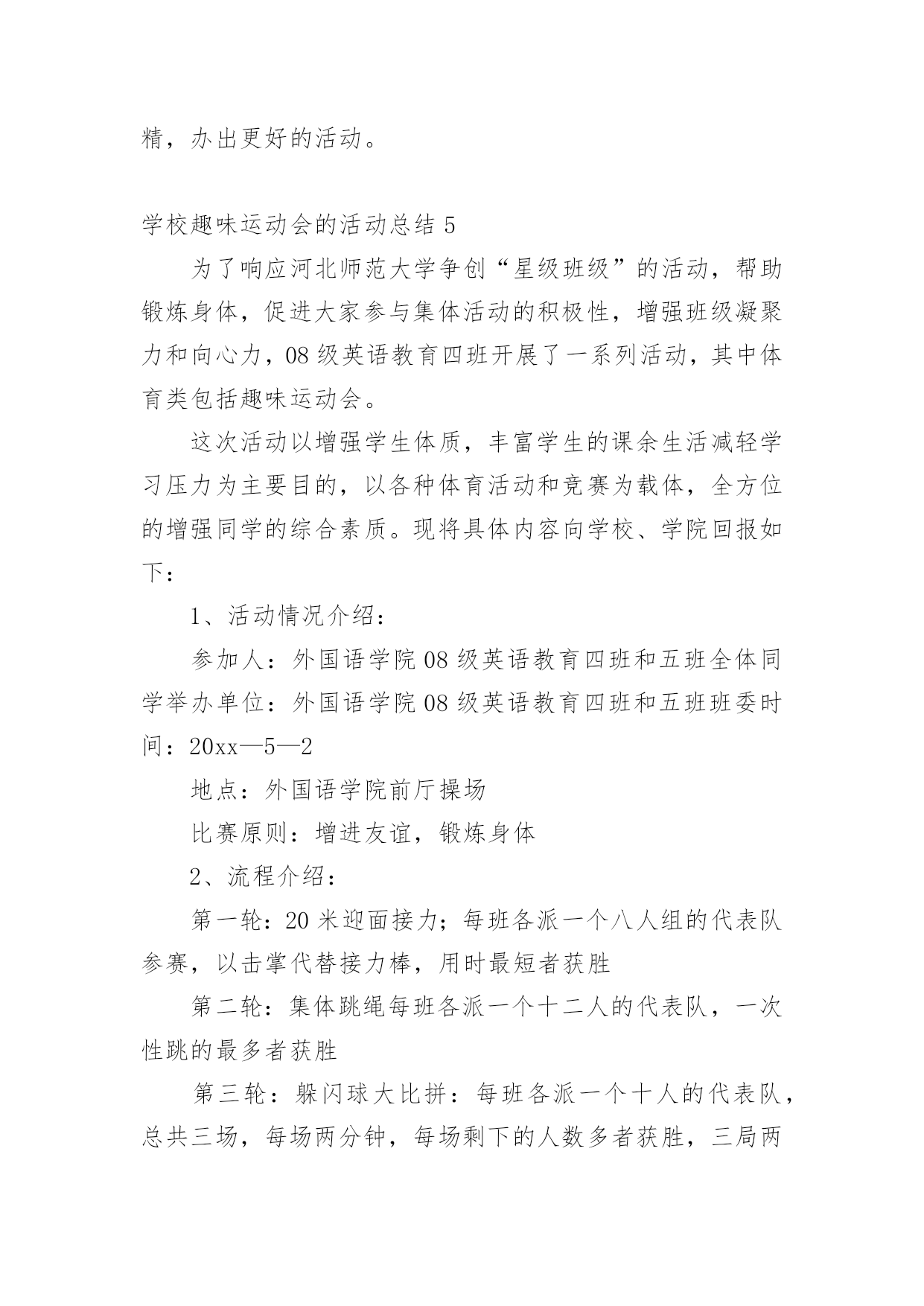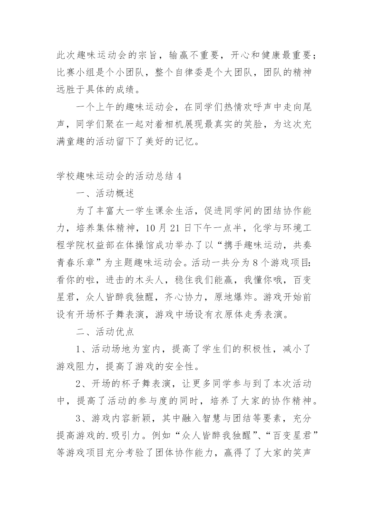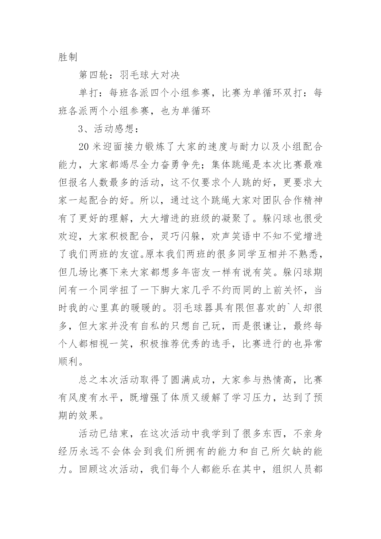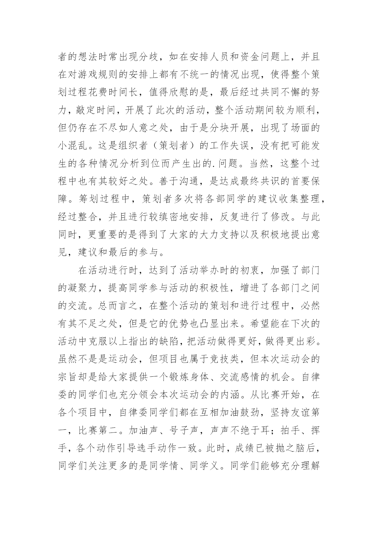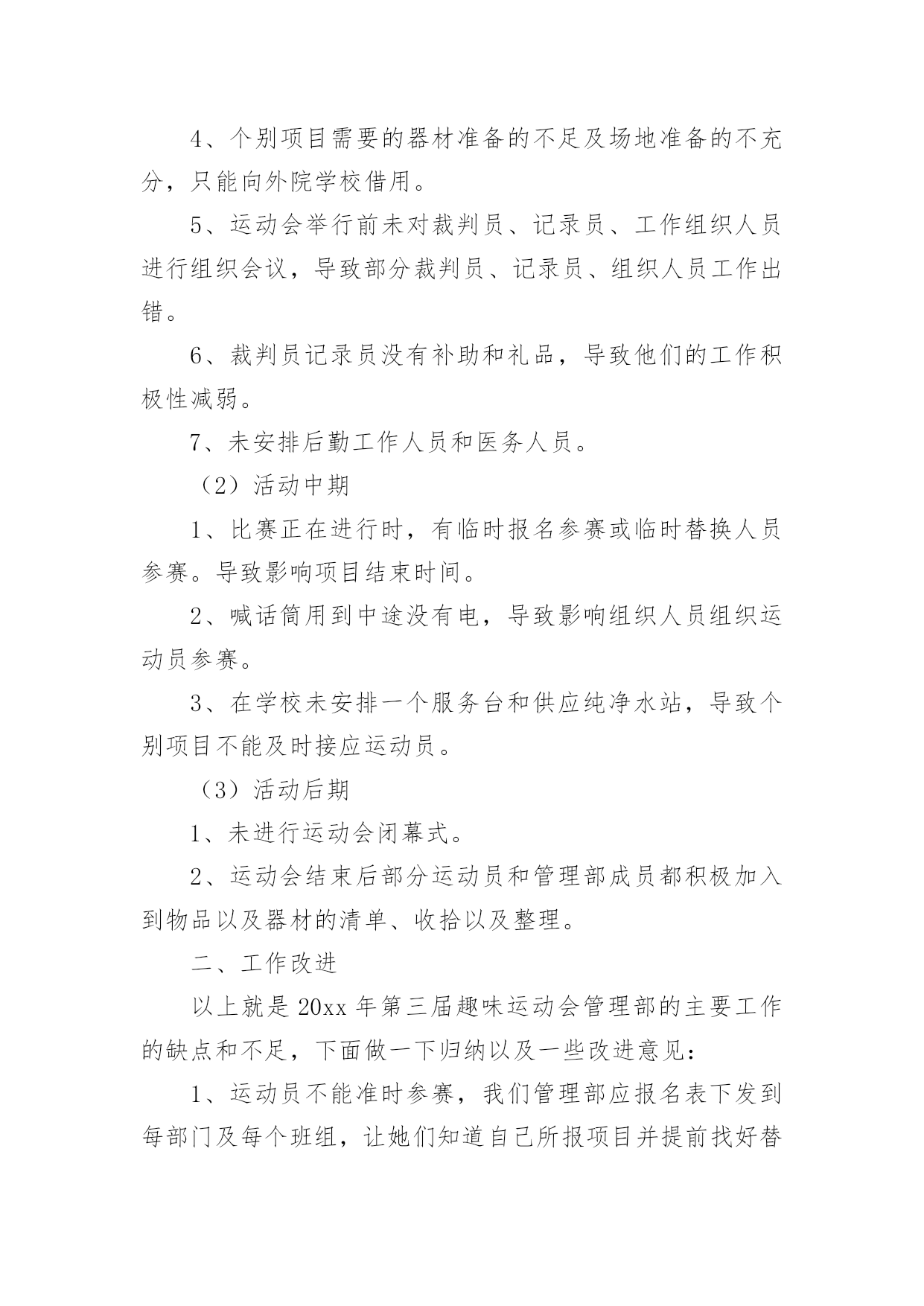 学校趣味运动会的活动总结总结是在某一时期、某一项目或某些工作告一段落或者全部完成后进行回顾检查、分析评价,从而得出教训和一些规律性认识的一种书面材料,它能使我们及时找出错误并改正,为此我们要做好回顾,写好总结。总结你想好怎么写了吗?以下是小编收集整理的学校趣味运动会的活动总结,供大家参考借鉴,希望可以帮助到有需要的朋友。学校趣味运动会的活动总结1趣味运动会是公司举办的比较大型的活动,管理部主要负责前期的运动员报名及整理工作、赛程安排工作、裁判员记录员现场组织人员的安排工作、运动器材和奖品的准备工作,在参赛过程中负责联系、组织、监督参赛时运动员的准时有序的参加比赛和裁判员记录员的到场、工作情况。一、工作总结(1)活动前期1、由于运动会的举行时间推后,有部分参赛人员离职、请假或不清楚自己所报项目,导致不能准时参赛。2、运动员未进行训练、选拔,也没有进行集中性地通告运动员每个项目比赛场地,导致部分运动员不能及时找到个别项目的场地。3、运动员平常少锻炼,部分运动员身体出现体力不支,导致运动员到后项目参赛的积极性。4、个别项目需要的器材准备的不足及场地准备的不充分,只能向外院学校借用。5、运动会举行前未对裁判员、记录员、工作组织人员进行组织会议,导致部分裁判员、记录员、组织人员工作出错。6、裁判员记录员没有补助和礼品,导致他们的工作积极性减弱。7、未安排后勤工作人员和医务人员。(2)活动中期1、比赛正在进行时,有临时报名参赛或临时替换人员参赛。导致影响项目结束时间。2、喊话筒用到中途没有电,导致影响组织人员组织运动员参赛。3、在学校未安排一个服务台和供应纯净水站,导致个别项目不能及时接应运动员。(3)活动后期1、未进行运动会闭幕式。2、运动会结束后部分运动员和管理部成员都积极加入到物品以及器材的清单、收拾以及整理。二、工作改进以上就是20xx年第三届趣味运动会管理部的主要工作的缺点和不足,下面做一下归纳以及一些改进意见:1、运动员不能准时参赛,我们管理部应报名表下发到每部门及每个班组,让她们知道自己所报项目并提前找好替换离职人员、请假人员参赛。2、活动缺少秩序化,在一些工作上显得过于随便以至于整个项目变得混乱,不能保证各别项目有条不紊的进行下去,是我们不应给予现场报名、临时替换人员参赛。3、场地找不到,应大力宣传通告并明确所有项目比赛所在地。4、调动全体员工积极性的能力不够,主要是职工参加运动会的积极性不高,就失去了管理部策划运动的意义。5、器材准备的不足及场地准备的不充分:在运动会举行前一天或前两天我未对前期已备好的器材进行核查。准备的'场地没有考虑天气和实际问题。应考虑多方面实际问题,再安排工作。6、裁判员、记录员、组织人员工作出错:因为我们裁判记录不是专业人员,管理部在举行运动前应组织一次或两次会议进行教学和注意事项并明确分工个人所负责的项目。7、后勤支持工作:运动会的后勤工作也是非常重要不可轻视的,管理部应安排后勤组,设置服务台、宣传站、保障站,备好所有的急用药物,保障运动员和工作人员紧密联系安全保障和运动正常进行。8、细节问题,在运动会期间进行某一项项目时,应该考虑到所发生的问题,对问题处理的方案等,充分调动同学们得思维,进行合理的假设,并作出预案。9、各部门之间缺乏联系,在一些活动应该与其他部门进行联系,合理分配人员,增强整个公司管理的战斗力。虽然这次运动会存在着以上各各问题,但我们管理部在娄总、施部长的组织和指挥下,我们还是不怕苦不怕累地将第三届趣味运动会圆满成功地结束了,我们将总结经验和教训。起到各工作部门、各岗位工作强化剂的作用。管理部将继续与各部门加强协作,完成为职员服务,发展壮大我公司的所有光荣使命。充分发挥管理部在公司中的桥梁作用,为公司架起坚实的桥梁,同各部门携手共进,共同建设美好的未来!学校趣味运动会的活动总结2首先,很惭愧,由于我个人的原因,没能参加这次精彩的活动,但是从同事们的精彩描述中,我能感受到运动会现场的热闹气氛,能感受到大家的兴奋,这也反映了这次活动举办的真的很成功。关于趣味运动会,我只参加了前期的。一些准备工作,对大致的流程也有一些了解。刚开始我负责的是收集创意,想一些运动会现场的项目,在这个过程中,我体会到了创新的艰难,做游戏容易,做好玩儿的新游戏就不容易了,我在网上查到了一些有趣的.项目,但是考虑到场地以及道具的问题,舍弃了很多;另外根据以前玩儿过的、体育课上刚做过个游戏我问题很多同学,给他们讲规则,然后听取他们的意见,整理出了自己的想发,自己感觉想出一个好玩儿的新游戏挺难得,但是团结起来力量大,这一点让我深有体会,当我看到发下来的游戏项目单的时候,我特别惊讶,真的特别佩服各位同事的奇思妙想,同时我也为有这样团结的办公室之家而感到骄傲。之后的有关器具准备问题我也参加了会议,深感举办一项活