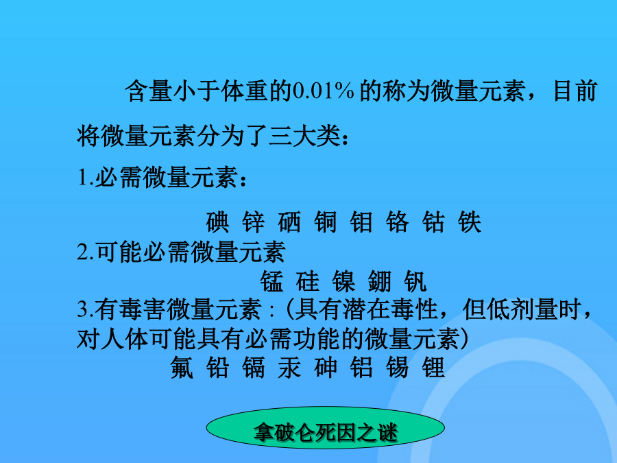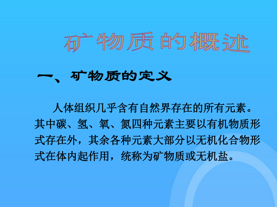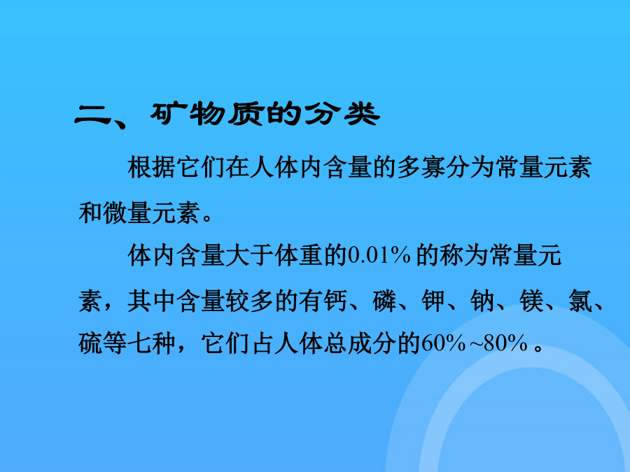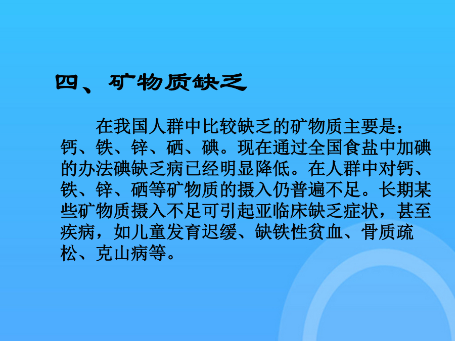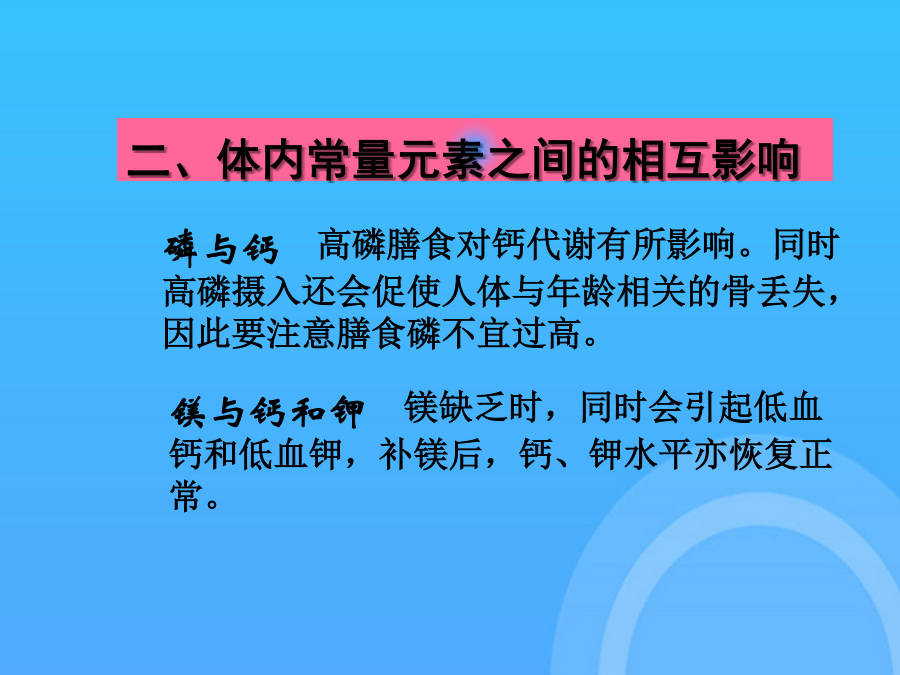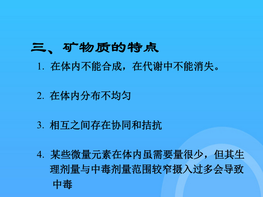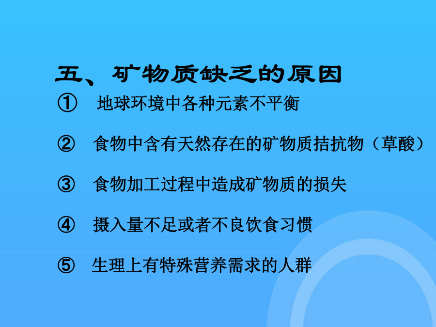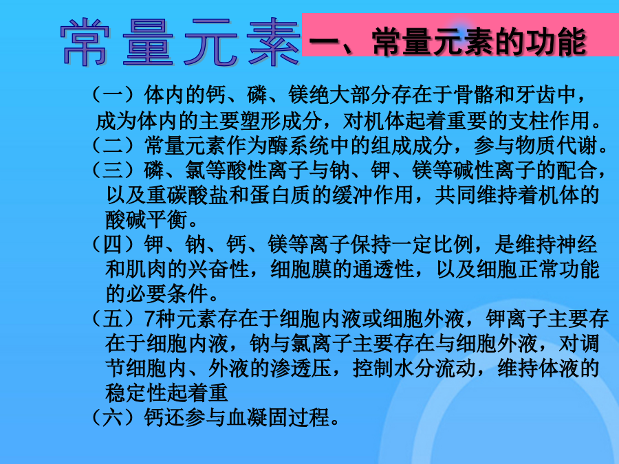 公共营养师课程八矿物质关于矿物质矿物质的概述根据它们在人体内含量的多寡分为常量元素和微量元素。体内含量大于体重的0.01%的称为常量元素,其中含量较多的有钙、磷、钾、钠、镁、氯、硫等七种,它们占人体总成分的60%~80%。含量小于体重的0.01%的称为微量元素,目前将微量元素分为了三大类:1.必需微量元素:碘锌硒铜钼铬钴铁2.可能必需微量元素锰硅镍錋钒3.有毒害微量元素:(具有潜在毒性,但低剂量时,对人体可能具有必需功能的微量元素)氟铅镉汞砷铝锡锂在体内不能合成,在代谢中不能消失。2.在体内分布不均匀3.相互之间存在协同和拮抗某些微量元素在体内虽需要量很少,但其生理剂量与中毒剂量范围较窄摄入过多会导致中毒在我国人群中比较缺乏的矿物质主要是:钙、铁、锌、硒、碘。现在通过全国食盐中加碘的办法碘缺乏病已经明显降低。在人群中对钙、铁、锌、硒等矿物质的摄入仍普遍不足。长期某些矿物质摄入不足可引起亚临床缺乏症状,甚至疾病,如儿童发育迟缓、缺铁性贫血、骨质疏松、克山病等。地球环境中各种元素不平衡食物中含有天然存在的矿物质拮抗物(草酸)食物加工过程中造成矿物质的损失摄入量不足或者不良饮食习惯⑤生理上有特殊营养需求的人群常量元素二、体内常量元素之间的相互影响钠与钙钠与钙在肾小管内的重吸收过程发生竞争,故钠摄入量高时,会相应减少钙的重吸收,而增加尿钙排泄。因尿钙丢失约为钙潴留的50%,故高钠膳食对骨丢失有很大影响。成人体内含钙量约1000~1200mg(占体重的2%),是人体内元素中排第5位,是含量最多的矿物质。(二)钙的吸收高峰骨质质量(三)、钙的排泄(四)、钙的缺乏与过量佝偻病(足内翻)钙过量增加肾结石危险性;持续摄入大量钙会使降钙素分泌增多,以及发生骨硬化。(五)、钙的食物来源与供给量食物中的钙含量(mg/100g)常见蔬菜中钙和草酸含量(mg/100g)请评价菠菜豆腐汤的功与过?(六)、补钙应注意的问题不同化学形式的钙补充剂钙含量不同,吸收率也不尽相同。以钙含量计,碳酸钙约为40%,氯化钙37%,磷酸氢钙23%,乳酸钙13%.吸收率试验,含250mg元素钙的不同钙制剂,苹果酸钙、柠檬酸钙35%,碳酸钙27%,磷酸氢钙25%,补钙效果差异不显著,但效价比方面碳酸钙有优势。小敏是个7岁的乖巧女孩,平时父母对其严格要求,放学就关在家里做作业和兴趣爱好的培训,最近小敏出现汗多、睡眠不好、情绪不稳、抵抗力下降等症状,到医院检查发现血钙偏低,家长诉平时每天都给孩子吃很多虾和肉,也喝牛奶,孩子为什么缺钙?在服用方式方面,在用餐时同时服用,吸收率最好,因食糜可减少草酸盐的干扰,而有利于钙的吸收。为了更好地吸收钙质,我们还应该配合补钙做一些辅助工作:平时多晒太阳,充足的紫外线照射可以促进维生素D在人体内的合成,提高钙的吸收率;增加体育锻炼,多多活动骨关节,做肌肉抻拉练习,能够改善骨骼肌的营养状况,提高骨密度。(七)、补钙的误区误区二:吃钙片是补钙的最佳途径误区三:太轻信广告虾皮挂面麻酱拌面条春芽拌豆腐虾皮番茄烩豆腐微量元素三、参与体内物质的输送作用如铁为血红蛋白的成分,参与氧的运送。四、参与核酸代谢微量元素含量不足或过多可影响核酸遗传信息的携带,如发生在生殖细胞,常可表现为畸形;发生在体细胞将形成肿瘤。微量元素的功能作用与含量水平微量元素间及与其他营养素的关系全国大约有40%~60%的6到24月龄儿童面临着大脑发育迟缓的危险。每年有大约1000名年轻妇女在怀孕分娩期间死亡。每年有大约10万名婴儿在围产期面临死亡。体内的铁按照功能和储存部位可分为:其中碳、氢、氧、氮四种元素主要以有机物质形式存在外,其余各种元素大部分以无机化合物形式在体内起作用,统称为矿物质或无机盐。中国每年有近200万儿童因为在胎儿时期缺碘导致出生时大脑发育不良。膳食中铁的吸收率平均约为10%。5冬菜11.该孩子最有可能营养素缺乏的是什么?过量的锌还可干扰铜、铁及其他微量元素的吸收和利用,影响免疫功能。子状态分布于软组织、细胞外液和血液中——女15.麻酱拌面条象,请分析孩子出现什么问题?0女11.铁为血红蛋白、肌红蛋白、细胞色素以及某些呼吸酶的组成成分,参与体内氧的运送和组织呼吸过程。骼肌的营养状况,提高骨密度。成人体内含钙量约1000~1200mg(占体重酸菜血旺汤a.参与体内氧的运送和组织的呼吸过程c.参与其它重要功能催化促进β-胡萝卜素转化为维生素A、嘌呤与胶原的合成、脂类从血液中转运以及药物在肝脏解毒等方面均需铁的参与。铁与脂质抗过氧化有关,随着铁缺乏程度增高,脂质过氧化损伤加重,铁的缺乏还可使具有抗脂质过氧化