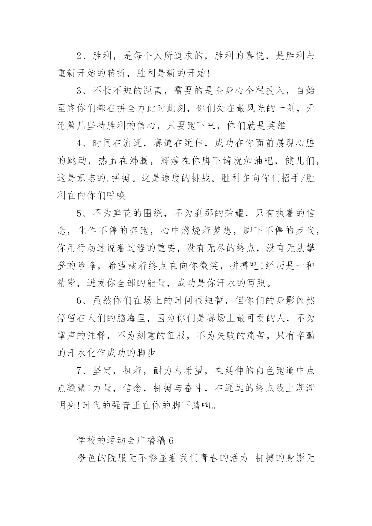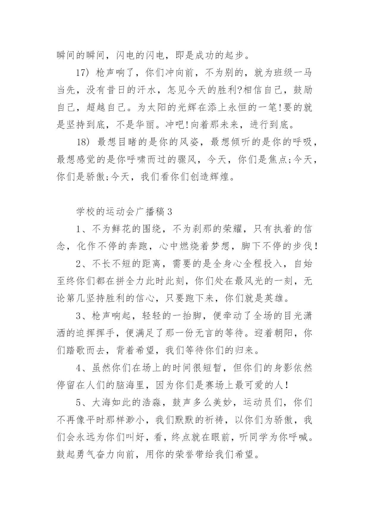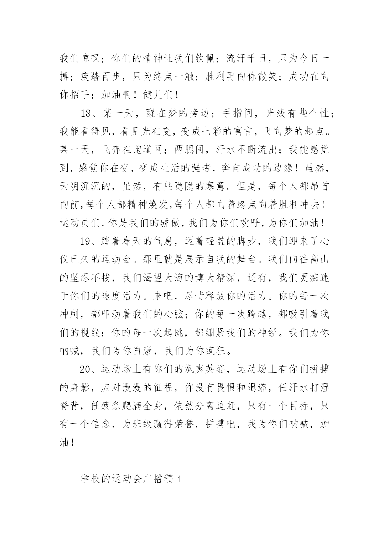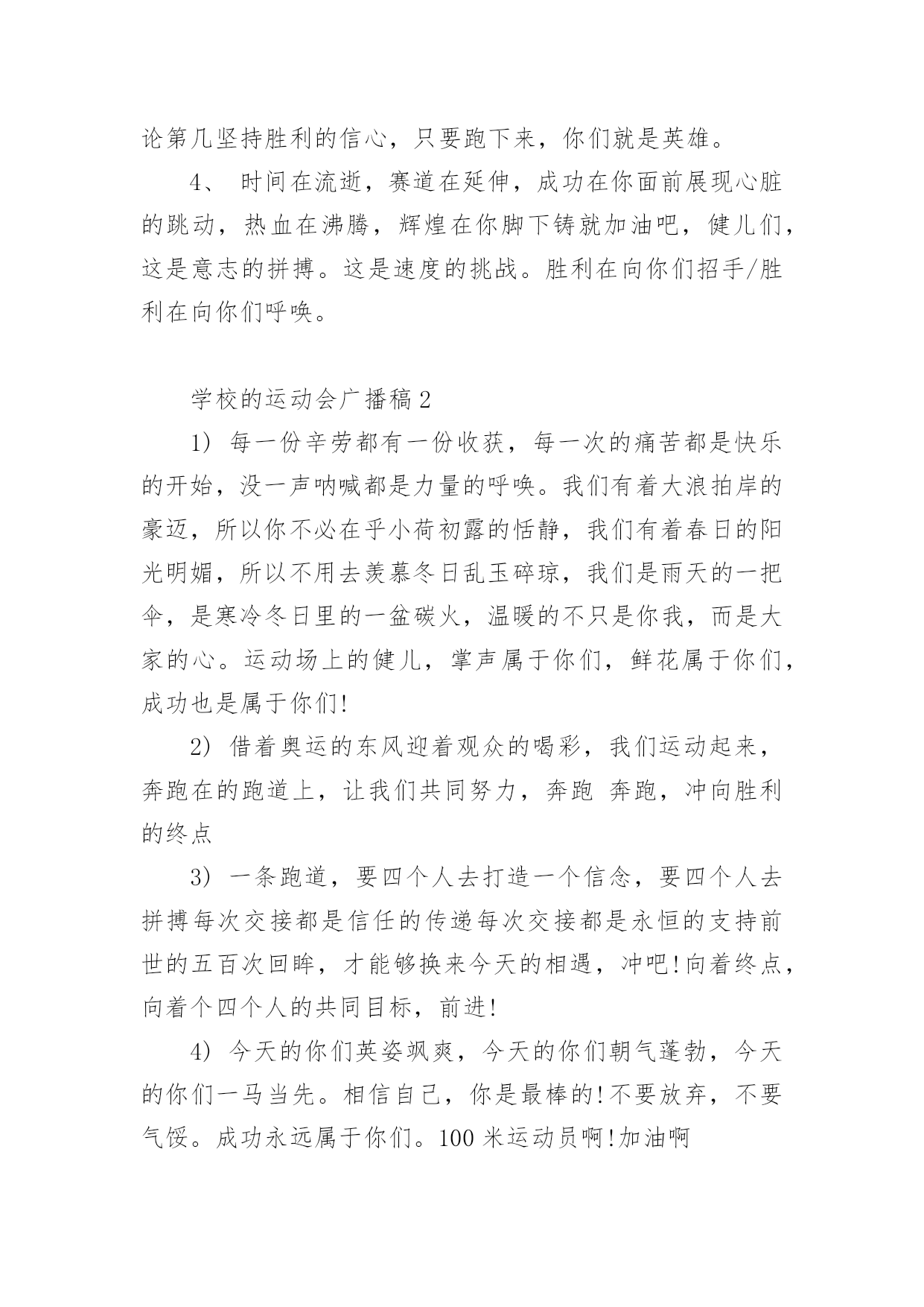 学校的运动会广播稿在学校广播站锻炼的学生都知道,大家广播前都会提前做好广播稿,好的广播稿会带来更好的广播效果,广播稿我们应该怎么写呢?下面是小编收集整理的学校的运动会广播稿,仅供参考,欢迎大家阅读。学校的运动会广播稿11、面对艰苦的征程,你们毫不畏惧,接力棒在你们手中传递着集体的力量,听,我们在为你呐喊,你们诠释着奥运的精神,你们是我们心中的骄傲,深深的呼吸,等待你的是艰难的米。相信胜利会属于你们,但在这征途上,需要你勇敢的心去面对。我们在为你加油,你是否听到了我们发自内心的呐喊,困难和胜利都在向你招手,去呀,不要犹豫,快去击败困难,快去夺取胜利,相信你会送给我们一个汗水浸湿的微笑2、也许流星并不少见,但它燃烧的刹那,留给人间最美丽的回忆!也许笑脸并不少见,但胜利的喜悦,总会留给世界精彩的一瞬!是的,那些曾经美妙的东西只有短短的一瞬间,但那却把最辉煌的一刻留给了人间。胜利,是每个人所追求的,胜利的.喜悦,是胜利与重新开始的转折,胜利是新的开始!3、不长不短的距离,需要的是全身心全程投入,自始至终你们都在拼全力此时此刻,你们处在最风光的一刻,无论第几坚持胜利的信心,只要跑下来,你们就是英雄。4、时间在流逝,赛道在延伸,成功在你面前展现心脏的跳动,热血在沸腾,辉煌在你脚下铸就加油吧,健儿们,这是意志的拼搏。这是速度的挑战。胜利在向你们招手/胜利在向你们呼唤。学校的运动会广播稿21)每一份辛劳都有一份收获,每一次的痛苦都是快乐的开始,没一声呐喊都是力量的呼唤。我们有着大浪拍岸的豪迈,所以你不必在乎小荷初露的恬静,我们有着春日的阳光明媚,所以不用去羡慕冬日乱玉碎琼,我们是雨天的一把伞,是寒冷冬日里的一盆碳火,温暖的不只是你我,而是大家的心。运动场上的健儿,掌声属于你们,鲜花属于你们,成功也是属于你们!2)借着奥运的东风迎着观众的喝彩,我们运动起来,奔跑在的跑道上,让我们共同努力,奔跑奔跑,冲向胜利的终点3)一条跑道,要四个人去打造一个信念,要四个人去拼搏每次交接都是信任的传递每次交接都是永恒的支持前世的五百次回眸,才能够换来今天的相遇,冲吧!向着终点,向着个四个人的共同目标,前进!4)今天的你们英姿飒爽,今天的你们朝气蓬勃,今天的你们一马当先。相信自己,你是最棒的!不要放弃,不要气馁。成功永远属于你们。100米运动员啊!加油啊5)运动场上有你们的飒爽英姿,运动场上有你们拼搏的身影,面对漫漫的征程,你没有畏惧和退缩,任汗水打湿脊背,任疲惫爬满全身,依然分离追赶,只有一个目标,只有一个信念,为班级赢得荣誉,拼搏吧,我为你们呐喊,加油,6)你听那激烈奔跑的脚步声,震撼大地。你听那欢呼加油的呐喊声,催人奋进。赛场上的旋律,如旋风般急速,如号角般激扬,如激流般奔腾不息。创新!突破!超越!永远是赛场上最激动人心的旋律。7)天高任鸟飞,海阔凭鱼跃。运动会就是你们的舞台,展现你们矫健的英姿,将你们的豪情万丈泼洒出来,将你们的雄心壮志挥洒出来,一次次地,汗水淋漓,心里痛痛快快,把激情扬起来,把青春书写。8)掌声响起来这里需要激情,这里需要呐喊,这里同样需要掌声。当你乘胜而归,我们为你鼓掌,为你祝贺,当你失败而来,我们同样为你鼓掌,为你骄傲。当掌声再一次想起的时候,你已经站在了起跑线上,朋友,向前冲!我们在为你鼓掌。9)场上英姿显自豪,脚下步伐在飞奔。你们是骄傲。你们是自豪,跑道因你幻彩,面对红色跑道,你们挥洒自如,不惧一切冲向重点,10)面对艰苦的征程,你们毫不畏惧,接力棒在你们手中传递着集体的力量,听,我们在为你呐喊,你们诠释着奥运的精神,你们是我们心中的骄傲,深深的呼吸,等待你的是艰难的800米。相信胜利会属于你们,但在这征途上,需要你勇敢的心去面对。我们在为你加油,你是否听到了我们发自内心的呐喊,困难和胜利都在向你招手,去呀,不要犹豫,快去击败困难,快去夺取胜利,相信你会送给我们一个汗水浸湿的微笑11)大海如此的浩淼,鼓声多么美妙,运动员们,你们不再像平时那样渺小,我们默默的祈祷,以你们为骄傲,我们会永远为你们叫好,12)看,终点就在眼前,听,同学为你呼喊。鼓起勇气奋力向前,用你的荣誉带给我们希望。13)看!那一面面迎风飘舞的彩旗,是一朵朵盛开的鲜花;听!那一阵阵惊天动地的欢呼,是回响在耳边胜利的风声。运动场上的你们,是胜利的标志,运动场上的你们,是青春的赞叹。去吧!去迎接那伟大的挑战,去吧!去做一名追风的少年。14)人生的路,有坦途,也有坎坷;做过的岁月,有欢笑,也有苦涩,泪水告诉我一个跌倒的故事,汗水使我多了一份沉重,几多成熟。15)枪声伴你踏上征程,你昂着自信的头,带着必胜的信念,冲去,奔去。那一刻时光仿佛都为你停住,你的'勇气振动了一切,震撼了每一个人的心灵。终点。你赢了。虽然只是那短短的十几秒,但你在我们心中留下了永恒。16)红色的