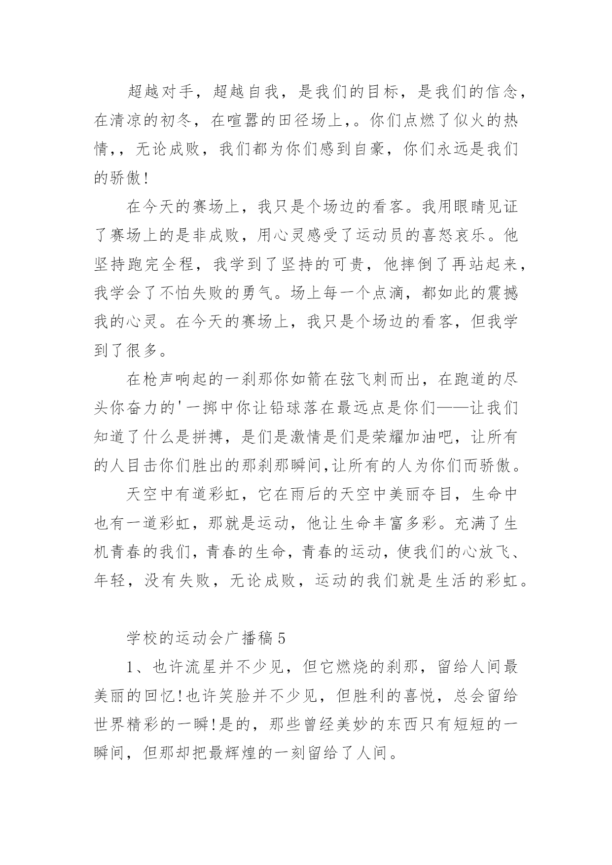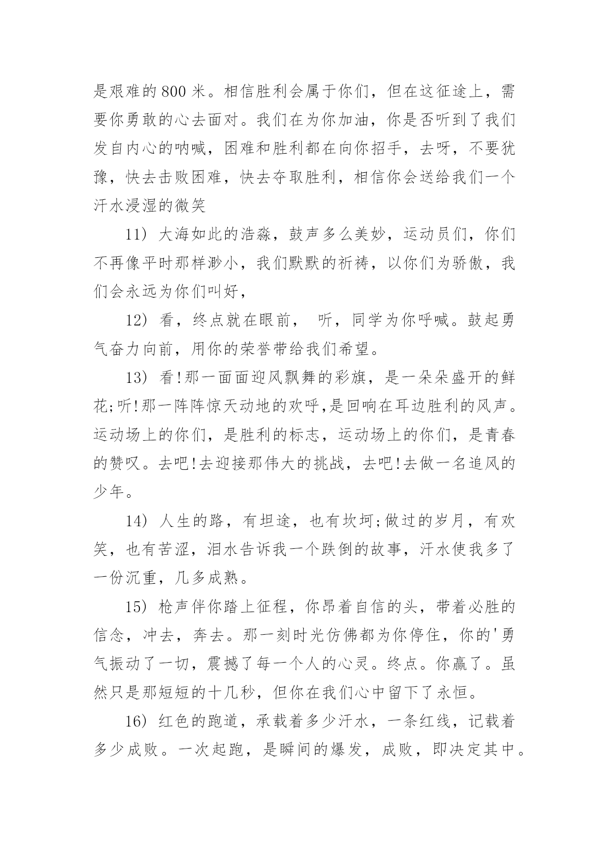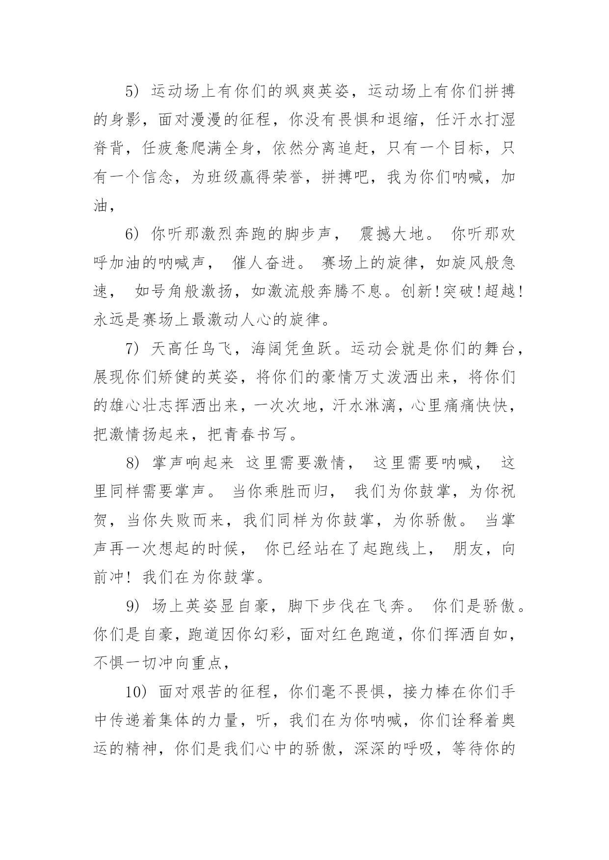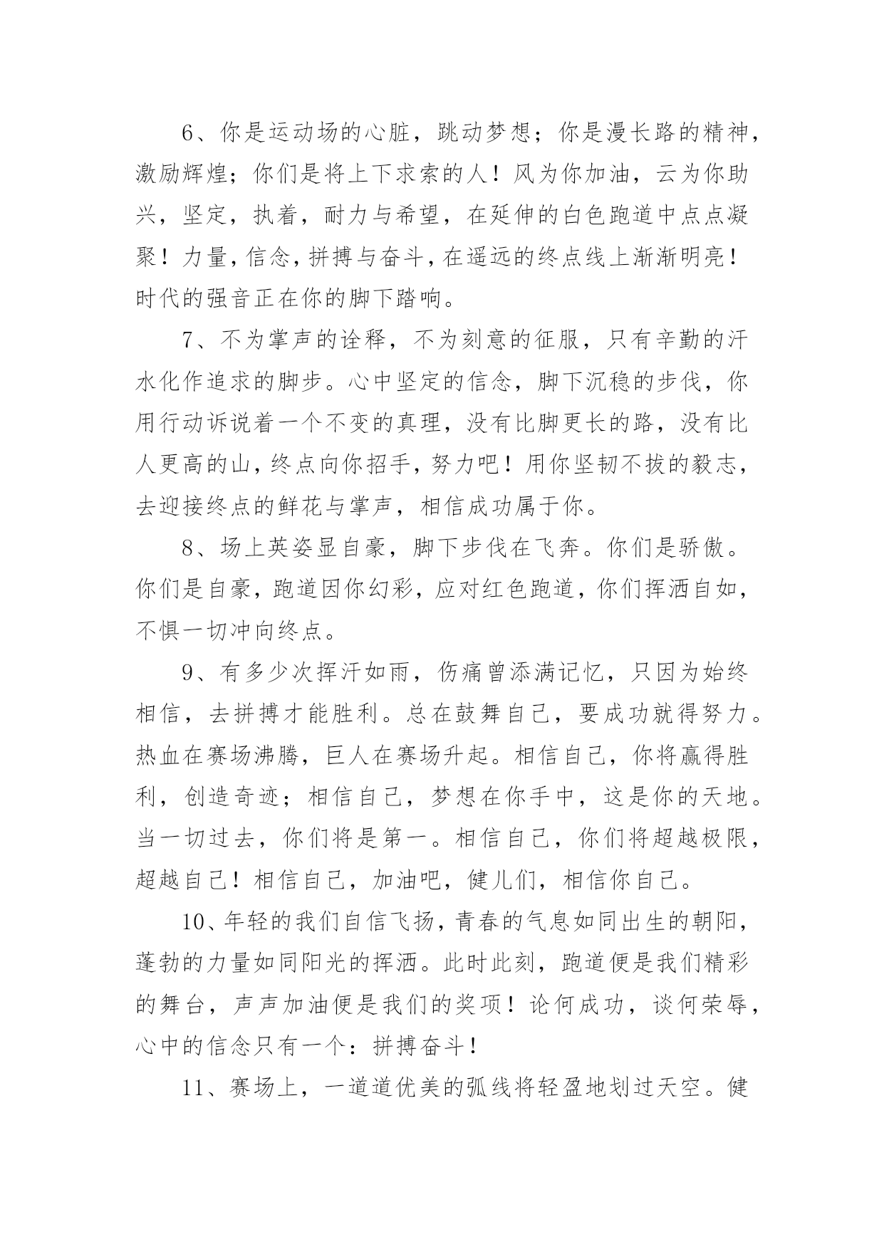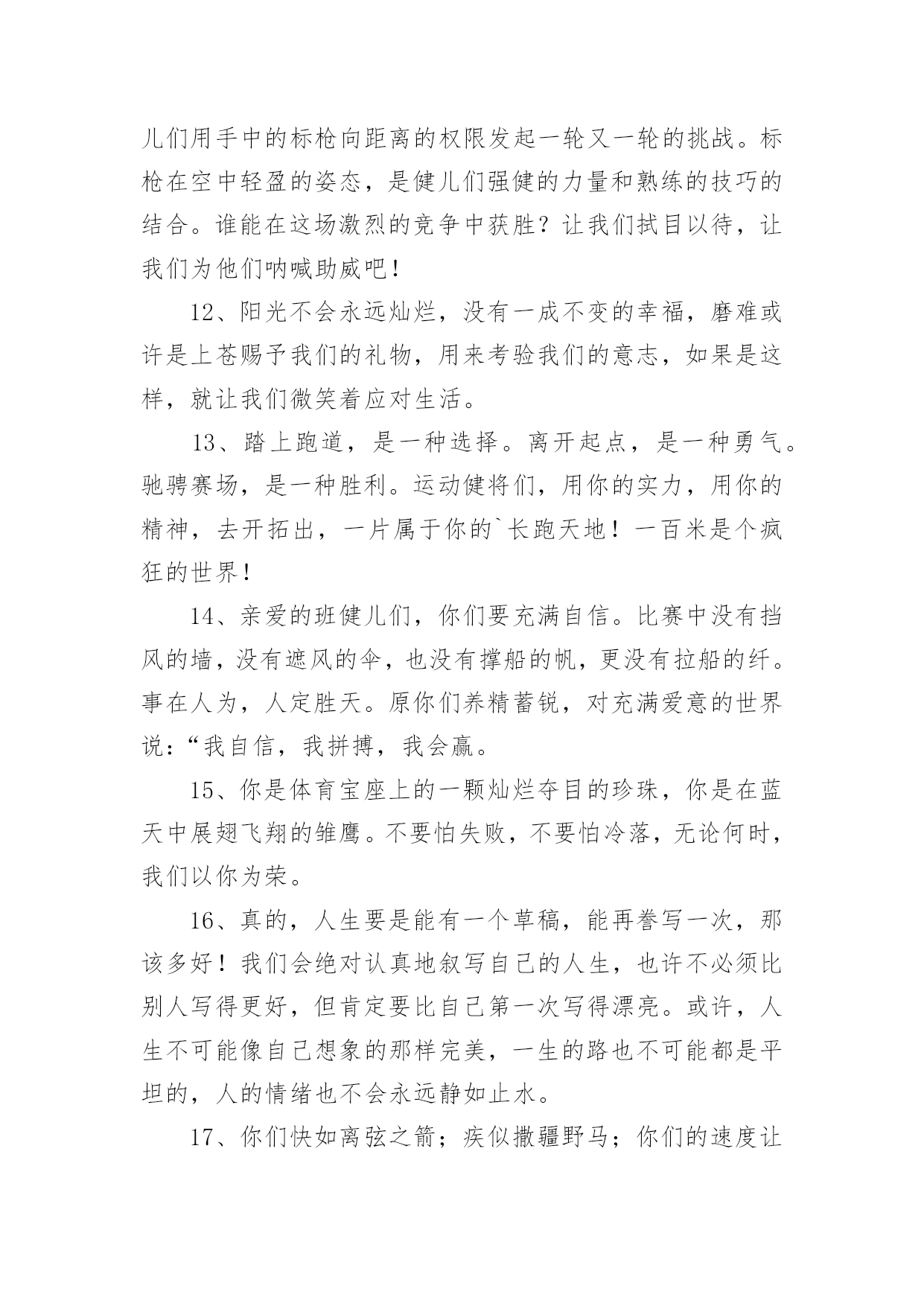 学校的运动会广播稿在学校广播站锻炼的学生都知道,大家广播前都会提前做好广播稿,好的广播稿会带来更好的广播效果,广播稿我们应该怎么写呢?下面是小编收集整理的学校的运动会广播稿,仅供参考,欢迎大家阅读。学校的运动会广播稿11、面对艰苦的征程,你们毫不畏惧,接力棒在你们手中传递着集体的力量,听,我们在为你呐喊,你们诠释着奥运的精神,你们是我们心中的骄傲,深深的呼吸,等待你的是艰难的米。相信胜利会属于你们,但在这征途上,需要你勇敢的心去面对。我们在为你加油,你是否听到了我们发自内心的呐喊,困难和胜利都在向你招手,去呀,不要犹豫,快去击败困难,快去夺取胜利,相信你会送给我们一个汗水浸湿的微笑2、也许流星并不少见,但它燃烧的刹那,留给人间最美丽的回忆!也许笑脸并不少见,但胜利的喜悦,总会留给世界精彩的一瞬!是的,那些曾经美妙的东西只有短短的一瞬间,但那却把最辉煌的一刻留给了人间。胜利,是每个人所追求的,胜利的.喜悦,是胜利与重新开始的转折,胜利是新的开始!3、不长不短的距离,需要的是全身心全程投入,自始至终你们都在拼全力此时此刻,你们处在最风光的一刻,无论第几坚持胜利的信心,只要跑下来,你们就是英雄。4、时间在流逝,赛道在延伸,成功在你面前展现心脏的跳动,热血在沸腾,辉煌在你脚下铸就加油吧,健儿们,这是意志的拼搏。这是速度的挑战。胜利在向你们招手/胜利在向你们呼唤。学校的运动会广播稿21)每一份辛劳都有一份收获,每一次的痛苦都是快乐的开始,没一声呐喊都是力量的呼唤。我们有着大浪拍岸的豪迈,所以你不必在乎小荷初露的恬静,我们有着春日的阳光明媚,所以不用去羡慕冬日乱玉碎琼,我们是雨天的一把伞,是寒冷冬日里的一盆碳火,温暖的不只是你我,而是大家的心。运动场上的健儿,掌声属于你们,鲜花属于你们,成功也是属于你们!2)借着奥运的东风迎着观众的喝彩,我们运动起来,奔跑在的跑道上,让我们共同努力,奔跑奔跑,冲向胜利的终点3)一条跑道,要四个人去打造一个信念,要四个人去拼搏每次交接都是信任的传递每次交接都是永恒的支持前世的五百次回眸,才能够换来今天的相遇,冲吧!向着终点,向着个四个人的共同目标,前进!4)今天的你们英姿飒爽,今天的你们朝气蓬勃,今天的你们一马当先。相信自己,你是最棒的!不要放弃,不要气馁。成功永远属于你们。100米运动员啊!加油啊5)运动场上有你们的飒爽英姿,运动场上有你们拼搏的身影,面对漫漫的征程,你没有畏惧和退缩,任汗水打湿脊背,任疲惫爬满全身,依然分离追赶,只有一个目标,只有一个信念,为班级赢得荣誉,拼搏吧,我为你们呐喊,加油,6)你听那激烈奔跑的脚步声,震撼大地。你听那欢呼加油的呐喊声,催人奋进。赛场上的旋律,如旋风般急速,如号角般激扬,如激流般奔腾不息。创新!突破!超越!永远是赛场上最激动人心的旋律。7)天高任鸟飞,海阔凭鱼跃。运动会就是你们的舞台,展现你们矫健的英姿,将你们的豪情万丈泼洒出来,将你们的雄心壮志挥洒出来,一次次地,汗水淋漓,心里痛痛快快,把激情扬起来,把青春书写。8)掌声响起来这里需要激情,这里需要呐喊,这里同样需要掌声。当你乘胜而归,我们为你鼓掌,为你祝贺,当你失败而来,我们同样为你鼓掌,为你骄傲。当掌声再一次想起的时候,你已经站在了起跑线上,朋友,向前冲!我们在为你鼓掌。9)场上英姿显自豪,脚下步伐在飞奔。你们是骄傲。你们是自豪,跑道因你幻彩,面对红色跑道,你们挥洒自如,不惧一切冲向重点,10)面对艰苦的征程,你们毫不畏惧,接力棒在你们手中传递着集体的力量,听,我们在为你呐喊,你们诠释着奥运的精神,你们是我们心中的骄傲,深深的呼吸,等待你的是艰难的800米。相信胜利会属于你们,但在这征途上,需要你勇敢的心去面对。我们在为你加油,你是否听到了我们发自内心的呐喊,困难和胜利都在向你招手,去呀,不要犹豫,快去击败困难,快去夺取胜利,相信你会送给我们一个汗水浸湿的微笑11)大海如此的浩淼,鼓声多么美妙,运动员们,你们不再像平时那样渺小,我们默默的祈祷,以你们为骄傲,我们会永远为你们叫好,12)看,终点就在眼前,听,同学为你呼喊。鼓起勇气奋力向前,用你的荣誉带给我们希望。13)看!那一面面迎风飘舞的彩旗,是一朵朵盛开的鲜花;听!那一阵阵惊天动地的欢呼,是回响在耳边胜利的风声。运动场上的你们,是胜利的标志,运动场上的你们,是青春的赞叹。去吧!去迎接那伟大的挑战,去吧!去做一名追风的少年。14)人生的路,有坦途,也有坎坷;做过的岁月,有欢笑,也有苦涩,泪水告诉我一个跌倒的故事,汗水使我多了一份沉重,几多成熟。15)枪声伴你踏上征程,你昂着自信的头,带着必胜的信念,冲去,奔去。那一刻时光仿佛都为你停住,你的'勇气振动了一切,震撼了每一个人的心灵。终点。你赢了。虽然只是那短短的十几秒,但你在我们心中留下了永恒。16)红色的