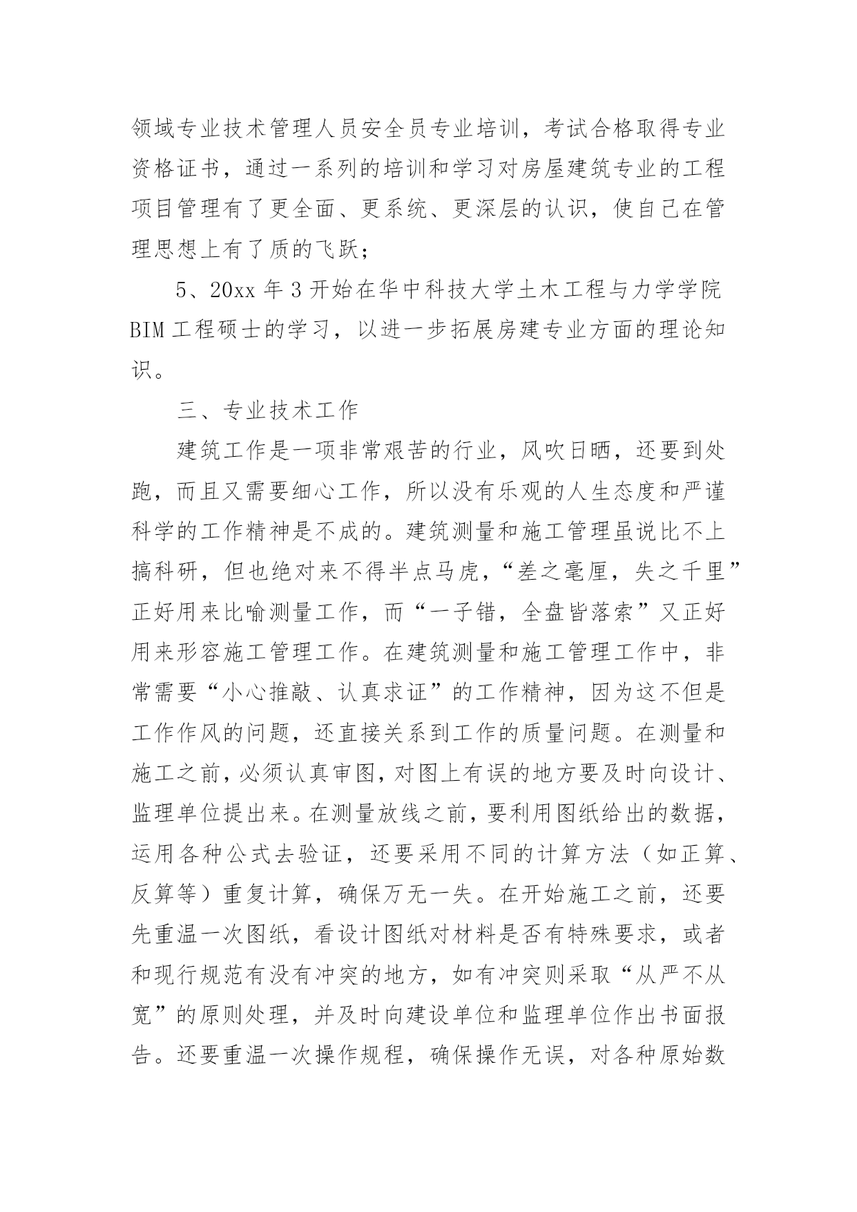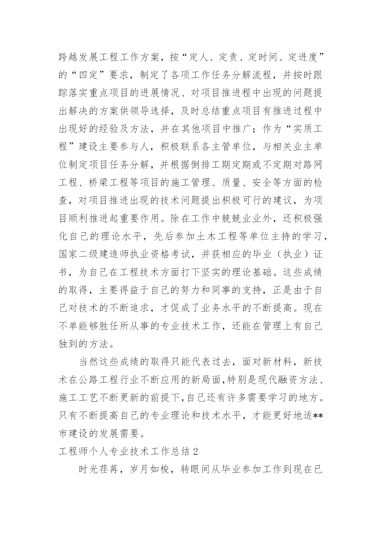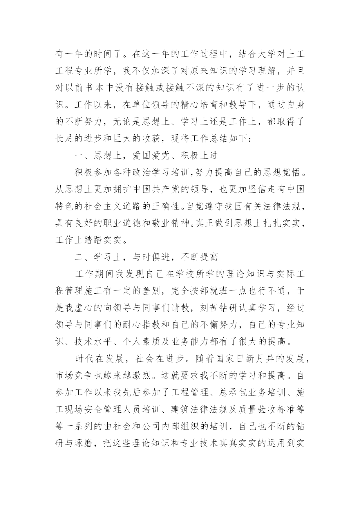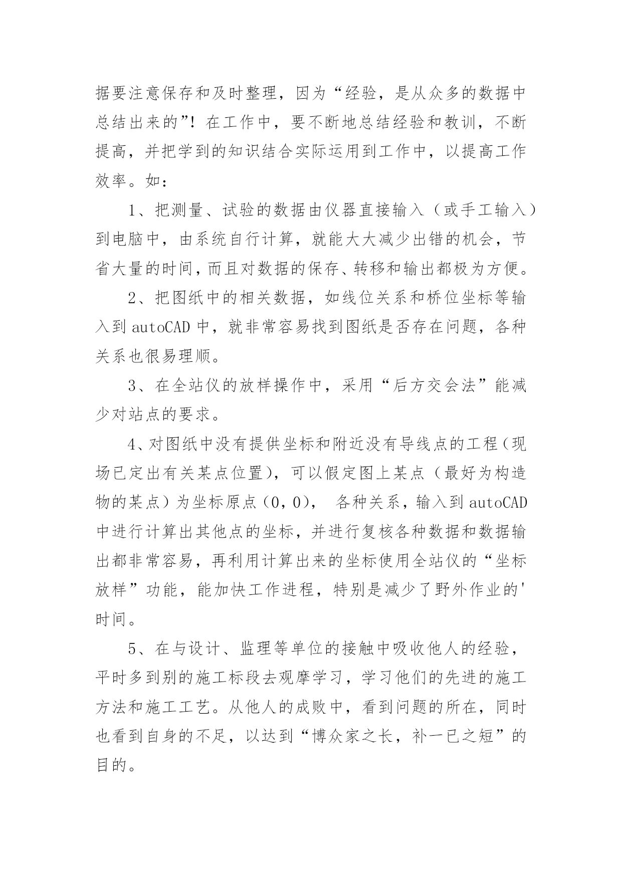 工程师个人专业技术工作总结工程师个人专业技术工作总结总结就是把一个时段的学习、工作或其完成情况进行一次全面系统的总结,它有助于我们寻找工作和事物发展的规律,从而掌握并运用这些规律,不如立即行动起来写一份总结吧。那么如何把总结写出新花样呢?下面是小编收集整理的工程师个人专业技术工作总结,仅供参考,大家一起来看看吧。工程师个人专业技术工作总结1本人自20xx年XX月获助理工程师以来,积极参与近几年公司公路与桥梁项目的建设。在公路工程技术工作岗位上勤奋工作,积极参与各个项目的技术方面的工作,努力发挥青年技术骨干作用,取得了很好的成绩。为了更好地发扬成绩,查找不足,现将这几年所从事的专业技术工作总结如下:一、在**兴汉路桥工程建设有限公司工作期间充分发挥主力军的作用,积极参与项目的技术工作、日常管理及安全方面的工作,特别是在施工过程中,充分发挥技术方面的特长,对施工过程中出现的问题,提出相应的解决方法,保障项目按计划完工;充分发挥知识及技术方面的优势,根据不同项目的技术难点工程编制相应的技术施工方案,制订相应的施工工作流程。二、在**晟强工程建设有限公司工作期间,制定近三年跨越发展工程工作方案,按“定人、定责、定时间、定进度”的“四定”要求,制定了各项工作任务分解流程,并按时跟踪落实重点项目的进展情况、对项目推进程中出现的问题提出解决的方案供领导选择,及时总结重点项目有推进过程中出现好的经验及方法,并在其他项目中推广;作为“实质工程”建设主要参与人,积极联系各主管单位,与相关业主单位制定项目任务分解,并根据倒排工期定期或不定期对路网工程、桥梁工程等项目的施工管理、质量、安全等方面的检查,对项目推进出现的技术问题提出积极可行的建议,为项目顺利推进起重要作用。除在工作中兢兢业业外,还积极强化自己的理论水平,先后参加土木工程等单位主持的学习,国家二级建造师执业资格考试,并获相应的毕业(执业)证书,为自己在工程技术方面打下坚实的理论基础。这些成绩的取得,主要得益于自己的努力和同事的支持,正是由于自己对技术的不断追求,才促成了业务水平的不断提高。现在不单能够胜任所从事的专业技术工作,还能在管理上有自己独到的方法。当然这些成绩的取得只能代表过去,面对新材料,新技术在公路工程行业不断应用的新局面,特别是现代融资方法、施工工艺不断更新的前提下,自己还有许多需要学习的地方。只有不断提高自己的专业理论和技术水平,才能更好地适**市建设的发展需要。工程师个人专业技术工作总结2时光荏苒,岁月如梭,转眼间从毕业参加工作到现在已有一年的时间了。在这一年的工作过程中,结合大学对土工工程专业所学,我不仅加深了对原来知识的学习理解,并且对以前书本中没有接触或接触不深的知识有了进一步的认识。工作以来,在单位领导的精心培育和教导下,通过自身的不断努力,无论是思想上、学习上还是工作上,都取得了长足的进步和巨大的收获,现将工作总结如下:一、思想上,爱国爱党、积极上进积极参加各种政治学习培训,努力提高自己的思想觉悟。从思想上更加拥护中国共产党的领导,也更加坚信走有中国特色的社会主义道路的正确性。自觉遵守我国有关法律法规,具有良好的职业道德和敬业精神。真正做到思想上扎扎实实,工作上踏踏实实。二、学习上,与时俱进,不断提高工作期间我发现自己在学校所学的理论知识与实际工程管理施工有一定的差别,完全按部就班一点也行不通,于是我虚心的向领导与同事们请教,刻苦钻研认真学习,经过领导与同事们的耐心指教和自己的不懈努力,自己的专业知识、技术水平、个人素质及业务能力都有了很大的提高。时代在发展,社会在进步。随着国家日新月异的发展,市场竞争也越来越激烈。这就要求我不断的学习和提高。自参加工作以来我先后参加了工程管理、总承包业务培训、施工现场安全管理人员培训、建筑法律法规及质量验收标准等等一系列的由社会和公司内部组织的培训,自己也不断的钻研与琢磨,把这些理论知识和专业技术真真实实的运用到实际工作中。三、工作中,任劳任怨,尽职尽责自20xx年参加工作以来,先后在公司总部,项目部,续建项目部工作。在总部期间,作为新生培训班班长,认真配合组织和参加了公司安排的各块培训,一则锻炼了自己的组织协调能力,一则也了解和认识了公司和岗位的实际情况,对于自己正式走上工程管理岗位大有裨益。在续建项目部期间,我始终抱着新人的态度,踏实肯干,虚心向领导和同事学习,努力把大学所学的理论知识与现场实际结合起来,互相优化,不断提高自己的理论知识和实践能力。在这里,我主要负责土建这块的现场施工管理,每天上现场检查分包单位施工情况,配合领导进行进度控制和质量控制,组织各方进行隐蔽工程验收,联系协调设计解决现场实际与图纸不符的问题等,由于这个项目主要是技改,子项都比较零星,但是我并没有轻视,都非常认真的对待自己职责范围内的事,并认