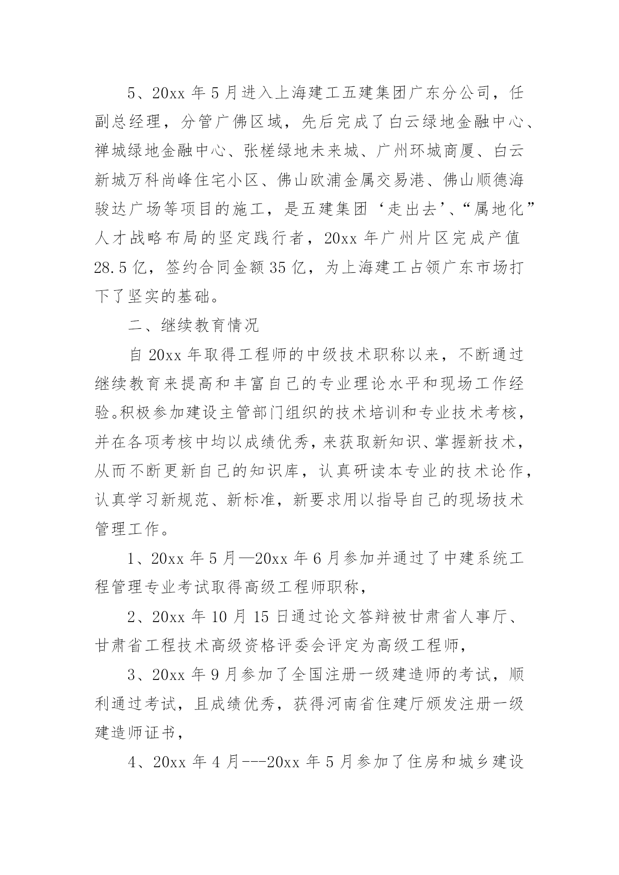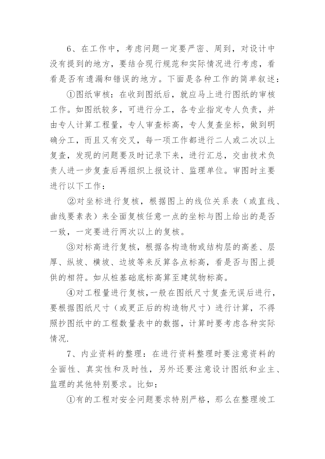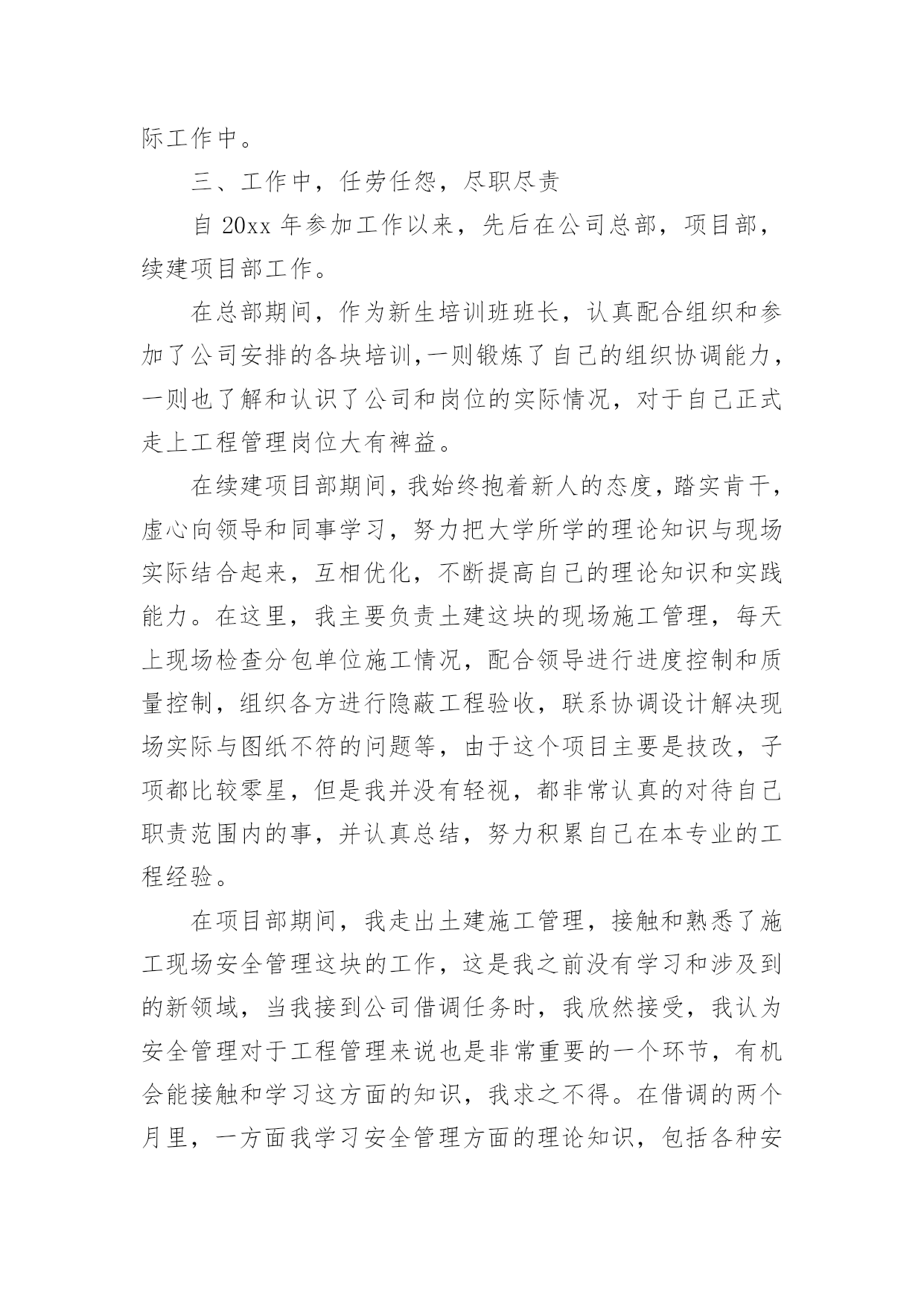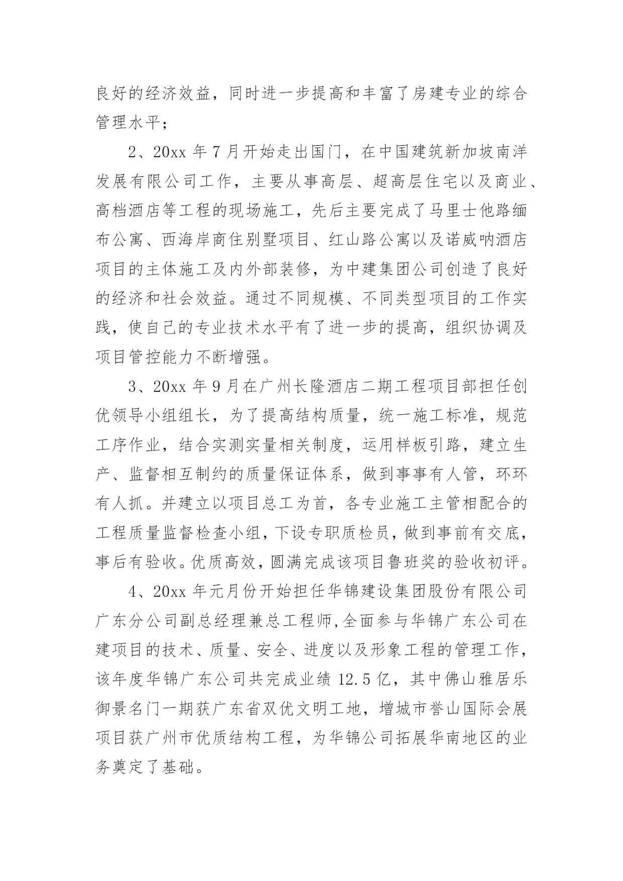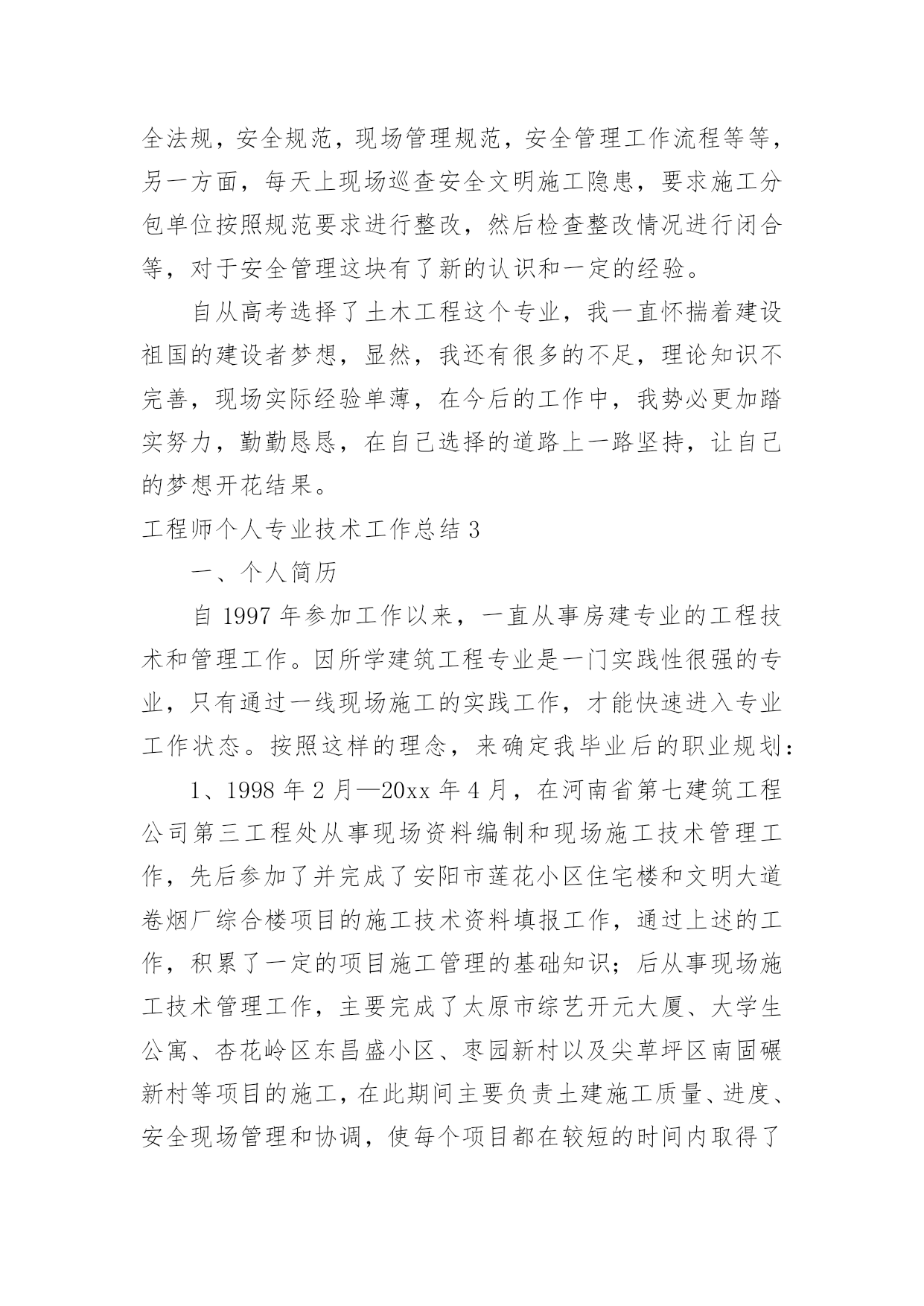 工程师个人专业技术工作总结工程师个人专业技术工作总结总结就是把一个时段的学习、工作或其完成情况进行一次全面系统的总结,它有助于我们寻找工作和事物发展的规律,从而掌握并运用这些规律,不如立即行动起来写一份总结吧。那么如何把总结写出新花样呢?下面是小编收集整理的工程师个人专业技术工作总结,仅供参考,大家一起来看看吧。工程师个人专业技术工作总结1本人自20xx年XX月获助理工程师以来,积极参与近几年公司公路与桥梁项目的建设。在公路工程技术工作岗位上勤奋工作,积极参与各个项目的技术方面的工作,努力发挥青年技术骨干作用,取得了很好的成绩。为了更好地发扬成绩,查找不足,现将这几年所从事的专业技术工作总结如下:一、在**兴汉路桥工程建设有限公司工作期间充分发挥主力军的作用,积极参与项目的技术工作、日常管理及安全方面的工作,特别是在施工过程中,充分发挥技术方面的特长,对施工过程中出现的问题,提出相应的解决方法,保障项目按计划完工;充分发挥知识及技术方面的优势,根据不同项目的技术难点工程编制相应的技术施工方案,制订相应的施工工作流程。二、在**晟强工程建设有限公司工作期间,制定近三年跨越发展工程工作方案,按“定人、定责、定时间、定进度”的“四定”要求,制定了各项工作任务分解流程,并按时跟踪落实重点项目的进展情况、对项目推进程中出现的问题提出解决的方案供领导选择,及时总结重点项目有推进过程中出现好的经验及方法,并在其他项目中推广;作为“实质工程”建设主要参与人,积极联系各主管单位,与相关业主单位制定项目任务分解,并根据倒排工期定期或不定期对路网工程、桥梁工程等项目的施工管理、质量、安全等方面的检查,对项目推进出现的技术问题提出积极可行的建议,为项目顺利推进起重要作用。除在工作中兢兢业业外,还积极强化自己的理论水平,先后参加土木工程等单位主持的学习,国家二级建造师执业资格考试,并获相应的毕业(执业)证书,为自己在工程技术方面打下坚实的理论基础。这些成绩的取得,主要得益于自己的努力和同事的支持,正是由于自己对技术的不断追求,才促成了业务水平的不断提高。现在不单能够胜任所从事的专业技术工作,还能在管理上有自己独到的方法。当然这些成绩的取得只能代表过去,面对新材料,新技术在公路工程行业不断应用的新局面,特别是现代融资方法、施工工艺不断更新的前提下,自己还有许多需要学习的地方。只有不断提高自己的专业理论和技术水平,才能更好地适**市建设的发展需要。工程师个人专业技术工作总结2时光荏苒,岁月如梭,转眼间从毕业参加工作到现在已有一年的时间了。在这一年的工作过程中,结合大学对土工工程专业所学,我不仅加深了对原来知识的学习理解,并且对以前书本中没有接触或接触不深的知识有了进一步的认识。工作以来,在单位领导的精心培育和教导下,通过自身的不断努力,无论是思想上、学习上还是工作上,都取得了长足的进步和巨大的收获,现将工作总结如下:一、思想上,爱国爱党、积极上进积极参加各种政治学习培训,努力提高自己的思想觉悟。从思想上更加拥护中国共产党的领导,也更加坚信走有中国特色的社会主义道路的正确性。自觉遵守我国有关法律法规,具有良好的职业道德和敬业精神。真正做到思想上扎扎实实,工作上踏踏实实。二、学习上,与时俱进,不断提高工作期间我发现自己在学校所学的理论知识与实际工程管理施工有一定的差别,完全按部就班一点也行不通,于是我虚心的向领导与同事们请教,刻苦钻研认真学习,经过领导与同事们的耐心指教和自己的不懈努力,自己的专业知识、技术水平、个人素质及业务能力都有了很大的提高。时代在发展,社会在进步。随着国家日新月异的发展,市场竞争也越来越激烈。这就要求我不断的学习和提高。自参加工作以来我先后参加了工程管理、总承包业务培训、施工现场安全管理人员培训、建筑法律法规及质量验收标准等等一系列的由社会和公司内部组织的培训,自己也不断的钻研与琢磨,把这些理论知识和专业技术真真实实的运用到实际工作中。三、工作中,任劳任怨,尽职尽责自20xx年参加工作以来,先后在公司总部,项目部,续建项目部工作。在总部期间,作为新生培训班班长,认真配合组织和参加了公司安排的各块培训,一则锻炼了自己的组织协调能力,一则也了解和认识了公司和岗位的实际情况,对于自己正式走上工程管理岗位大有裨益。在续建项目部期间,我始终抱着新人的态度,踏实肯干,虚心向领导和同事学习,努力把大学所学的理论知识与现场实际结合起来,互相优化,不断提高自己的理论知识和实践能力。在这里,我主要负责土建这块的现场施工管理,每天上现场检查分包单位施工情况,配合领导进行进度控制和质量控制,组织各方进行隐蔽工程验收,联系协调设计解决现场实际与图纸不符的问题等,由于这个项目主要是技改,子项都比较零星,但是我并没有轻视,都非常认真的对待自己职责范围内的事,并认