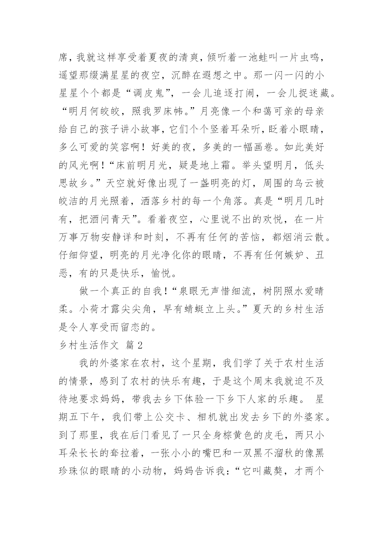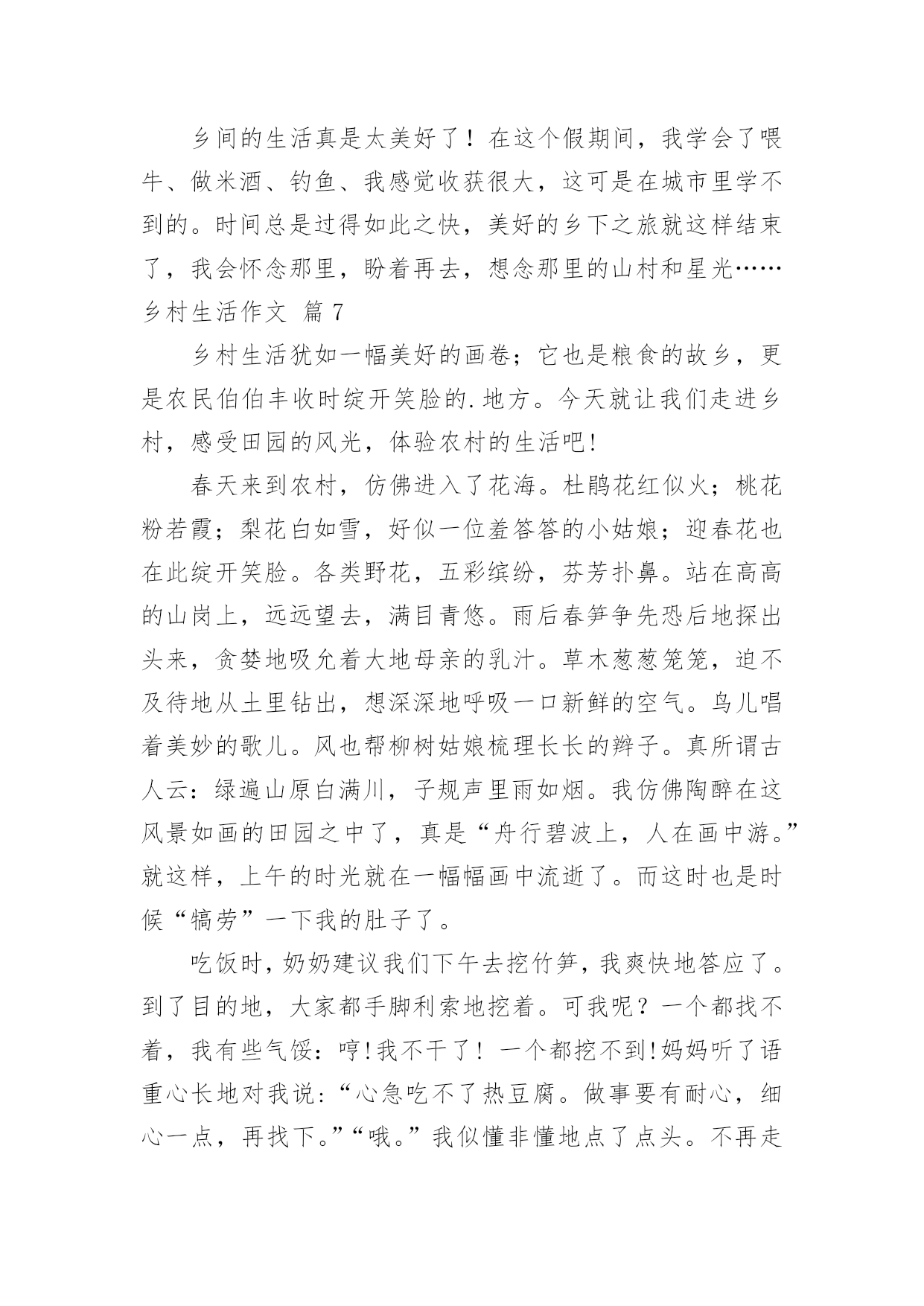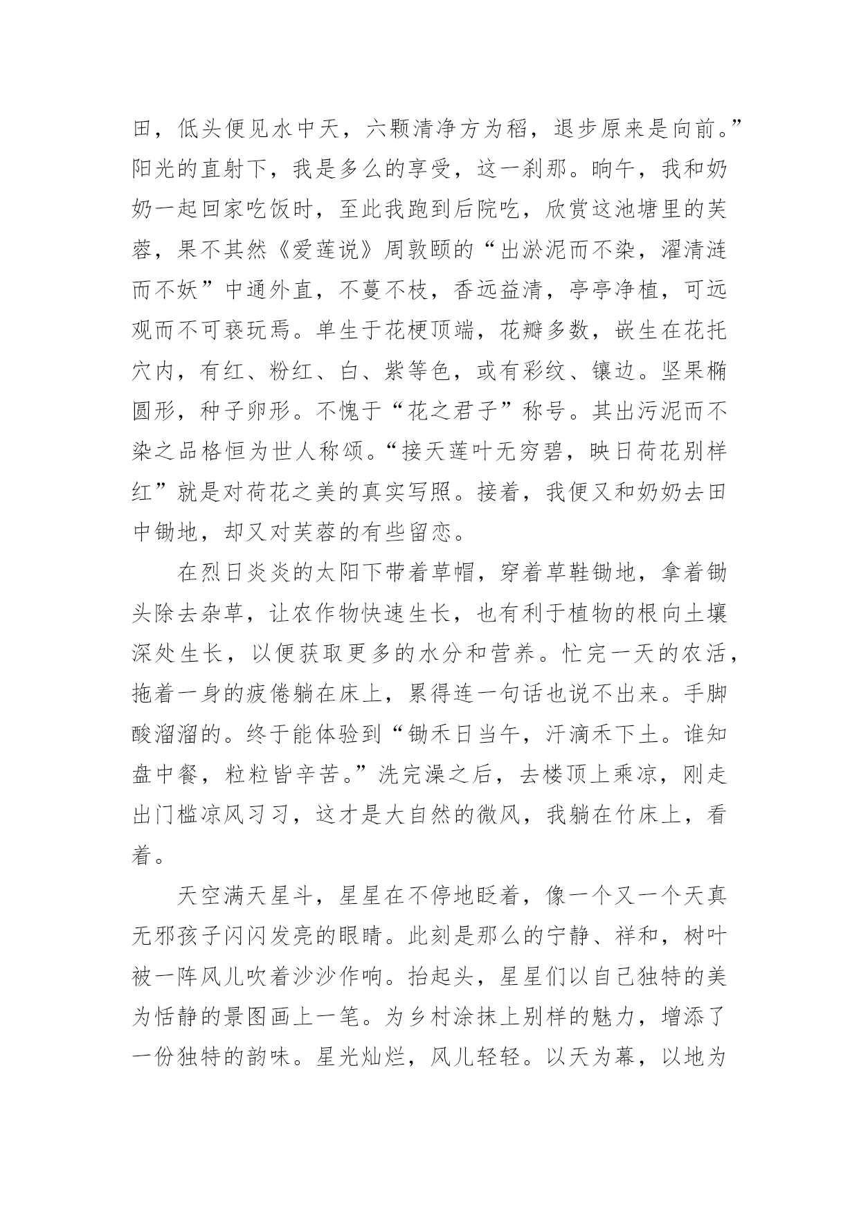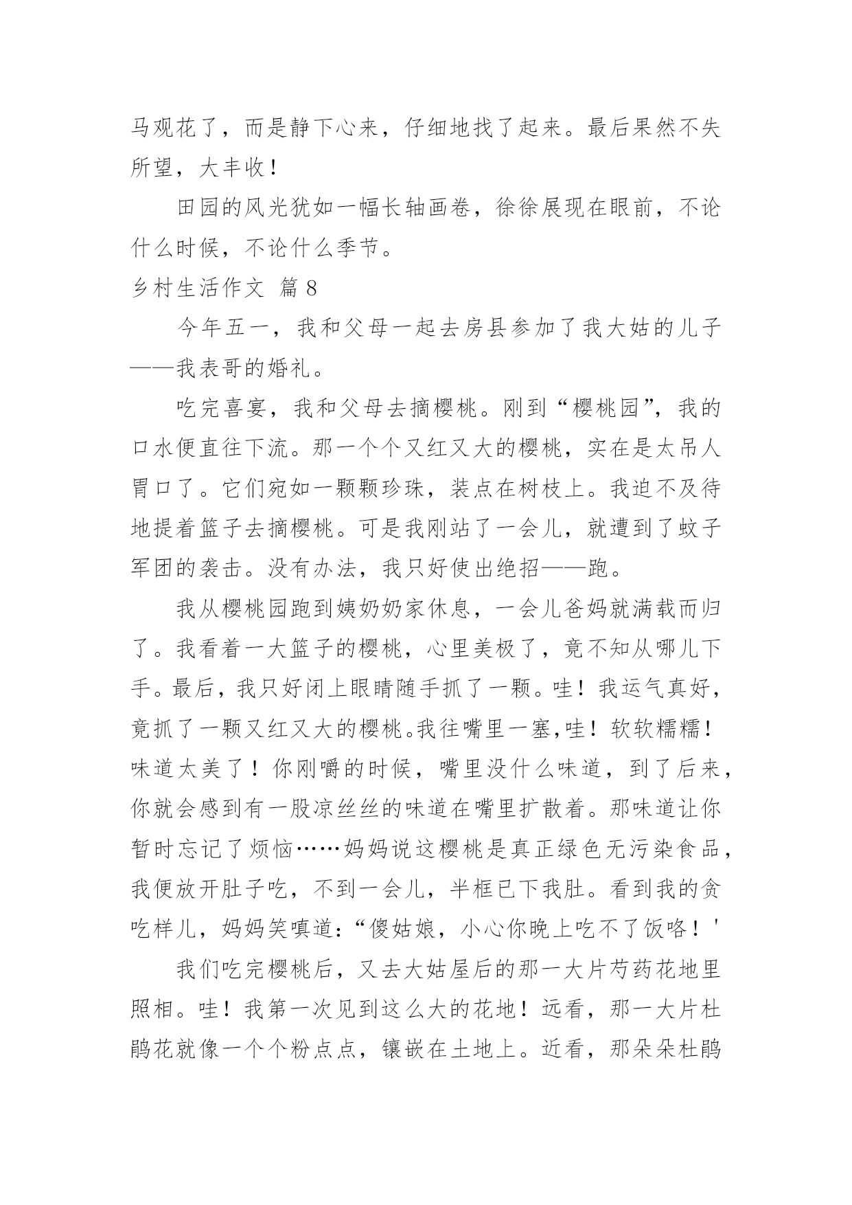 乡村生活作文【精华】乡村生活作文9篇在日常学习、工作和生活中,大家都有写作文的经历,对作文很是熟悉吧,根据写作命题的特点,作文可以分为命题作文和非命题作文。为了让您在写作文时更加简单方便,下面是小编整理的乡村生活作文9篇,供大家参考借鉴,希望可以帮助到有需要的朋友。乡村生活作文篇1我们像以前那般去乡下度过暑假,我在城市的小镇中度过了十四年的春秋,已经厌倦城市的喧器。我喜欢乡下“榆柳阴后檐,桃李罗堂前”的田园生活。这是诗人陶渊明梦寐以求的归宿,也是我所要表达的心声。我喜欢夏天,每回在乡下,父亲就像一个七八十岁的老太太唠叨着,说不停。说起他过往的经历,“想当年,想当年。”因为周边的环境他太熟悉了,迫不及待与他人分享。而我却在他旁边洗耳恭听。没错,到现在亲身经历,长知识了,对于父亲的述说更加印象深刻。“咯咯咯……”每家每户的公鸡站在木庄上打鸣,便告诉人们应该起床干活了。听父亲说,他们以前没有闹钟看时间起床,只能靠公鸡打鸣起床干农活就像现在的闹钟,可那时却是凌晨四五点。我也不能偷懒便跟着他们起来了。今天要下田插秧,没体验过便虚心请教地问奶奶,奶奶一边插秧一边讲述,我便有模有样地效仿。“手把青苗插野田,低头便见水中天,六颗清净方为稻,退步原来是向前。”阳光的直射下,我是多么的享受,这一刹那。晌午,我和奶奶一起回家吃饭时,至此我跑到后院吃,欣赏这池塘里的芙蓉,果不其然《爱莲说》周敦颐的“出淤泥而不染,濯清涟而不妖”中通外直,不蔓不枝,香远益清,亭亭净植,可远观而不可亵玩焉。单生于花梗顶端,花瓣多数,嵌生在花托穴内,有红、粉红、白、紫等色,或有彩纹、镶边。坚果椭圆形,种子卵形。不愧于“花之君子”称号。其出污泥而不染之品格恒为世人称颂。“接天莲叶无穷碧,映日荷花别样红”就是对荷花之美的真实写照。接着,我便又和奶奶去田中锄地,却又对芙蓉的有些留恋。在烈日炎炎的太阳下带着草帽,穿着草鞋锄地,拿着锄头除去杂草,让农作物快速生长,也有利于植物的根向土壤深处生长,以便获取更多的水分和营养。忙完一天的农活,拖着一身的疲倦躺在床上,累得连一句话也说不出来。手脚酸溜溜的。终于能体验到“锄禾日当午,汗滴禾下土。谁知盘中餐,粒粒皆辛苦。”洗完澡之后,去楼顶上乘凉,刚走出门槛凉风习习,这才是大自然的微风,我躺在竹床上,看着。天空满天星斗,星星在不停地眨着,像一个又一个天真无邪孩子闪闪发亮的眼睛。此刻是那么的宁静、祥和,树叶被一阵风儿吹着沙沙作响。抬起头,星星们以自己独特的美为恬静的景图画上一笔。为乡村涂抹上别样的魅力,增添了一份独特的韵味。星光灿烂,风儿轻轻。以天为幕,以地为席,我就这样享受着夏夜的清爽,倾听着一池蛙叫一片虫鸣,遥望那缀满星星的夜空,沉醉在遐想之中。那一闪一闪的小星星个个都是“调皮鬼”,一会儿追逐打闹,一会儿捉迷藏。“明月何皎皎,照我罗床帏。”月亮像一个和蔼可亲的母亲给自己的孩子讲小故事,它们个个竖着耳朵听,眨着小眼睛,多么可爱的笑容啊!好美的夜,多美的一幅画卷。如此美好的风光啊!“床前明月光,疑是地上霜。举头望明月,低头思故乡。”天空就好像出现了一盏明亮的灯,周围的乌云被皎洁的月光照着,洒落乡村的每一个角落。真是“明月几时有,把酒问青天”。看着夜空,心里说不出的欢悦,在一片万事万物安静详和时刻,不再有任何的苦恼,都烟消云散。仔细仰望,明亮的月光净化你的眼睛,不再有任何嫉妒、丑恶,有的只是快乐,愉悦。做一个真正的自我!“泉眼无声惜细流,树阴照水爱晴柔。小荷才露尖尖角,早有蜻蜓立上头。”夏天的乡村生活是令人享受而留恋的。乡村生活作文篇2我的外婆家在农村,这个星期,我们学了关于农村生活的情景,感到了农村的快乐有趣,于是这个周末我就迫不及待地要求妈妈,带我去乡下体验一下乡下人家的乐趣。星期五下午,我们带上公交卡、相机就出发去乡下的外婆家。到了那里,我在后门看见了一只全身棕黄色的皮毛,两只小耳朵长长的耷拉着,一张小小的嘴巴和一双黑不溜秋的像黑珍珠似的眼睛的小动物,妈妈告诉我:“它叫藏獒,才两个月大。”我怕它咬我,一看见它跑过来,我就飞也似的逃走了。来到前面的豌豆地里,几只母鸡正在觅食,一看见我就四处乱窜,我只能站在远处静静地看着。来到外婆家的院子里,几只鸭子“嘎嘎”地叫着,似乎在说:“小坏蛋来啦,快跑。”吓得竹林里的小猫咪也逃走了,顺着“叽叽喳喳”的叫声抬头看看,咦,一只麻雀停在电线上,仿佛是乐谱上的一个音符,真可爱啊!我又拿着相机跑到田里,哇!大白鹅,他们一看见我过来了,有的“鹅鹅鹅”地叫着,有的扇动着翅膀,有的“突突突突突”地喝着田里的泥浆,它们一会儿排着一溜的整齐的队伍,一会儿跑到田里随便走走,真是有趣!到了晚饭时间,我只好恋恋不舍的回外婆家去吃饭了,我一看,素的多,荤的少,有现割的韭菜、青菜,现摘的香椿芽、青瓜、蒜苗、豌豆,真新鲜,真是美味佳肴