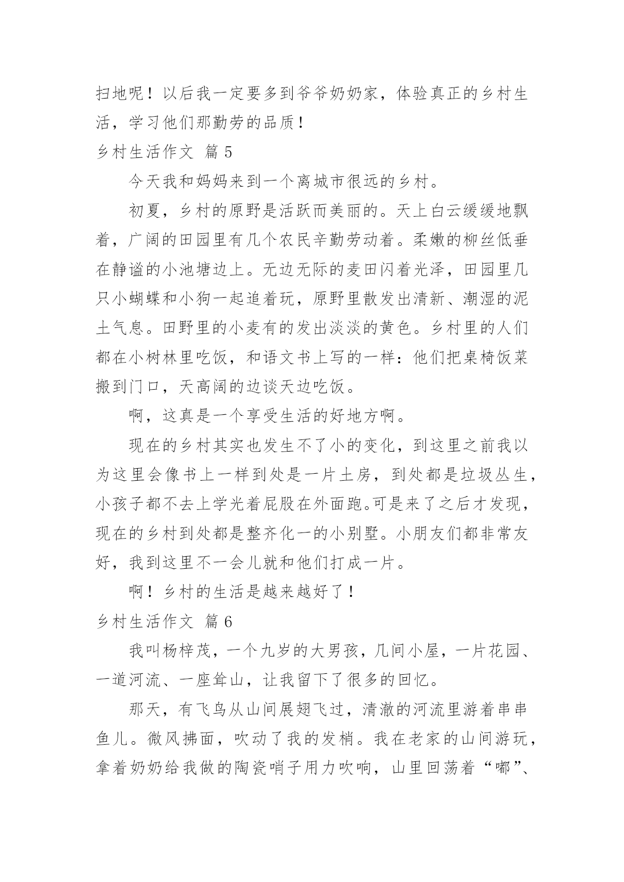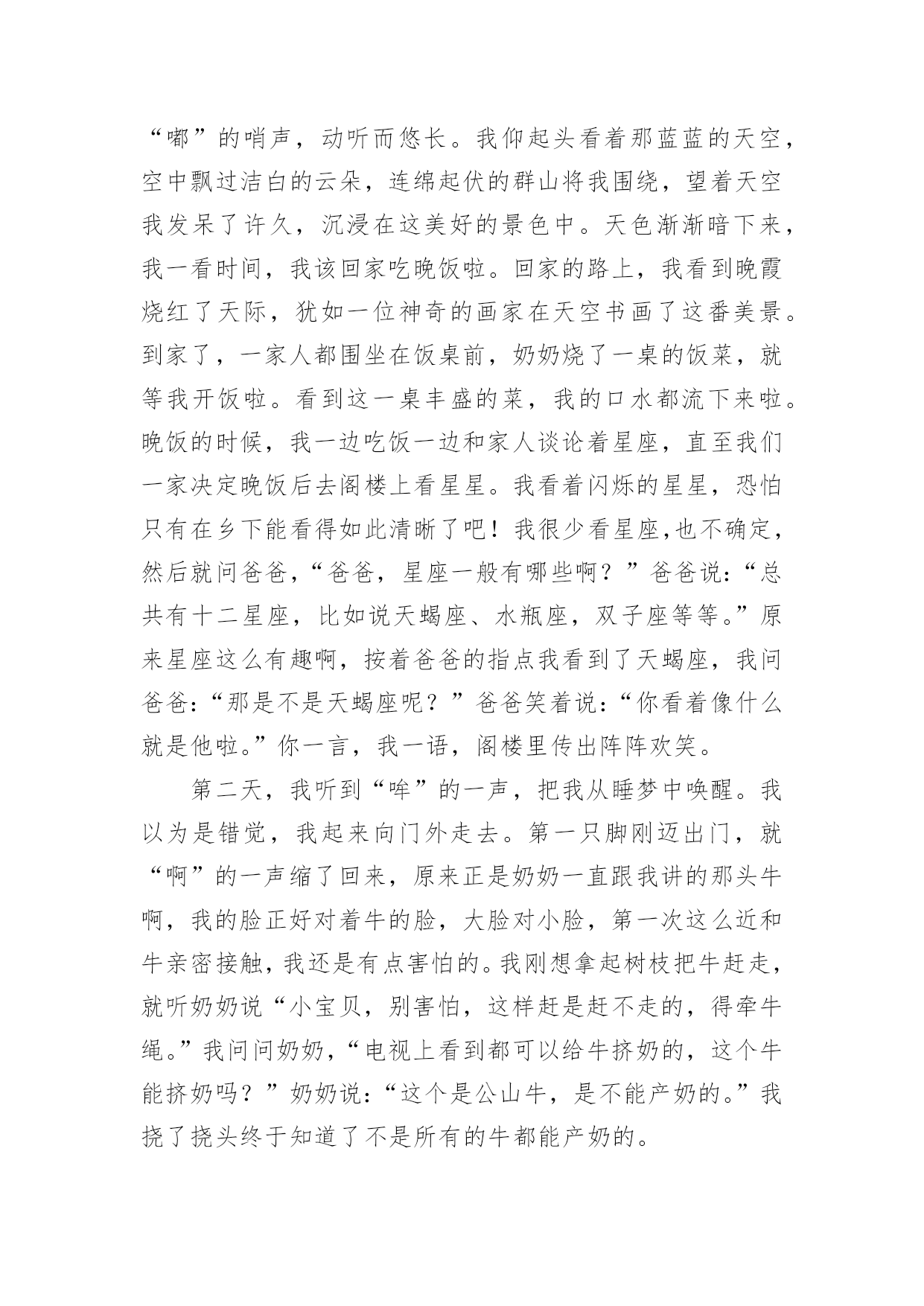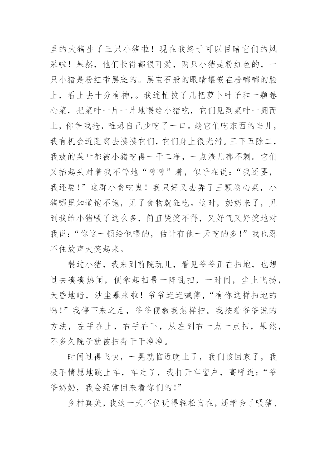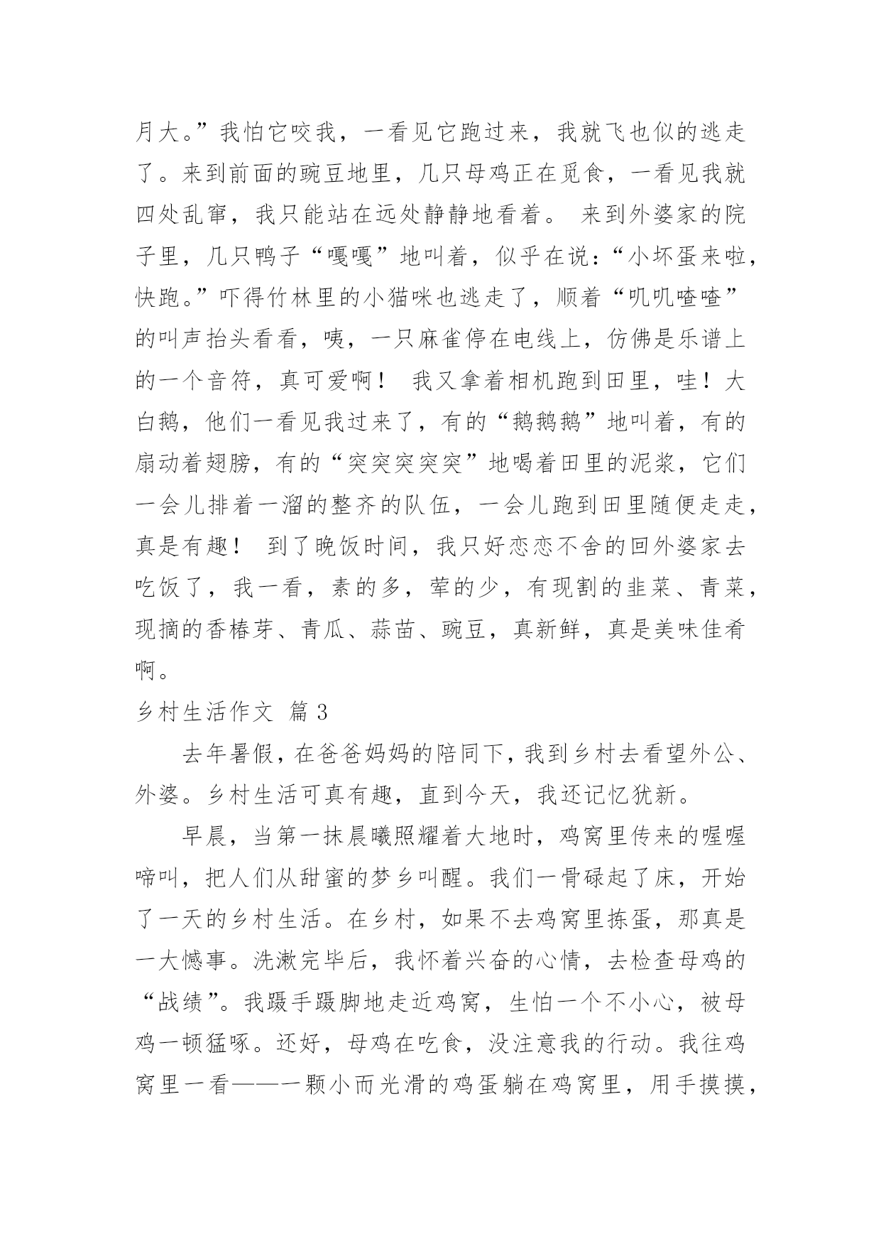 乡村生活作文【精华】乡村生活作文9篇在日常学习、工作和生活中,大家都有写作文的经历,对作文很是熟悉吧,根据写作命题的特点,作文可以分为命题作文和非命题作文。为了让您在写作文时更加简单方便,下面是小编整理的乡村生活作文9篇,供大家参考借鉴,希望可以帮助到有需要的朋友。乡村生活作文篇1我们像以前那般去乡下度过暑假,我在城市的小镇中度过了十四年的春秋,已经厌倦城市的喧器。我喜欢乡下“榆柳阴后檐,桃李罗堂前”的田园生活。这是诗人陶渊明梦寐以求的归宿,也是我所要表达的心声。我喜欢夏天,每回在乡下,父亲就像一个七八十岁的老太太唠叨着,说不停。说起他过往的经历,“想当年,想当年。”因为周边的环境他太熟悉了,迫不及待与他人分享。而我却在他旁边洗耳恭听。没错,到现在亲身经历,长知识了,对于父亲的述说更加印象深刻。“咯咯咯……”每家每户的公鸡站在木庄上打鸣,便告诉人们应该起床干活了。听父亲说,他们以前没有闹钟看时间起床,只能靠公鸡打鸣起床干农活就像现在的闹钟,可那时却是凌晨四五点。我也不能偷懒便跟着他们起来了。今天要下田插秧,没体验过便虚心请教地问奶奶,奶奶一边插秧一边讲述,我便有模有样地效仿。“手把青苗插野田,低头便见水中天,六颗清净方为稻,退步原来是向前。”阳光的直射下,我是多么的享受,这一刹那。晌午,我和奶奶一起回家吃饭时,至此我跑到后院吃,欣赏这池塘里的芙蓉,果不其然《爱莲说》周敦颐的“出淤泥而不染,濯清涟而不妖”中通外直,不蔓不枝,香远益清,亭亭净植,可远观而不可亵玩焉。单生于花梗顶端,花瓣多数,嵌生在花托穴内,有红、粉红、白、紫等色,或有彩纹、镶边。坚果椭圆形,种子卵形。不愧于“花之君子”称号。其出污泥而不染之品格恒为世人称颂。“接天莲叶无穷碧,映日荷花别样红”就是对荷花之美的真实写照。接着,我便又和奶奶去田中锄地,却又对芙蓉的有些留恋。在烈日炎炎的太阳下带着草帽,穿着草鞋锄地,拿着锄头除去杂草,让农作物快速生长,也有利于植物的根向土壤深处生长,以便获取更多的水分和营养。忙完一天的农活,拖着一身的疲倦躺在床上,累得连一句话也说不出来。手脚酸溜溜的。终于能体验到“锄禾日当午,汗滴禾下土。谁知盘中餐,粒粒皆辛苦。”洗完澡之后,去楼顶上乘凉,刚走出门槛凉风习习,这才是大自然的微风,我躺在竹床上,看着。天空满天星斗,星星在不停地眨着,像一个又一个天真无邪孩子闪闪发亮的眼睛。此刻是那么的宁静、祥和,树叶被一阵风儿吹着沙沙作响。抬起头,星星们以自己独特的美为恬静的景图画上一笔。为乡村涂抹上别样的魅力,增添了一份独特的韵味。星光灿烂,风儿轻轻。以天为幕,以地为席,我就这样享受着夏夜的清爽,倾听着一池蛙叫一片虫鸣,遥望那缀满星星的夜空,沉醉在遐想之中。那一闪一闪的小星星个个都是“调皮鬼”,一会儿追逐打闹,一会儿捉迷藏。“明月何皎皎,照我罗床帏。”月亮像一个和蔼可亲的母亲给自己的孩子讲小故事,它们个个竖着耳朵听,眨着小眼睛,多么可爱的笑容啊!好美的夜,多美的一幅画卷。如此美好的风光啊!“床前明月光,疑是地上霜。举头望明月,低头思故乡。”天空就好像出现了一盏明亮的灯,周围的乌云被皎洁的月光照着,洒落乡村的每一个角落。真是“明月几时有,把酒问青天”。看着夜空,心里说不出的欢悦,在一片万事万物安静详和时刻,不再有任何的苦恼,都烟消云散。仔细仰望,明亮的月光净化你的眼睛,不再有任何嫉妒、丑恶,有的只是快乐,愉悦。做一个真正的自我!“泉眼无声惜细流,树阴照水爱晴柔。小荷才露尖尖角,早有蜻蜓立上头。”夏天的乡村生活是令人享受而留恋的。乡村生活作文篇2我的外婆家在农村,这个星期,我们学了关于农村生活的情景,感到了农村的快乐有趣,于是这个周末我就迫不及待地要求妈妈,带我去乡下体验一下乡下人家的乐趣。星期五下午,我们带上公交卡、相机就出发去乡下的外婆家。到了那里,我在后门看见了一只全身棕黄色的皮毛,两只小耳朵长长的耷拉着,一张小小的嘴巴和一双黑不溜秋的像黑珍珠似的眼睛的小动物,妈妈告诉我:“它叫藏獒,才两个月大。”我怕它咬我,一看见它跑过来,我就飞也似的逃走了。来到前面的豌豆地里,几只母鸡正在觅食,一看见我就四处乱窜,我只能站在远处静静地看着。来到外婆家的院子里,几只鸭子“嘎嘎”地叫着,似乎在说:“小坏蛋来啦,快跑。”吓得竹林里的小猫咪也逃走了,顺着“叽叽喳喳”的叫声抬头看看,咦,一只麻雀停在电线上,仿佛是乐谱上的一个音符,真可爱啊!我又拿着相机跑到田里,哇!大白鹅,他们一看见我过来了,有的“鹅鹅鹅”地叫着,有的扇动着翅膀,有的“突突突突突”地喝着田里的泥浆,它们一会儿排着一溜的整齐的队伍,一会儿跑到田里随便走走,真是有趣!到了晚饭时间,我只好恋恋不舍的回外婆家去吃饭了,我一看,素的多,荤的少,有现割的韭菜、青菜,现摘的香椿芽、青瓜、蒜苗、豌豆,真新鲜,真是美味佳肴