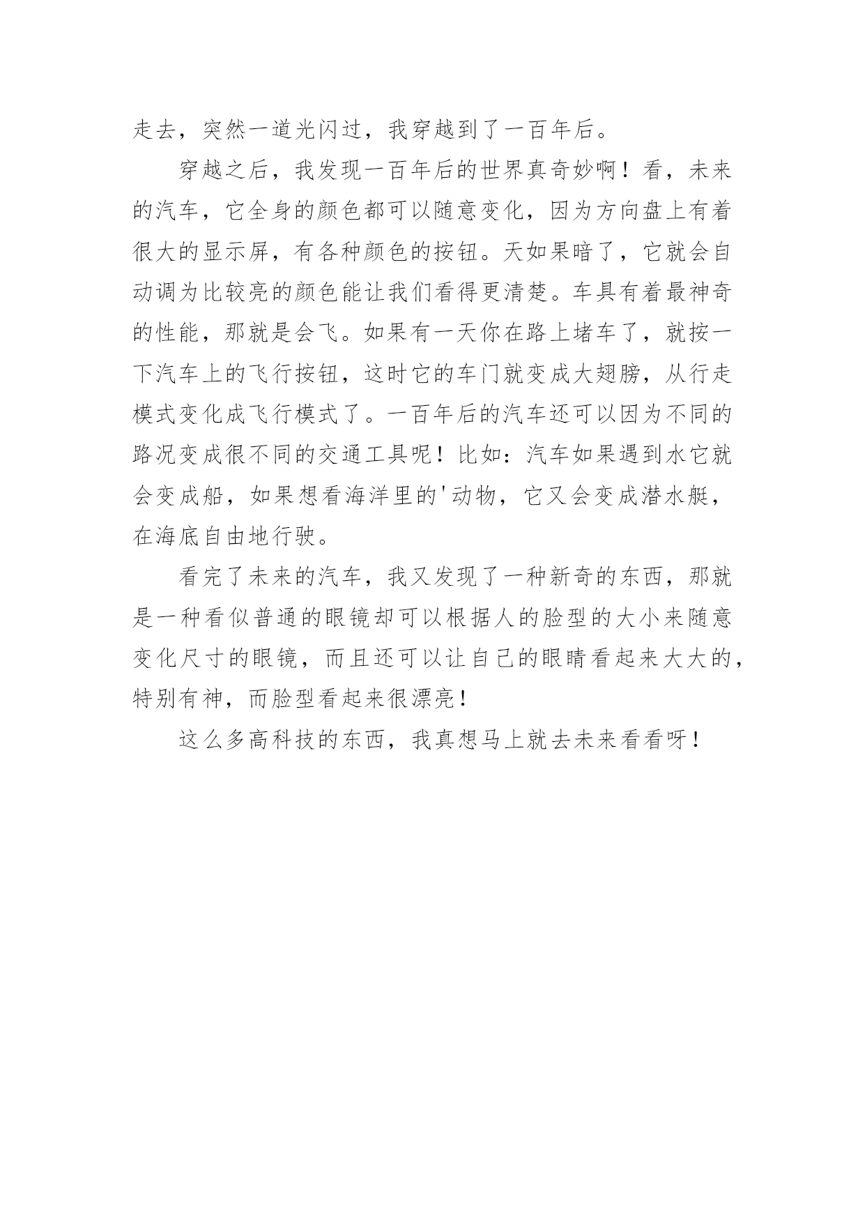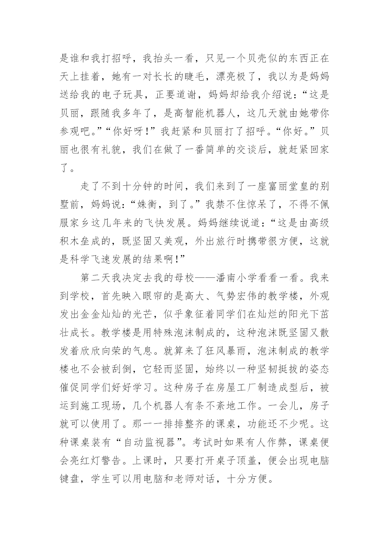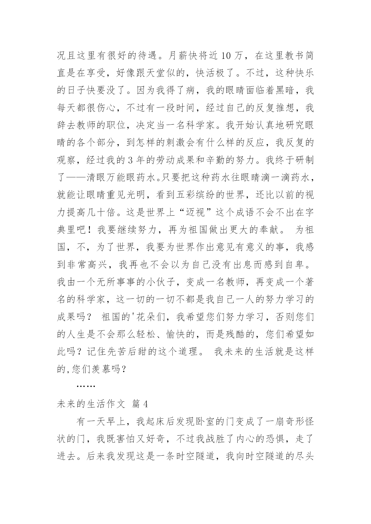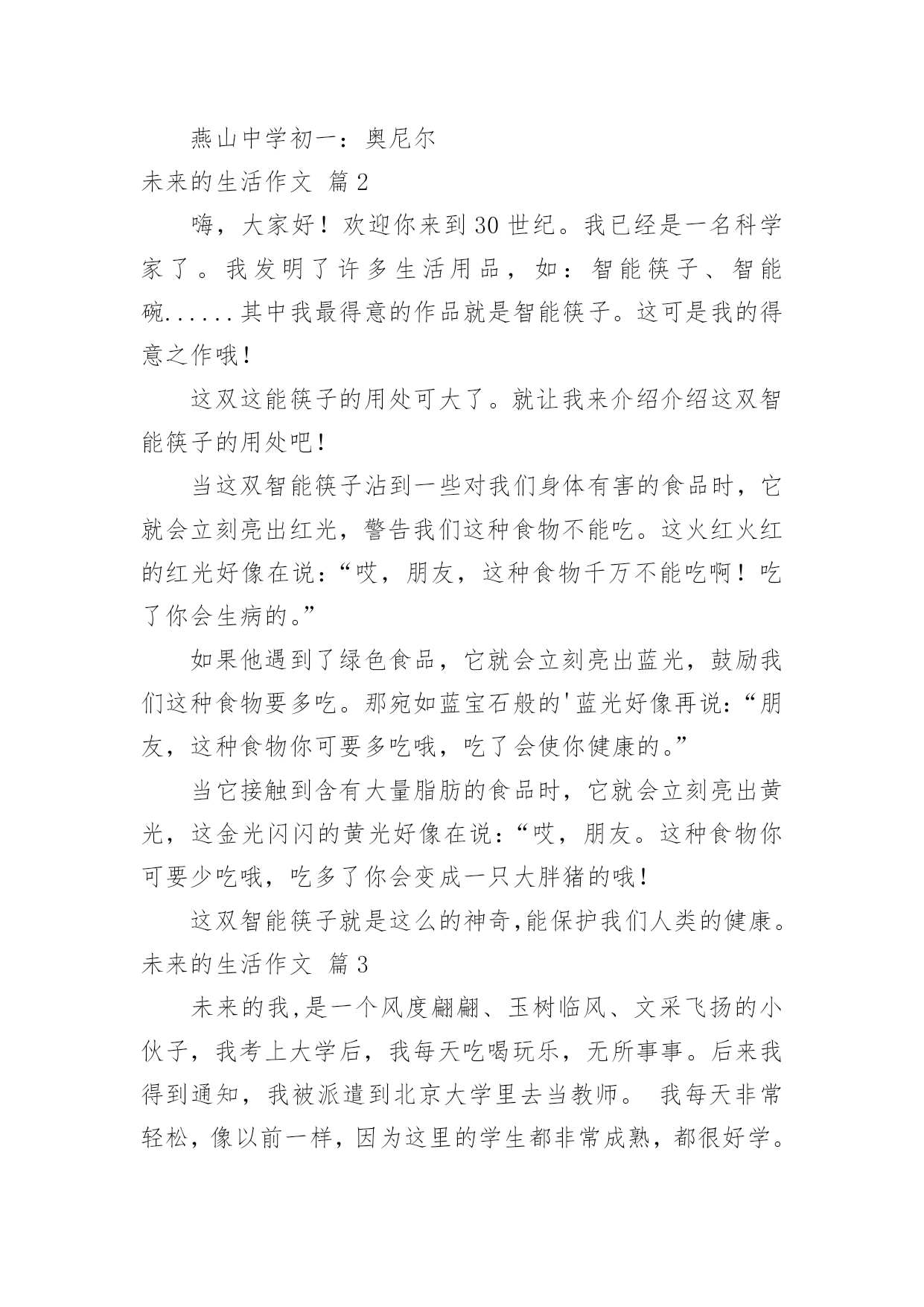 未来的生活作文精选未来的生活作文合集四篇在日复一日的学习、工作或生活中,许多人都写过作文吧,写作文是培养人们的观察力、联想力、想象力、思考力和记忆力的重要手段。你知道作文怎样写才规范吗?下面是小编为大家收集的未来的生活作文5篇,欢迎大家分享。未来的生活作文篇1几十年后,我已经在月球定居了,这个星期六,我准备回家。星期六一大早,我就起了床,准备坐宇宙飞船回家乡看看。坐了几秒钟的宇宙飞船,我觉得大概到了,便下了船。眼前是一个山清水秀的地方,远处的工厂正在工作,奇怪的是,这个工厂不但不冒烟,还传出了阵阵香气,轻轻一吸,使人心旷神怡。低头一看,面前的小溪碧波荡漾,河面上上竟然种植着一棵棵树,这些树可不是普通的树,上面悬挂着一种种即食食品,一阵阵香味扑面而来,馋得我直流口水。我疑心这不是我的家乡,正准备上船时,忽然听到一声熟悉的喊叫:“姝衡!姝衡!”我回头一看,原来是妈妈,待我回过神来时,妈妈已经站在我的'面前了。我正惊叹于她的走路速度,仔细一问原来妈妈的脚上安了一种轮子,平常是看不见的,就像身体上的某个器官一样,长在了上面,如果觉得不方便时也可以拆下来。“嗨!你好!”我正惊叹于家乡飞快的发展速度,不知是谁和我打招呼,我抬头一看,只见一个贝壳似的东西正在天上挂着,她有一对长长的睫毛,漂亮极了,我以为是妈妈送给我的电子玩具,正要道谢,妈妈却给我介绍说:“这是贝丽,跟随我多年了,是高智能机器人,这几天就由她带你参观吧。”“你好呀!”我赶紧和贝丽打了招呼。“你好。”贝丽也很有礼貌,我们在做了一番简单的交谈后,就赶紧回家了。走了不到十分钟的时间,我们来到了一座富丽堂皇的别墅前,妈妈说:“姝衡,到了。”我禁不住惊呆了,不得不佩服家乡这几年来的飞快发展。妈妈继续说道:“这是由高级积木垒成的,既坚固又美观,外出旅行时携带很方便,这就是科学飞速发展的结果啊!”第二天我决定去我的母校——潘南小学看看一看。我来到学校,首先映入眼帘的是高大、气势宏伟的教学楼,外观发出金金灿灿的光芒,似乎象征着同学们在灿烂的阳光下茁壮成长。教学楼是用特殊泡沫制成的,这种泡沫既坚固又散发着欣欣向荣的气息。就算来了狂风暴雨,泡沫制成的教学楼也不会被刮倒,它轻而坚固,始终以一种坚韧挺拔的姿态催促同学们好好学习。这种房子在房屋工厂制造成型后,被运到施工现场,几个机器人有条不紊地工作。一会儿,房子就可以使用了。那一一排排整齐的课桌,功能还不少呢。这种课桌装有“自动监视器”。考试时如果有人作弊,课桌便会亮红灯警告。上课时,只要打开桌子顶盖,便会出现电脑键盘,学生可以用电脑和老师对话,十分方便。燕山中学初一:奥尼尔未来的生活作文篇2嗨,大家好!欢迎你来到30世纪。我已经是一名科学家了。我发明了许多生活用品,如:智能筷子、智能碗......其中我最得意的作品就是智能筷子。这可是我的得意之作哦!这双这能筷子的用处可大了。就让我来介绍介绍这双智能筷子的用处吧!当这双智能筷子沾到一些对我们身体有害的食品时,它就会立刻亮出红光,警告我们这种食物不能吃。这火红火红的红光好像在说:“哎,朋友,这种食物千万不能吃啊!吃了你会生病的。”如果他遇到了绿色食品,它就会立刻亮出蓝光,鼓励我们这种食物要多吃。那宛如蓝宝石般的'蓝光好像再说:“朋友,这种食物你可要多吃哦,吃了会使你健康的。”当它接触到含有大量脂肪的食品时,它就会立刻亮出黄光,这金光闪闪的黄光好像在说:“哎,朋友。这种食物你可要少吃哦,吃多了你会变成一只大胖猪的哦!这双智能筷子就是这么的神奇,能保护我们人类的健康。未来的生活作文篇3未来的我,是一个风度翩翩、玉树临风、文采飞扬的小伙子,我考上大学后,我每天吃喝玩乐,无所事事。后来我得到通知,我被派遣到北京大学里去当教师。我每天非常轻松,像以前一样,因为这里的学生都非常成熟,都很好学。况且这里有很好的待遇。月薪快将近10万,在这里教书简直是在享受,好像跟天堂似的,快活极了。不过,这种快乐的日子快要没了。因为我得了病,我的眼睛面临着黑暗,我每天都很伤心,不过有一段时间,经过自己的反复推想,我辞去教师的职位,决定当一名科学家。我开始认真地研究眼睛的各个部分,到怎样的刺激会有什么样的反应,我反复的观察,经过我的3年的劳动成果和辛勤的努力。我终于研制了——清眼万能眼药水。只要把这种药水往眼睛滴一滴药水,就能让眼睛重见光明,看到五彩缤纷的世界,还比以前的视力提高几十倍。这是世界上“迈视”这个成语不会不出在字典里吧!我要继续努力,再为祖国做出更大的奉献。为祖国,不,为了世界,我要为世界作出意见有意义的事,我感到非常高兴,我再也不会以为自己没有出息而感到自卑。我由一个无所事事的小伙子,变成一名教师,再变成一个著名的科学家,这一切的一切不都是我自己一人的努力学习的成果吗?祖国的'花朵们,我希望您们努力学习,否则您们的