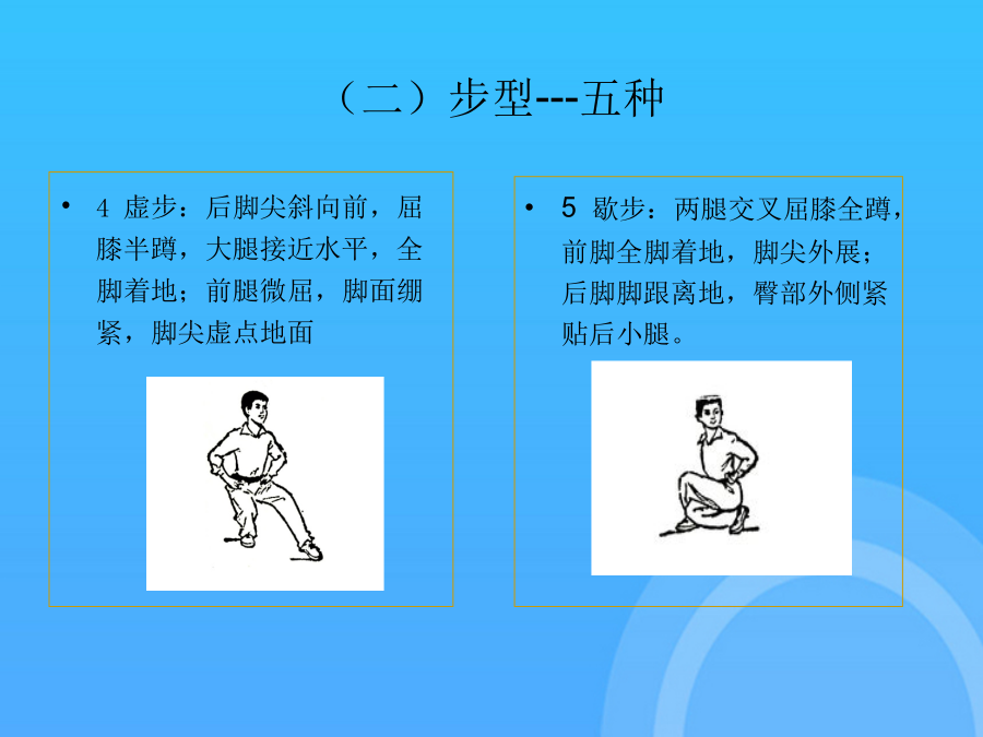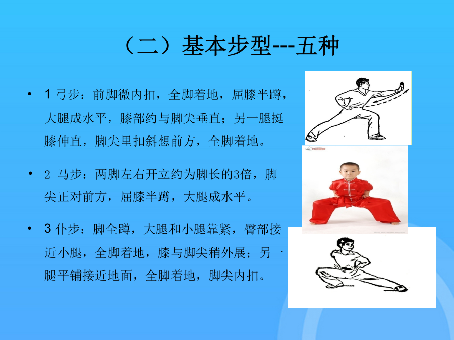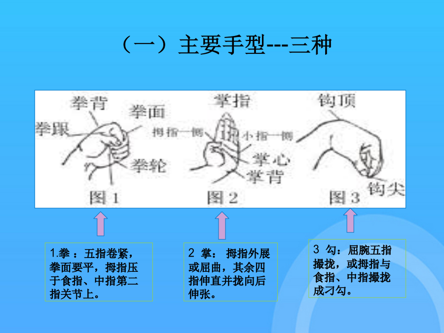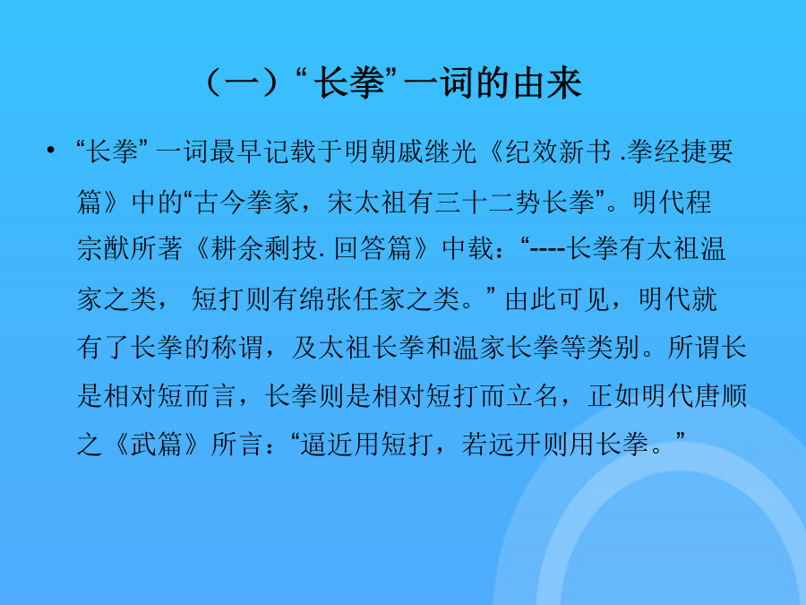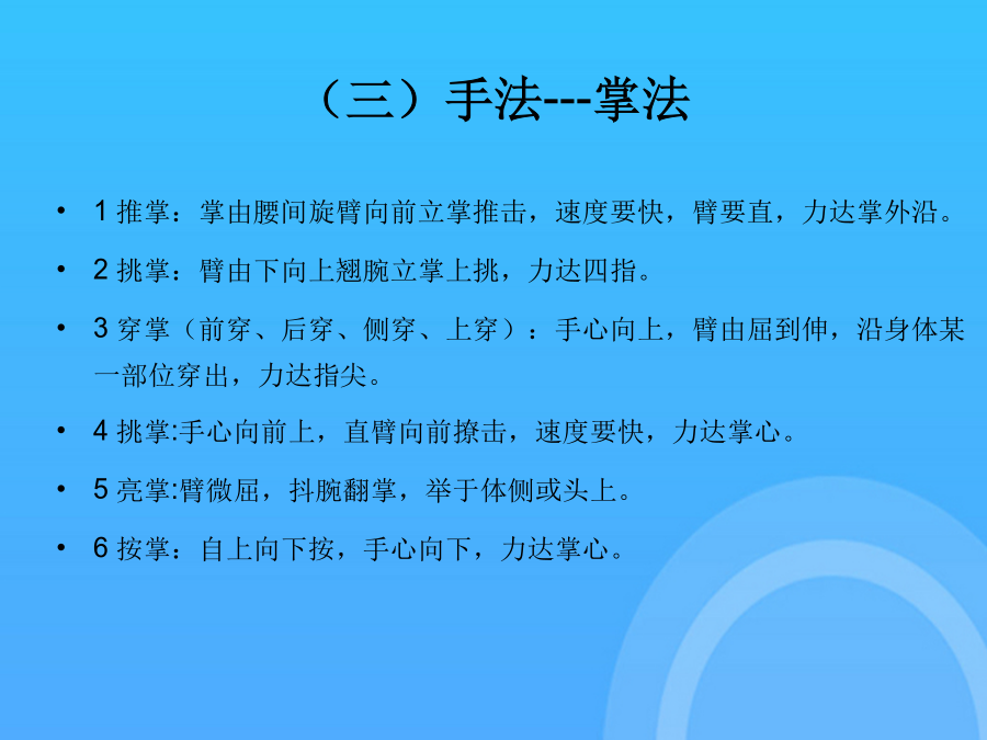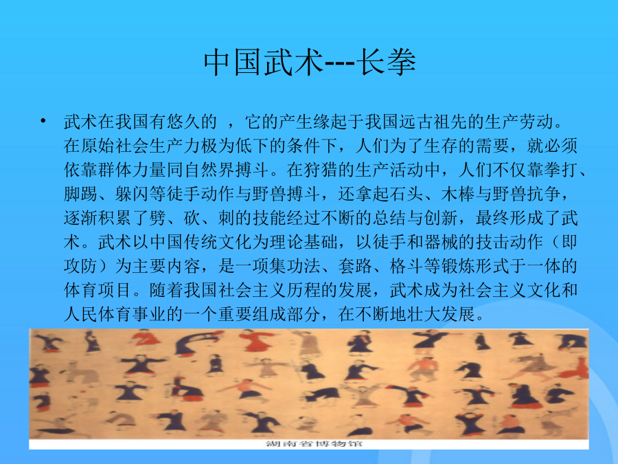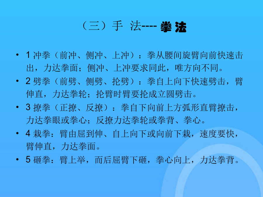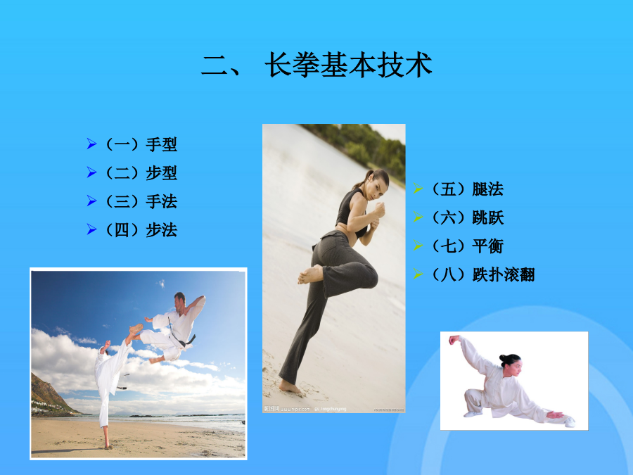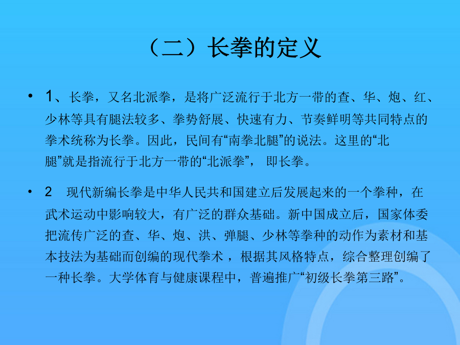 长拳选项课理论学习资料中国武术---长拳(一)“长拳”一词的由来(二)长拳的定义二、长拳基本技术(一)主要手型---三种(二)基本步型---五种(二)步型---五种(三)手法----拳法武术散手在戴拳套练习和比赛时,可模拟似地行抱拳礼,两拳套合抱于胸前即可支撑腿自然伸直,全脚着地。第四段(1)弓步顶肘(2)转身左拍脚(3)右拍脚(4)腾空飞脚高踹与腰平,低踹与膝平。另一腿膝部稍挺直,脚尖勾起前踢,接近前额,动作要轻快有力,上身保持正直。(一)三路长拳全套动作名称这里的“北腿”就是指流行于北方一带的“北派拳”,即长拳。2马步:两脚左右开立约为脚长的3倍,脚尖正对前方,屈膝半蹲,大腿成水平。另一腿由屈到伸,脚尖勾起,用脚跟猛力蹬出,高不过胸,低不过腰。另一腿由屈到伸,脚尖勾起,用脚跟猛力蹬出,高不过胸,低不过腰。下肢动作要稳健、匀称、轮廓清楚。按年龄可分为成年赛、少年赛、儿童赛;是长拳的技术核心,一切手法、身法、眼法都是长拳套路要贯穿“四击”内容。(五)腿法---伸屈性腿法后脚提起前摆,前脚蹬地起跳,接着后脚向前落地。长拳的发展源远流长,支脉繁多,名家的拳种各有不同的风格和特点,但长拳总的要求是一致的,就是“二十四要”。(四)步法(五)腿法---伸屈性腿法(五)腿法---直摆性腿法(六)跳跃(七)平衡(八)跌扑滚翻三、长拳风格特点(一)长拳----二十四要说(二)现代长拳的运动特点(三)练习长拳的基本要求(三)练习长拳的基本要求(三)练习长拳的基本要求(三)练习长拳的基本要求(三)练习长拳的基本要求(一)三路长拳全套动作名称下肢动作要稳健、匀称、轮廓清楚。屈指表示不自大,不骄傲,不以“老大”自居。(五)腿法---直摆性腿法武术比赛中各项目的满分为10分,由高动作转入低动作时,应当运用“沉”法(呼气生短暂停吸,下降重心)。在原始社会生产力极为低下的条件下,人们为了生存的需要,就必须依靠群体力量同自然界搏斗。武术比赛中各项目的满分为10分,同里合腿,唯摆动方向相反。大学体育与健康课程中,普遍推广“初级长拳第三路”。2旋风脚:摆动腿直摆或屈膝,起跳腿伸直,腾空转体270°,异侧手击拍脚掌,脚高过肩,击拍响亮,转体360°落地。后脚提起前摆,前脚蹬地起跳,接着后脚向前落地。(三)练习长拳的基本要求2劈拳(前劈、侧劈、抡劈):拳自上向下快速劈击,臂伸直,力达拳轮;另一腿平铺接近地面,全脚着地,脚尖内扣。(一)“长拳”一词的由来又称“拱”、“揖礼”,汉族传统礼仪中一种相见礼,源于周代以前,有3000年以上的,是汉族特有的传统礼仪,行礼方法:并步站立,左手四指并拢伸直成掌,拇指屈拢;右手成拳,左掌心掩贴右拳面,左指尖与下颏平齐。抱拳礼武术竞赛通则武术竞赛通则谢谢观看!感谢观看