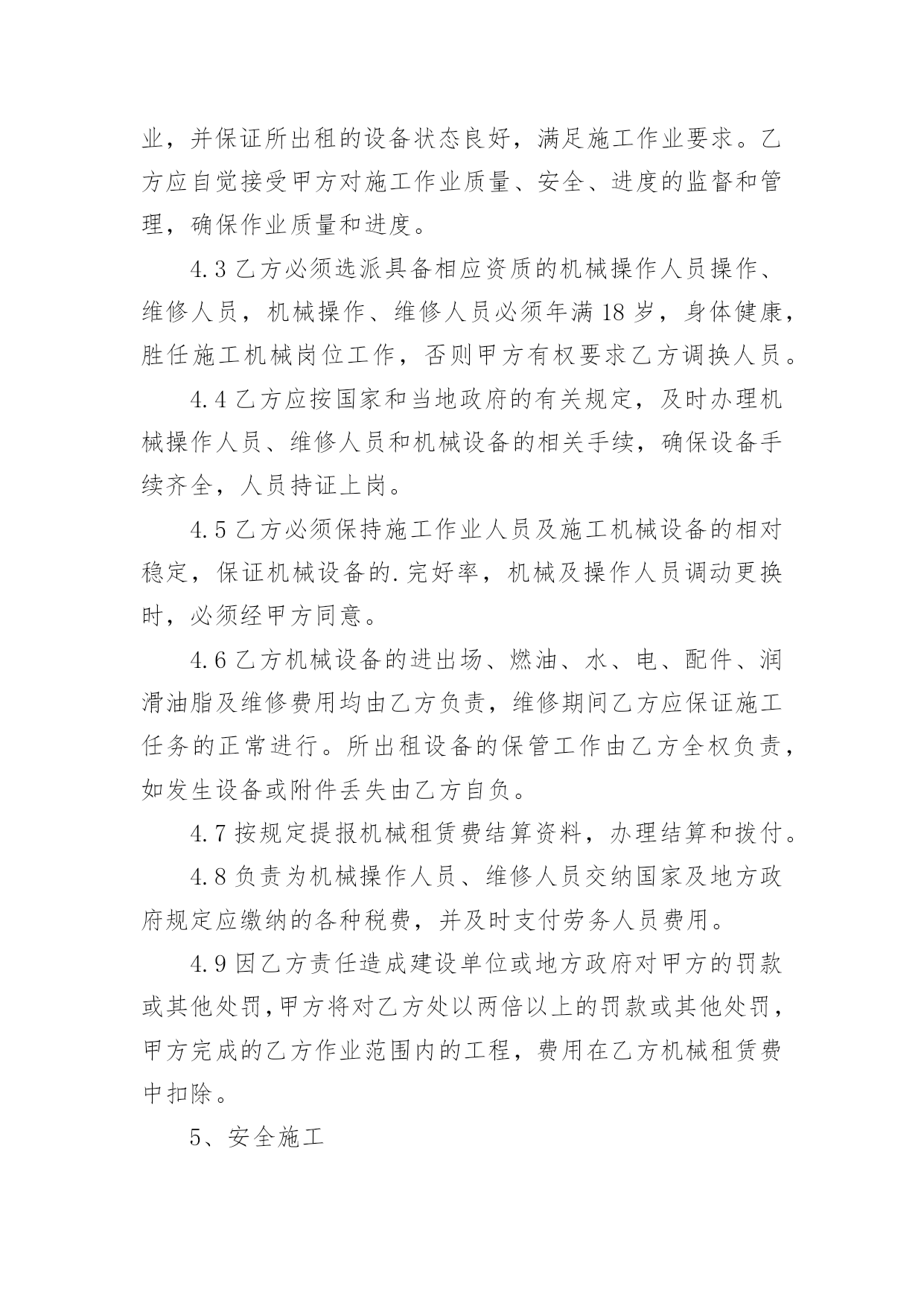 钻孔桩机械租赁合同在不断进步的社会中,合同的地位越来越不容忽视,合同的签订是对双方之间权利义务的最好规范。那么正式、规范的合同是什么样的呢?下面是小编精心整理的钻孔桩机械租赁合同,仅供参考,希望能够帮助到大家。承租方(甲方):出租方(乙方):根据《中华人民共和国合同法》及有关法律法规,按照广珠铁路标工程具体情况,经双方协商一致,签订本机械租赁合同,双方共同遵照执行。1、合同主要内容1.1甲方租用乙方钻孔桩机械设备用于工程施工,施工内容包括钻孔桩工程施工。1.2租用的机械设备名称、规格、数量见附表一《机械租赁设备一览表》要求乙方的设备状况良好。1.3机械租赁时间:年月日至年月日。2、机械租赁费单价2.1机械租赁费单价按附表二《机械设备租赁费用单价汇总表》约定的单价计算。其中台班单价已综合包括了机械设备台班作业所需的全部费用,单价不作任何调整。2.2租赁机械台班费的计价均按八小时为一台班计算,不足八小时按比例折合相应台班数。2.3机械进出场费均由乙方承担2.4机械施工所用油脂、燃料及机械自身维修费用由乙方负责,如果需甲方供应时,所用甲方供应材料以甲方采购价格供应乙方。3、甲方责任3.1负责对本工程施工作业的质量、安全、技术、作业进度进行全方位管理、控制。3.2甲方应配备责任心强,熟悉技术和管理的机械领工员指挥调配乙方的机械设备。3.3甲方在乙方进场前必须对乙方按规定进行技术交底,确定该工程的安全、质量措施和工程技术标准。3.4依作业进度及时组织测量、检验和交桩,并提供相应的作业指导书、技术交底等技术资料。3.5负责作好施工组织和协调工作,确保施工顺利进行,减少误工、待窝工,降低机械使用成本。3.7对本工程的施工作业质量、安全、技术、作业进度进行全方面的管理控制。3.8应严格按照安全操作规程指挥调配作业机械,杜绝违章作业。3.9按本合同约定及时办理机械租费结算手续。4、乙方责任4.1乙方必须严格按照甲方提供的施工图纸、技术交底、作业指导书、施工范围及验收标准进行施工。4.2乙方应按甲方要求的时间及时组织机械设备进场作业,并保证所出租的设备状态良好,满足施工作业要求。乙方应自觉接受甲方对施工作业质量、安全、进度的监督和管理,确保作业质量和进度。4.3乙方必须选派具备相应资质的机械操作人员操作、维修人员,机械操作、维修人员必须年满18岁,身体健康,胜任施工机械岗位工作,否则甲方有权要求乙方调换人员。4.4乙方应按国家和当地政府的有关规定,及时办理机械操作人员、维修人员和机械设备的相关手续,确保设备手续齐全,人员持证上岗。4.5乙方必须保持施工作业人员及施工机械设备的相对稳定,保证机械设备的.完好率,机械及操作人员调动更换时,必须经甲方同意。4.6乙方机械设备的进出场、燃油、水、电、配件、润滑油脂及维修费用均由乙方负责,维修期间乙方应保证施工任务的正常进行。所出租设备的保管工作由乙方全权负责,如发生设备或附件丢失由乙方自负。4.7按规定提报机械租赁费结算资料,办理结算和拨付。4.8负责为机械操作人员、维修人员交纳国家及地方政府规定应缴纳的各种税费,并及时支付劳务人员费用。4.9因乙方责任造成建设单位或地方政府对甲方的罚款或其他处罚,甲方将对乙方处以两倍以上的罚款或其他处罚,甲方完成的乙方作业范围内的工程,费用在乙方机械租赁费中扣除。5、安全施工5.1在施工中,乙方应遵守国家、行业安全生产法规。5.2乙方必须对参加施工作业人员进行专业安全教育,作业中发生人员责任伤亡事故,按国家有关规定认真组织调查、处理并承担经济损失。甲方:乙方: