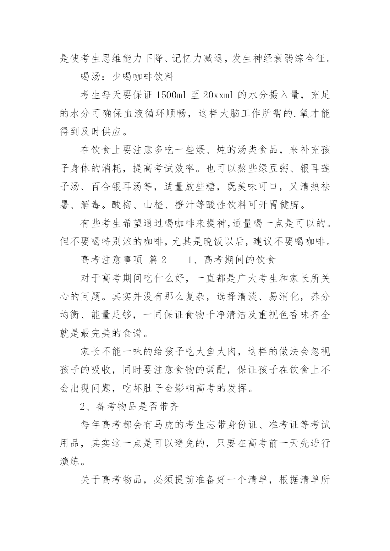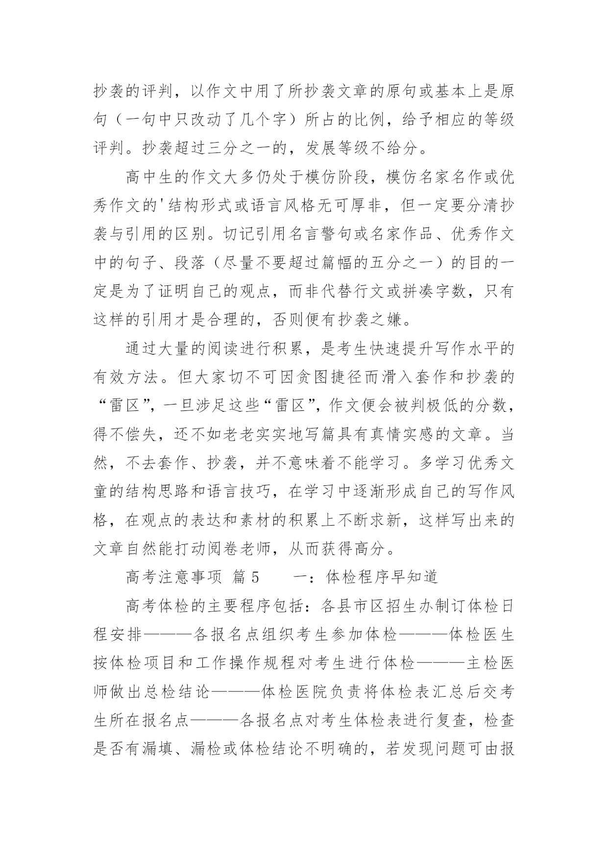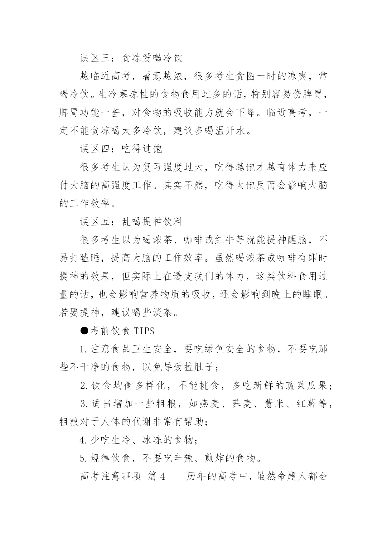 高考注意事项高考注意事项14篇高考注意事项篇1吃好:保证消耗需要选择优质蛋白质食物:如鱼虾,瘦牛、羊、猪、兔肉,去皮鸡肉,鸡蛋、牛奶、豆腐和其他豆制品等,甚至包括一些内脏食品。这些食物不但含有丰富的优质蛋白质,还富含钙、铁、维生素A、维生素B2和维生素D。吃杂:摄入均衡营养要吃主食。主食中要适量选择一些粗杂粮,如红豆、绿豆、糙米、标准粉等等。这类食物含有丰富的维生素B1和膳食纤维,一方面维生素B1本身对增进食欲能起到很好的作用。要吃新鲜的蔬菜、水果。蔬菜、水果中含有丰富的维生素C、矿物质和膳食纤维,维生素C既可促进铁在体内的吸收,更重要的一点,它还可增加脑组织对氧的利用。适量:七八成饱就行看着为备考累得满脸疲惫的孩子,做父母的不停地给孩子夹菜叮嘱多吃点多吃点。可怜天下父母心,家长们心疼孩子的这种做法对孩子其实没有好处。不能吃得过饱的原因,主要是避免消化道负担加重分流体内血液,以保证大脑有足够的血液供应。鱼、肉、蛋等属于酸性的食物,人体若食用酸性食物过多,就会出现酸中毒。结果易使人疲劳,抵抗力降低,特别是使考生思维能力下降、记忆力减退,发生神经衰弱综合征。喝汤:少喝咖啡饮料考生每天要保证1500ml至20xxml的水分摄入量,充足的水分可确保血液循环顺畅,这样大脑工作所需的.氧才能得到及时供应。在饮食上要注意多吃一些煨、炖的汤类食品,来补充孩子身体的消耗,提高考试效率。也可以熬些绿豆粥、银耳莲子汤、百合银耳汤等,适量放些糖,既美味可口,又清热祛暑、解毒。酸梅、山楂、橙汁等酸性饮料可开胃健脾。有些考生希望通过喝咖啡来提神,适量喝一点是可以的。但不要喝特别浓的咖啡,尤其是晚饭以后,建议不要喝咖啡。高考注意事项篇21、高考期间的饮食对于高考期间吃什么好,一直都是广大考生和家长所关心的问题。其实并没有那么复杂,选择清淡、易消化,养分均衡、能量足够,一同保证食物干净清洁及重视色香味齐全就是最完美的食谱。家长不能一味的给孩子吃大鱼大肉,这样的做法会忽视孩子的吸收,同时要注意食物的调配,保证孩子在饮食上不会出现问题,吃坏肚子会影响高考的发挥。2、备考物品是否带齐每年高考都会有马虎的考生忘带身份证、准考证等考试用品,其实这一点是可以避免的,只要在高考前一天先进行演练。关于高考物品,必须提前准备好一个清单,根据清单所列的.物品提前做好准备,并在高考当天重复确认物品。3、提早重视气候状况高考期间天气往往比较炎热,同时下午还会有大风大雨的恶劣气候呈现。作为家长要提早关注天气的变化,提早预备好雨具和衣物等,让孩子在最舒服的环境下答题。4、关于考生睡觉伴随着高考的心理压力,考生经常失眠是正常现象,考生和家长不能在此方面有过大的压力。在高考期间尽量制造安静的环境休息,如果考生有失眠现象,考生和家长也不要过分关注,失眠一般不会很大程度影响到高考的发挥。要注意的是劝导睡觉质量差的考生,在必要的时刻最好闭目养神。高考注意事项篇3误区一:餐餐大鱼大肉许多家长以为多吃些高蛋白的食物就能补脑,于是餐餐大鱼大肉,蔬菜水果反而吃得很少。郭丽娜建议,在给考生适当补充优质蛋白的同时,也要保证一定量的蔬菜摄入。建议考生每天蔬菜的摄入量达到一斤以上。误区二:吃难消化的夜宵很多考生习惯熬夜复习,临睡前饿了又吃大量的夜宵,有的还爱吃一些难消化的煎炸食物。睡前吃多了不易消化的食物会影响脾胃,进而影响到睡眠。郭丽娜指出,能不熬夜尽量不熬夜,因为熬夜非常伤身体。如果实在因为学习压力很大,要熬夜看书,尽量吃一些容易消化的`食物,如小米粥、面条,或者喝杯牛奶。误区三:贪凉爱喝冷饮越临近高考,暑意越浓,很多考生贪图一时的凉爽,常喝冷饮。生冷寒凉性的食物食用过多的话,特别容易伤脾胃,脾胃功能一差,对食物的吸收能力就会下降。临近高考,一定不能贪凉喝太多冷饮,建议多喝温开水。误区四:吃得过饱很多考生认为复习强度过大,吃得越饱才越有体力来应付大脑的高强度工作。其实不然,吃得太饱反而会影响大脑的工作效率。误区五:乱喝提神饮料很多考生以为喝浓茶、咖啡或红牛等就能提神醒脑,不易打瞌睡,提高大脑的工作效率。虽然喝浓茶或咖啡有即时提神的效果,但实际上在透支我们的体力,这类饮料食用过量的话,也会影响营养物质的吸收,还会影响到晚上的睡眠。若要提神,建议喝些淡茶。●考前饮食TIPS1.注意食品卫生安全,要吃绿色安全的食物,不要吃那些不干净的食物,以免导致拉肚子;2.饮食均衡多样化,不能挑食,多吃新鲜的蔬菜瓜果;3.适当增加一些粗粮,如燕麦、荞麦、薏米、红薯等,粗粮对于人体的代谢非常有帮助;4.少吃生冷、冰冻的食物;5.规律饮食,不要吃辛辣、煎炸的食物。高考注意事项篇4历年的高考中,虽然命题人都会在作文的写作要求里明确说明不要套作、不得抄袭,但每年还是会出现大量套作、抄袭的作文。按照高考作文阅卷的评分标准,套作的作文