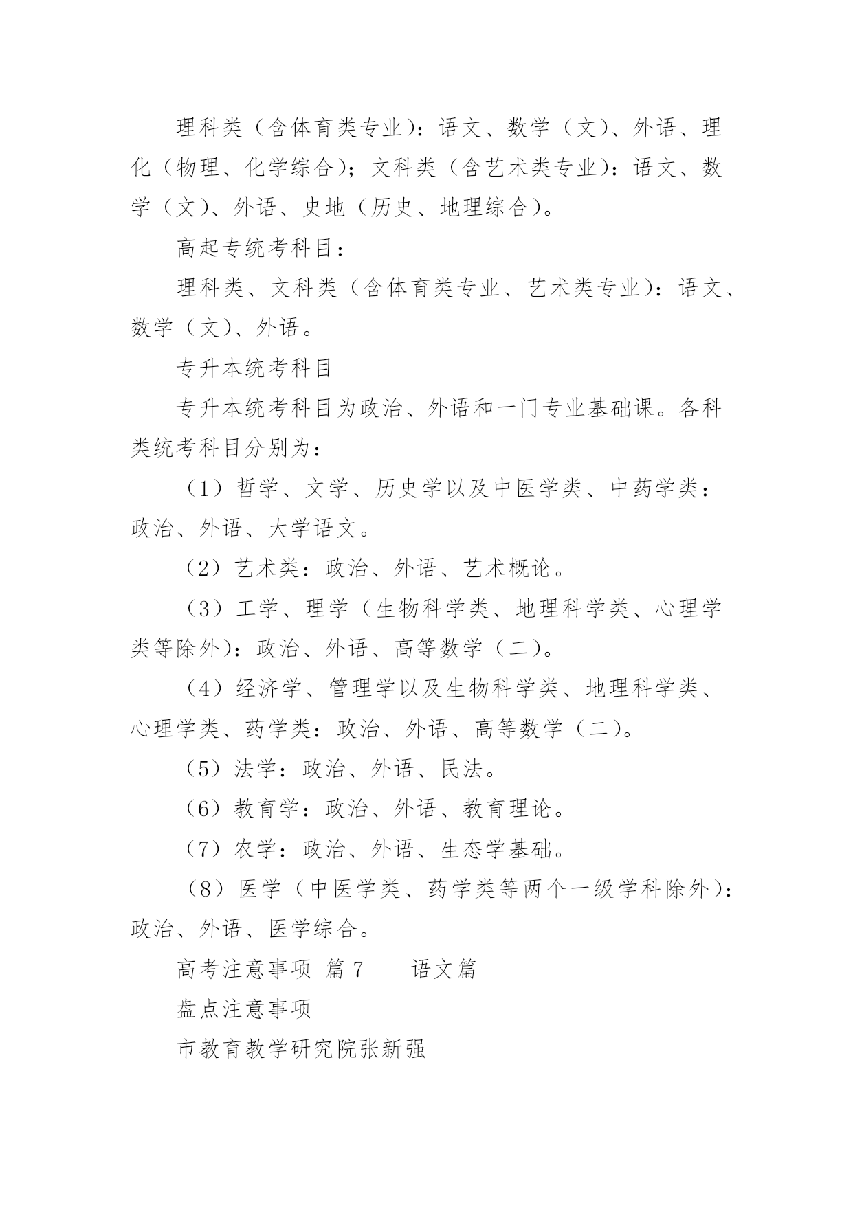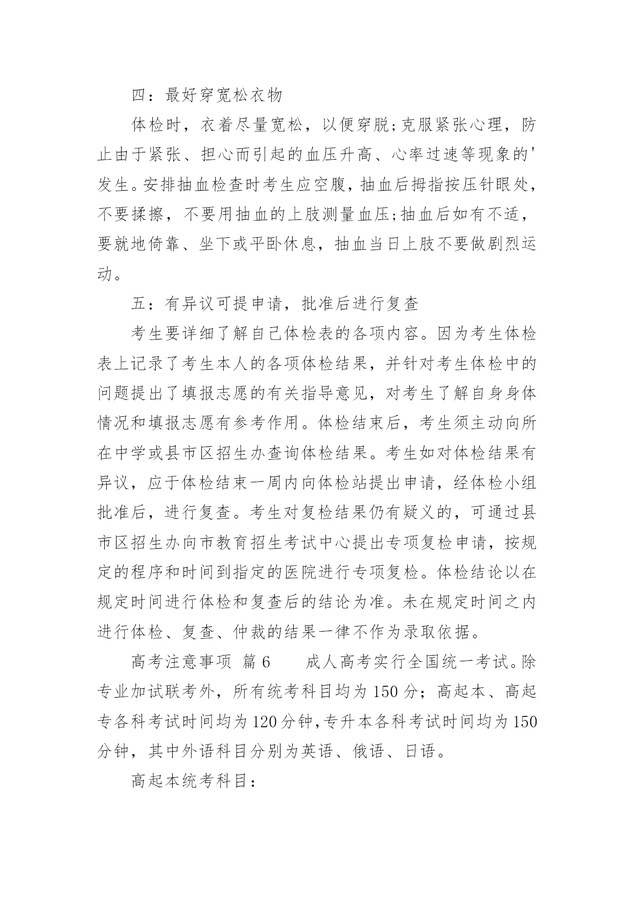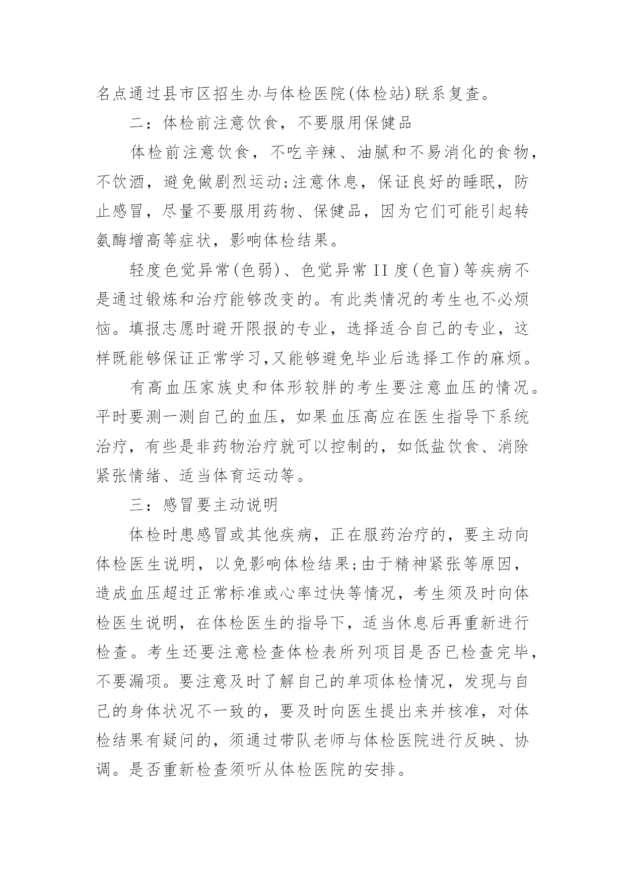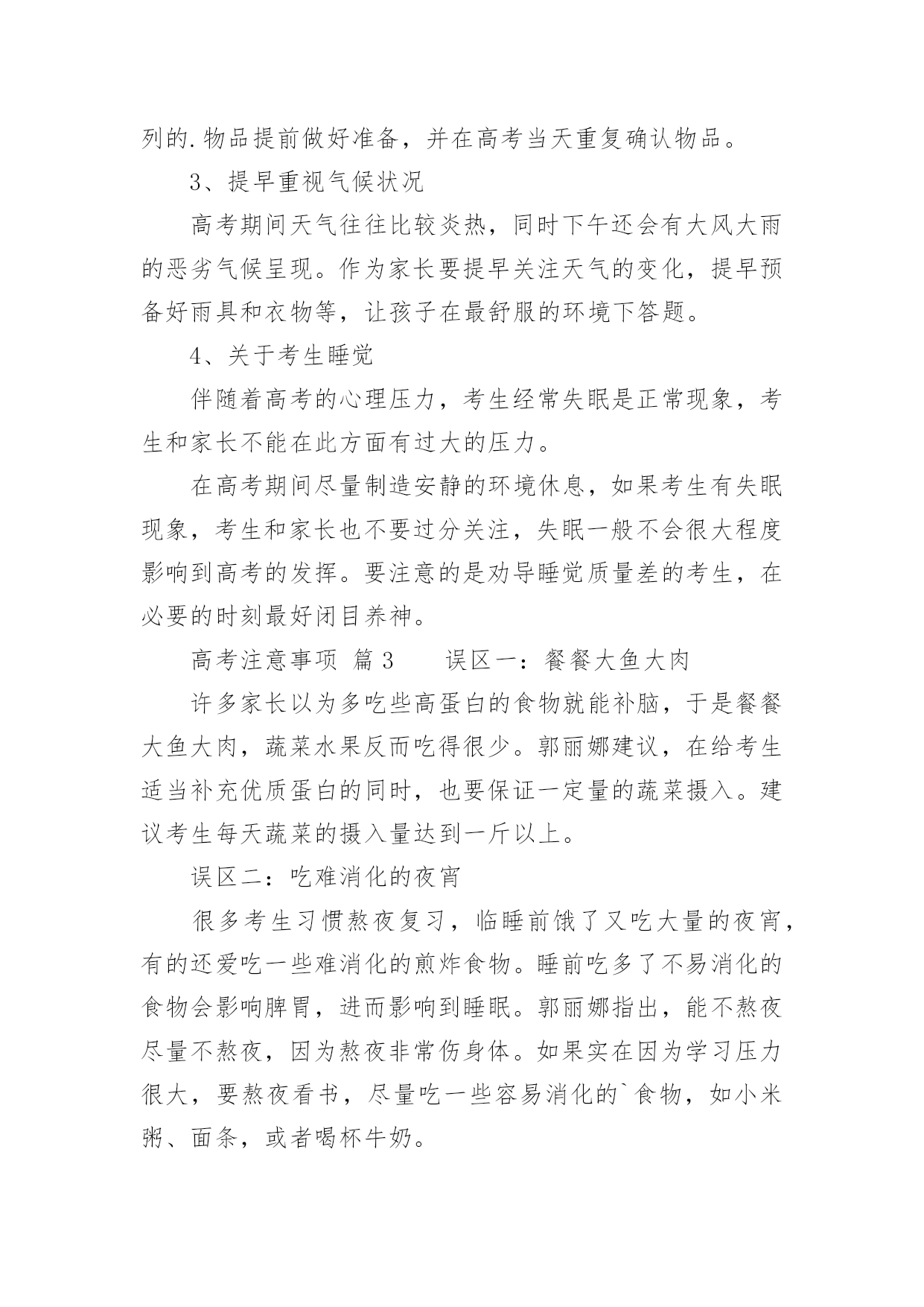 高考注意事项高考注意事项14篇高考注意事项篇1吃好:保证消耗需要选择优质蛋白质食物:如鱼虾,瘦牛、羊、猪、兔肉,去皮鸡肉,鸡蛋、牛奶、豆腐和其他豆制品等,甚至包括一些内脏食品。这些食物不但含有丰富的优质蛋白质,还富含钙、铁、维生素A、维生素B2和维生素D。吃杂:摄入均衡营养要吃主食。主食中要适量选择一些粗杂粮,如红豆、绿豆、糙米、标准粉等等。这类食物含有丰富的维生素B1和膳食纤维,一方面维生素B1本身对增进食欲能起到很好的作用。要吃新鲜的蔬菜、水果。蔬菜、水果中含有丰富的维生素C、矿物质和膳食纤维,维生素C既可促进铁在体内的吸收,更重要的一点,它还可增加脑组织对氧的利用。适量:七八成饱就行看着为备考累得满脸疲惫的孩子,做父母的不停地给孩子夹菜叮嘱多吃点多吃点。可怜天下父母心,家长们心疼孩子的这种做法对孩子其实没有好处。不能吃得过饱的原因,主要是避免消化道负担加重分流体内血液,以保证大脑有足够的血液供应。鱼、肉、蛋等属于酸性的食物,人体若食用酸性食物过多,就会出现酸中毒。结果易使人疲劳,抵抗力降低,特别是使考生思维能力下降、记忆力减退,发生神经衰弱综合征。喝汤:少喝咖啡饮料考生每天要保证1500ml至20xxml的水分摄入量,充足的水分可确保血液循环顺畅,这样大脑工作所需的.氧才能得到及时供应。在饮食上要注意多吃一些煨、炖的汤类食品,来补充孩子身体的消耗,提高考试效率。也可以熬些绿豆粥、银耳莲子汤、百合银耳汤等,适量放些糖,既美味可口,又清热祛暑、解毒。酸梅、山楂、橙汁等酸性饮料可开胃健脾。有些考生希望通过喝咖啡来提神,适量喝一点是可以的。但不要喝特别浓的咖啡,尤其是晚饭以后,建议不要喝咖啡。高考注意事项篇21、高考期间的饮食对于高考期间吃什么好,一直都是广大考生和家长所关心的问题。其实并没有那么复杂,选择清淡、易消化,养分均衡、能量足够,一同保证食物干净清洁及重视色香味齐全就是最完美的食谱。家长不能一味的给孩子吃大鱼大肉,这样的做法会忽视孩子的吸收,同时要注意食物的调配,保证孩子在饮食上不会出现问题,吃坏肚子会影响高考的发挥。2、备考物品是否带齐每年高考都会有马虎的考生忘带身份证、准考证等考试用品,其实这一点是可以避免的,只要在高考前一天先进行演练。关于高考物品,必须提前准备好一个清单,根据清单所列的.物品提前做好准备,并在高考当天重复确认物品。3、提早重视气候状况高考期间天气往往比较炎热,同时下午还会有大风大雨的恶劣气候呈现。作为家长要提早关注天气的变化,提早预备好雨具和衣物等,让孩子在最舒服的环境下答题。4、关于考生睡觉伴随着高考的心理压力,考生经常失眠是正常现象,考生和家长不能在此方面有过大的压力。在高考期间尽量制造安静的环境休息,如果考生有失眠现象,考生和家长也不要过分关注,失眠一般不会很大程度影响到高考的发挥。要注意的是劝导睡觉质量差的考生,在必要的时刻最好闭目养神。高考注意事项篇3误区一:餐餐大鱼大肉许多家长以为多吃些高蛋白的食物就能补脑,于是餐餐大鱼大肉,蔬菜水果反而吃得很少。郭丽娜建议,在给考生适当补充优质蛋白的同时,也要保证一定量的蔬菜摄入。建议考生每天蔬菜的摄入量达到一斤以上。误区二:吃难消化的夜宵很多考生习惯熬夜复习,临睡前饿了又吃大量的夜宵,有的还爱吃一些难消化的煎炸食物。睡前吃多了不易消化的食物会影响脾胃,进而影响到睡眠。郭丽娜指出,能不熬夜尽量不熬夜,因为熬夜非常伤身体。如果实在因为学习压力很大,要熬夜看书,尽量吃一些容易消化的`食物,如小米粥、面条,或者喝杯牛奶。误区三:贪凉爱喝冷饮越临近高考,暑意越浓,很多考生贪图一时的凉爽,常喝冷饮。生冷寒凉性的食物食用过多的话,特别容易伤脾胃,脾胃功能一差,对食物的吸收能力就会下降。临近高考,一定不能贪凉喝太多冷饮,建议多喝温开水。误区四:吃得过饱很多考生认为复习强度过大,吃得越饱才越有体力来应付大脑的高强度工作。其实不然,吃得太饱反而会影响大脑的工作效率。误区五:乱喝提神饮料很多考生以为喝浓茶、咖啡或红牛等就能提神醒脑,不易打瞌睡,提高大脑的工作效率。虽然喝浓茶或咖啡有即时提神的效果,但实际上在透支我们的体力,这类饮料食用过量的话,也会影响营养物质的吸收,还会影响到晚上的睡眠。若要提神,建议喝些淡茶。●考前饮食TIPS1.注意食品卫生安全,要吃绿色安全的食物,不要吃那些不干净的食物,以免导致拉肚子;2.饮食均衡多样化,不能挑食,多吃新鲜的蔬菜瓜果;3.适当增加一些粗粮,如燕麦、荞麦、薏米、红薯等,粗粮对于人体的代谢非常有帮助;4.少吃生冷、冰冻的食物;5.规律饮食,不要吃辛辣、煎炸的食物。高考注意事项篇4历年的高考中,虽然命题人都会在作文的写作要求里明确说明不要套作、不得抄袭,但每年还是会出现大量套作、抄袭的作文。按照高考作文阅卷的评分标准,套作的作文