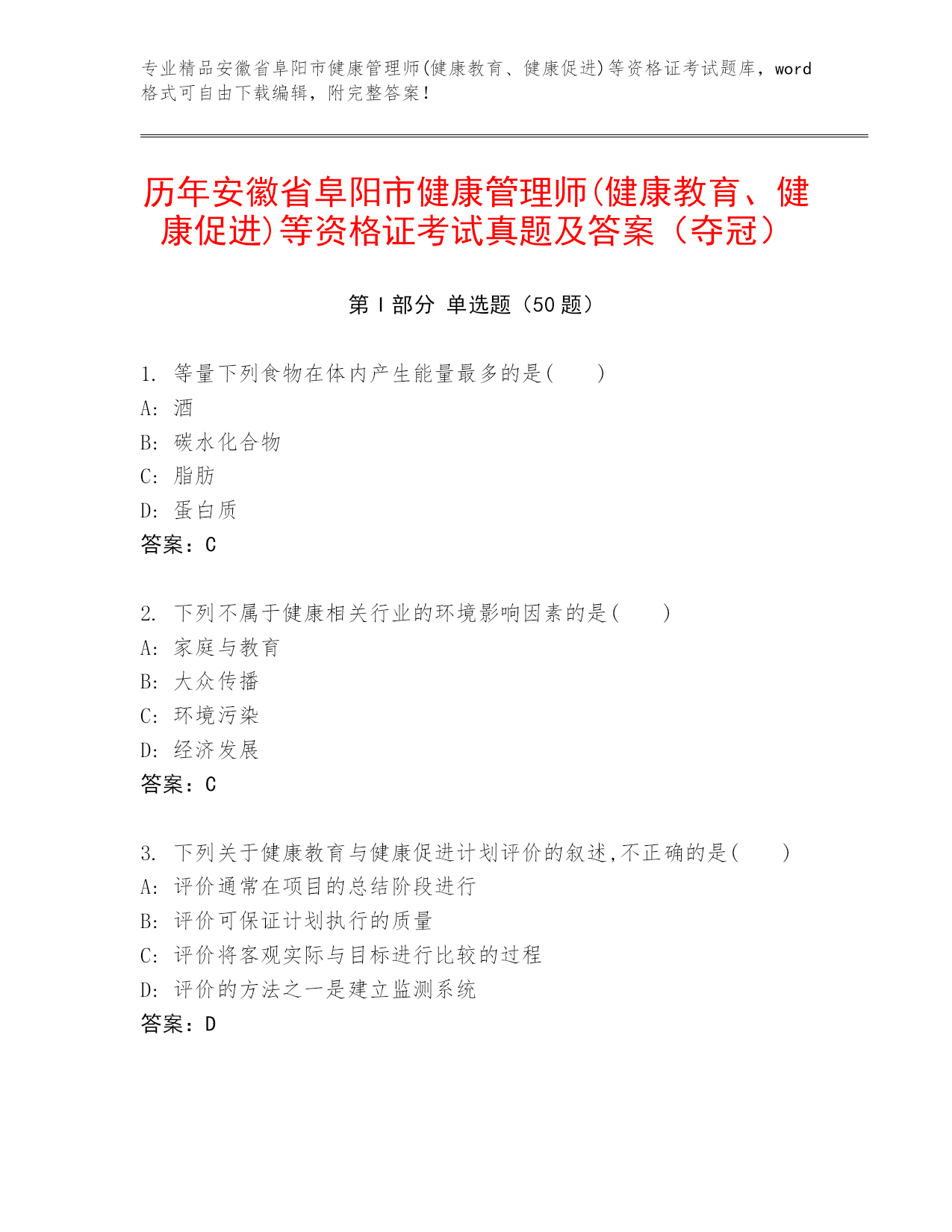 历年安徽省阜阳市健康管理师(健康教育、健康促进)等资格证考试真题及答案(夺冠).docx