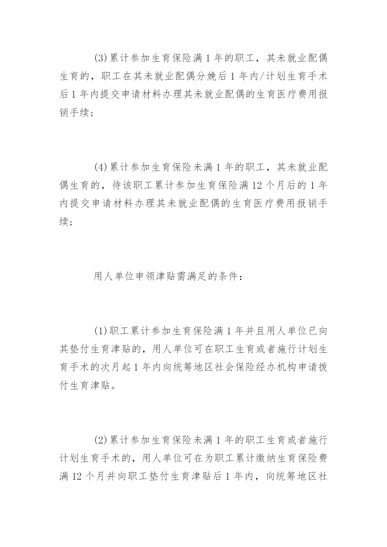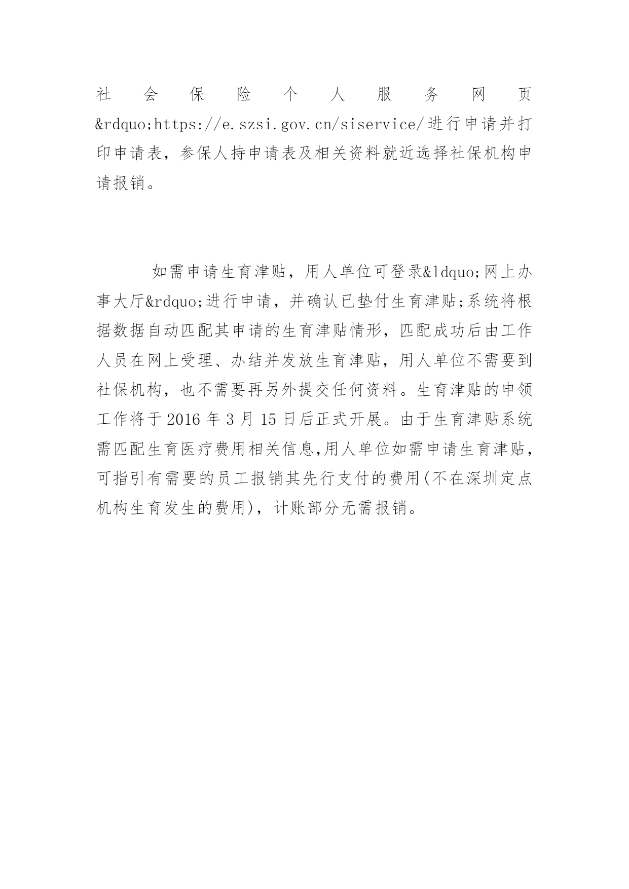 深圳生育保险报销条件深圳生育保险报销条件2017年生育保险报销需要满足一定的条件,那么深圳的生育保险报销条件是怎样的呢?今天我们就一起来看看相关内容吧!职工生育保险医疗报销条件:(1)累计参加生育保险满1年的职工生育的,在其分娩后1年内/计划生育手术后1年内提交申请材料办理生育医疗费用报销手续;(2)累计参加生育保险未满1年的职工生育的,待其累计参加生育保险满12个月后的1年内提交申请材料办理生育医疗费用报销手续;(3)累计参加生育保险满1年的职工,其未就业配偶生育的,职工在其未就业配偶分娩后1年内/计划生育手术后1年内提交申请材料办理其未就业配偶的生育医疗费用报销手续;(4)累计参加生育保险未满1年的职工,其未就业配偶生育的,待该职工累计参加生育保险满12个月后的1年内提交申请材料办理其未就业配偶的生育医疗费用报销手续;用人单位申领津贴需满足的条件:(1)职工累计参加生育保险满1年并且用人单位已向其垫付生育津贴的,用人单位可在职工生育或者施行计划生育手术的次月起1年内向统筹地区社会保险经办机构申请拨付生育津贴。(2)累计参加生育保险未满1年的职工生育或者施行计划生育手术的,用人单位可在为职工累计缴纳生育保险费满12个月并向职工垫付生育津贴后1年内,向统筹地区社会保险经办机构申请拨付生育津贴。生育保险的办理程序(1)女职工怀孕后、流产或计划生育手术前,由用人单位或街道、镇劳动保障服务站工作人员携带申报材料到区社会劳动保险处生育保险窗口;(2)工作人员受理核准后,签发医疗证;(3)生育女职工产假满30天内,由用人单位或街道、镇劳动保障服务站工作人员携带申报材料到区社会劳动保险处生育保险窗口办理待遇结算;(4)工作人员受理核准后,支付生育医疗费和生育津贴。“属于计划内生育”的妇女,在申领生育保险待遇之前,应办理《上海市申请享受生育保险待遇计划生育审核表》。延伸阅读:深圳参保生育保险单位可申请生育津贴记者2月29日从深圳市社保局获悉,自3月1日起,深圳生育保险参保人累计参保年限陆续达到1年时间的,参保人可申请生育医疗费用的报销,参保单位可以申请生育津贴。根据《广东省职工生育保险规定》,累计参加生育保险未满1年的职工生育及施行计划生育手术的,其生育医疗费用先由职工本人支付,待其累计参加生育保险满12个月后的1年内,可到社保机构申请报销;企业参加生育保险满12个月的员工生育津贴可申请生育基金支付。据了解,为进一步简化报销程序,方便参保人,深圳自3月1日起,生育保险医疗费用的报销将全面实行“同城通办”,所有生育保险参保人申请报销生育医疗费用,可通过深圳市社会保险基金管理局官网上的“社会保险个人服务网页”https://e.szsi.gov.cn/siservice/进行申请并打印申请表,参保人持申请表及相关资料就近选择社保机构申请报销。如需申请生育津贴,用人单位可登录“网上办事大厅”进行申请,并确认已垫付生育津贴;系统将根据数据自动匹配其申请的生育津贴情形,匹配成功后由工作人员在网上受理、办结并发放生育津贴,用人单位不需要到社保机构,也不需要再另外提交任何资料。生育津贴的申领工作将于2016年3月15日后正式开展。由于生育津贴系统需匹配生育医疗费用相关信息,用人单位如需申请生育津贴,可指引有需要的员工报销其先行支付的费用(不在深圳定点机构生育发生的费用),计账部分无需报销。