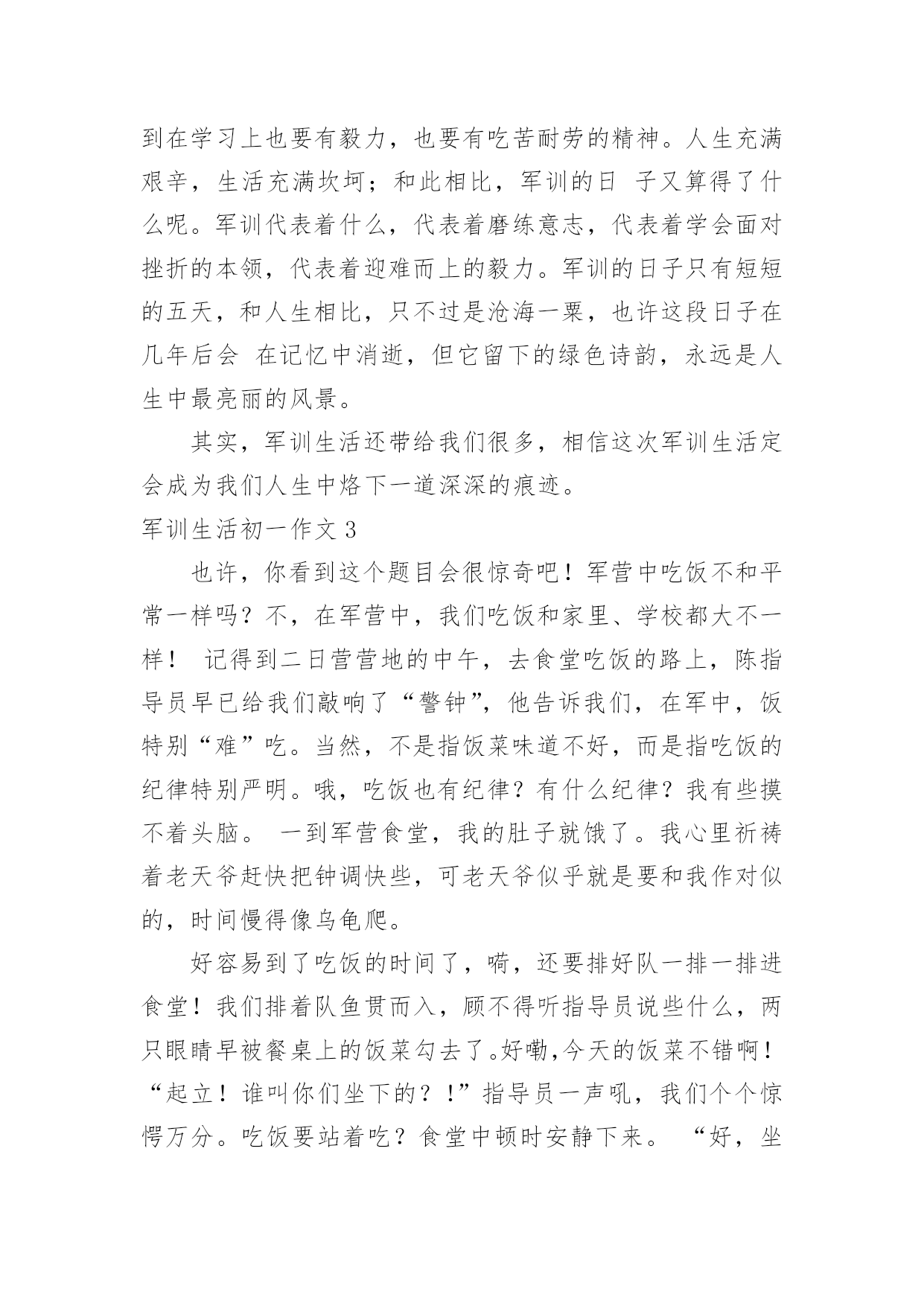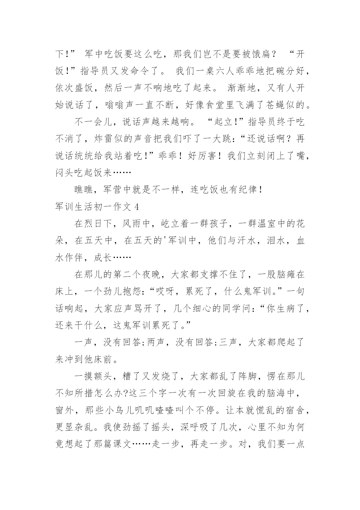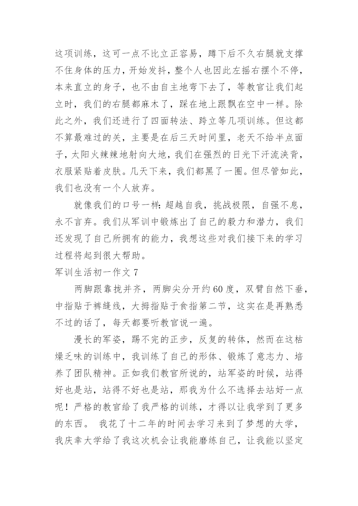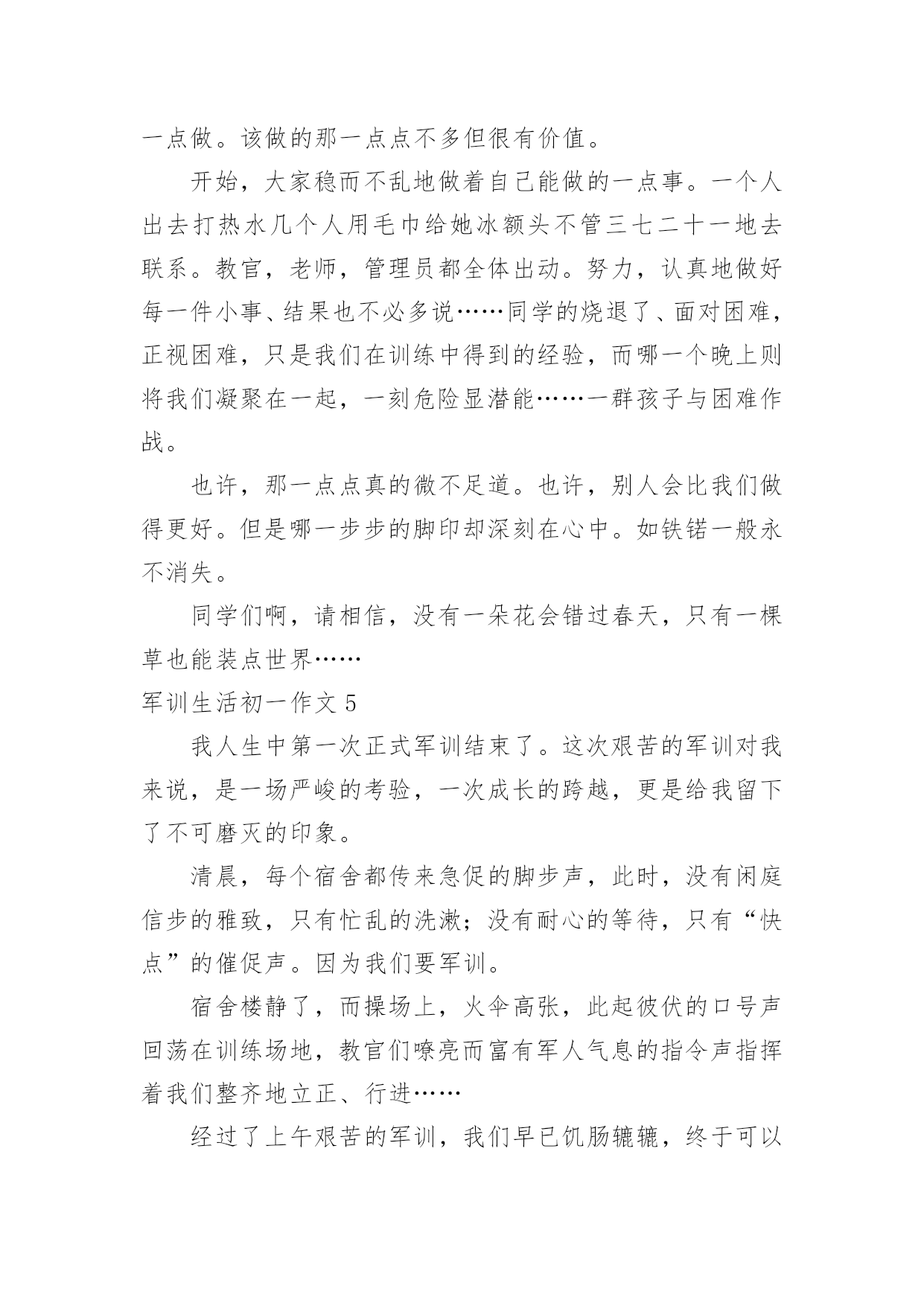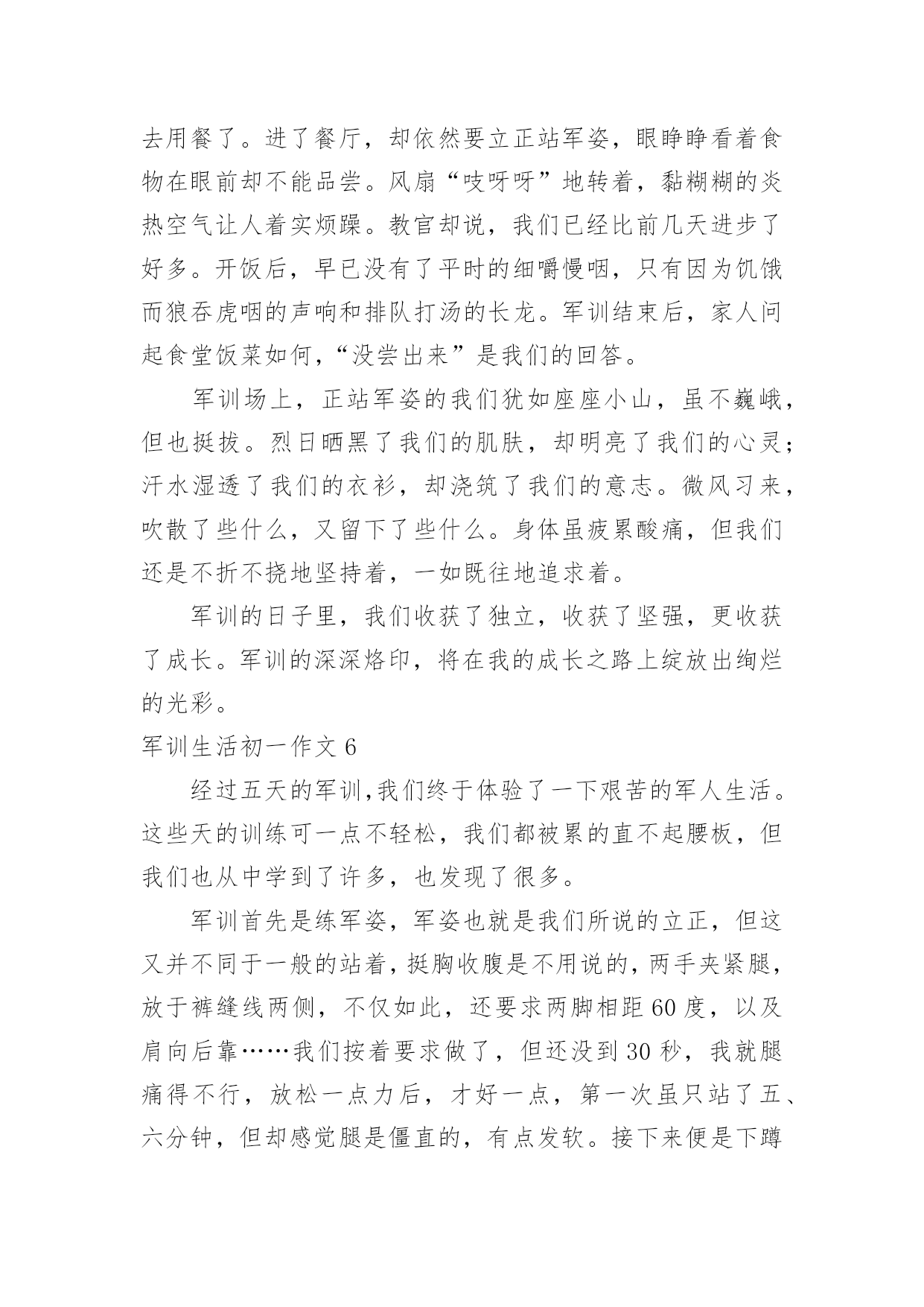 军训生活初一作文军训生活初一作文7篇无论是身处学校还是步入社会,大家最不陌生的就是作文了吧,作文是从内部言语向外部言语的过渡,即从经过压缩的简要的、自己能明白的语言,向开展的、具有规范语法结构的、能为他人所理解的外部语言形式的转化。还是对作文一筹莫展吗?以下是小编为大家收集的军训生活初一作文,欢迎大家借鉴与参考,希望对大家有所帮助。军训生活初一作文1我上初一了,开学第一件事就是军训,我在这次军训中体验到个体对集体的服从性,也尝到了艰辛的汗水,这是我的第一次军训,对我来说是终生难忘的。我的教官非常严厉,我一下没做好就要重复做好几次,做标准了才可以停,虽然我流了好多汗,但是对我来说绝对是一种锻炼。在军训中有苦有甜,也可以说是苦尽甘来。“苦”是苦在军训时太阳一直对我在吐火,孙悟空也架不住太上老君的炼丹炉啊,经过四天半的暴晒,我就像烧焦的土豆,那叫一个黑。而且,军训一天后,回到家我腰酸背痛腿抽筋,我一到家就是往地板上一躺。可以说我在军训中没少受苦!可还是利大于弊。“甜”是甜在我虽然在军训时流了好多汗,但军训后的我像个铁人,比以前更坚强,更勇敢,学习也比以前勤奋了,更严格要求自己了。军训把我从一个少年过度为青年了,我知道该怎么做,我已经不是小孩了,我长大了,不能再用以前的要求管理自己,要更严格更认真的管理自己,对别人负责,对自己负责,做一个新时代的好青年。军训是一盏明灯,照亮了我在初中新的道路,军训是一味良药,把我软弱的身体变得强壮,军训是一个闹钟,把我还沉浸在假期中的头脑叫醒。军训使我坚强,使我勇敢,使我感恩,这对我来说是终生难忘的。军训生活初一作文2xx月四号我们和李老师一起坐上大巴车,开始了一周的军训生活。这种训练对于我们这些学生来说是个痛苦的日子。每天训练下来,累得腰酸腿疼。我的教官是个严格要求的人,动作做的不标准就一遍又一遍的操练,直到符合要求为止。其实教官也是心疼我们的,但他更希望能把我们的坚强、毅力练出来。军训生活是苦中带甜,这种甜是师生之间建立起来的一种深厚的友谊,就像一块朱古力糖,还会有丝丝苦味,真是让人回味无穷。军训的确很辛苦,但是我相信往后我们一定会怀念这一段既苦又甜的军训生活。在炎炎烈日下,我们踢正步,排方队;在激昂的训练场上,我们欢呼,呐喊。就是这样一段生活,使每个人在滚爬摔打中慢慢成长;就是这样一段经历,使每个人在汗水中变得坚强。军训给了我这样的机会,虽然军训有点儿苦、有点儿累,但我知道更苦更累还在以后的学习、生活之路。我更加体会到在学习上也要有毅力,也要有吃苦耐劳的精神。人生充满艰辛,生活充满坎坷;和此相比,军训的日子又算得了什么呢。军训代表着什么,代表着磨练意志,代表着学会面对挫折的本领,代表着迎难而上的毅力。军训的日子只有短短的五天,和人生相比,只不过是沧海一粟,也许这段日子在几年后会在记忆中消逝,但它留下的绿色诗韵,永远是人生中最亮丽的风景。其实,军训生活还带给我们很多,相信这次军训生活定会成为我们人生中烙下一道深深的痕迹。军训生活初一作文3也许,你看到这个题目会很惊奇吧!军营中吃饭不和平常一样吗?不,在军营中,我们吃饭和家里、学校都大不一样!记得到二日营营地的中午,去食堂吃饭的路上,陈指导员早已给我们敲响了“警钟”,他告诉我们,在军中,饭特别“难”吃。当然,不是指饭菜味道不好,而是指吃饭的纪律特别严明。哦,吃饭也有纪律?有什么纪律?我有些摸不着头脑。一到军营食堂,我的肚子就饿了。我心里祈祷着老天爷赶快把钟调快些,可老天爷似乎就是要和我作对似的,时间慢得像乌龟爬。好容易到了吃饭的时间了,嗬,还要排好队一排一排进食堂!我们排着队鱼贯而入,顾不得听指导员说些什么,两只眼睛早被餐桌上的饭菜勾去了。好嘞,今天的饭菜不错啊!“起立!谁叫你们坐下的?!”指导员一声吼,我们个个惊愕万分。吃饭要站着吃?食堂中顿时安静下来。“好,坐下!”军中吃饭要这么吃,那我们岂不是要被饿扁?“开饭!”指导员又发命令了。我们一桌六人乖乖地把碗分好,依次盛饭,然后一声不响地吃了起来。渐渐地,又有人开始说话了,嗡嗡声一直不断,好像食堂里飞满了苍蝇似的。不一会儿,说话声越来越响。“起立!”指导员终于吃不消了,炸雷似的声音把我们吓了一大跳:“还说话啊?再说话统统给我站着吃!”乖乖!好厉害!我们立刻闭上了嘴,闷头吃起饭来……瞧瞧,军营中就是不一样,连吃饭也有纪律!军训生活初一作文4在烈日下,风雨中,屹立着一群孩子,一群温室中的花朵,在五天中,在五天的'军训中,他们与汗水,泪水,血水作伴,成长……在那儿的第二个夜晚,大家都支撑不住了,一股脑瘫在床上,一个劲儿抱怨:“哎呀,累死了,什么鬼军训。”一句话响起,大家应声骂开了,几个细心的同学问:“你生病了,还来干什么,这鬼军训累死了。”一声,没有回答;两声,没有回答;三声,大家都爬起了来冲到他床前。