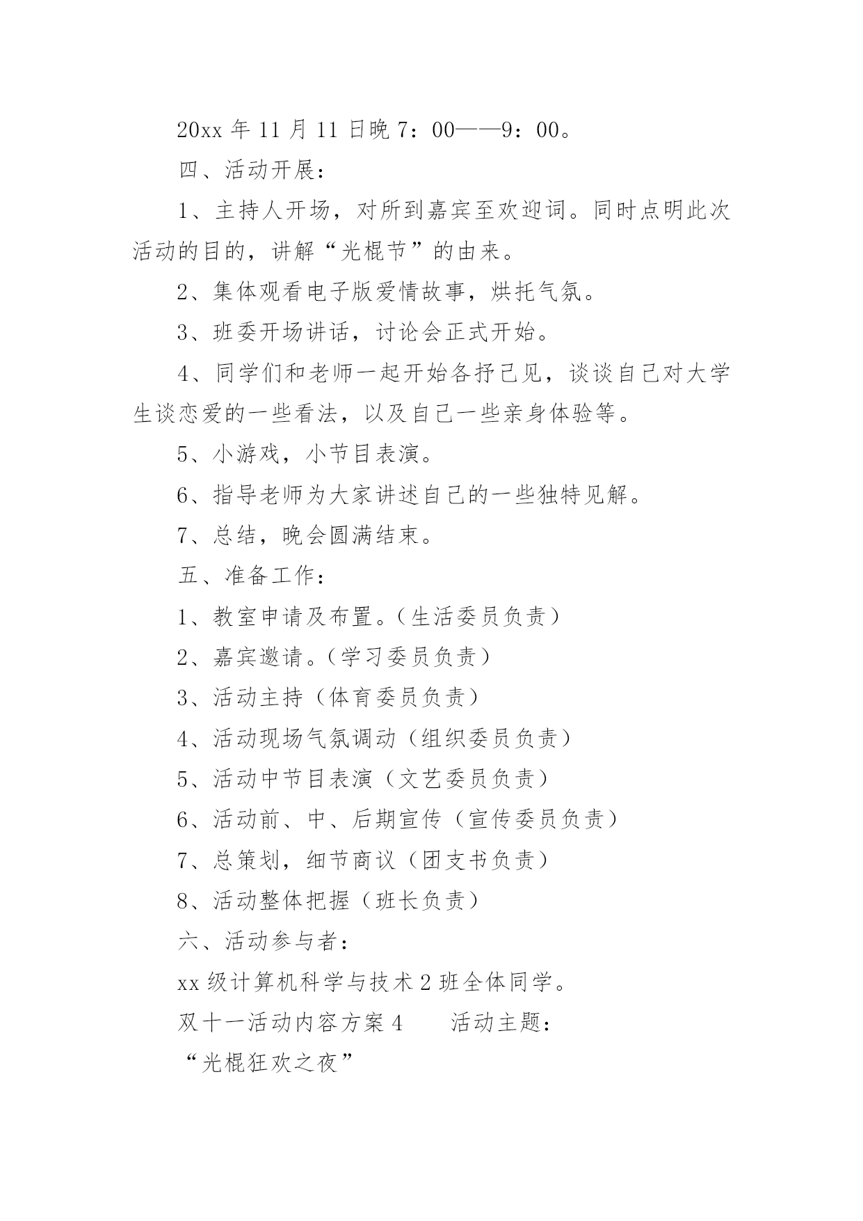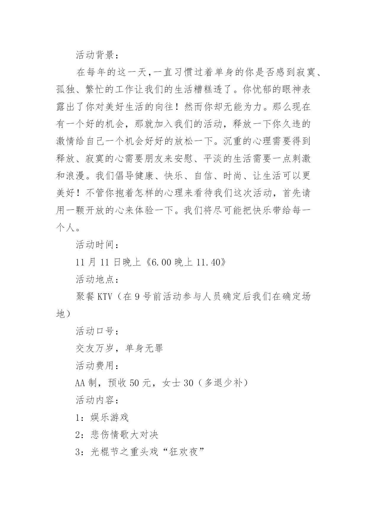 双十一活动内容方案双十一活动内容方案(精选6篇)为了保障活动顺利、圆满进行,我们需要事先制定活动方案,活动方案是从活动的目的、要求、方式、方法、进度等都部署具体、周密,并有很强可操作性的计划。写活动方案需要注意哪些格式呢?以下是小编为大家收集的双十一活动内容方案(精选6篇),仅供参考,大家一起来看看吧。双十一活动内容方案111月11日,光棍节是一种流传于年轻人的娱乐性节日,以庆祝自己仍是单身一族为骄傲(“光棍”的意思便是“单身”)。光棍节将要来临,结合本酒店的实际情况和年轻人的文化习俗,为了更好的开展饭店销售服务工作,达到经济效益与社会效益双丰收,特制定此方案。一、目标市场分析本酒店的顾客主要是中上层人士和政府机关工作人员,但其中也有不少是私款消费,这要求酒店在提高档次的基础上必须兼顾那些私款消费者的个人利益。二、定价策略1、饭菜基本上可以保持原来的定价,但要考虑和光棍节相关的一些饭菜的价格,可采用打折(建议使用这种办法)或者直接降低价格的办法。2、针对价格高的饭菜,建议采用减量和减价想结合的办法。3、管滚接的套餐(下面有说明)的价格不要偏高。4、其他的酒水价格和其它服务的价格可根据酒店的实际情况灵活变动,在光棍节的前后达到最低价(但要针对酒店的纯利润来制定)。三、营销策略1、制作专门针对光棍节的套餐,可以根据实际的情况分实惠、中、高三等,有二人餐、三人餐等类型,主题要体现年轻人单身快乐,为本店特色甜品(价格不需要太高)。2、如果一家人里有一个人的生日是11月11日,可凭借有效的证件(户口本和身份证),在酒店聚餐可享受5-6折(根据酒店的'实际决定)的优惠。建议给他们推荐光棍节套餐。3、如果手机和固定电话号码尾号是1111,可凭借有效的证件(户口本和身份证),在酒店聚餐可享受5-6折(根据酒店的实际决定)的优惠。建议给他们推荐光棍节套餐。最好是酒店直接联系一下这些人。4、由于本酒店暂时没有住宿服务,可和其他的以住宿为主的大型宾馆联合行动,相互介绍客户,这样可以增加客户群,减少一些相关的费用。对这部分客户可用专车接送,同时也建议给他们推荐光棍节套餐。5、在饭后赠送一些和光棍节相关的小礼物(上面要印上酒店的名称、电话、地址、网址)。6、活动的时间定于农历8月10日-20日。四、推广策略1、在酒店的门口附近、火车站、汽车站放置户外广告(户外广告采用喷绘为主,条幅相结合的形式)。2、电视、街道横幅和报纸广告相结合。3、可以尝试一下手机短信广告,群发的重点是原来饭店的老顾客,注意要使用适当的语言,主要介绍酒店的最新活动。4、也可采用传单广告,但传单的质量必须要高。注意:以上的广告可同时选择几种,推广的重点在市区,也可向周边的县市推广。广告的受众最低要保证15万人。双十一活动内容方案2一、活动背景:这是一种冥冥之中的缘分,把来自五湖四海的我们汇集到院青协,来组建我们这个大家庭。为了增进我们大家的友谊,让大家更好的了解彼此,特别举行这次晚会。希望这次晚会能给大家带来欢乐,定会在我们的大学生活中留下永久且美好的回忆,那么就让我们等待这次期盼已久的晚会吧!二、活动目的:希望这次晚会能给大家一个另类交流的舞台,让大家在快乐的'环境中相互了解。让友谊与社团的团结,为大学活动生活创造一种活泼的氛围。三、活动主题:11.11油条晚会四、活动主办:XX城市职业学院应天校区青年志愿者协会五、活动时间:20xx年11月11日晚6点六、活动对象:XX城市职业学院青年志愿者协会全体成员七、活动地点教学楼806八、活动项目:1.心心相印(背夹球)(1)、项目类型:双人协作型、室内游戏(2)、场地要求:教室两条过道(3)、需要道具:气球(4)、比赛人数:12人,自由组合,每组两人(5)、奖品:2面镜子(6)、详细游戏方法及竞赛规则:每组2人,背夹一圆球,步调一致从前方向教室后方走,背靠背把球压破,迅速跑回起点,夹起第二个气球,直至压破六个气球跑回起点即完成。向后走时,双手不能碰到球,否则一次罚2秒;球掉后从起点重新开始游戏。最先完成者胜出。按时间记名次,按名次计分。a.比赛过程中如有球落地情况出现需返回起点重新开始。b.途中不得以手、臂碰球,如有违反均视为犯规。每碰球一次记犯规一次,每犯规一次比赛成绩加2秒。c.比赛中应绝对服从裁判,以裁判员的判罚为最终判决。2.报纸游戏(1)、项目类型:团队协作竞技型(2)、道具要求:报纸(3)、场地要求:讲台前方(4)、比赛人数:4人一组,设4组(5)、奖品:4面镜子(6)、游戏玩法:先摆出气势,要求喊出口号,然后4人一组按组站在报纸上,所有人的脚必须踩在报纸上,不能沾地,坚持五秒即可,脚踩到外面者输,每局成功后,将报纸折半,以抱法站定最小的报纸的组得胜。3.击鼓传花(1)、道具要求:鼓或音乐、花(2)、参加人员:集体(3)