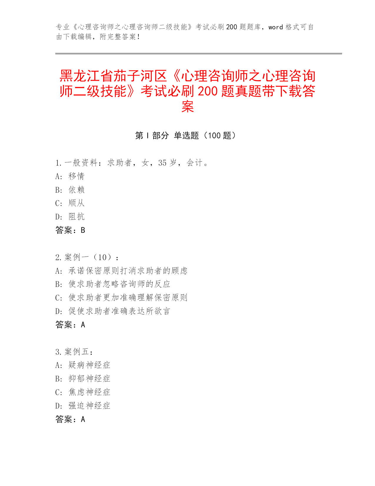 黑龙江省茄子河区《心理咨询师之心理咨询师二级技能》考试必刷200题真题带下载答案