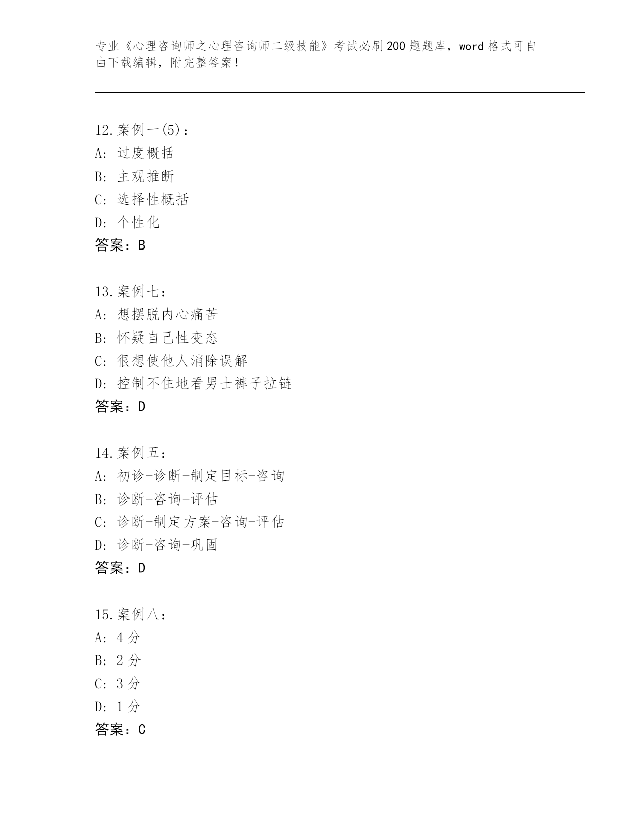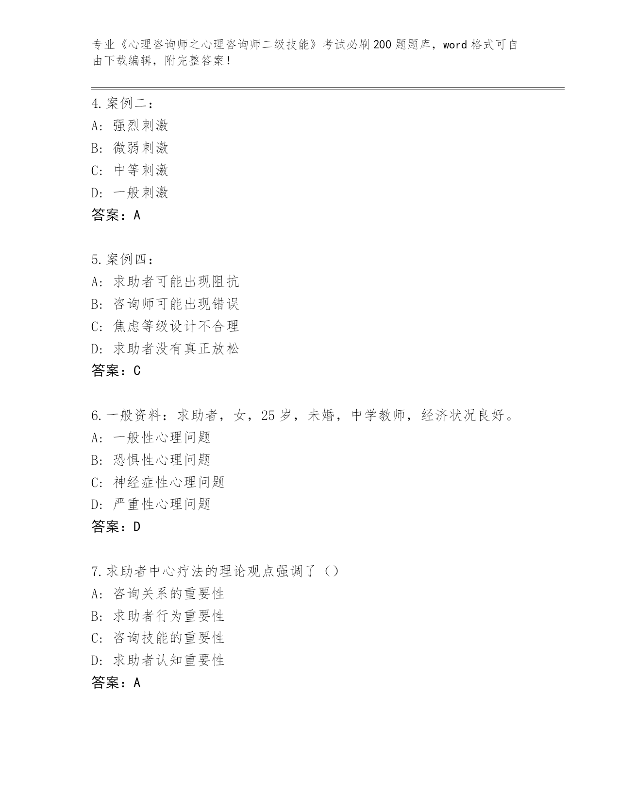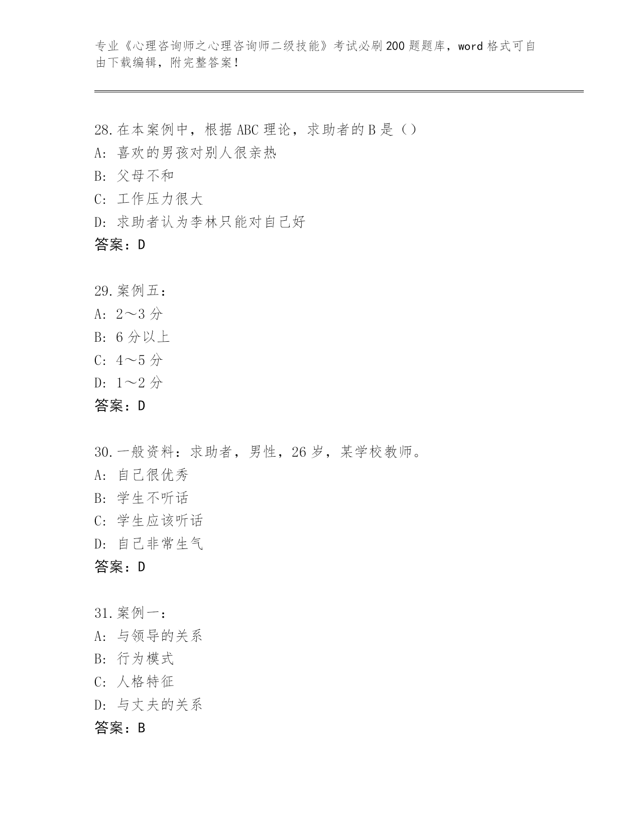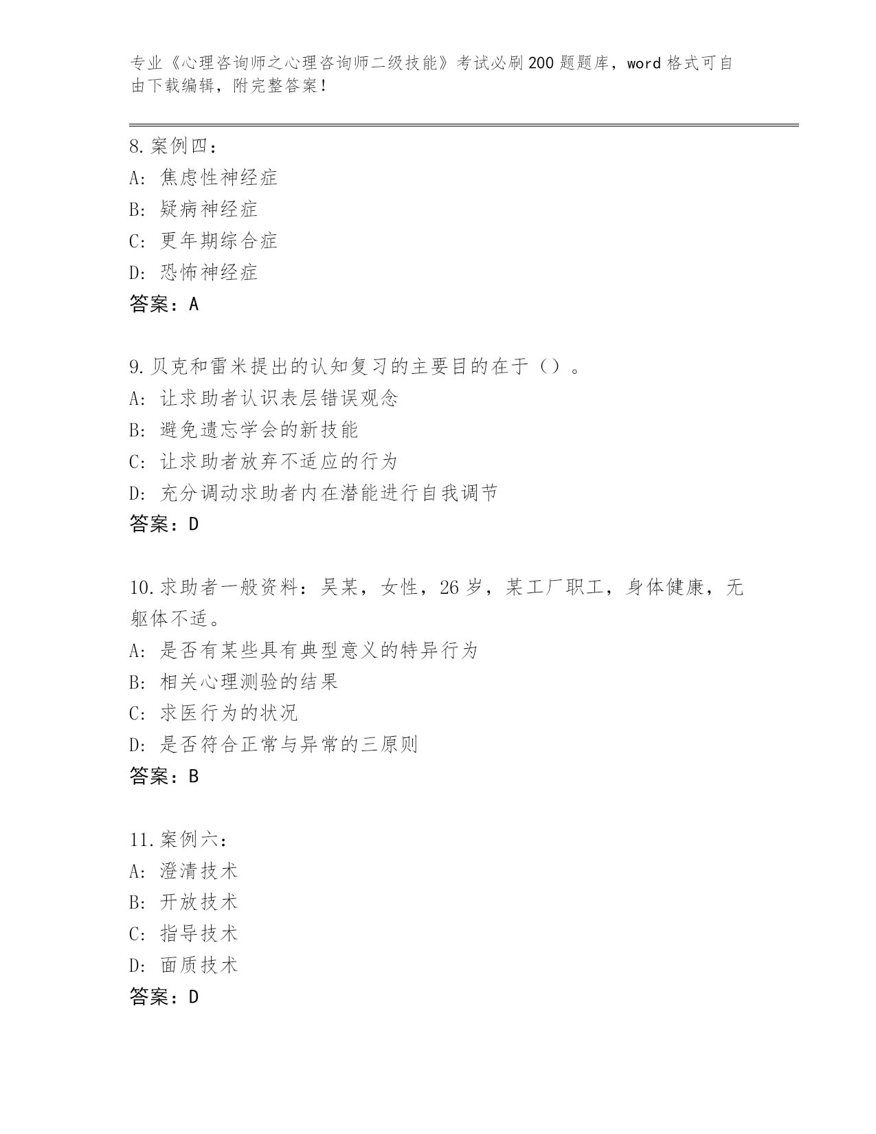 贵州省观山湖区整理《心理咨询师之心理咨询师二级技能》考试必刷200题真题题库带答案下载